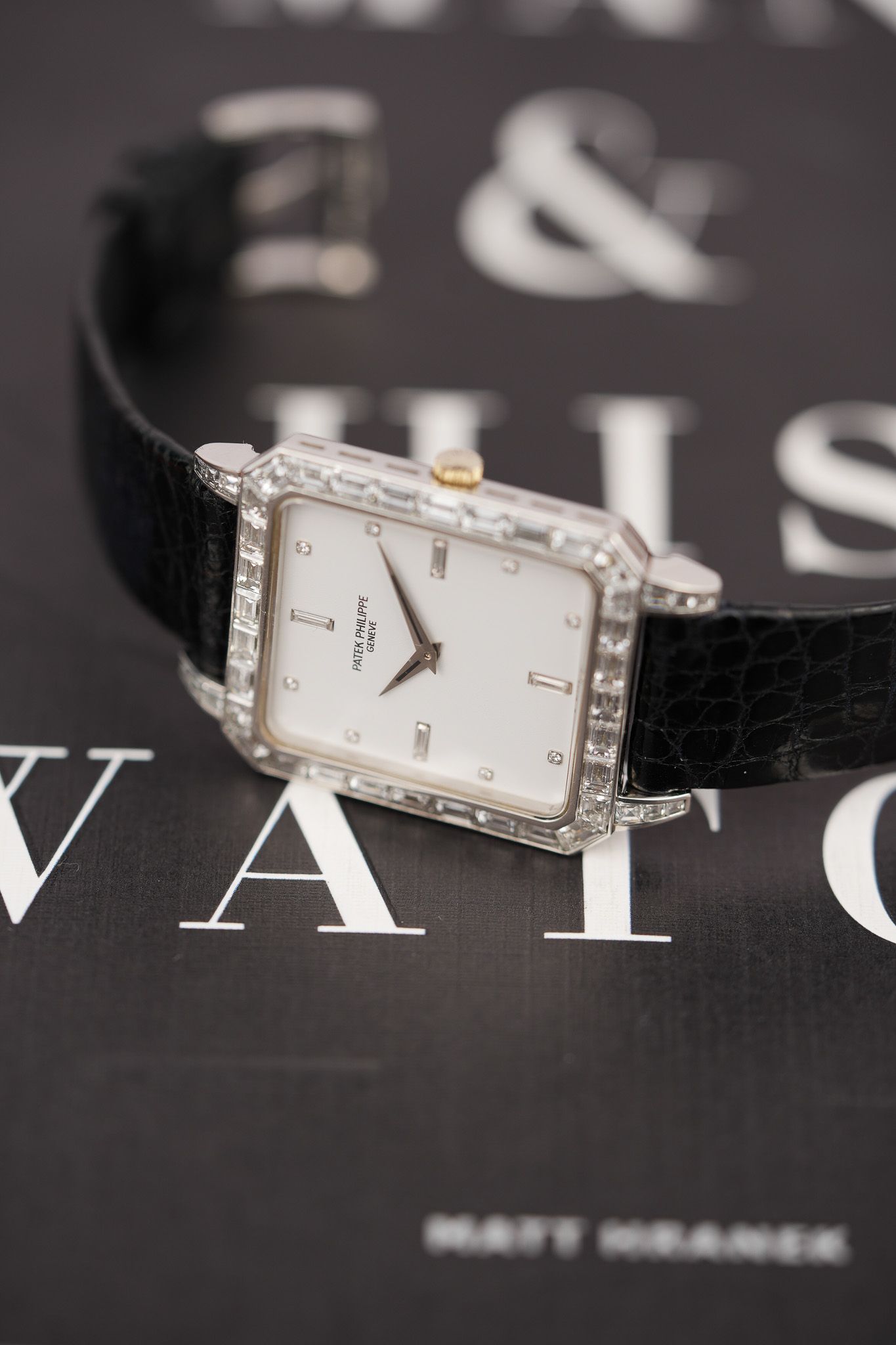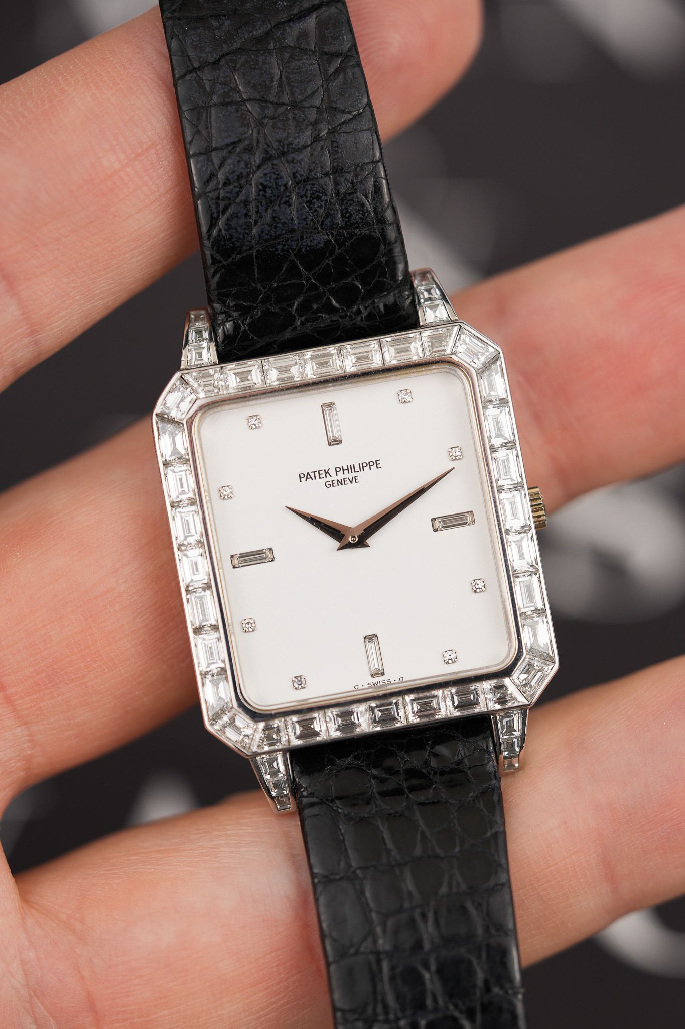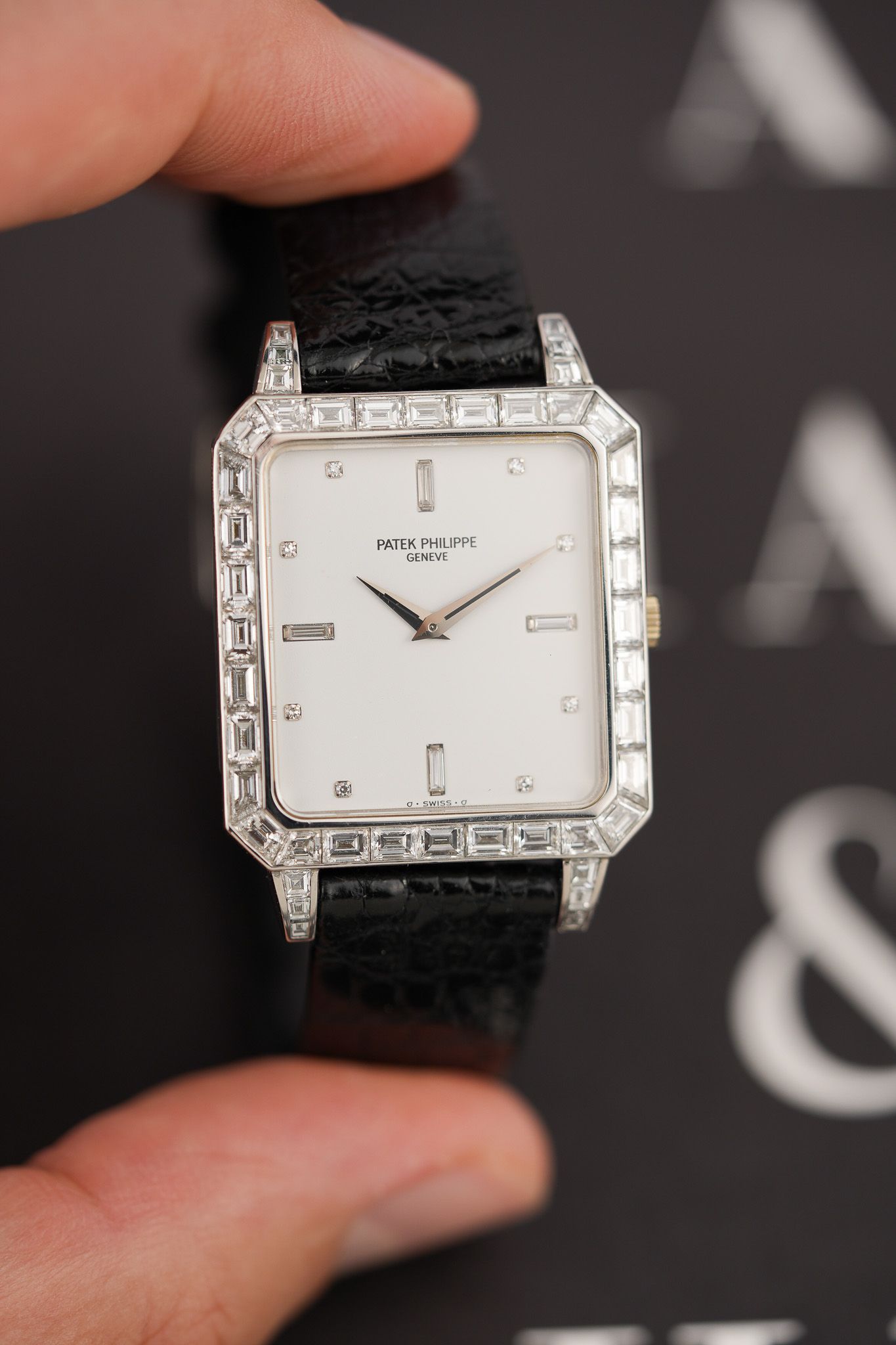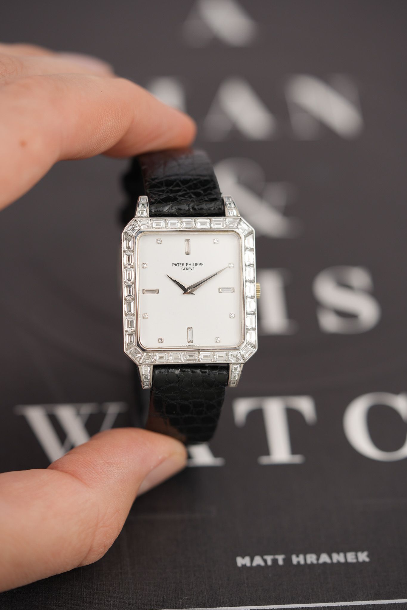 Let’s start with the obvious. The case is platinum. Not white gold, not steel, not rhodium-plated anything—actual dense, precious platinum. Its flat brushed caseback is reassuringly heavy, its lines sharp, and its weight quietly immense. On top of that is the bezel: 44 baguette-cut diamonds, each invisibly set, stepped perfectly into place like Patek was building a gemstone fortress instead of a dress watch.