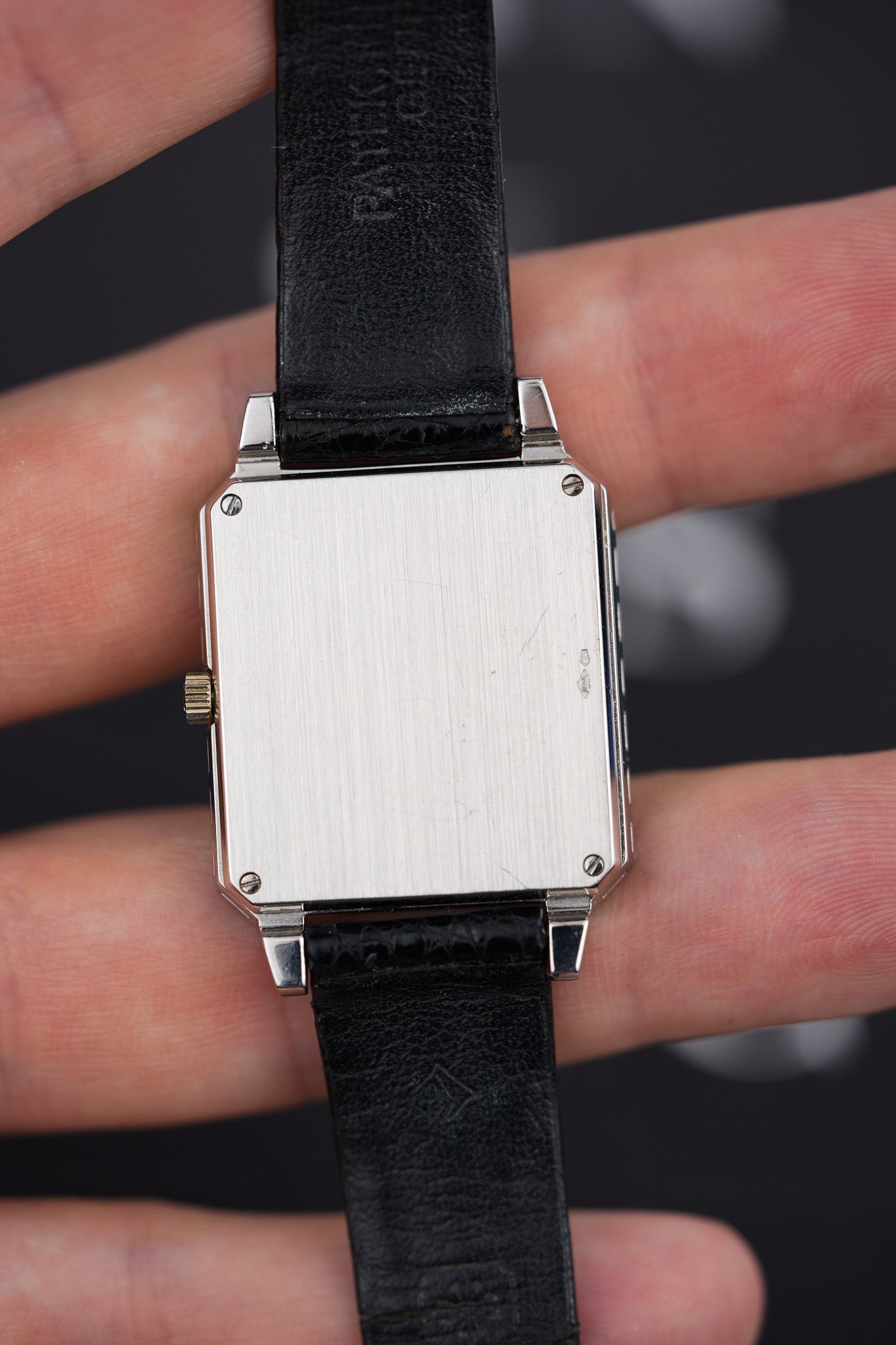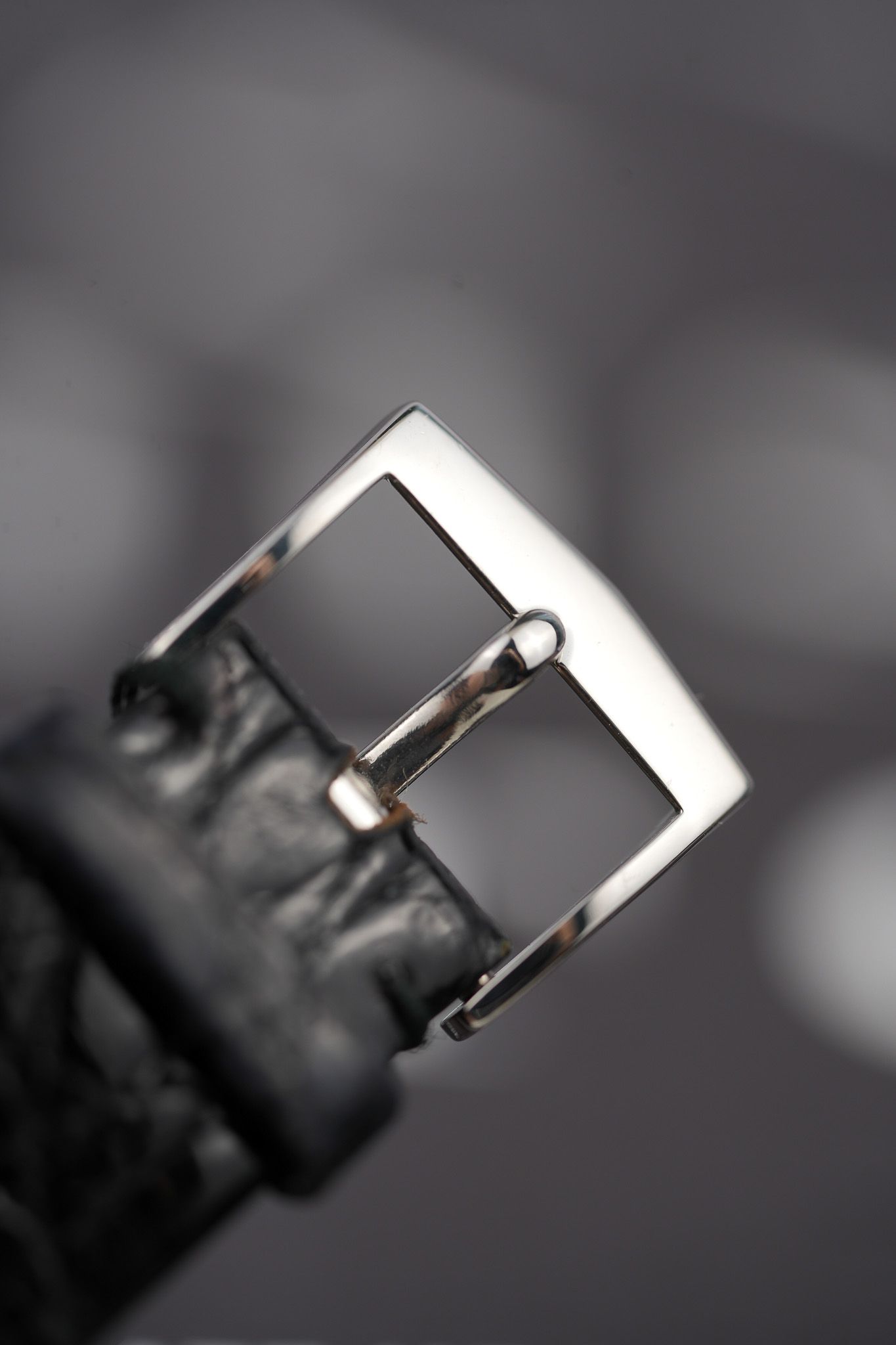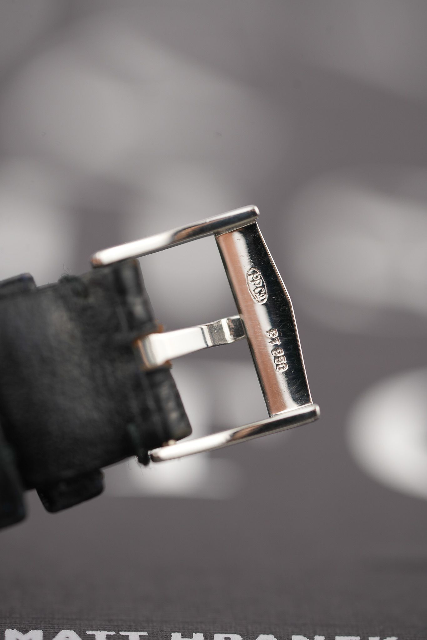 Fitted with original Patek Philippe platinum pin buckle; strap shows some creasing and signs of use.