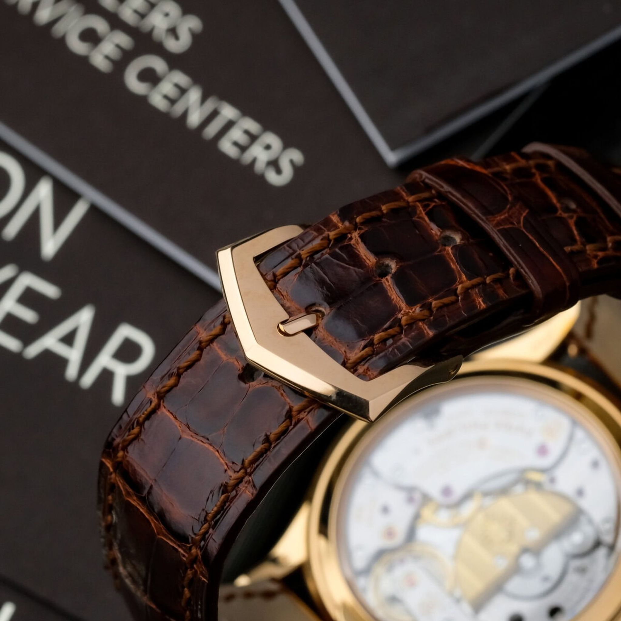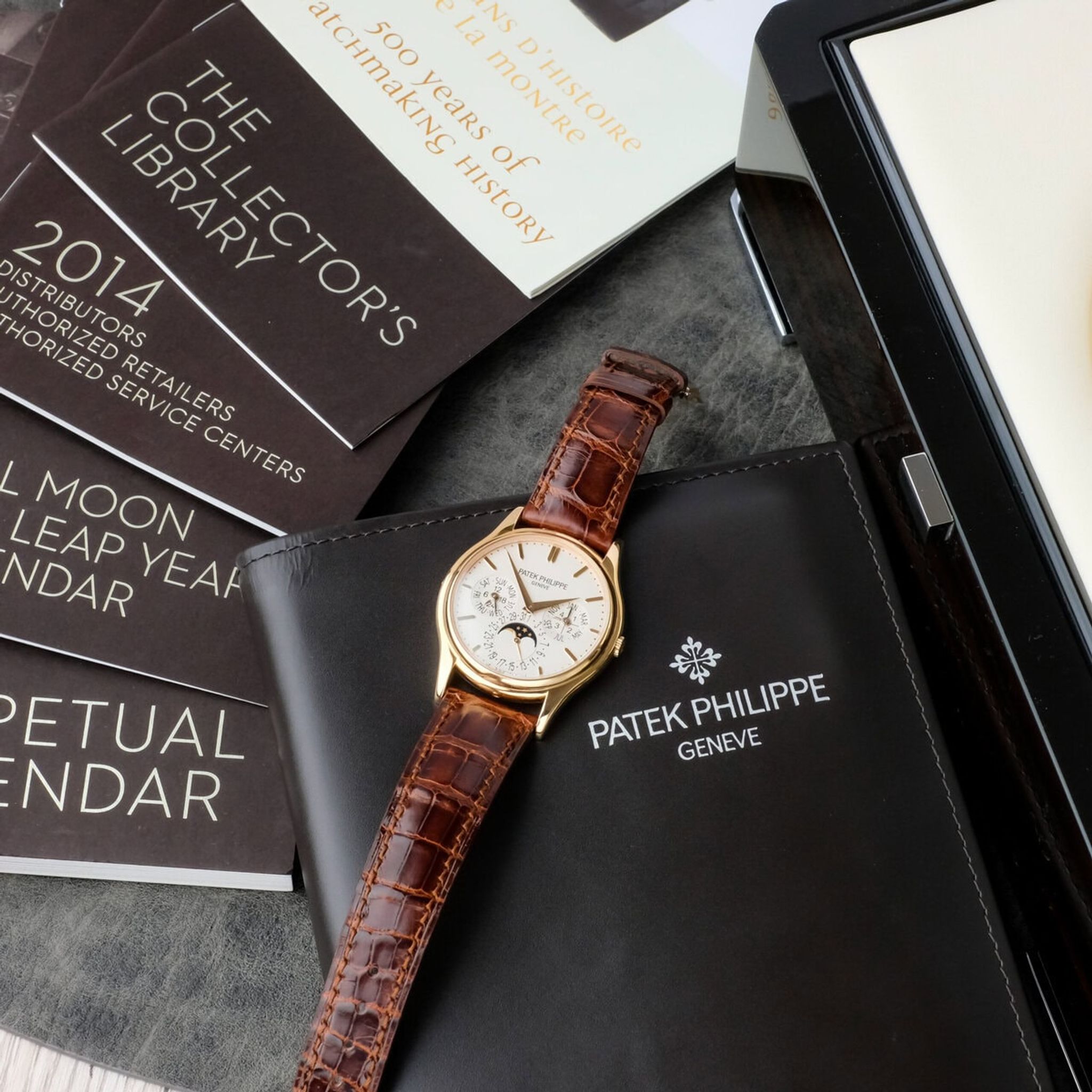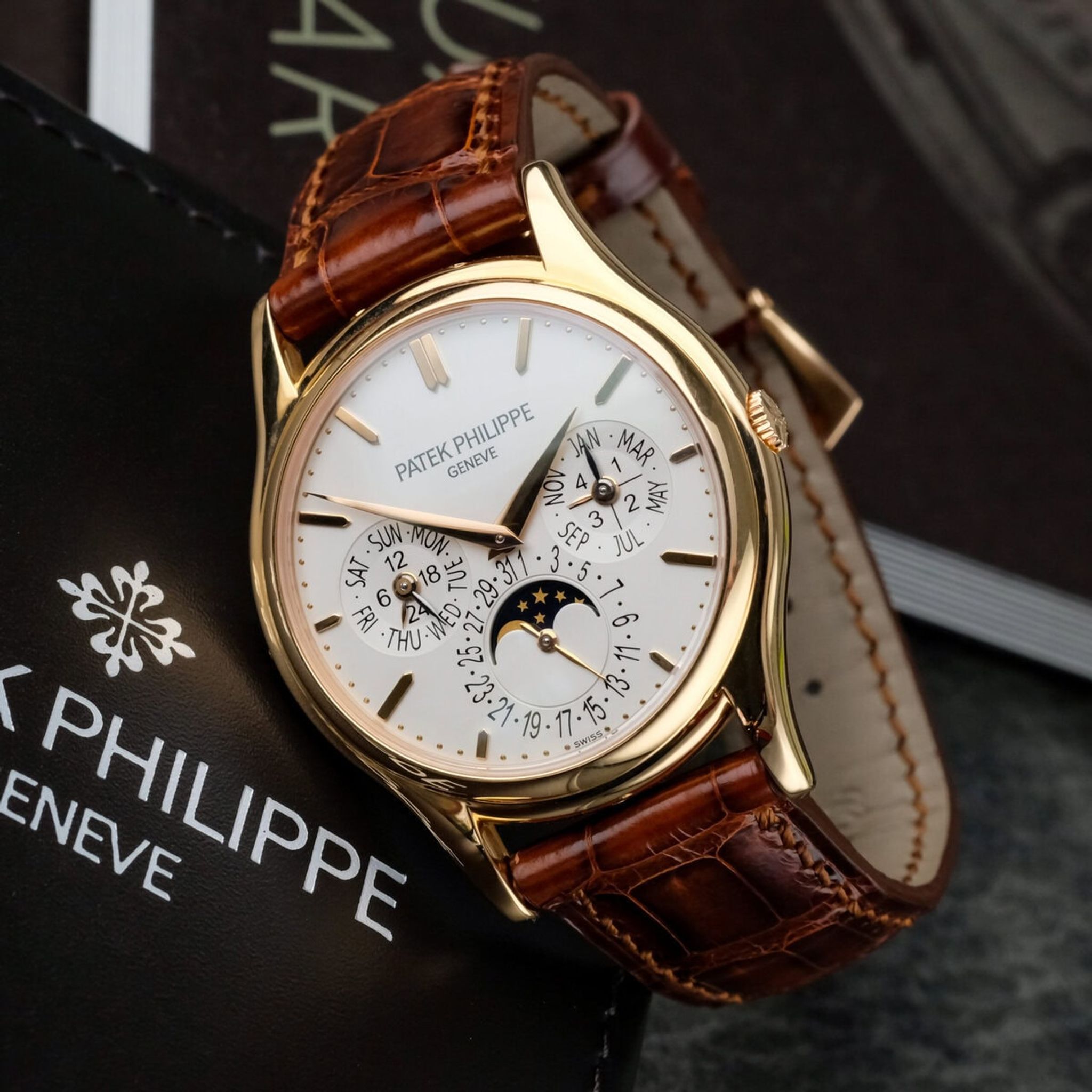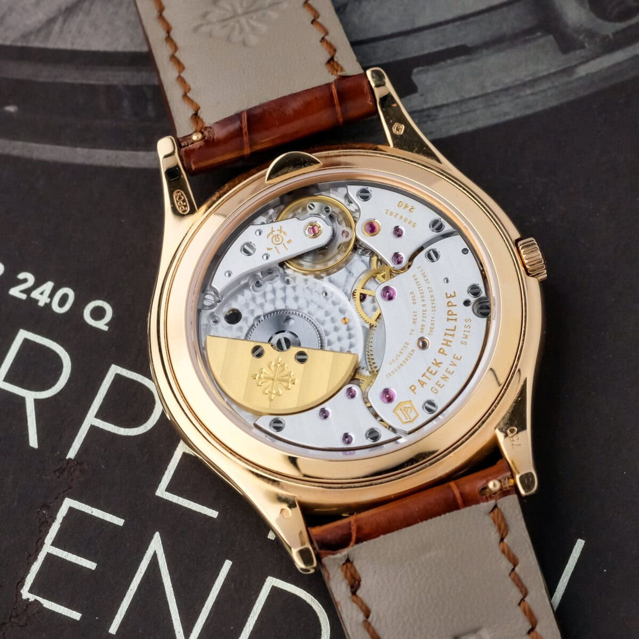 Visible through the sapphire caseback, the micro rotor automatic movement is one of Patek Philippe’s most celebrated achievements. The watch shows light and normal signs of wear with a few minimal surface marks, yet both the movement and caseback remain in excellent condition, as do the sapphire crystals. It is offered with its original box and booklets, but without papers, and retains its Patek Philippe rose gold pin buckle. Overall, this 5140R combines elegant proportions, mechanical ingenuity and enduring refinement, making it a highly desirable addition to any collection of complicated Patek Philippe watches.
