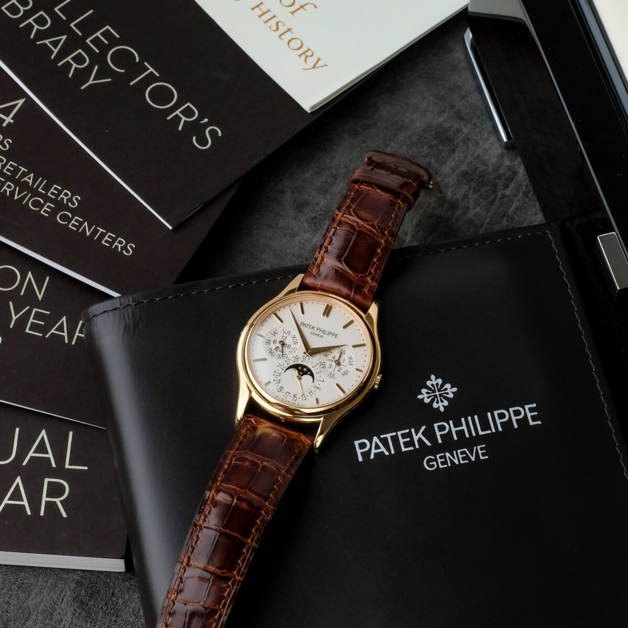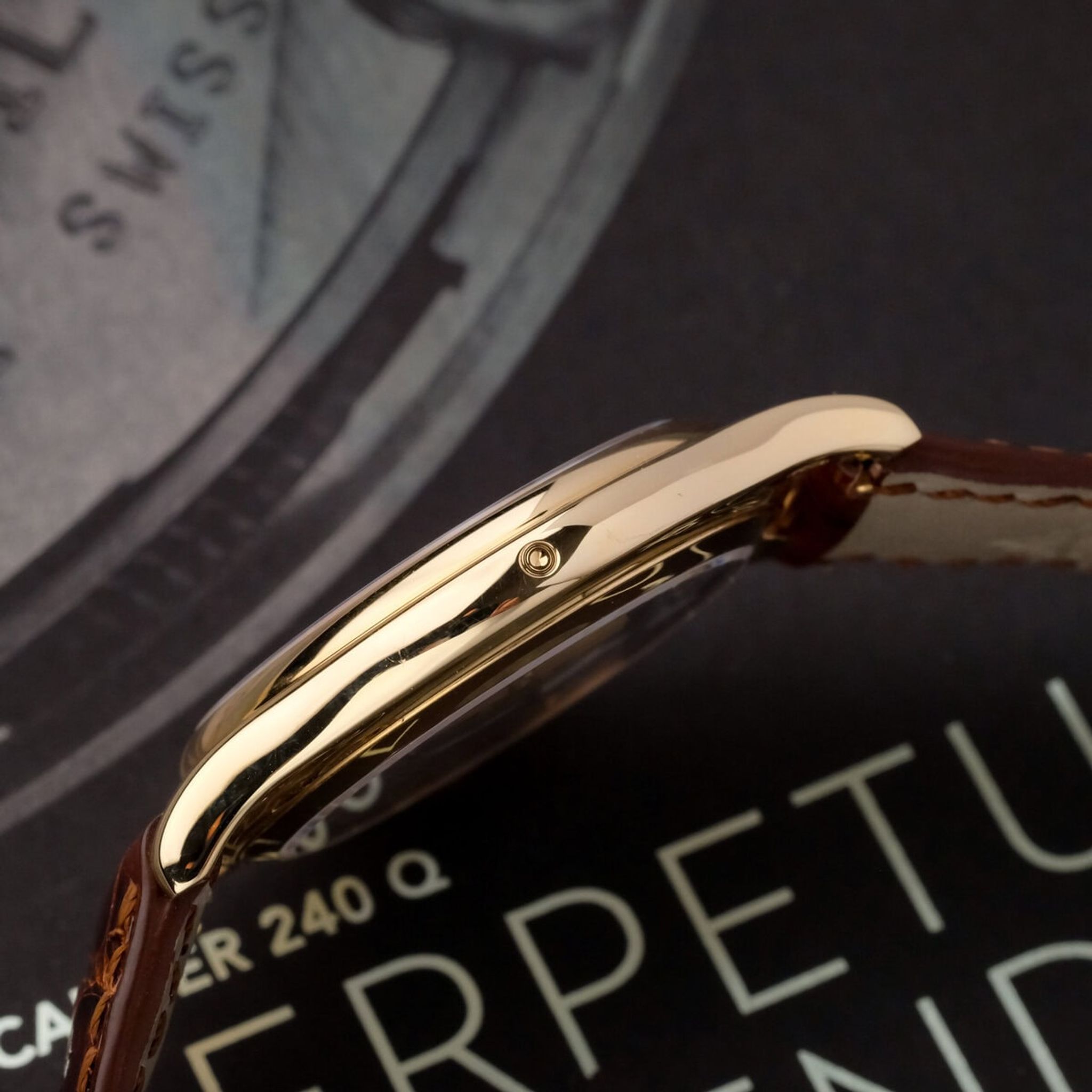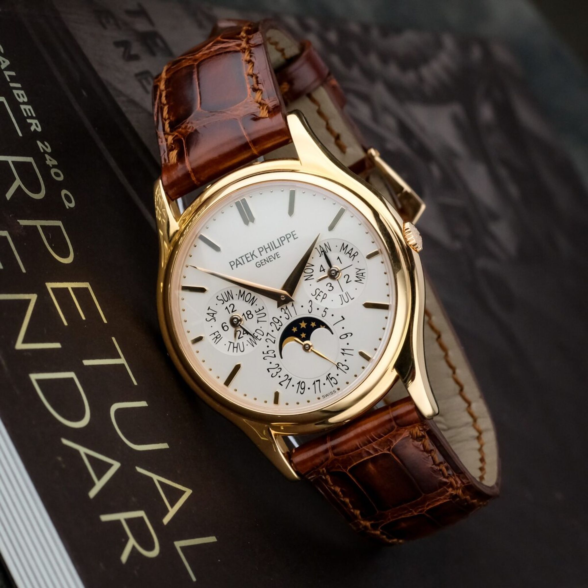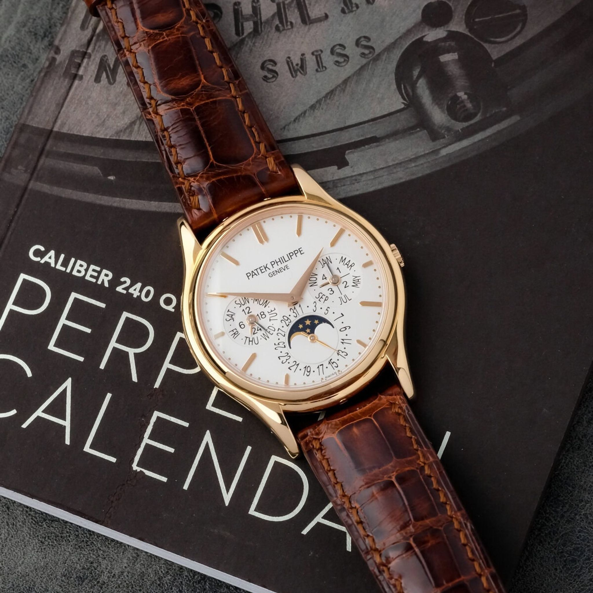 The white dial presents the perpetual calendar indications with perfect clarity and balance, including day, date, month, leap year and moon phase, all arranged in Patek Philippe’s signature style of harmonious design. Its slim profile is made possible by the ultra thin caliber 240 Q, admired for both its technical sophistication and exceptional finishing.