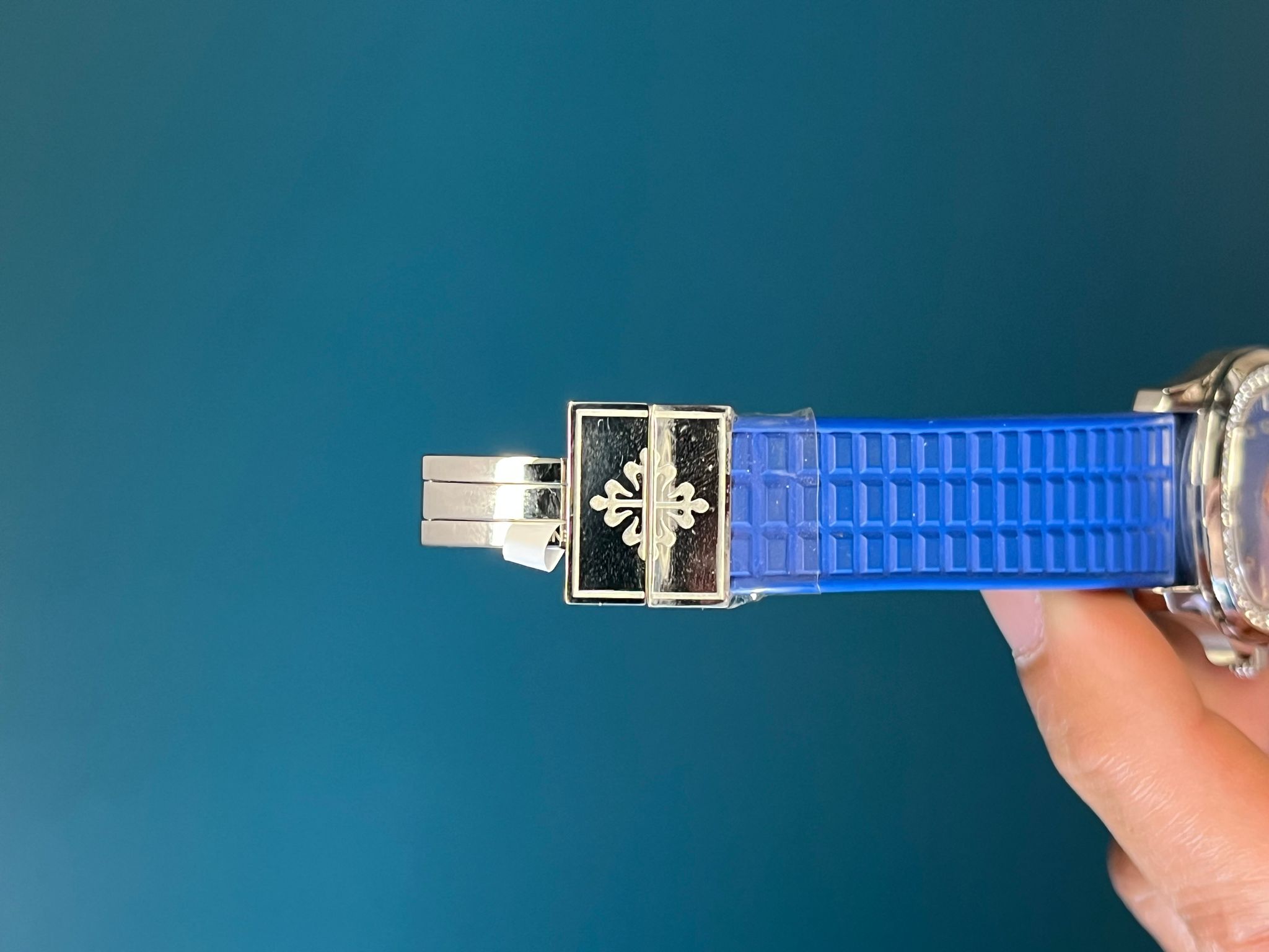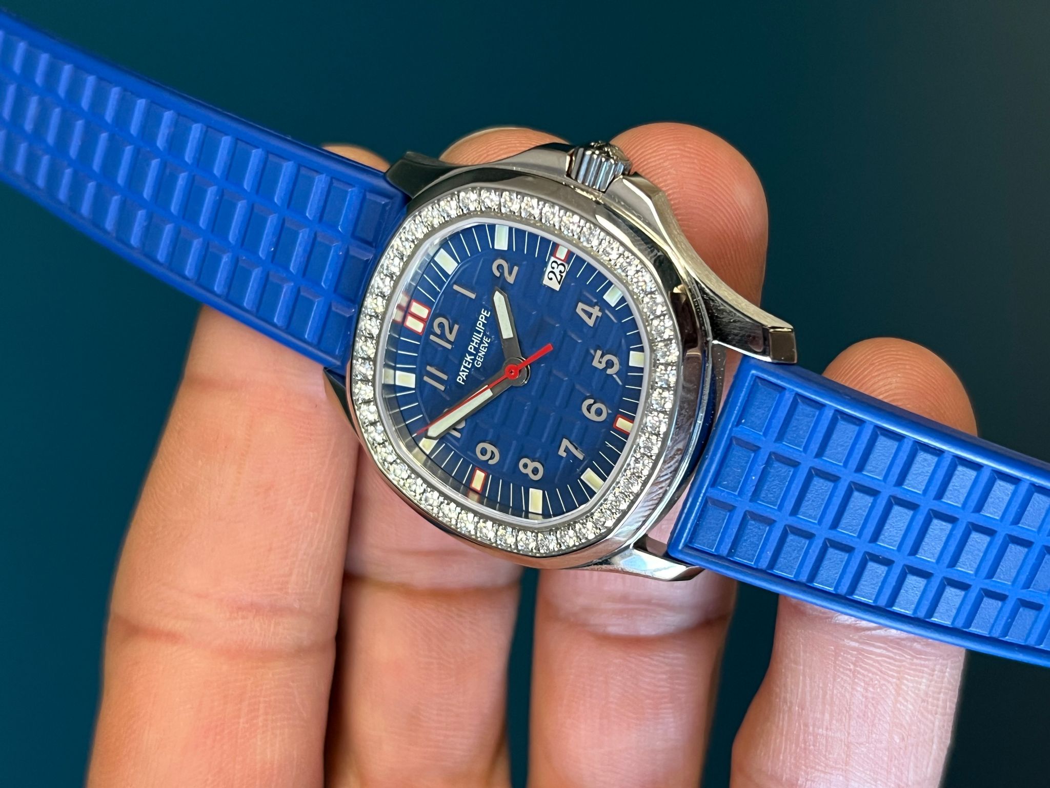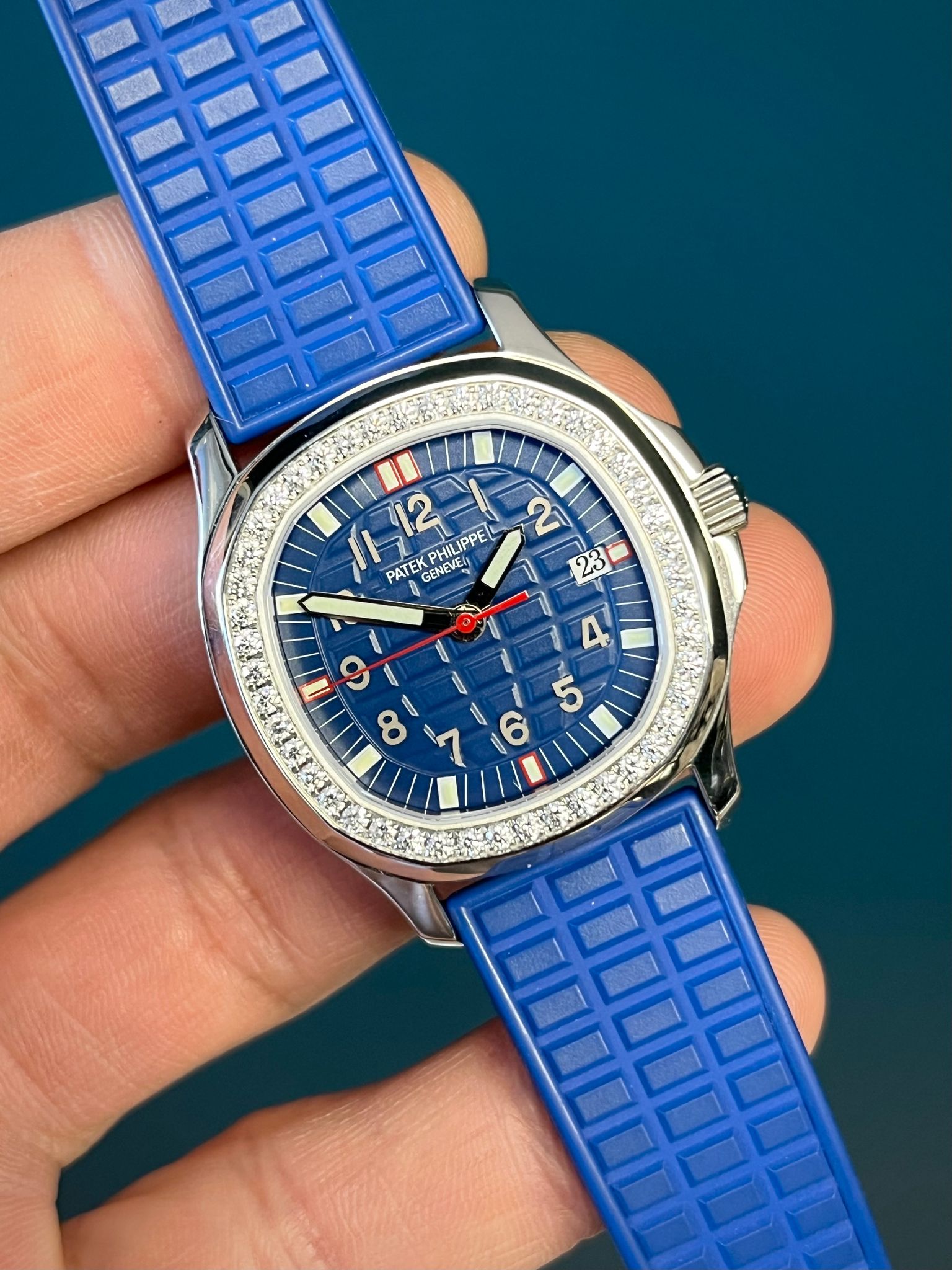 The Patek Philippe Aquanaut Luce Reference 5067A-014 is a stunning blend of sportiness and elegance, elevated by its factory-set diamonds and vibrant blue aesthetic. Crafted in stainless steel, its 35.6mm rounded octagonal case is framed by a dazzling diamond-set bezel, adding a luxurious sparkle to the model’s casual-chic design. The embossed “tropical” blue dial, with its matching composite strap, exudes a fresh and contemporary look while offering excellent durability and comfort. White gold applied numerals and luminous hands ensure legibility, and the date aperture at 3 o’clock provides practical functionality. Powered by a reliable quartz movement, the watch is water-resistant to 120 meters, making it as versatile as it is beautiful. This Aquanaut Luce represents the perfect balance of everyday wearability and refined Patek Philippe craftsmanship, with the extra allure of factory-set brilliance.
