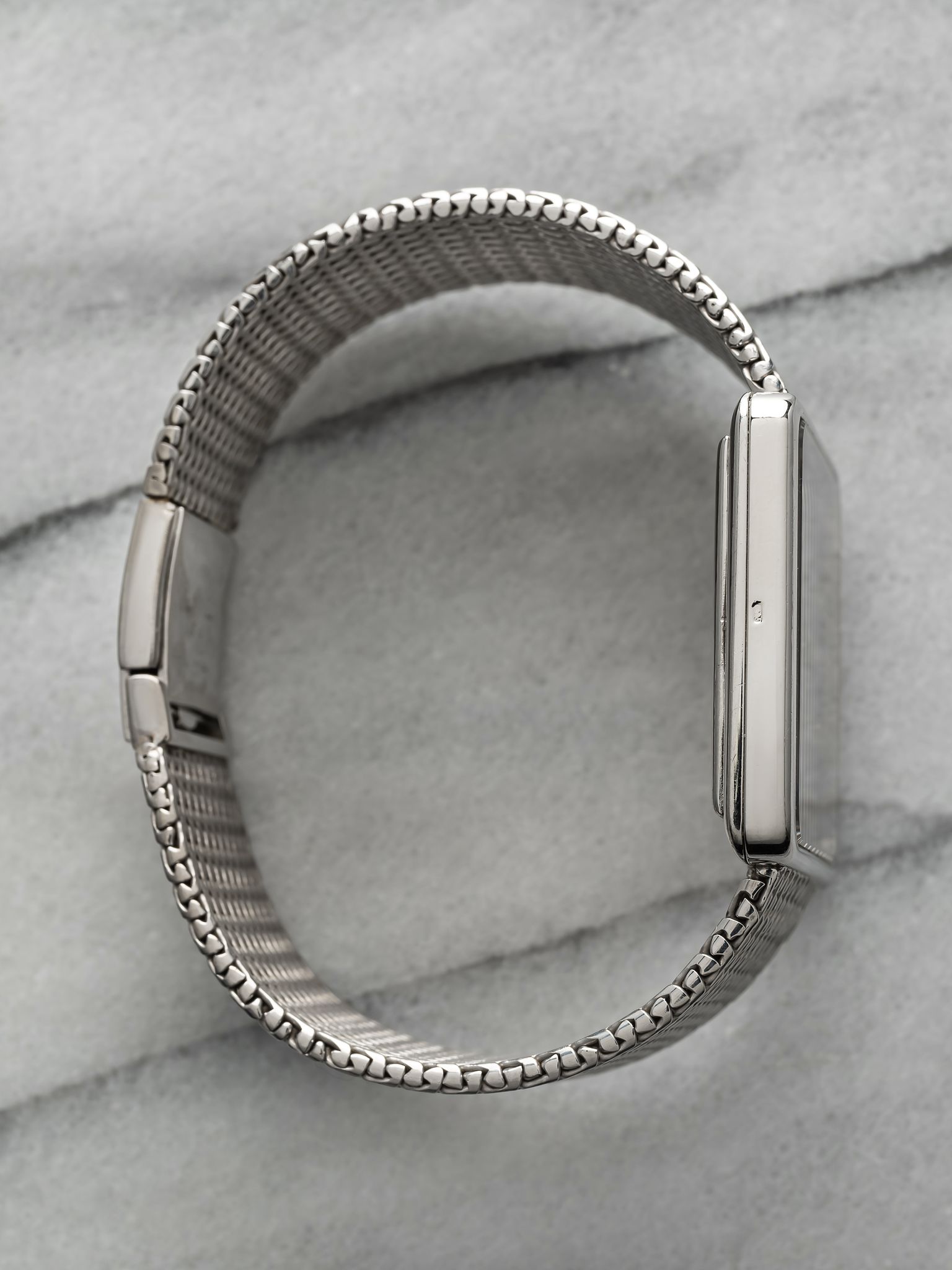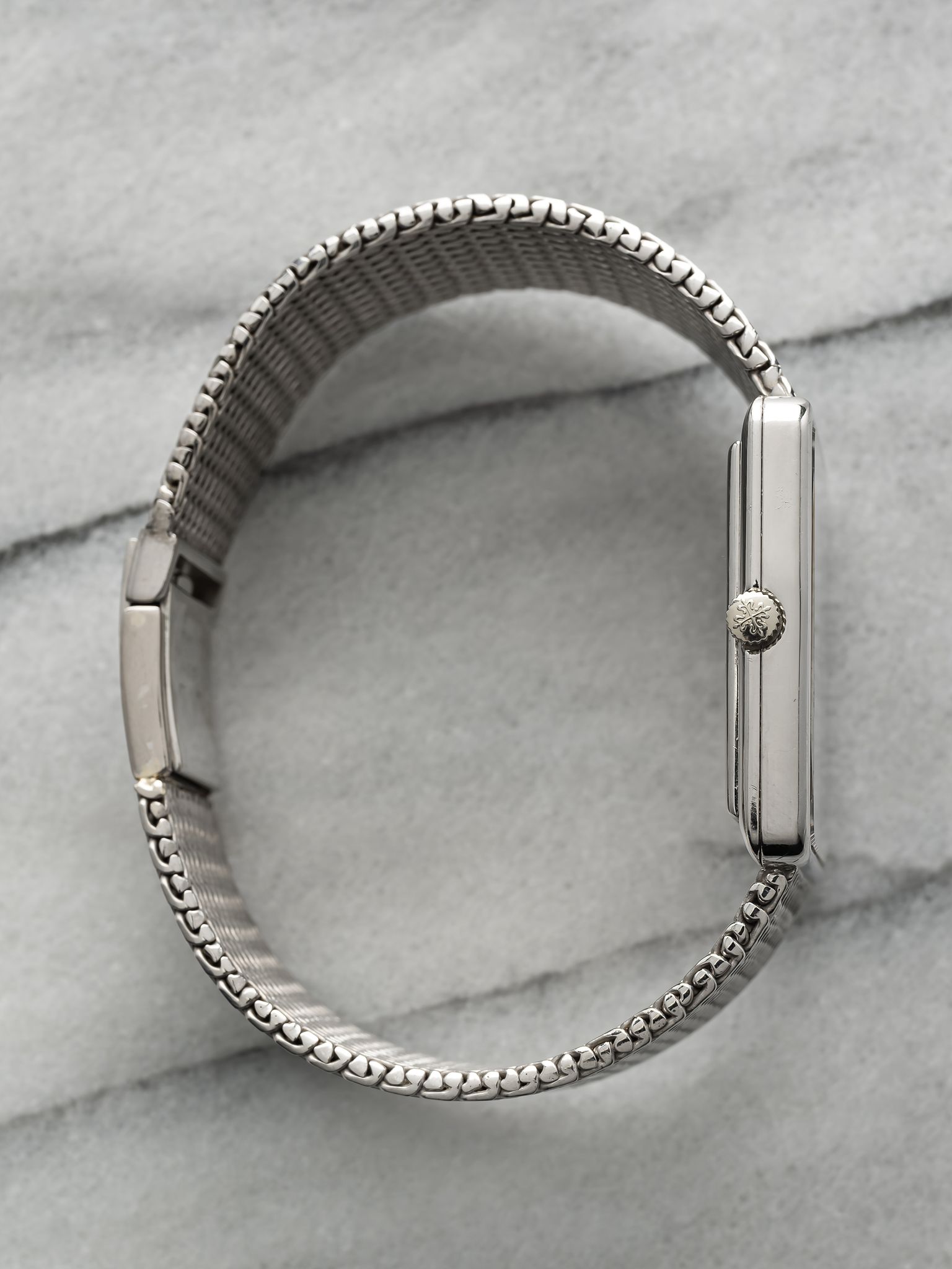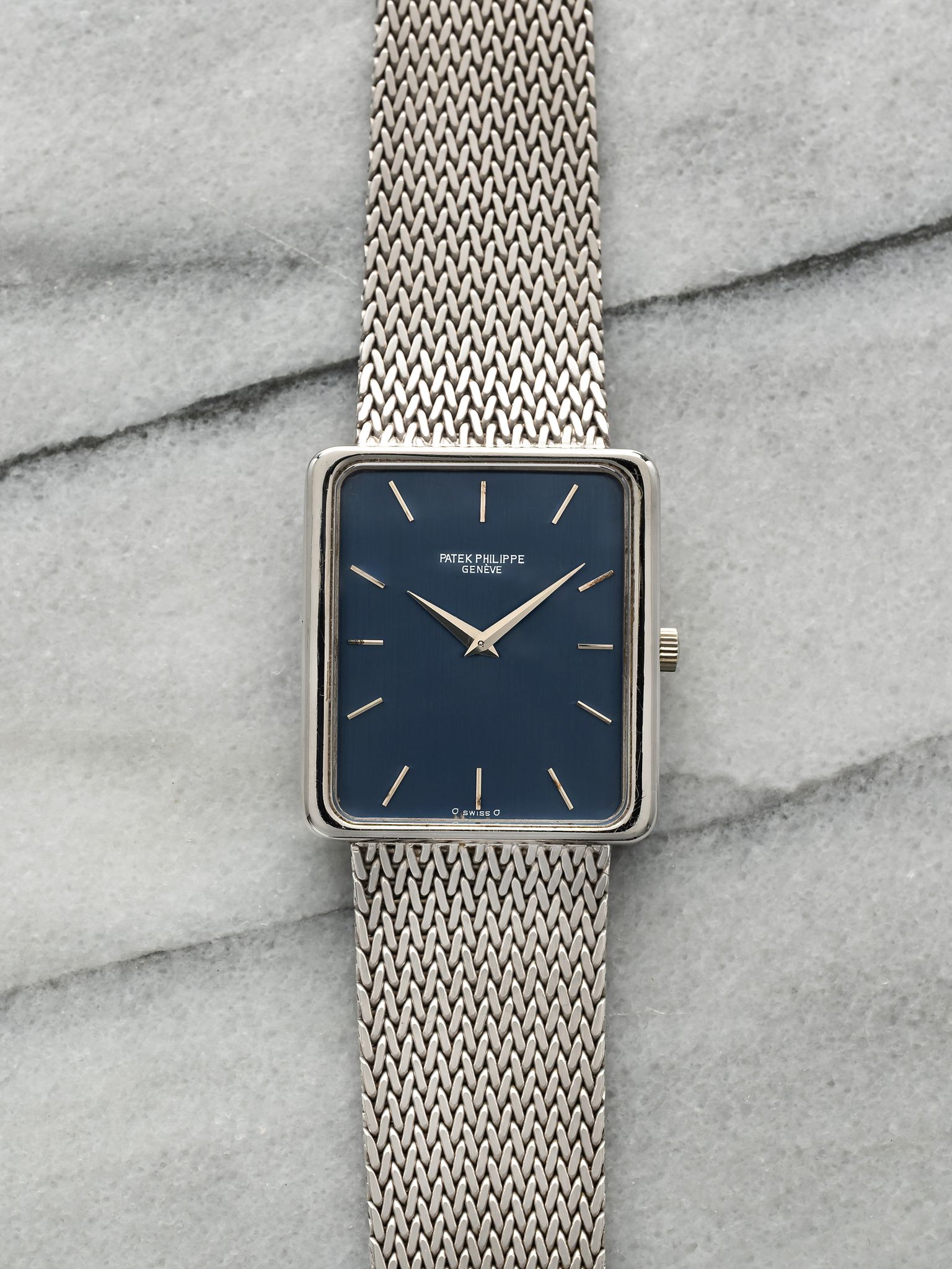 Here’s a Patek Philippe in 18K white gold manual wind rectangle case with a blue sigma dial from the 1970s-1980s. Measurements include a 30mm case and an integrated bracelet that fits up to a 6.75 inch wrist. Fitted on its original matching chain-link bracelet for a seamless and refined look. Slim, minimalist design with applied gold indices, Matching dauphine hands and hour markers. Sigma markings at 6 a clock that the hands and hour markers are made of gold. Original case, dial, bracelet, and movement. Fully functional and keeping time.