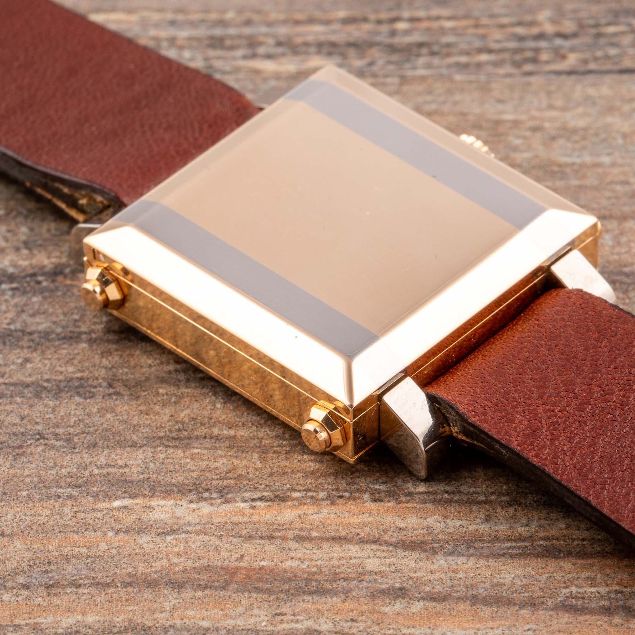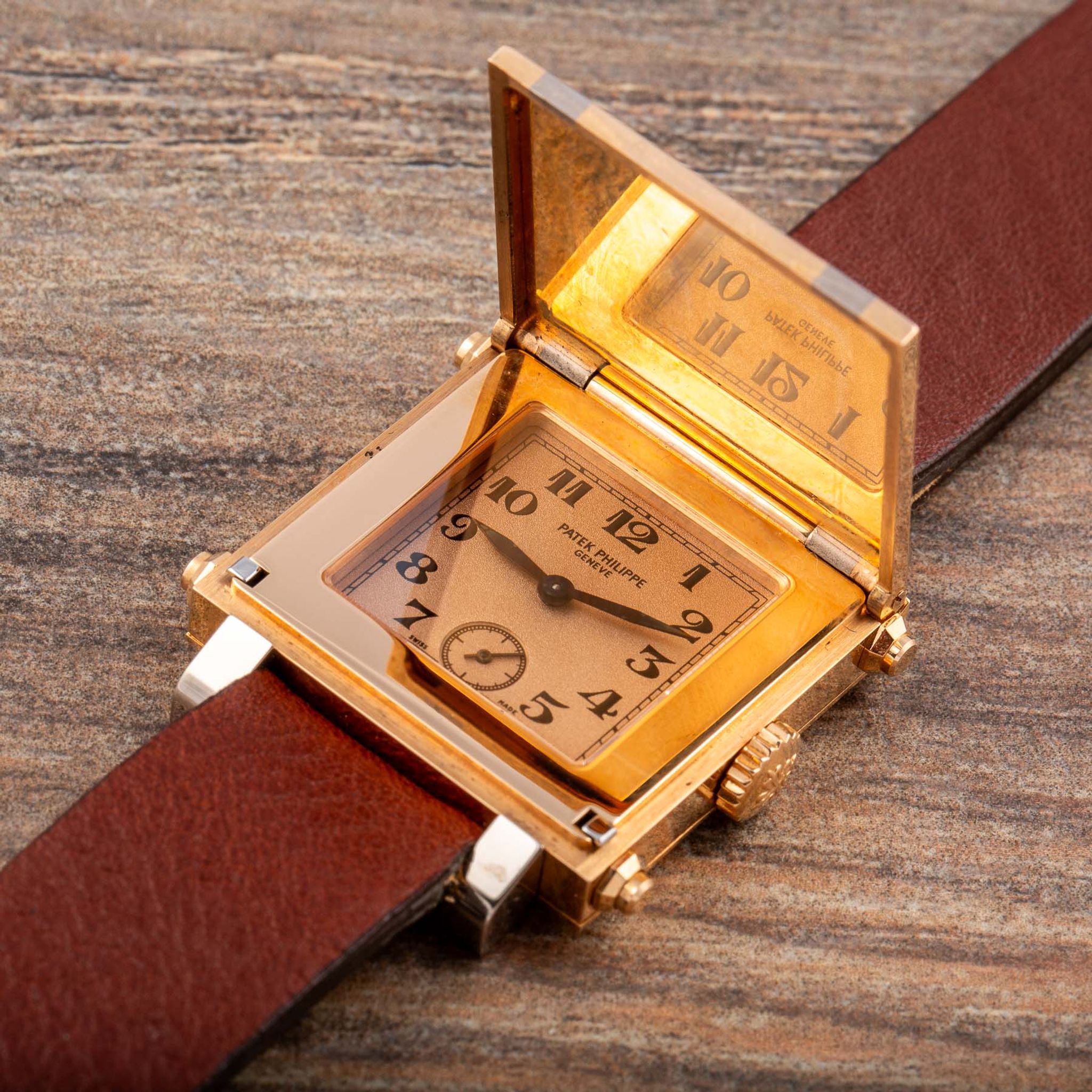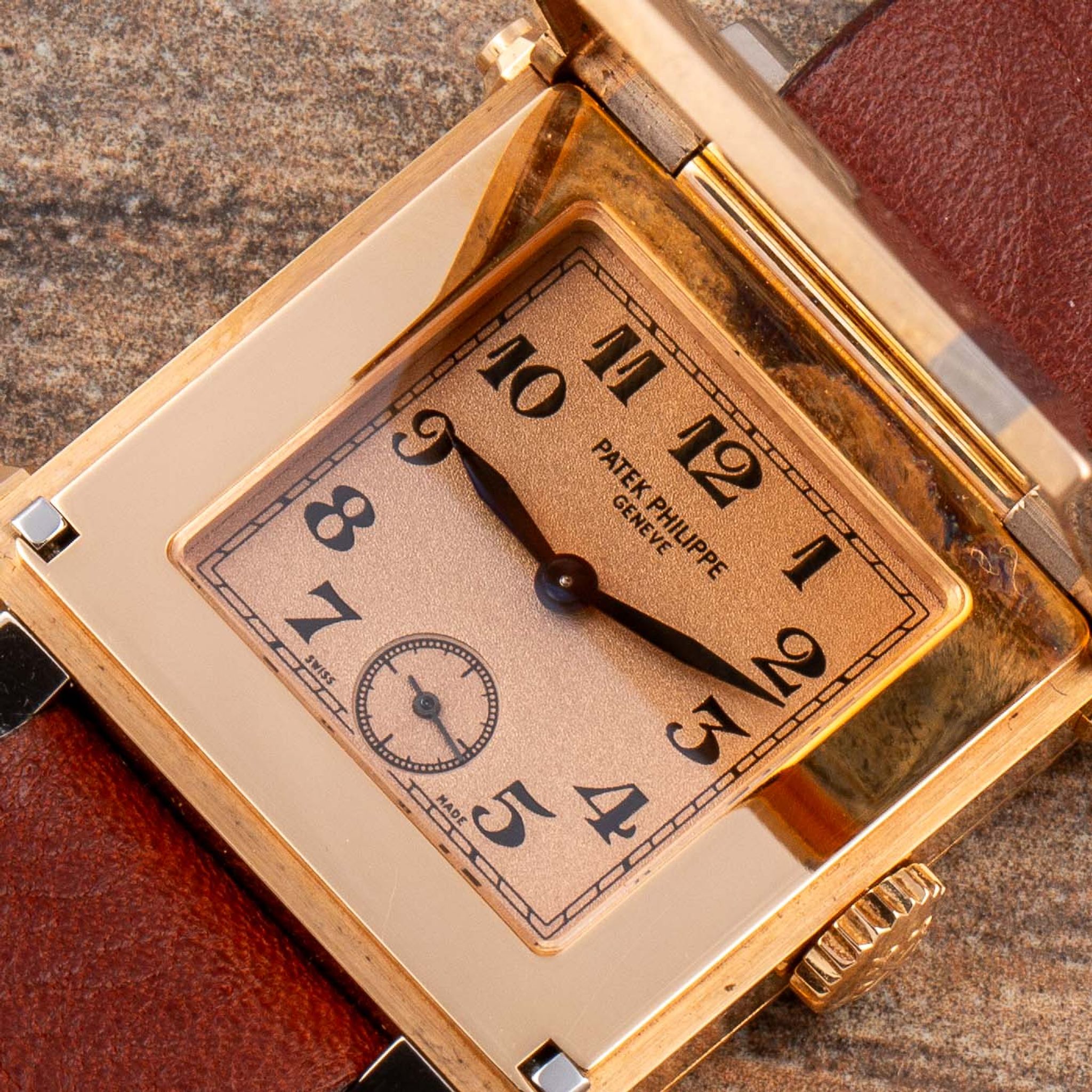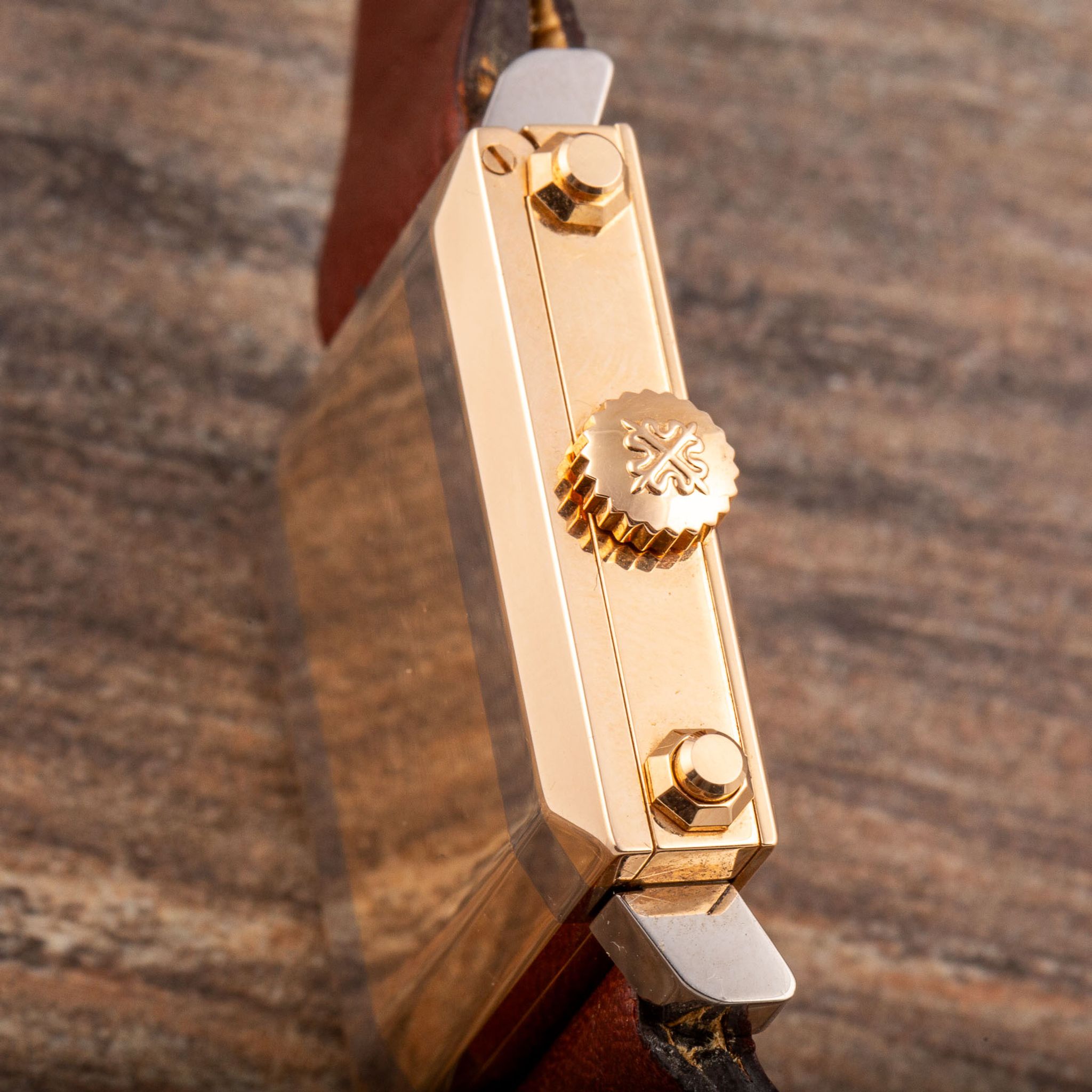 The Patek Philippe Gondolo Cabriolet Ref. 5099, launched in 1999, stands out for its unique 18K white and rose gold case. Inspired by a 1920s design originally produced in just three examples, one of which now resides in the Patek Philippe Museum, this model features a unique cover that opens with the press of two buttons to reveal the dial. This complex case, made of 52 components, took Patek Philippe technicians three years to perfect. The challenge was to harmonize the gold tones on the upper part of the watch and refine the mechanism that allows the cover to open with the press of two buttons. The watch reflects Patek’s craftsmanship, blending Art Deco style with innovative mechanics.