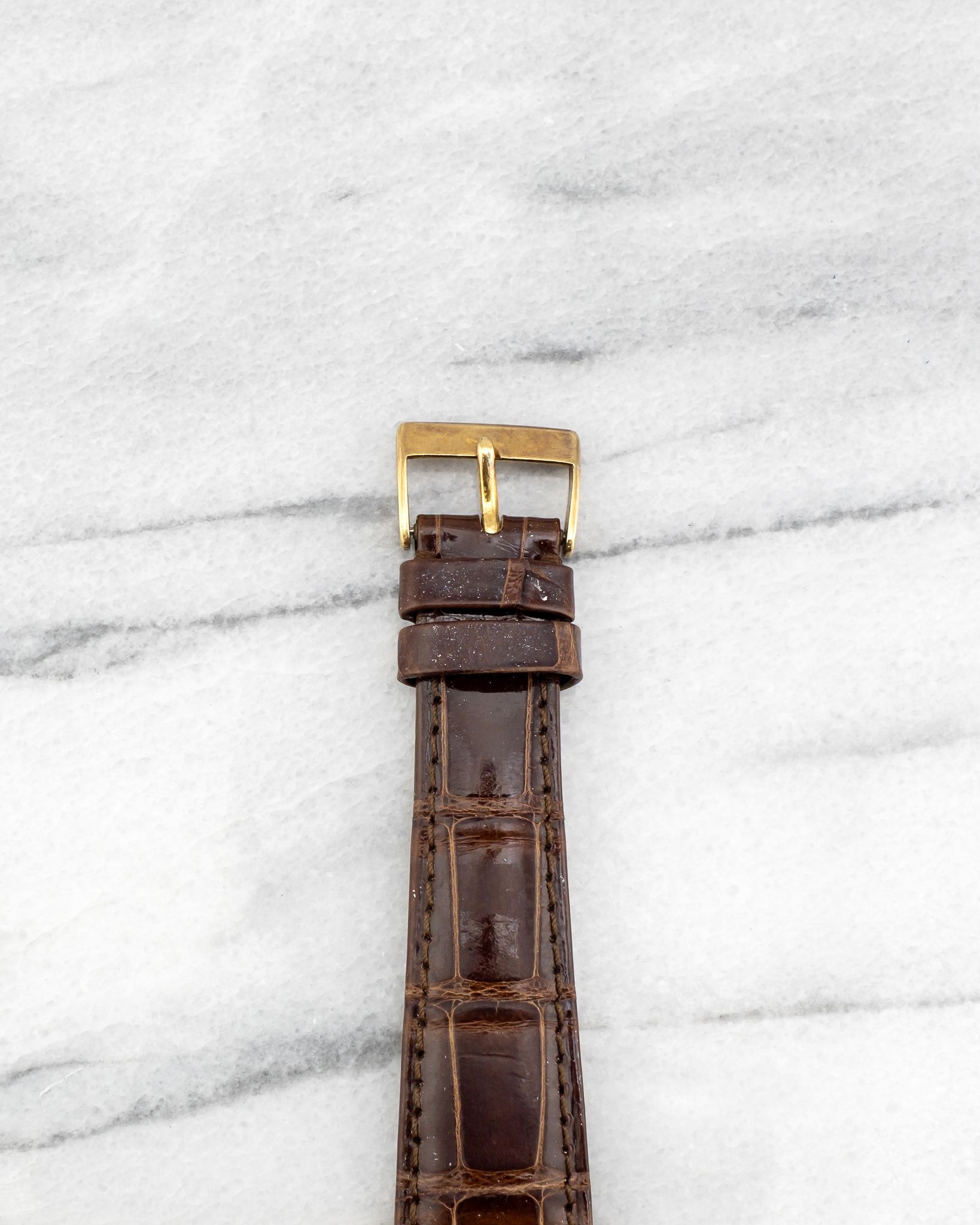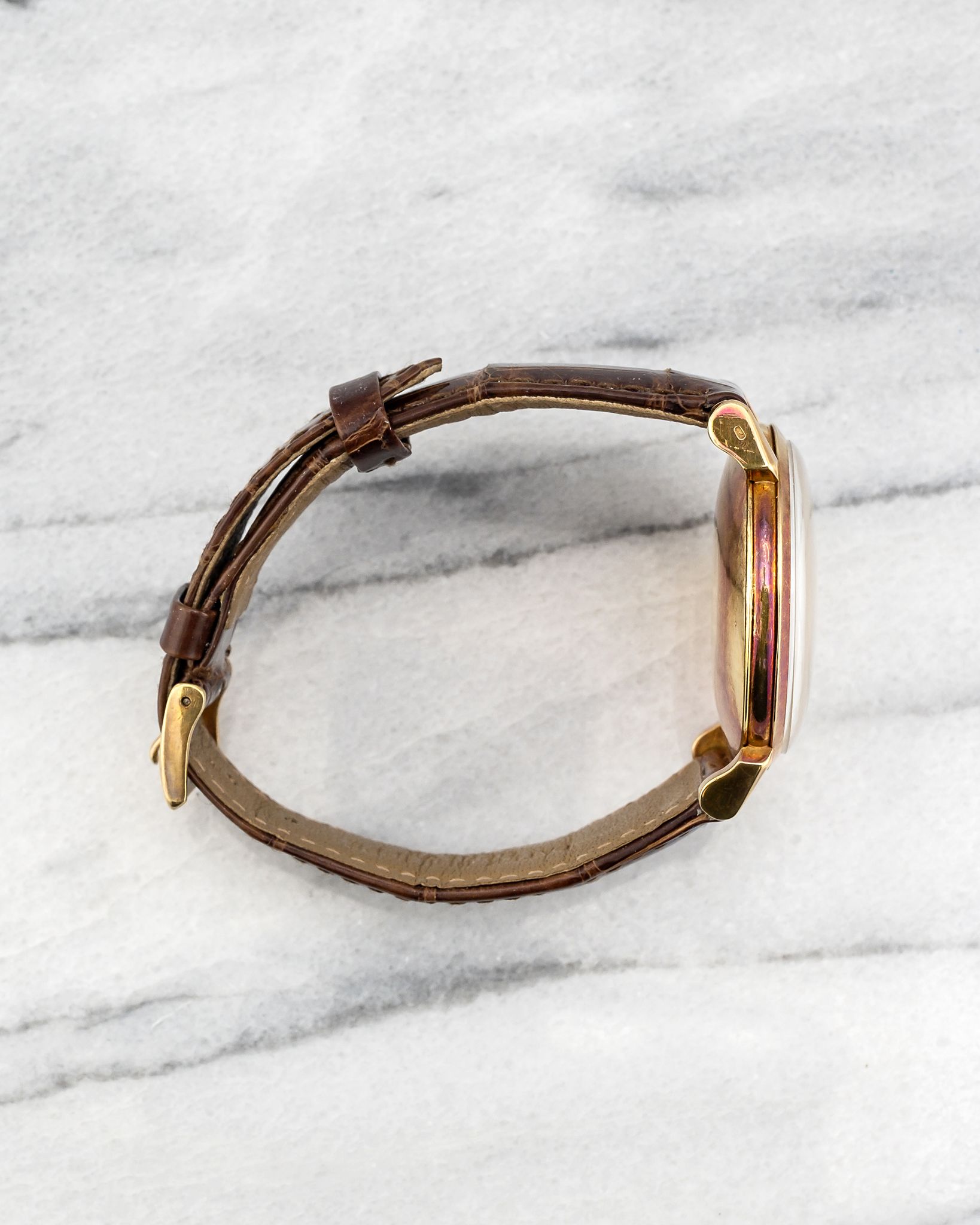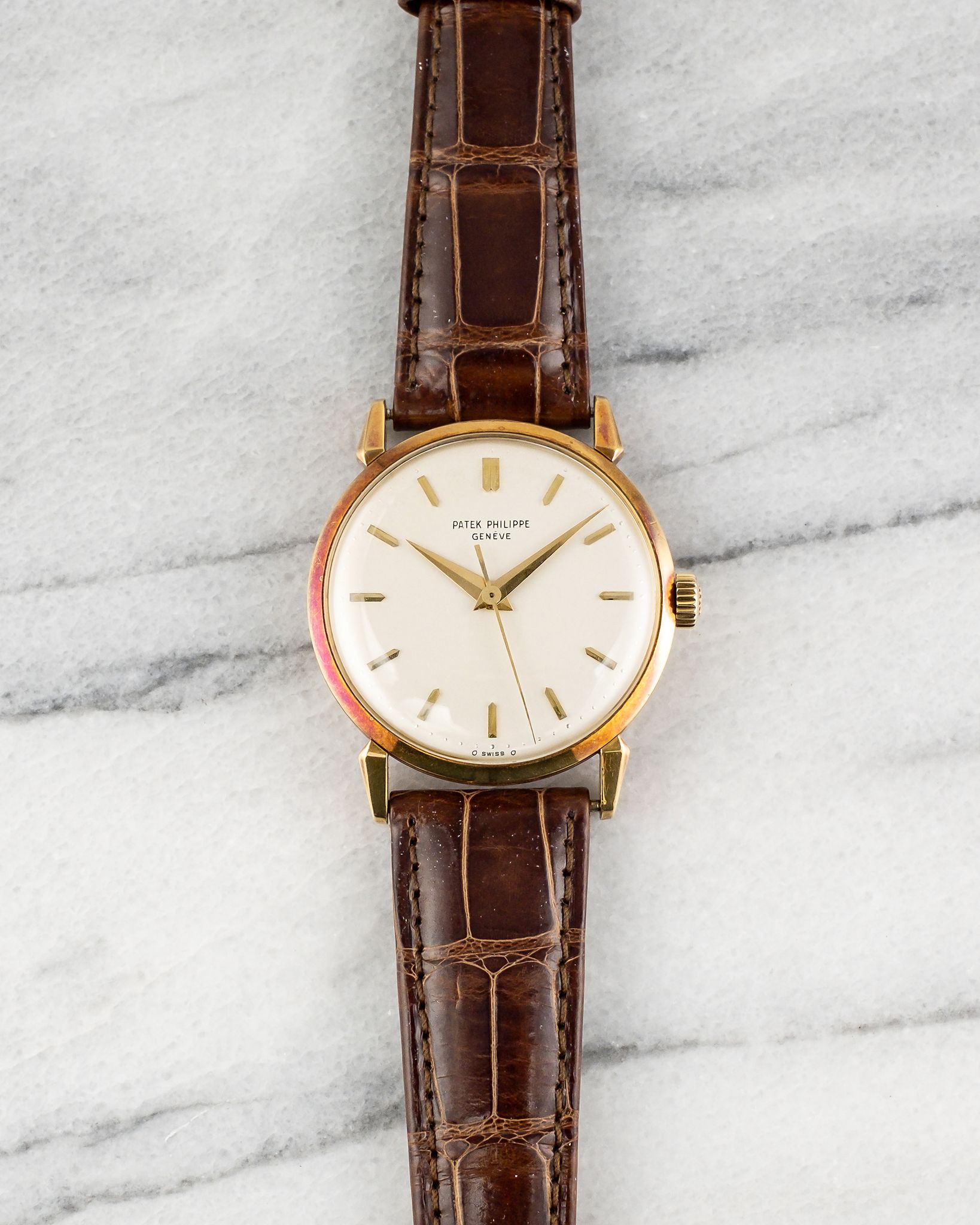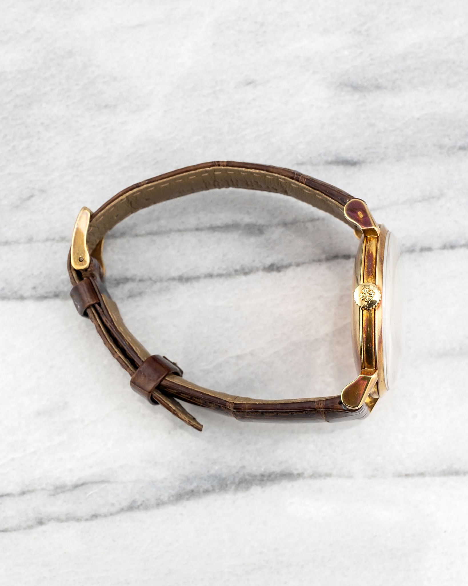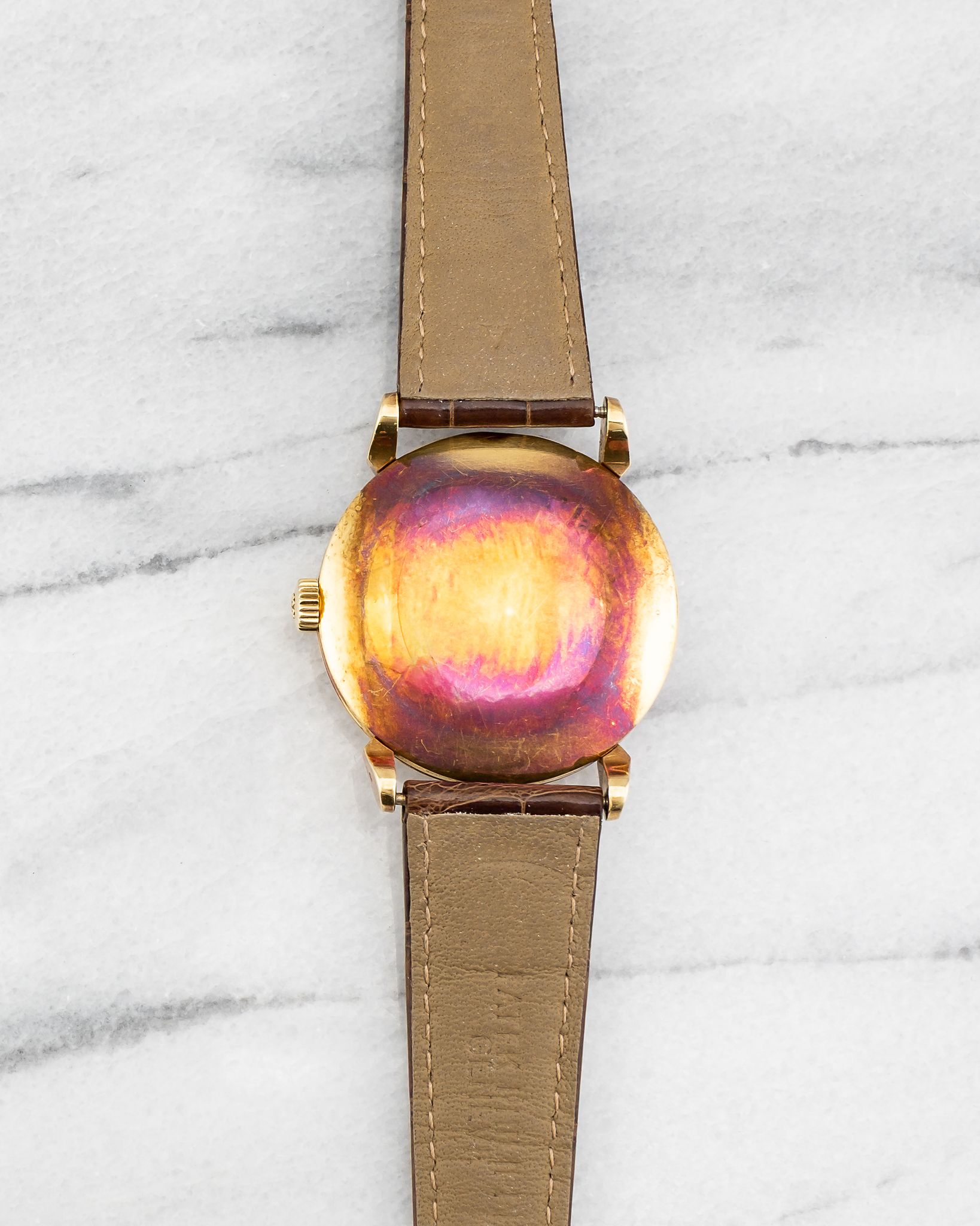 Here's a vintage Patek Philippe Calatrava reference 1578 manual wind in 18k yellow gold with a white dial on a leather strap from the 1950s. Keeps great time and is fully functional. Measurements include a 35mm yellow gold case. It's on a Patel leather strap with its signed gold buckle. Clean white service dial with applied indices and dauphine hands. Signature horn-style lugs. The case and caseback have oxidized to a nice purple color as seen in photos. The Yellow gold case and caseback. All parts are original including the signed Patek Philippe crown, dial, movement, and caseback. Both the dial and case are in great cosmetic, untouched condition.