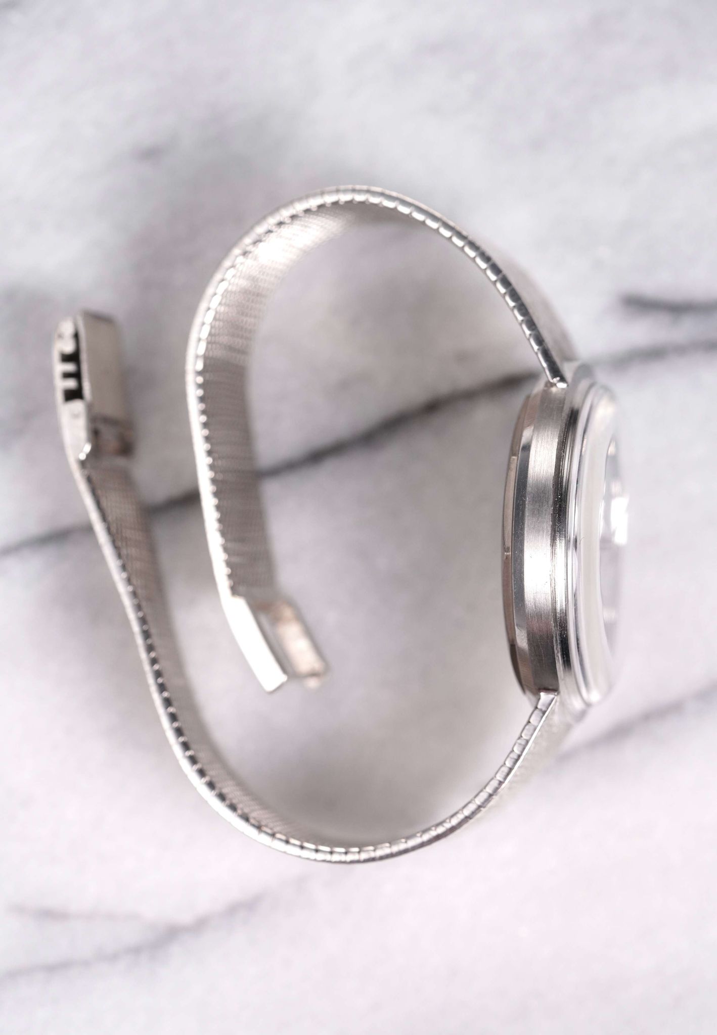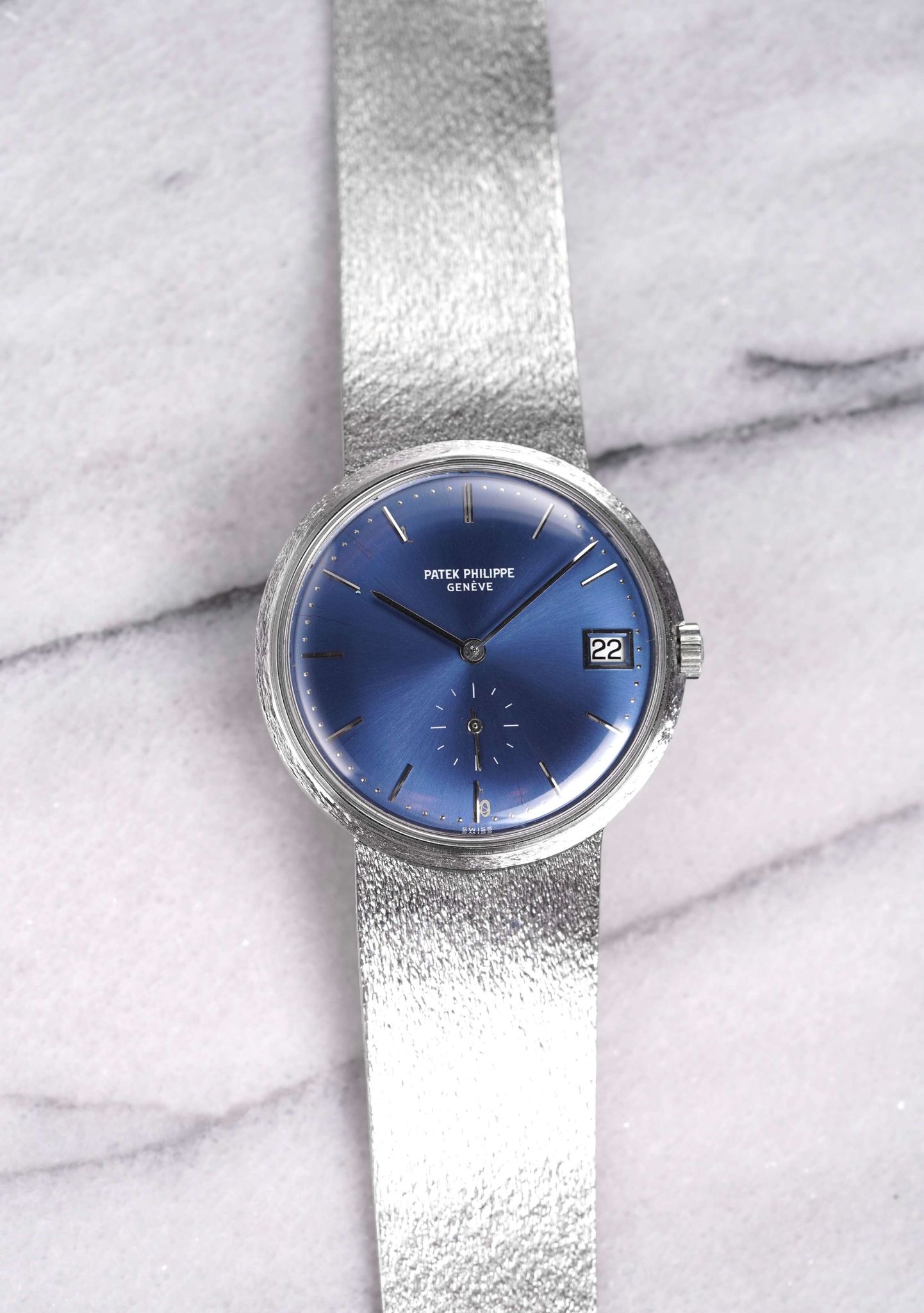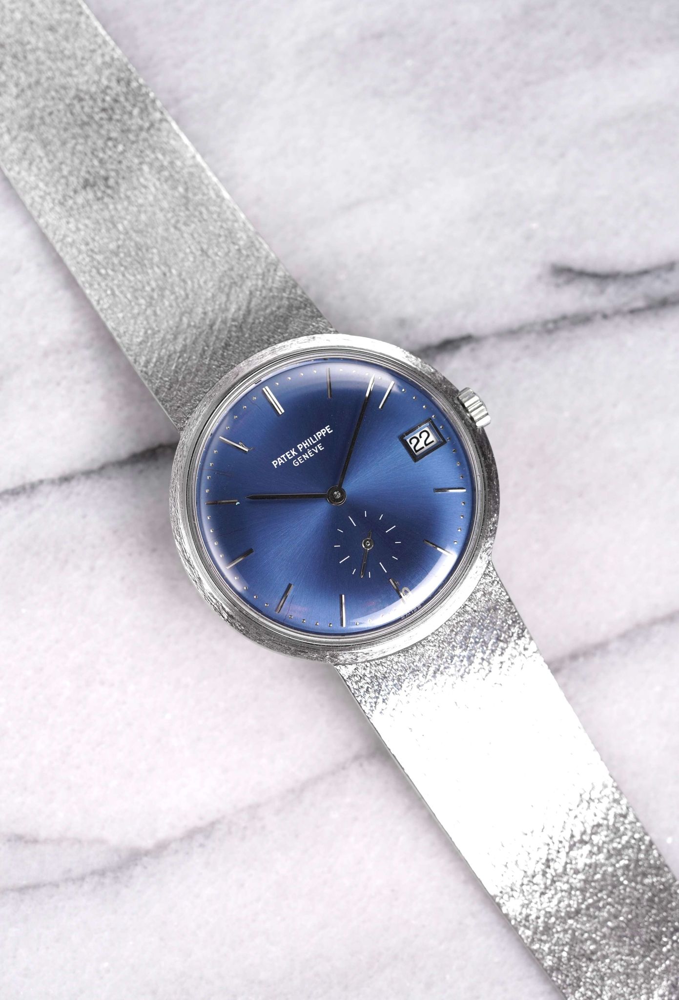 Here's a vintage Patek Philippe Calatrava reference 3445 automatic in 18K white gold with a blue sunburst dial from the 70s. Keeps great time and is fully functional. Measurements include a 35mm case across and an 18mm lug width (that fits up to a 7.5 inch wrist. Quickset date function at 3 a clock. Blue sunburst dial. Clean sunburst blue dial. Matching silver hands and hour markers. White gold case and bracelet. It’s nice to see a long uncut bracelet. The piece is great alternative and value from other pieces offered by Patek. These Calatravas are hard to find with a blue dial as many of them are silver. All parts are original including the dial, case, and movement. the dial and case are in great cosmetic, untouched condition.