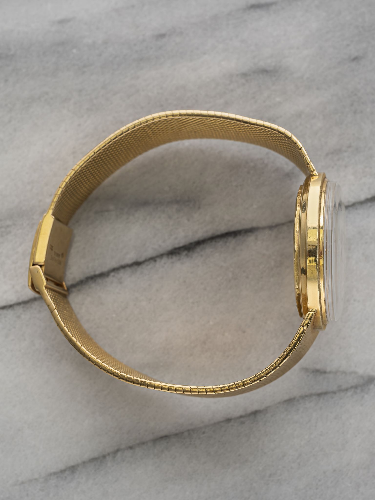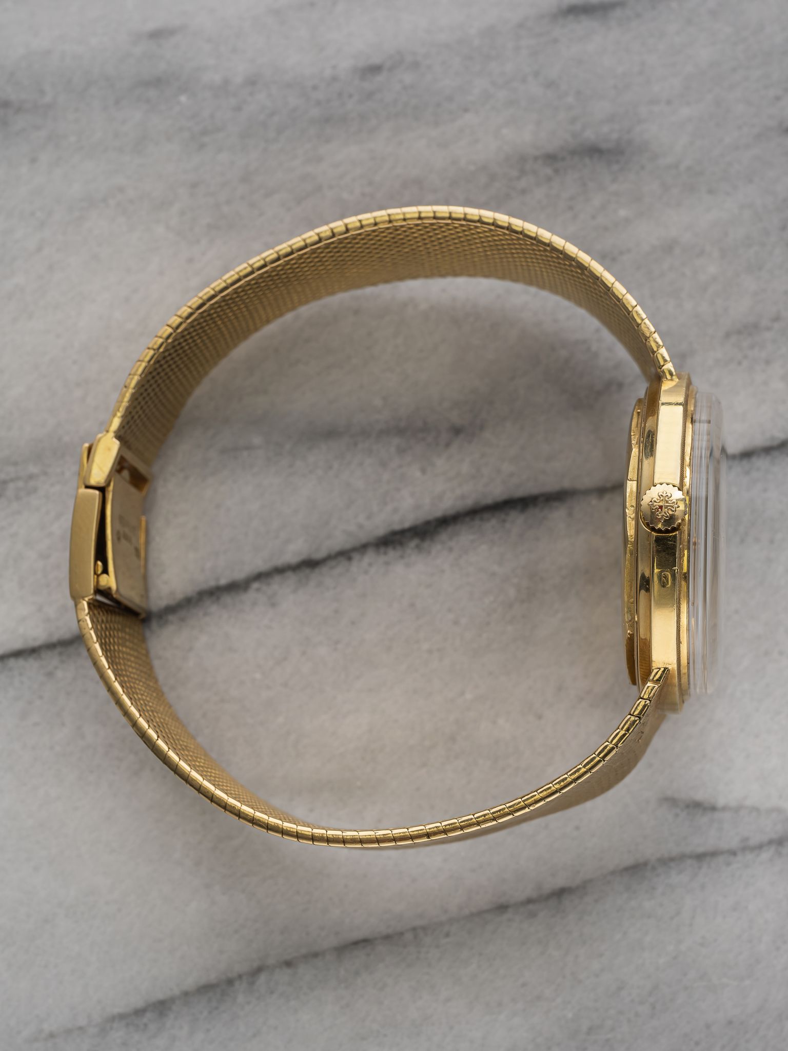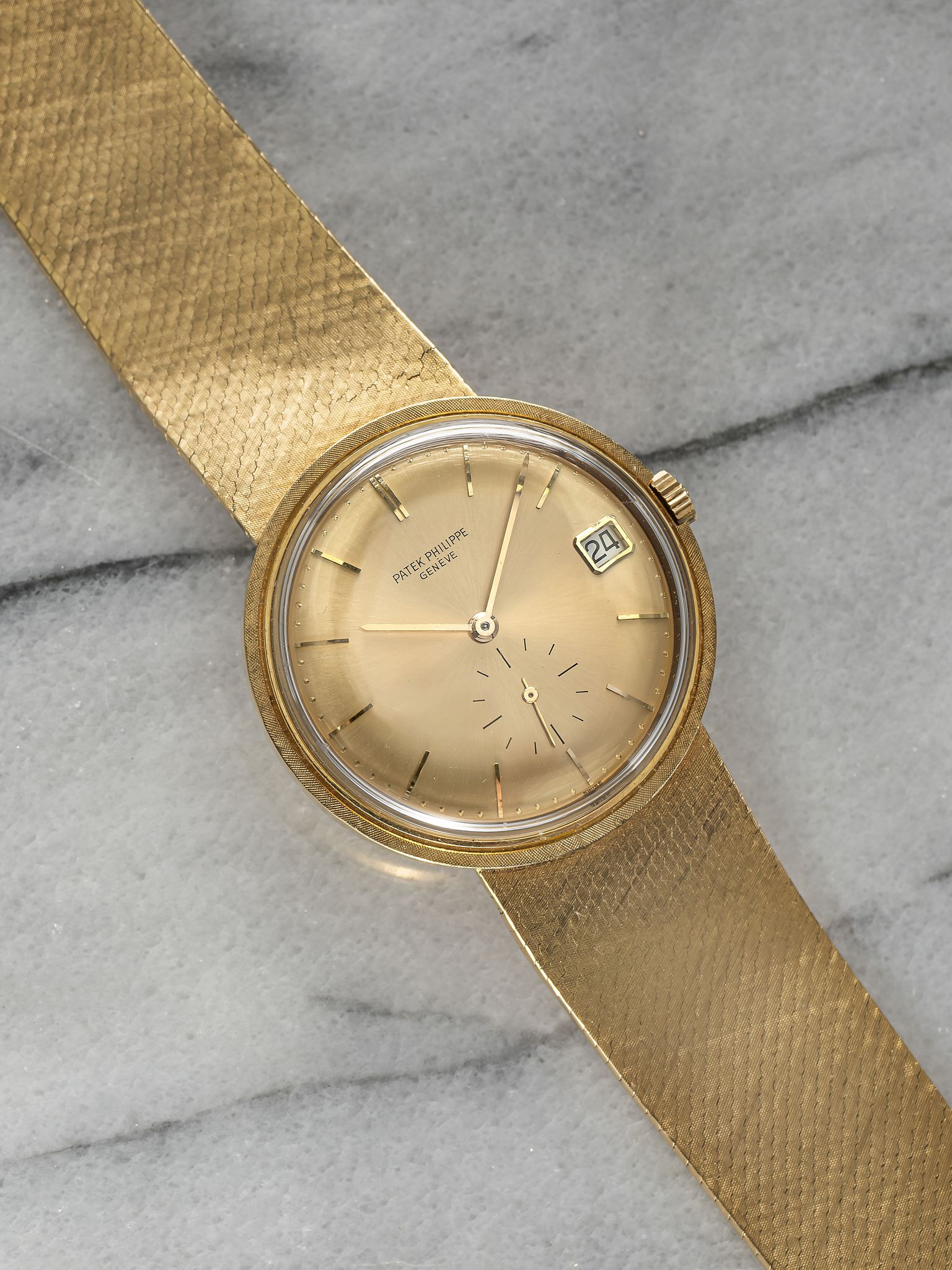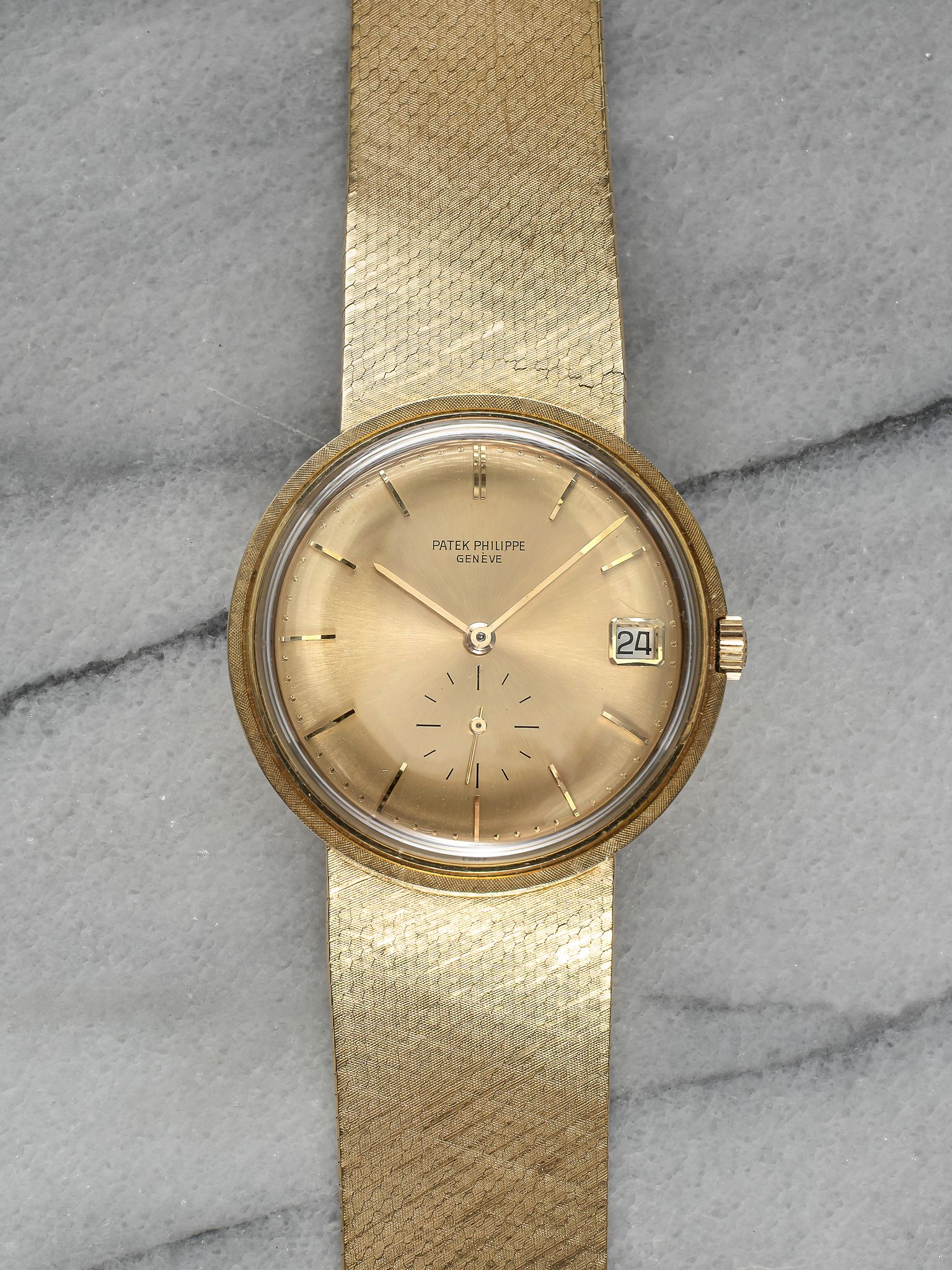 Here's a vintage Patek Philippe Calatrava reference 3445 automatic in 18K yellow gold with a champagne sunburst dial from the 70s. Keeps great time and is fully functional. Measurements include a 35mm case across and an 18mm lug width (that fits up to a 7.25 inch wrist. Quickset date function at 3 a clock. Champagne sunburst dial. Matching gold hands and hour markers. The piece is great alternative and value from other pieces offered by Patek. All parts are original including the dial, case, and movement. the dial and case are in great cosmetic, untouched condition.