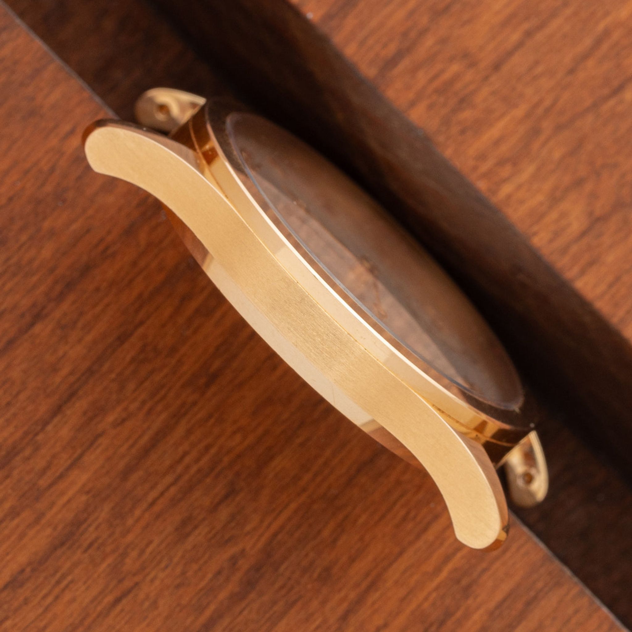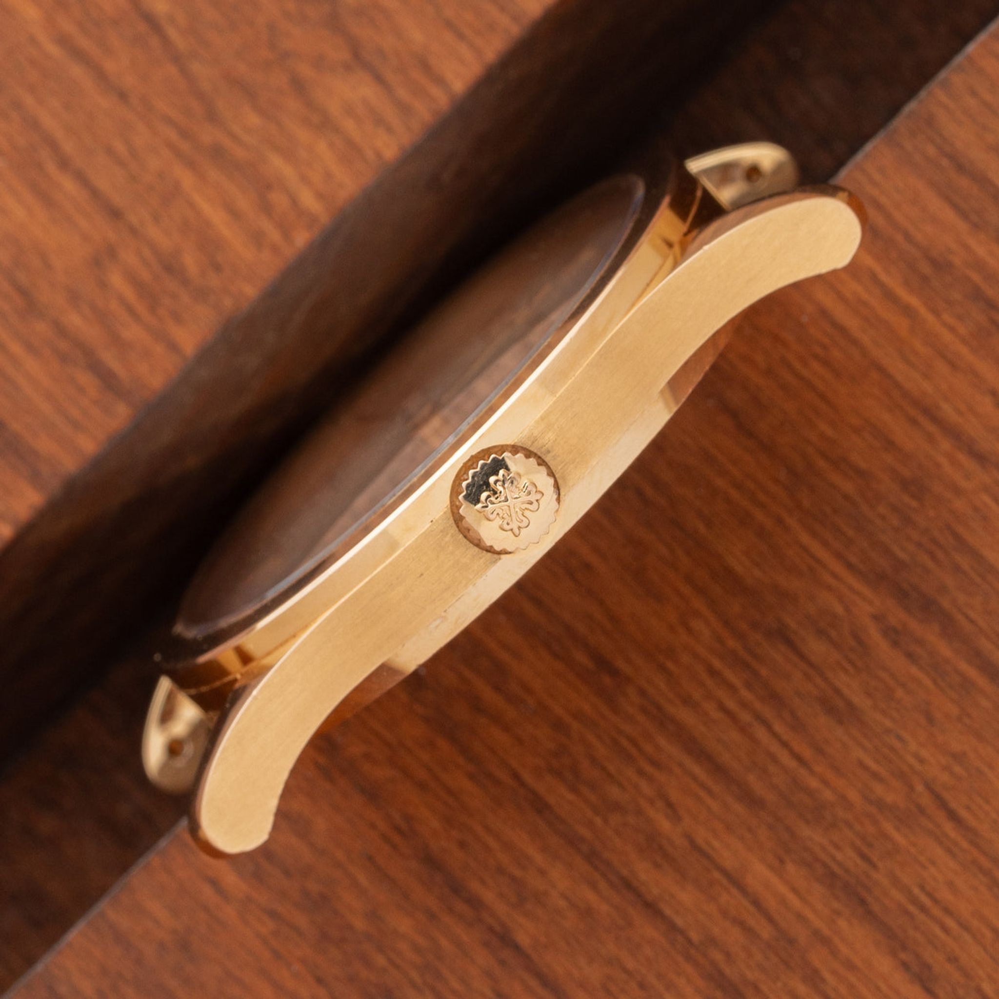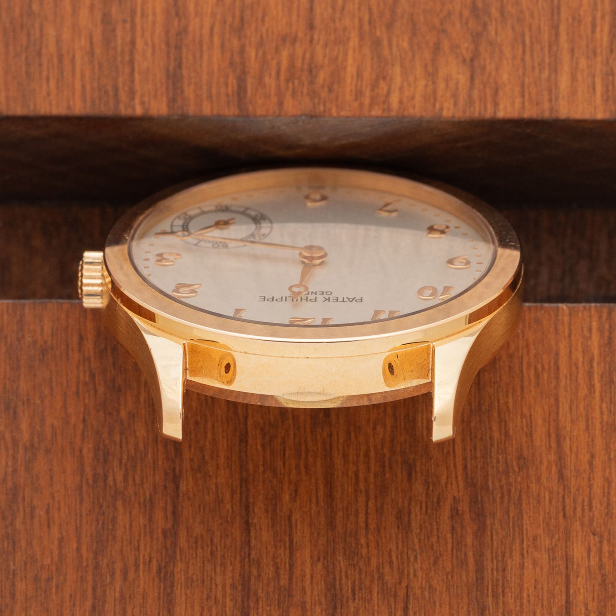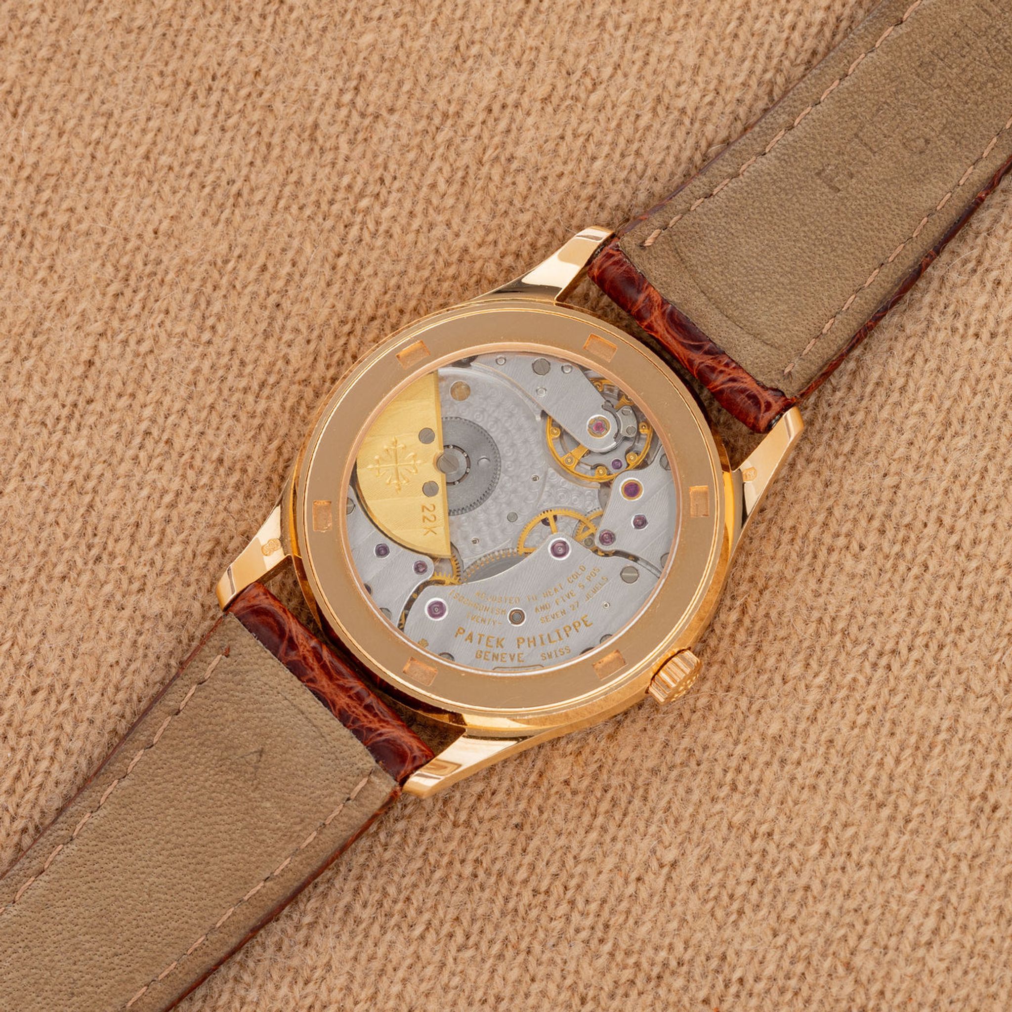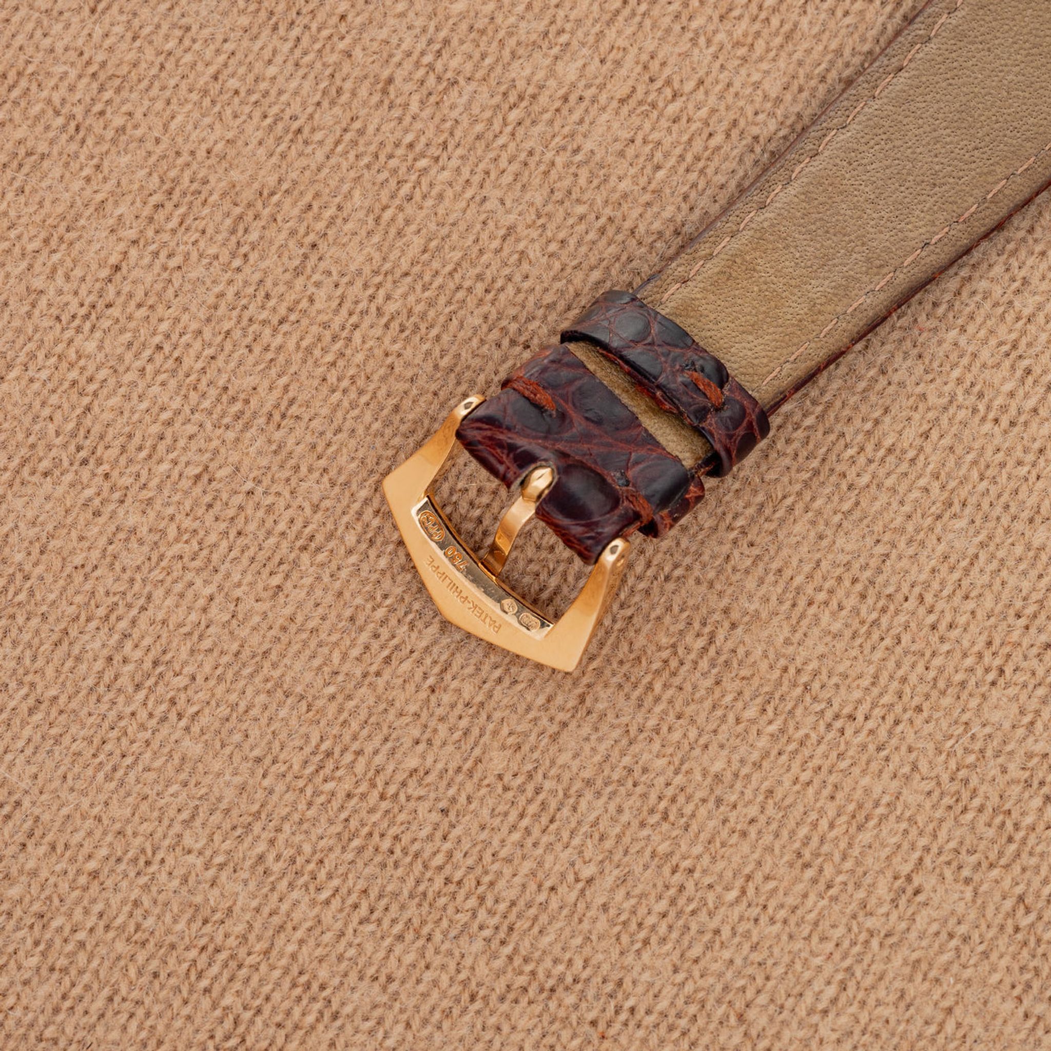 Crystal: Clear. Bracelet: Two piece gator strap in brown with 18k rose gold buckle - both Patek Philippe.