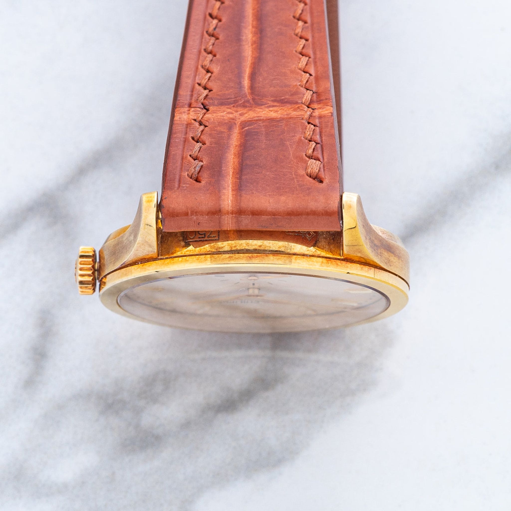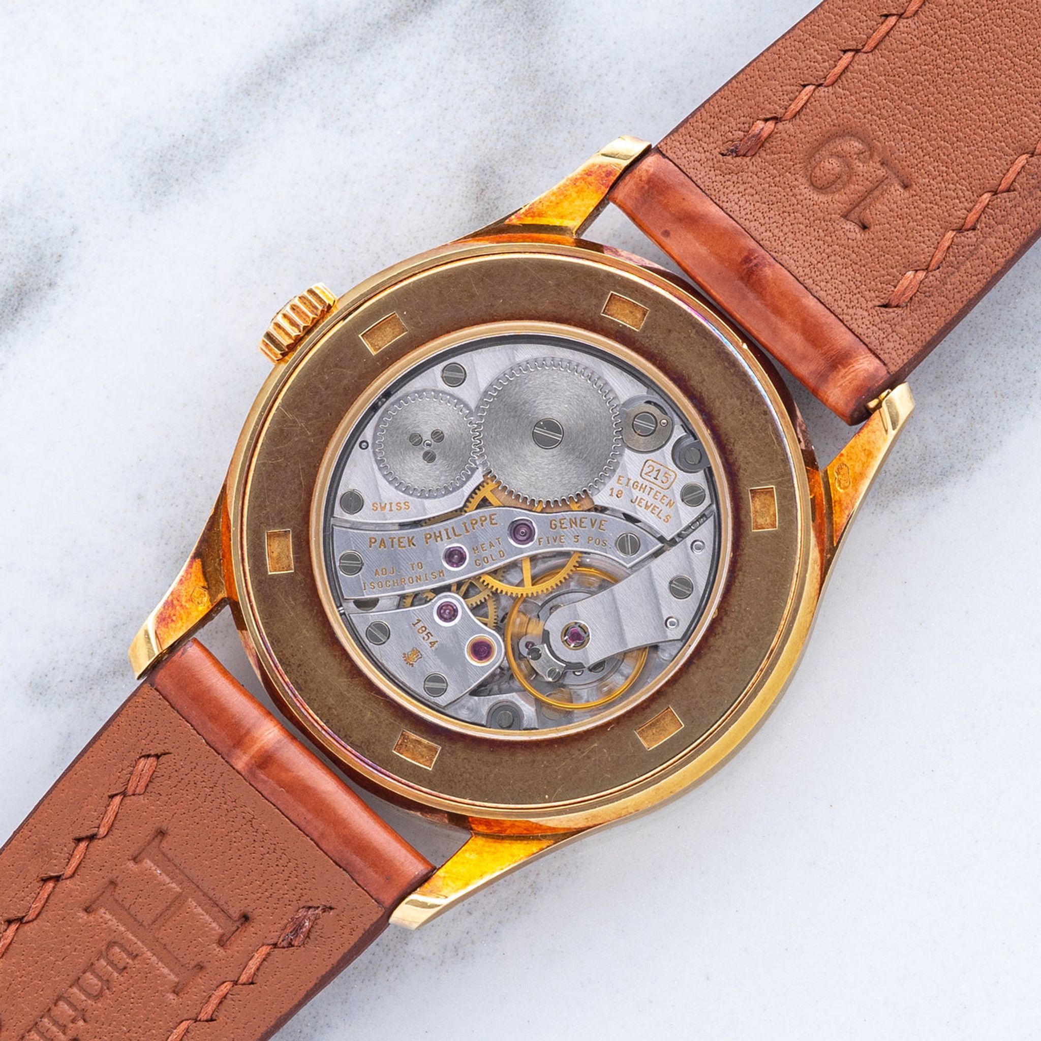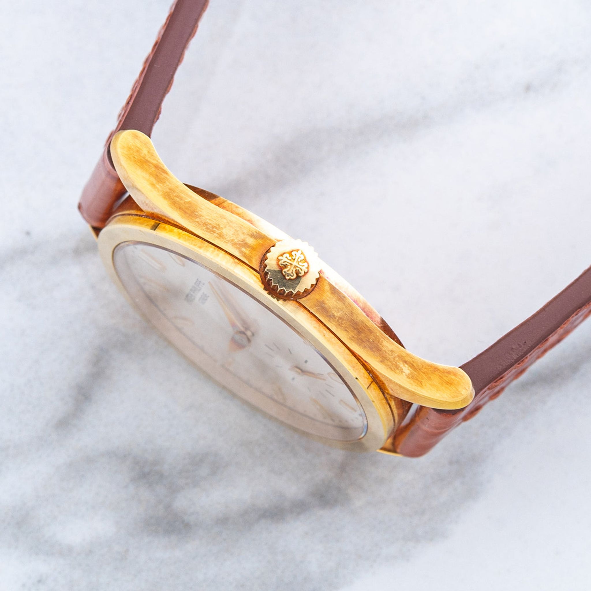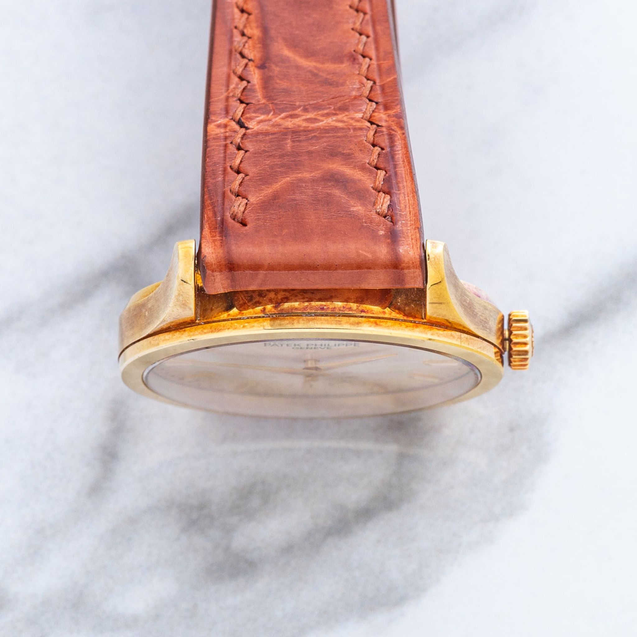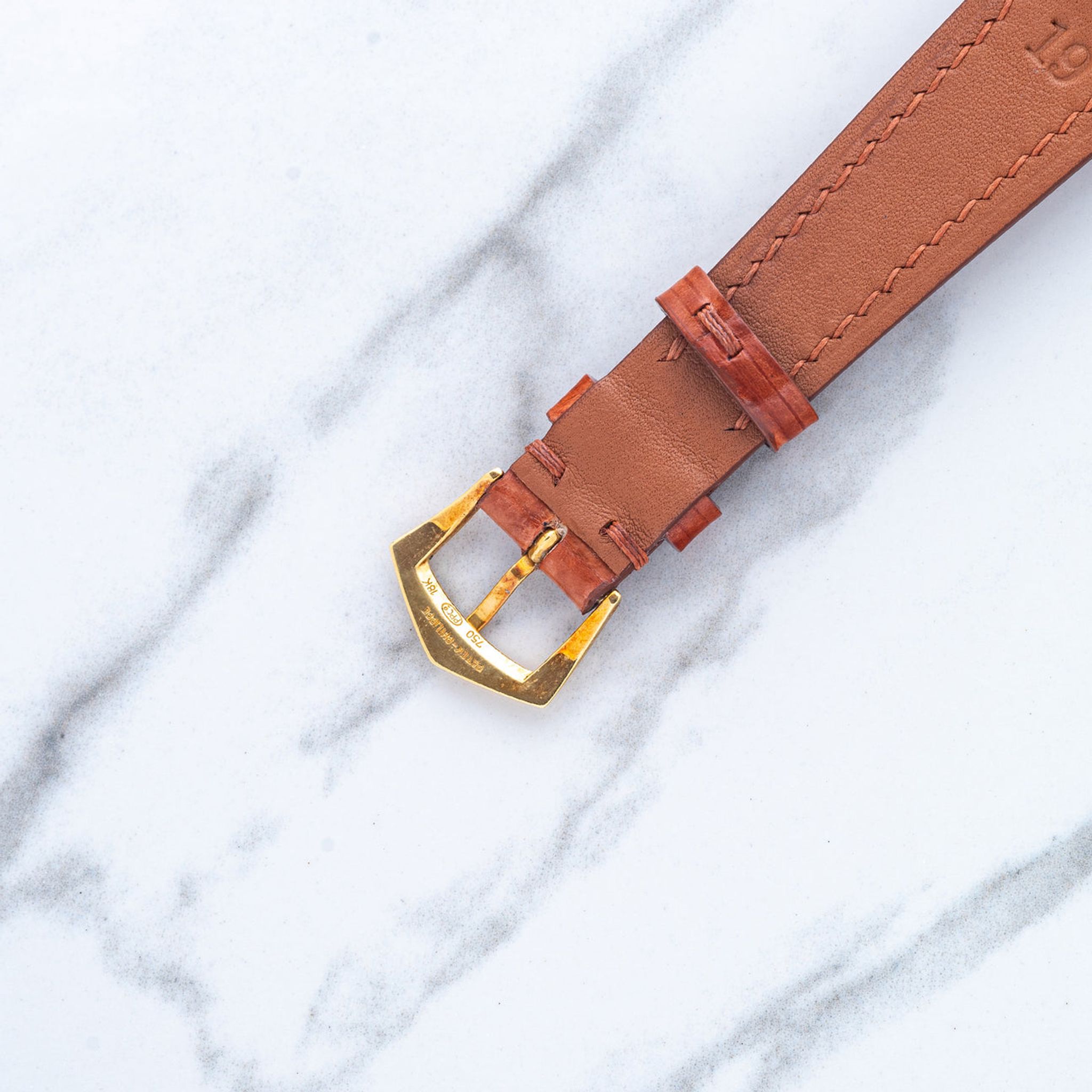 Crystal: Clear. Bracelet: 18k Patek Philippe buckle on a custom made gator strap in brown. Accessories: Inner and outer boxes, warranty papers, booklets, booklet folder.