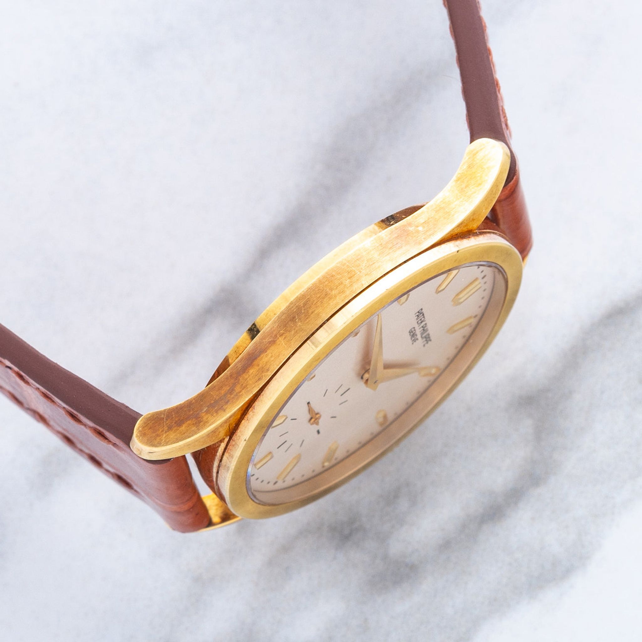 This particular example on offer is a true collectors set, boasting beautiful and unique patina through its' case. The dial is mint and the case is sharp and unpolished. This rare set also comes with warranty papers, inner and outer boxes, booklets and folder as well as the 18k Patek signed buckle which is mounted on a fresh custom made gator strap. We are huge fans of this particular Patek ref. as it derivates closely from the original 1930s design with slightly boosted proportions. For anyone looking for a truly special Calatrava, this piece is a great opportunity to acquire what we believe could be an important vintage gem of tomorrow.