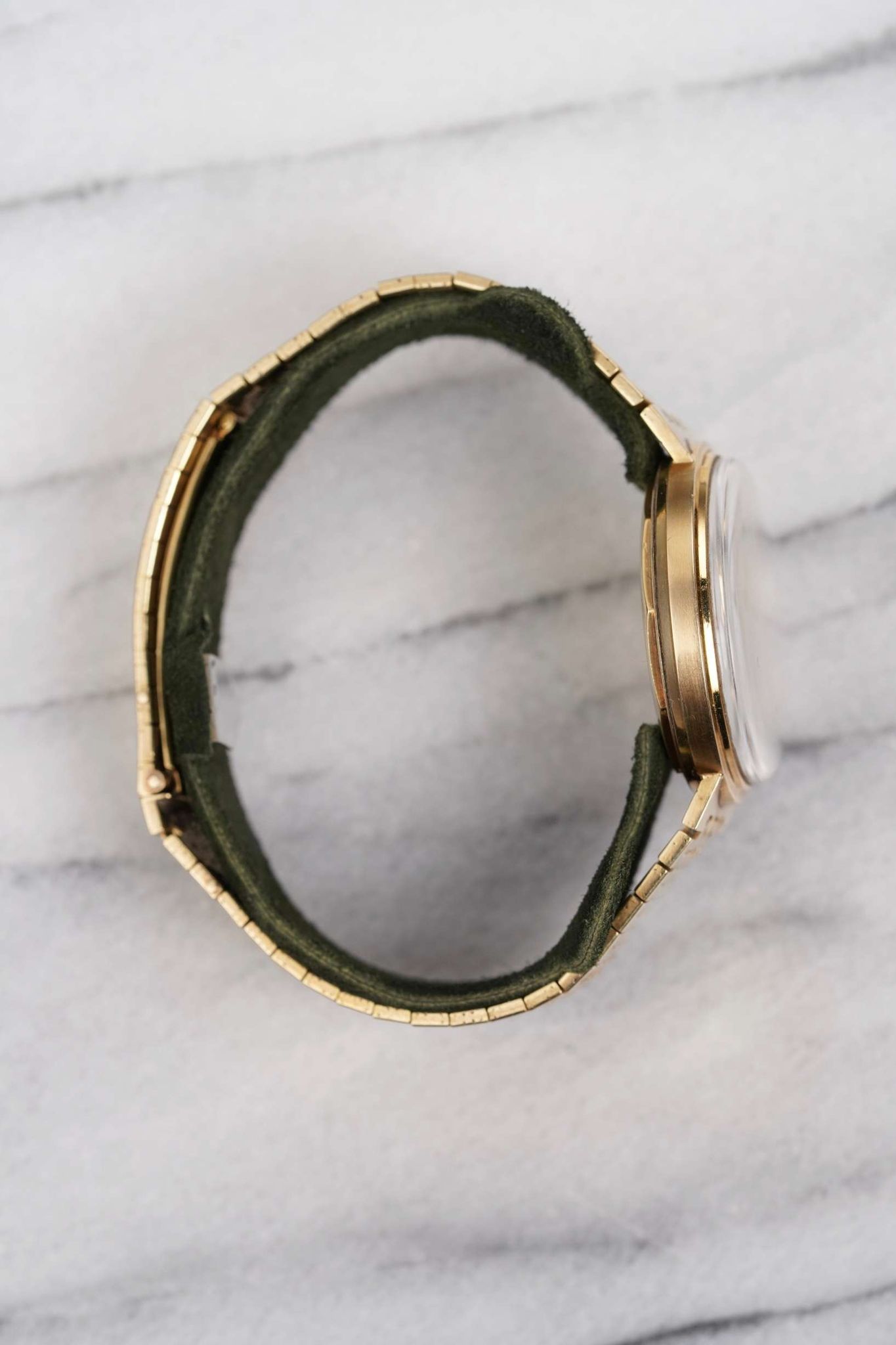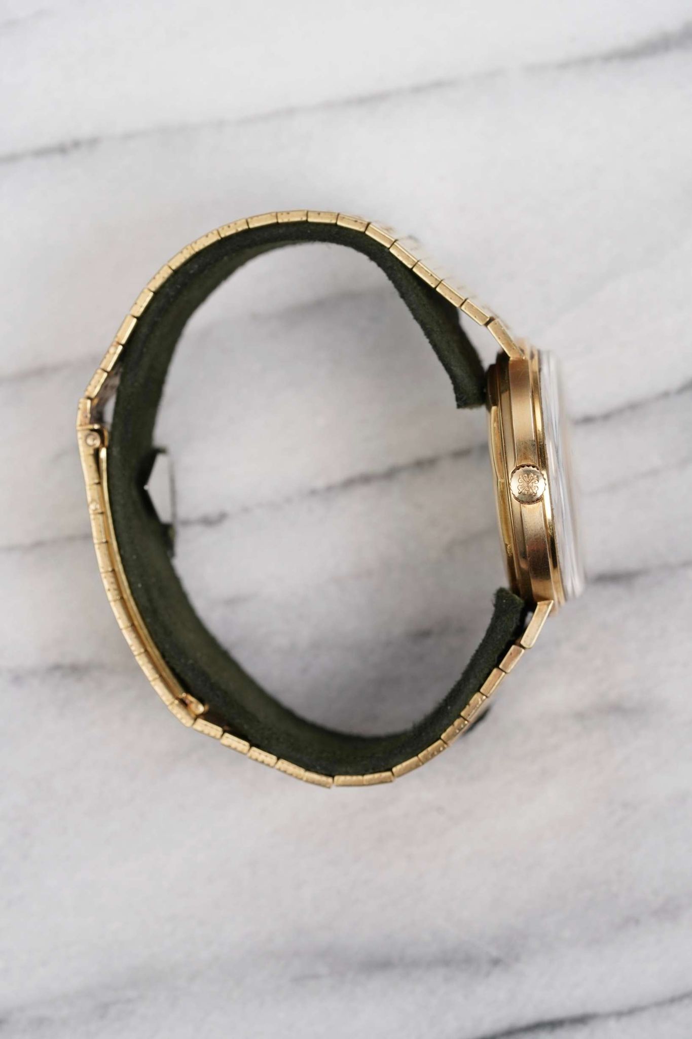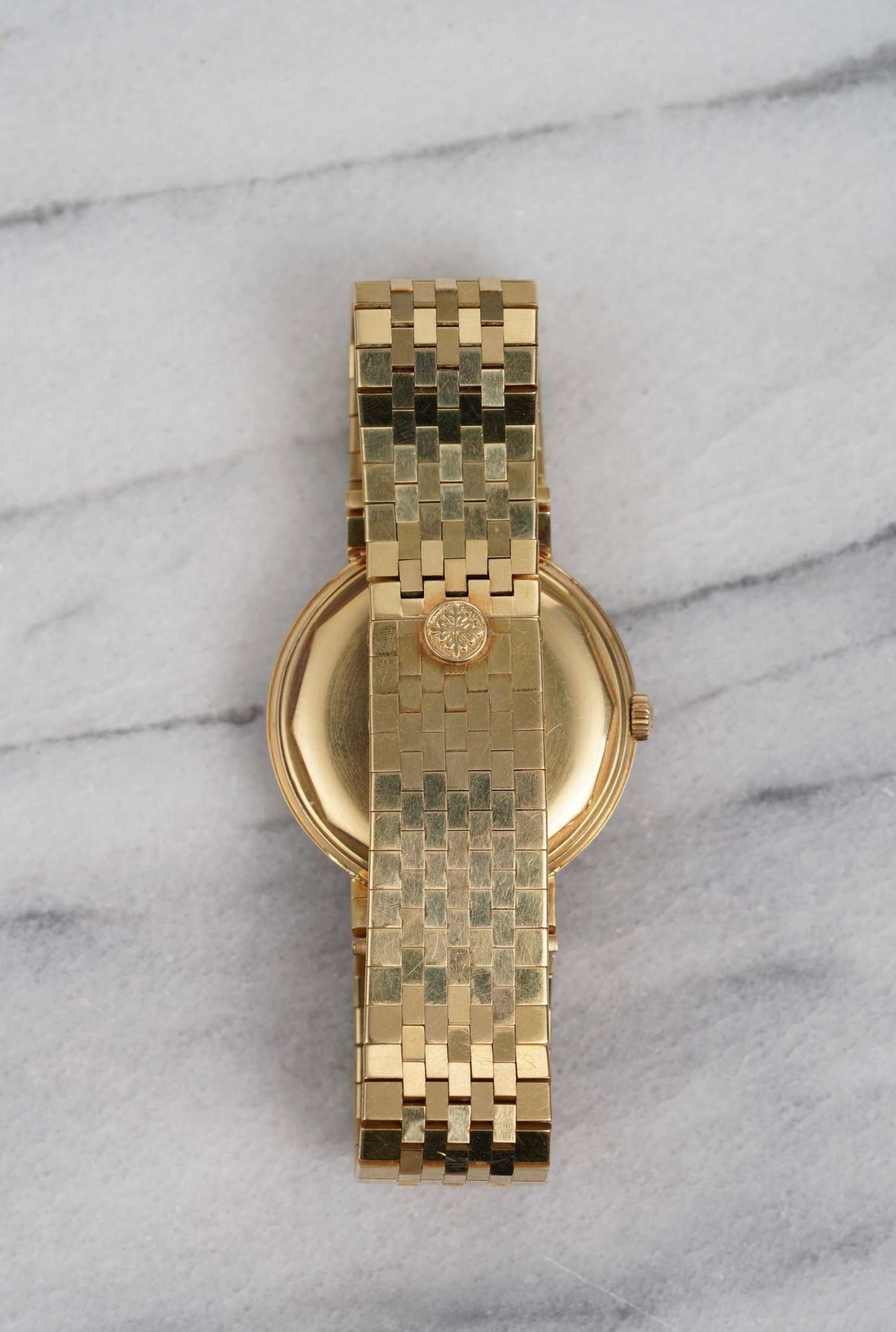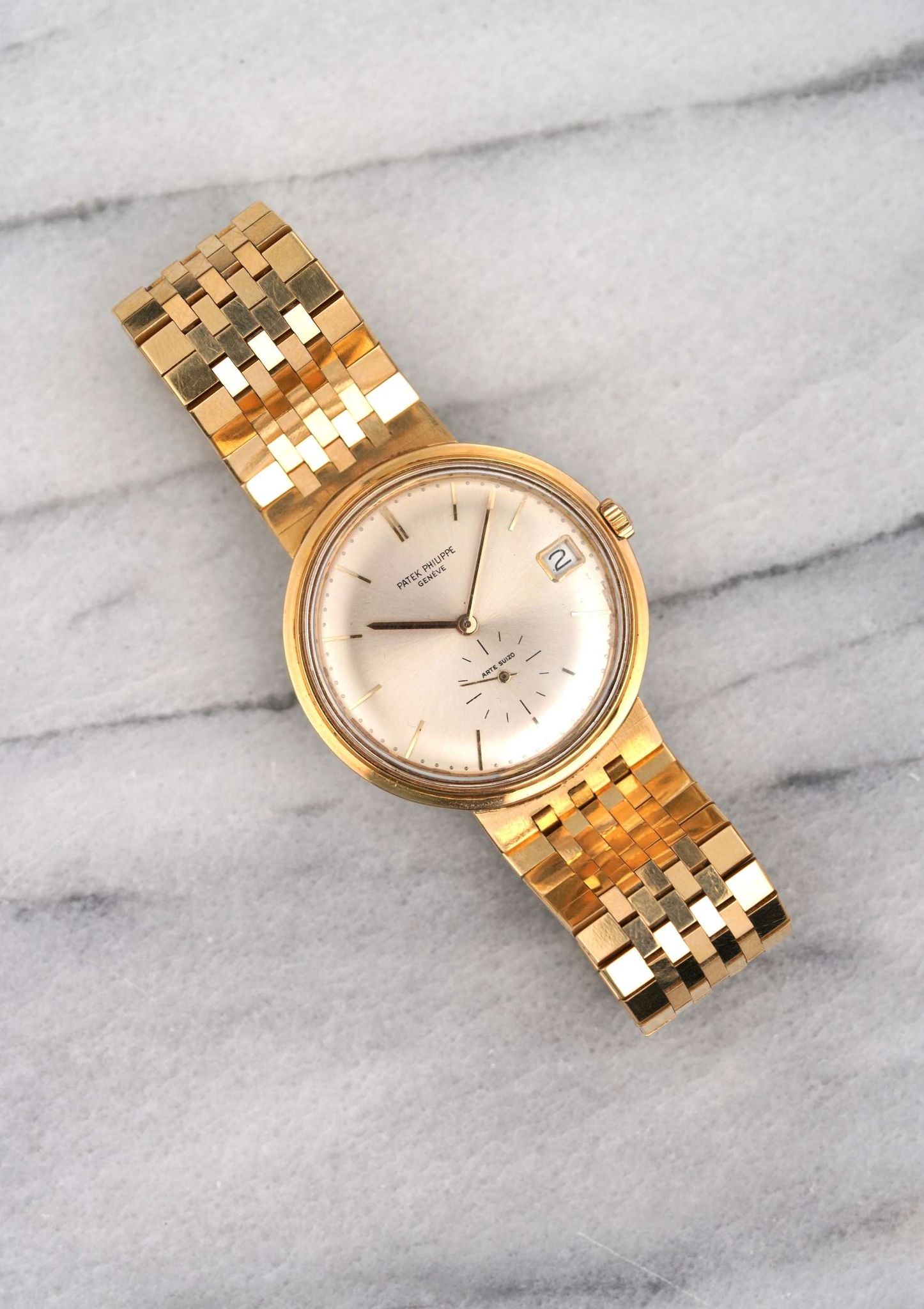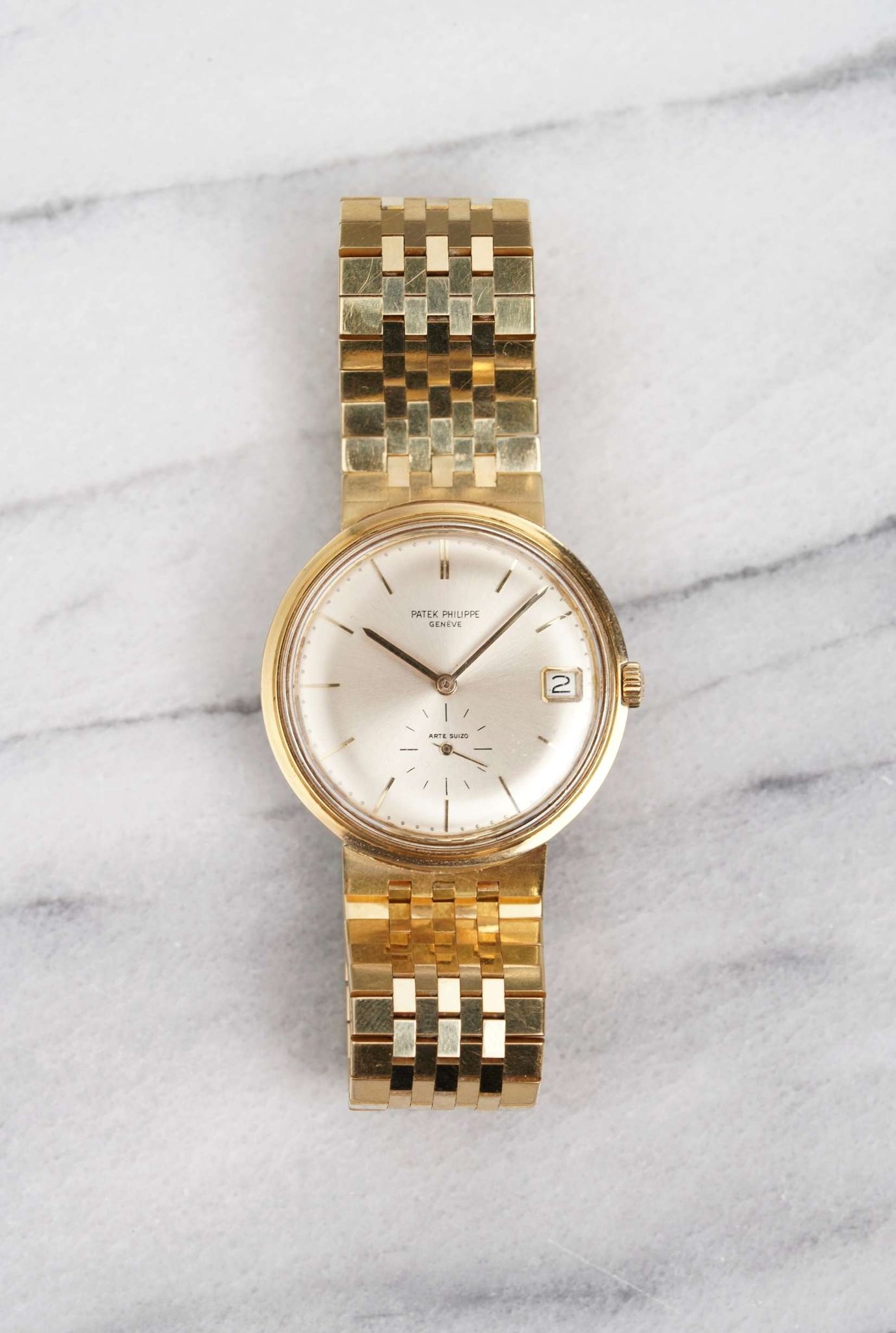 Here's a vintage Patek Philippe Calatrava reference 3445 automatic in 18K yellow gold with a silver sunburst dial from the 70s. Keeps great time and is fully functional. A unique brick-like bracelet as opposed to the typical mesh bracelet. Measurements include a 35mm case across and an 18mm lug width (that fits up to a 7.75 inch wrist. Date function at 3 a clock. Blue sunburst dial. Matching gold hands and hour markers. Yellow gold case and bracelet. It’s nice to see a long uncut bracelet. Sub seconds at 6 a clock. It is double signed "Arte Suizo" at the sub seconds, a Columbian retailer. The piece is great alternative and value from other pieces offered by Patek. These Calatravas are hard to find with a blue dial as many of them are silver. All parts are original including the dial, case, and movement, ans the dial and case are in great cosmetic, untouched condition.