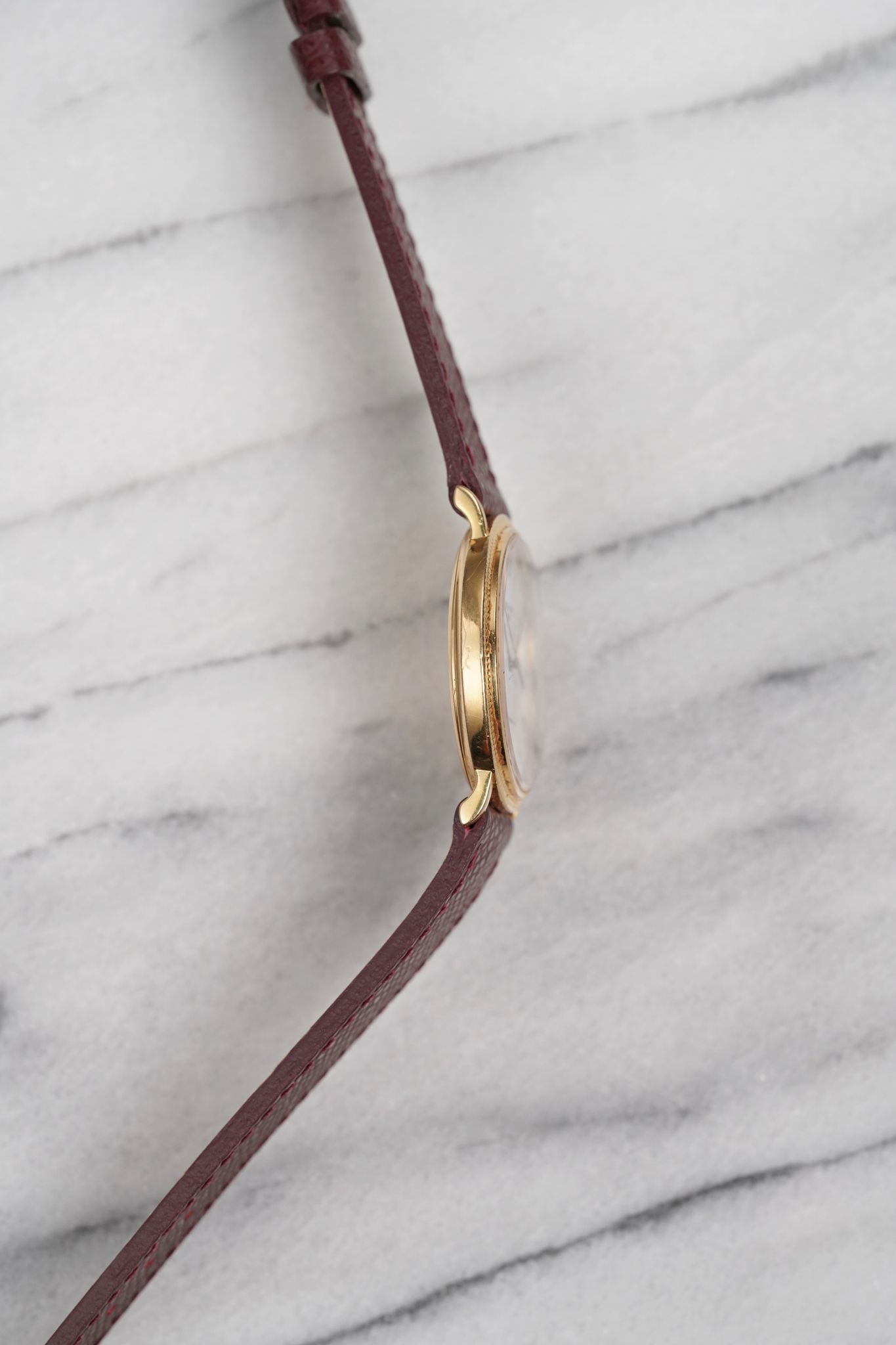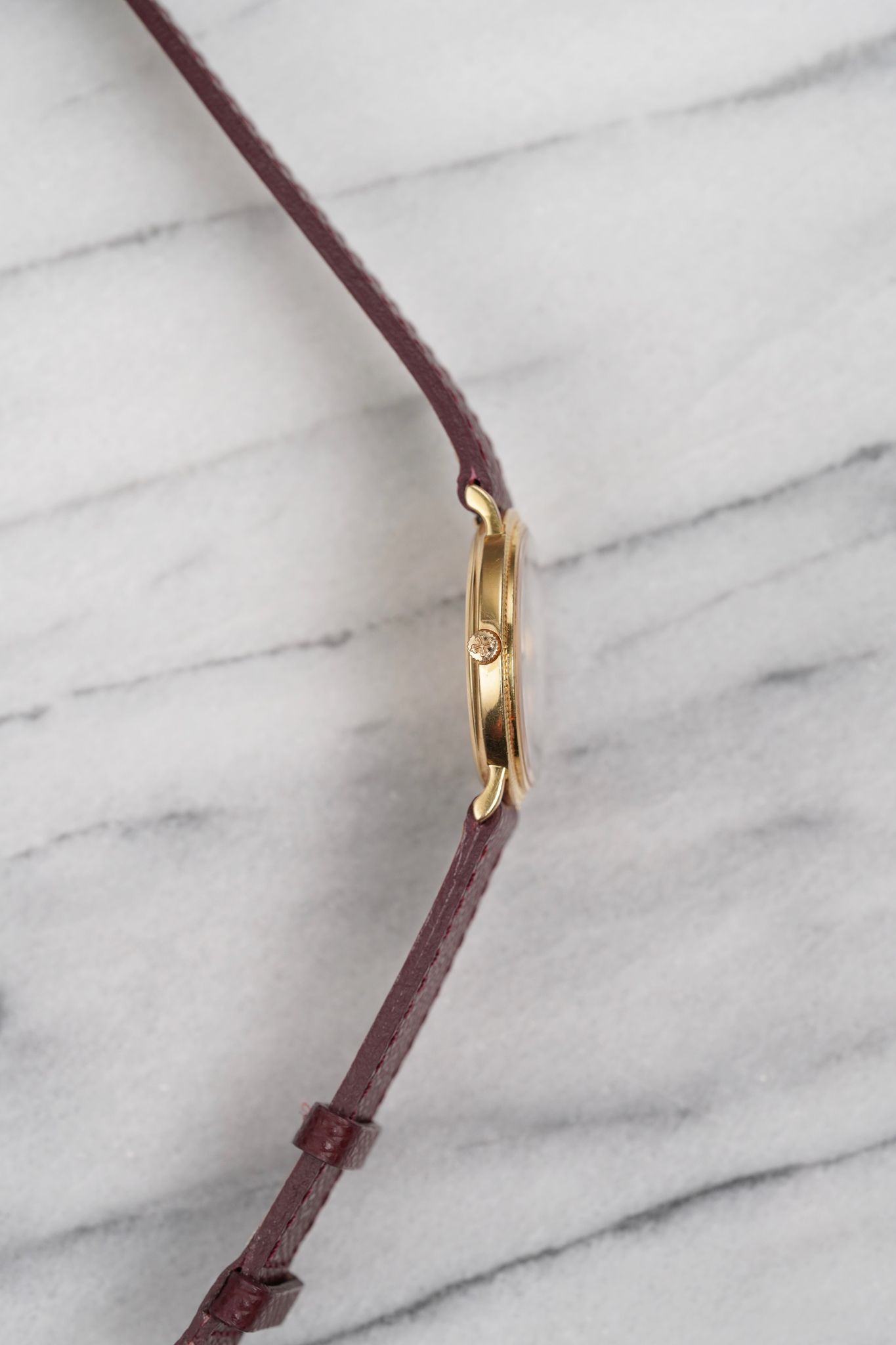 Here’s a Patek Philippe Calatrava quartz white roman numeral dial from the 1990s featuring a Tiffany stamp at 6 aclock. Measurements include a 34mm case and 18mm lug width. On an aftermarket maroon pebble textured leather strap (Made in Italy). Quickset date function at 3 a clock. Hobnail finishing on the bezel. The caseback has a personal engraving. All parts are original including the dial, movement, and cashback.
