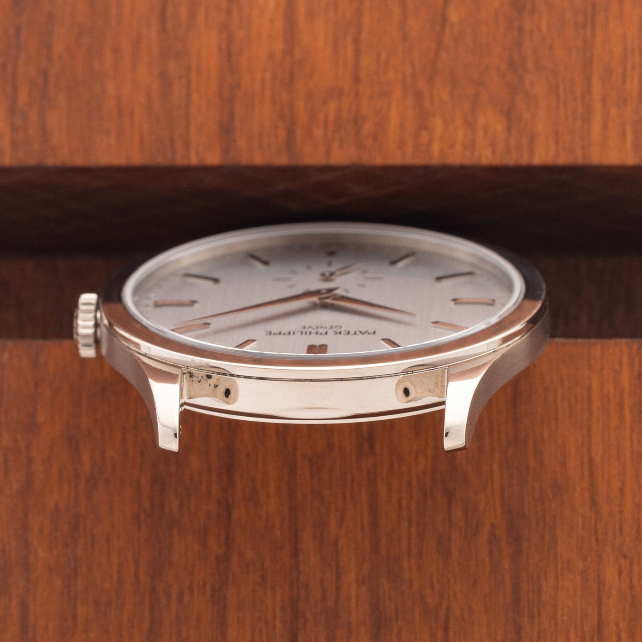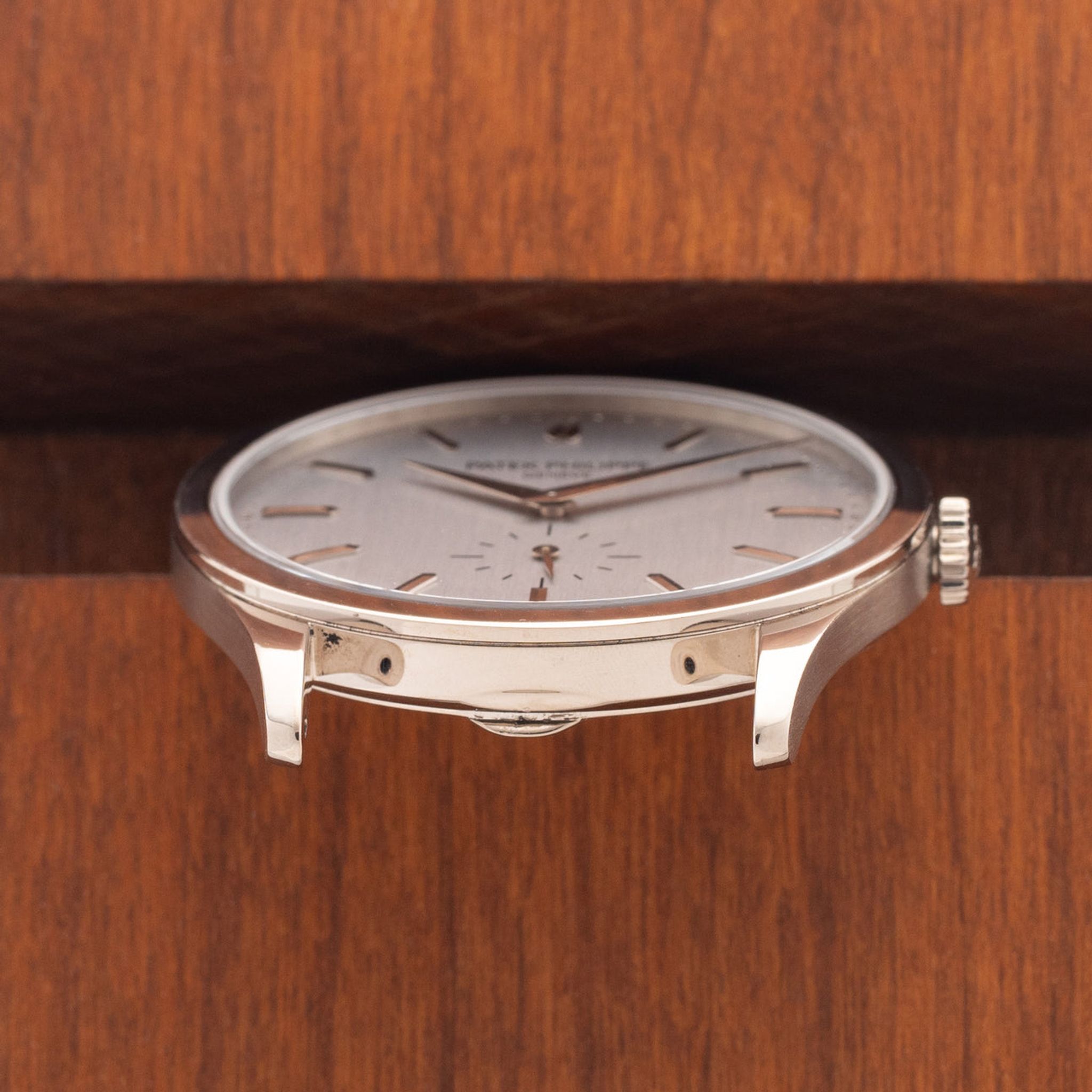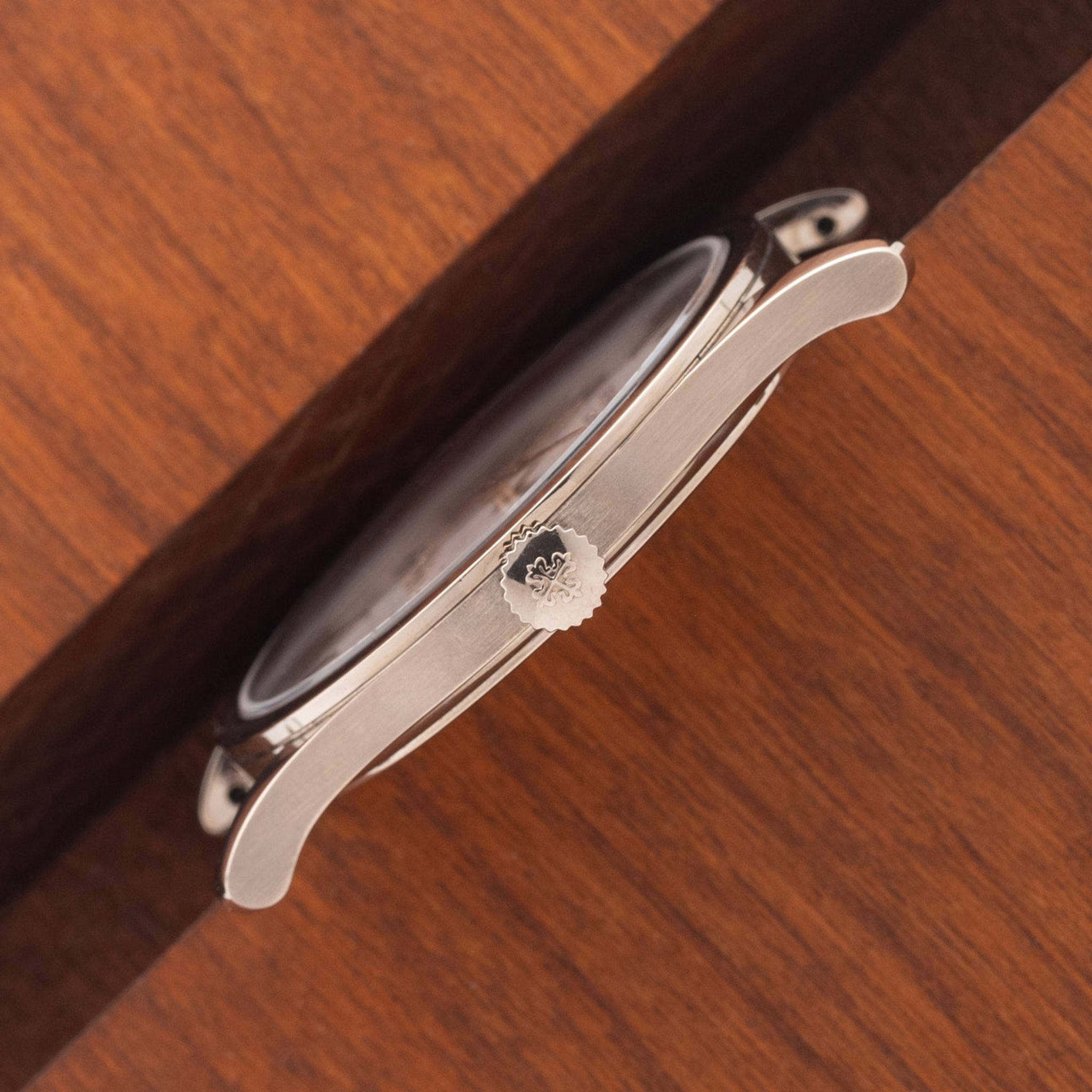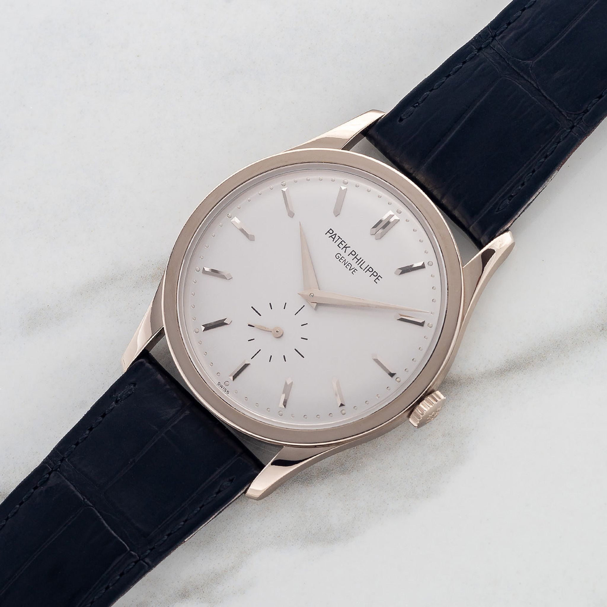 This particular piece, circa 2010 is a true collector grade example and comes with an archive extract adding to its provenance. The dial is mint and the hands are devoid of service marks. The case is very clean and appears unpolished with sharp edges and deep hallmarks. Also included is its Patek Philippe strap and 18k pink buckle. It doesn't get more classic than this for Patek design language and in white gold this piece is perfectly understated as a Calatrava should be.