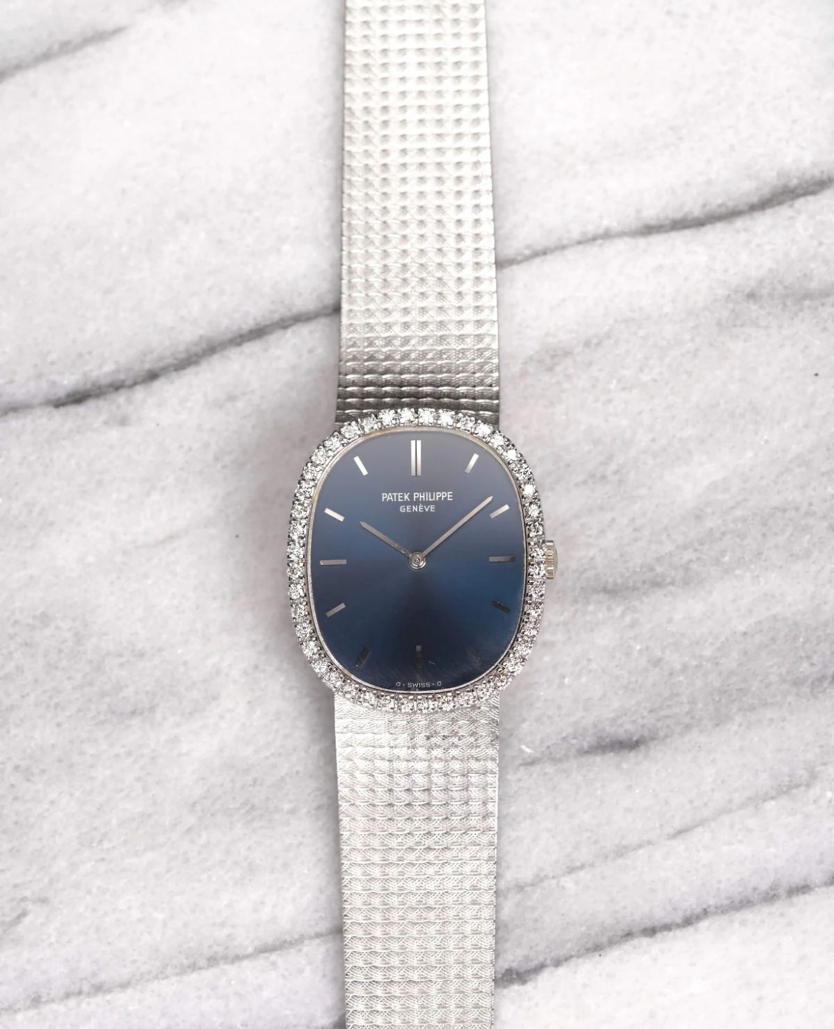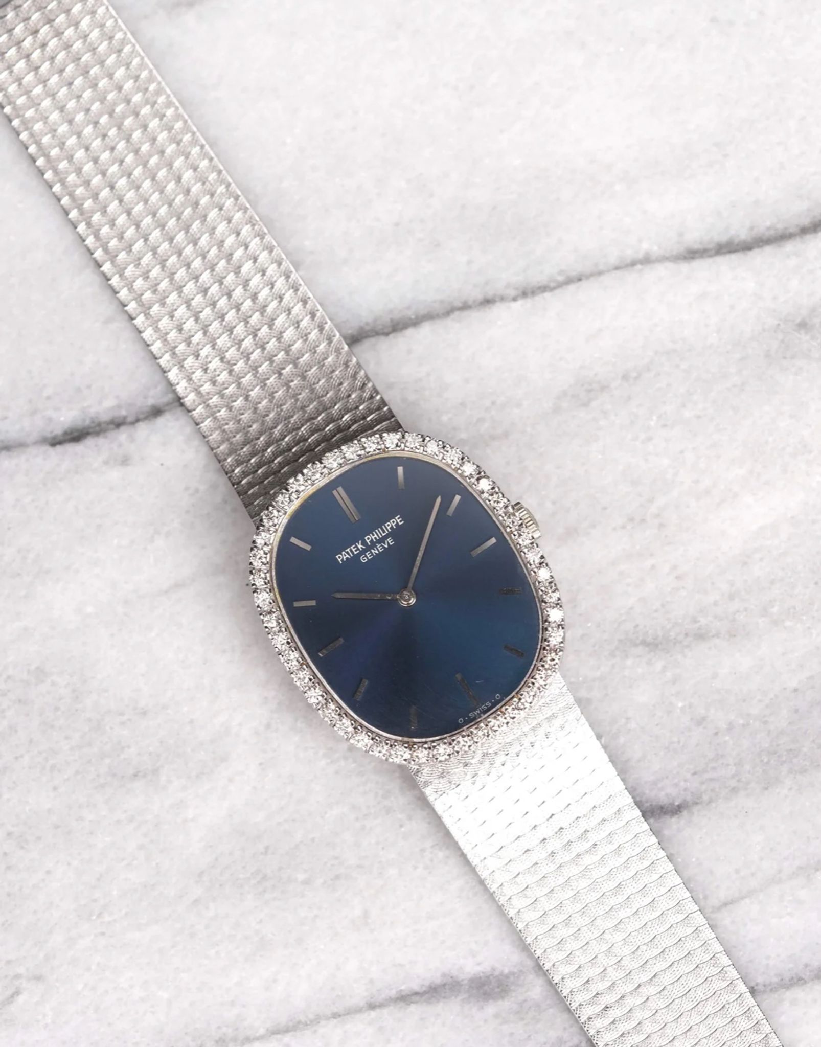 Here's a vintage Patek Philippe Ellipse manual wind in 18K white gold with a blue sunburst dial from the 1990s. An after market diamond bezel. Keeps great time and is fully functional. Measurements include a 32mm case across and an integrated bracelet (signed clasp) that fits up to a 6.25 inch wrist (fits a smaller wrist). There is a knot/ rope braid finishing and texture on both the bezel and bracelet. Sigma dial at 6 a clock indicates that the hands and hour markers are made of gold. Matching stick hands and hour markers. White gold case and bracelet. The piece is unisex, it can be worn by both men and women. The piece is quite feminine, but both men and women can wear it. Interesting texture on the integrated bracelet, as seen in photos. The piece is great alternative and value from other pieces offered by AP. All parts are original including the dial, case, and movement. the dial and case are in great cosmetic, untouched condition.