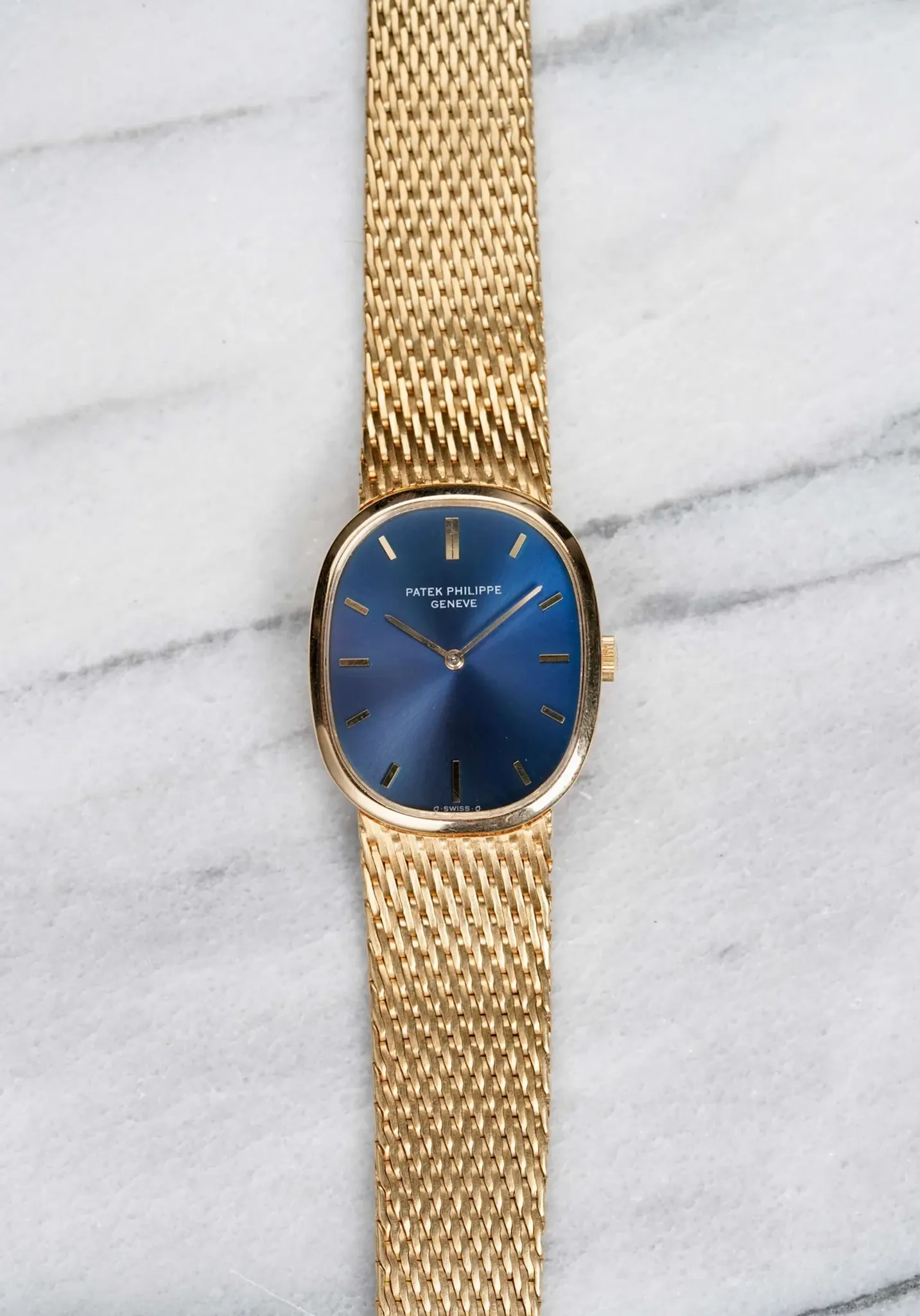Here's a vintage Patek Philippe Ellipse manual wind in 18K yellow gold with a blue sunburst dial from the 1980s. Comes with its archives from 1974. Keeps great time and is fully functional. Measurements include a 28mm case across and an integrated bracelet (signed clasp) that fits up to a 7 inch wrist. Markers are made of gold. Matching stick hands and hour markers. Yellow gold case and bracelet. The piece is unisex, it can be worn by both men and women. The dial has some marks as seen in the photos. Interesting texture on the integrated bracelet, as seen in photos. The piece is great alternative and value from other pieces offered by AP. All parts are original including the dial, case, and movement. the dial and case are in great cosmetic, untouched condition.
