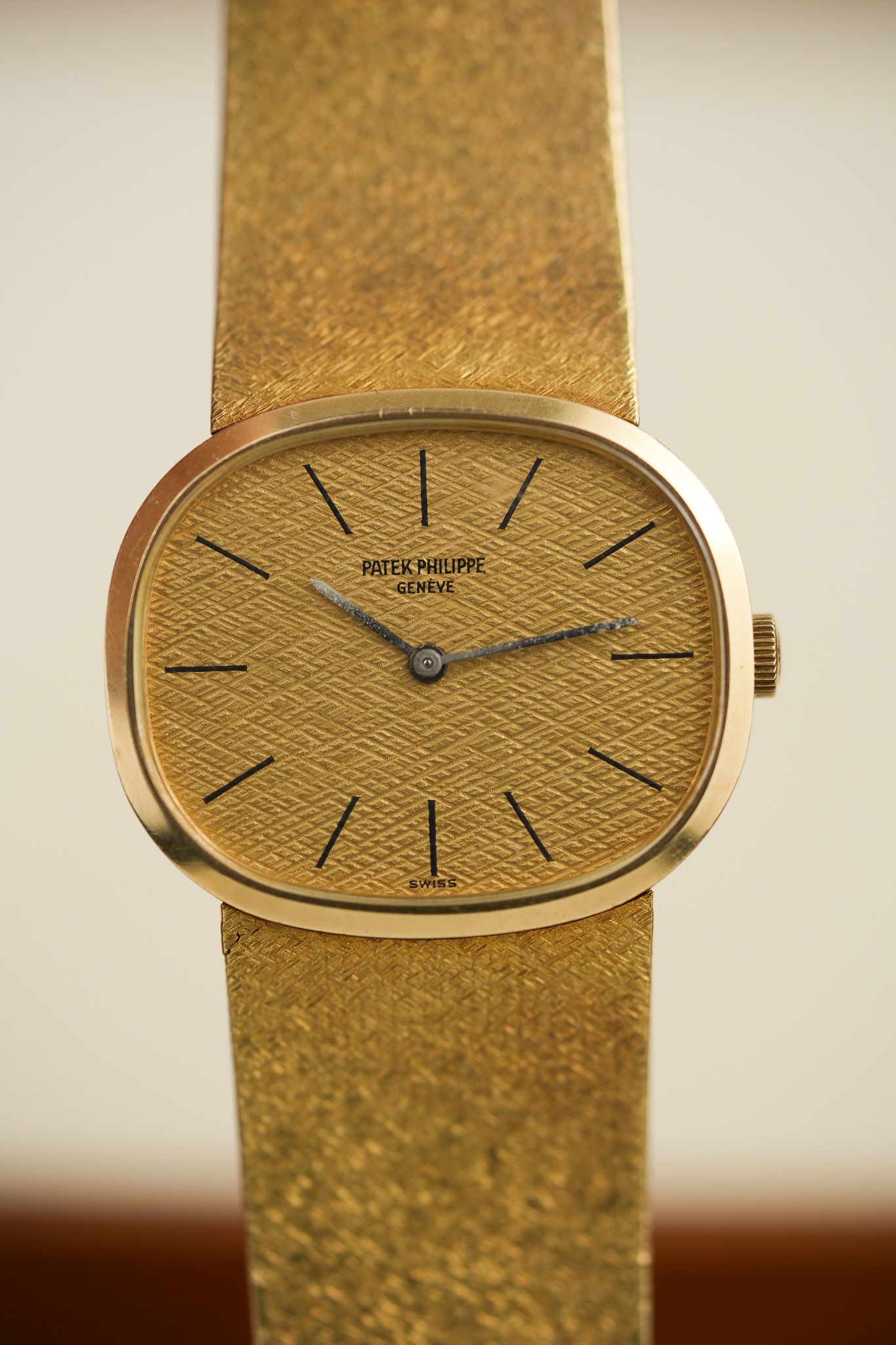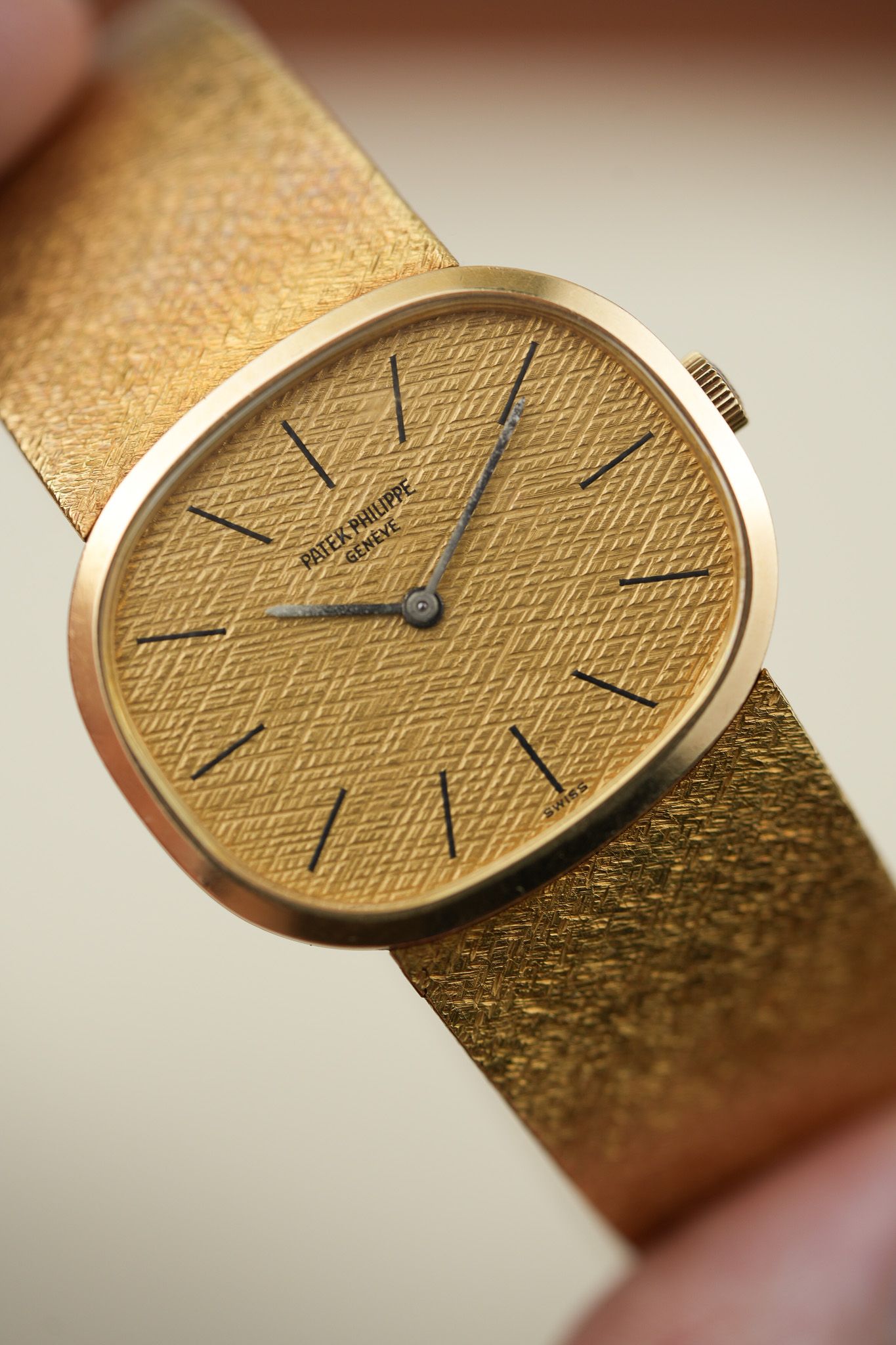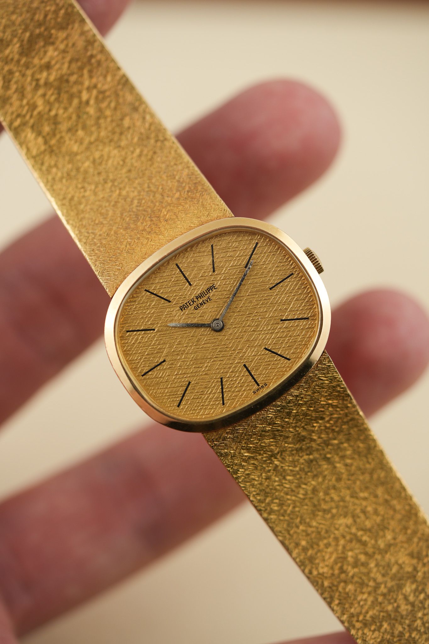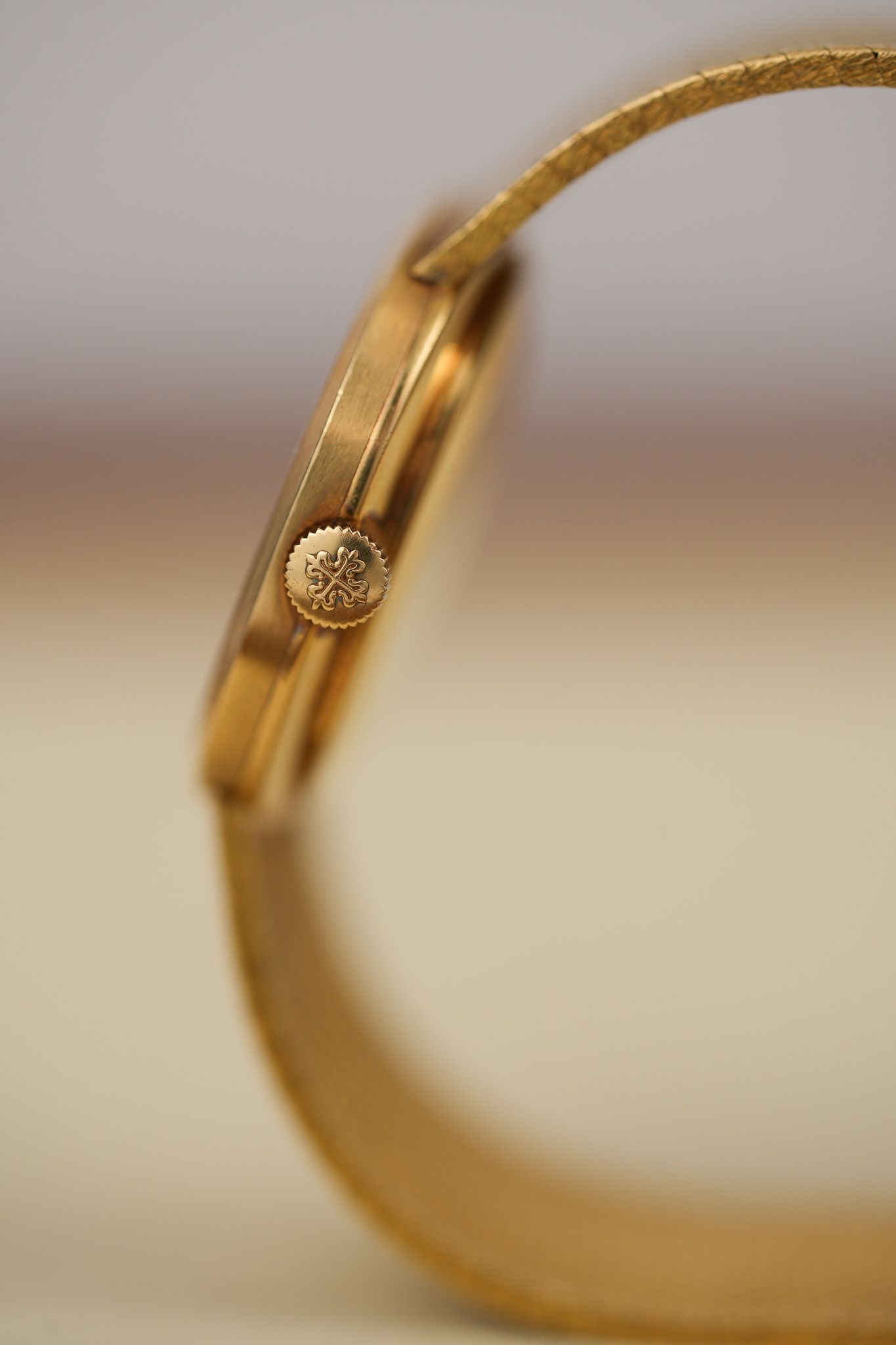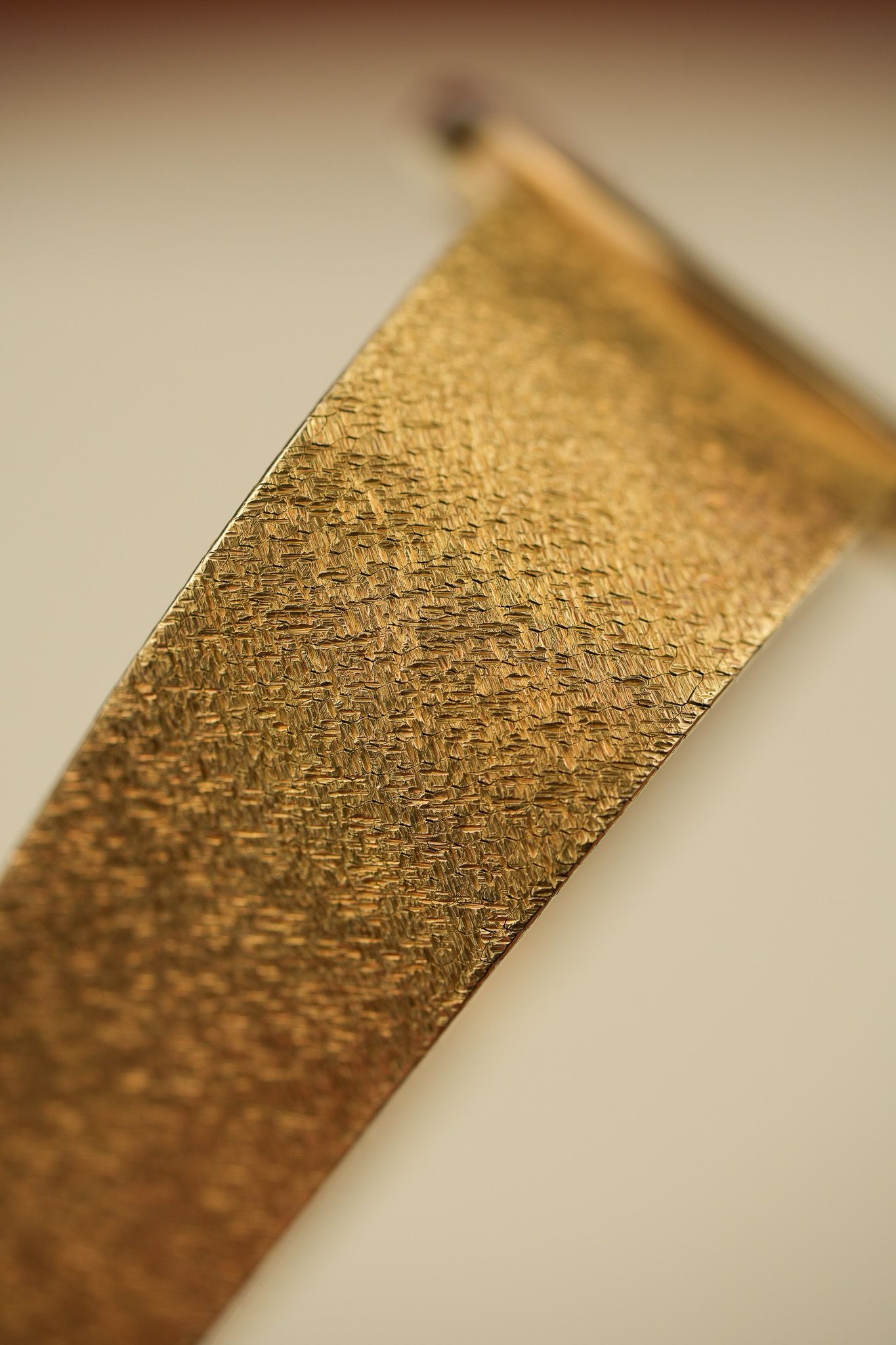 Made in the 1970s, this reference features a 32 x 27mm 18K yellow gold case with a champagne dial that’s not just “gold”—it’s textured with a linen finish that continues seamlessly onto the integrated bracelet. And not just any bracelet. This one was crafted by Jean-Pierre Ecoffey (JPE), a name well-known to serious collectors. Ecoffey made bracelets for Patek Philippe, Audemars Piguet, and others during the era when brands weren’t shy about outsourcing to the best in the game. His bracelets are beautifully executed, complex in texture, and surprisingly wearable—more like gold fabric than metal links.
