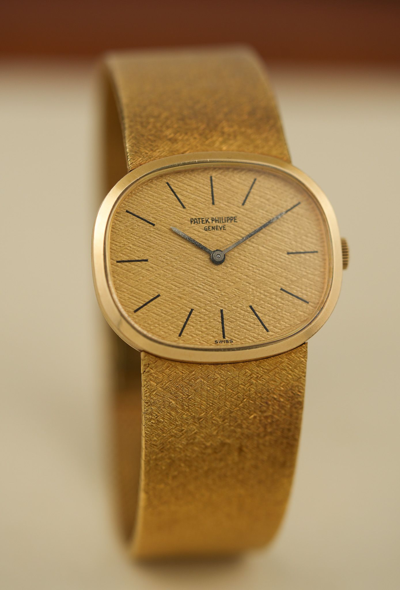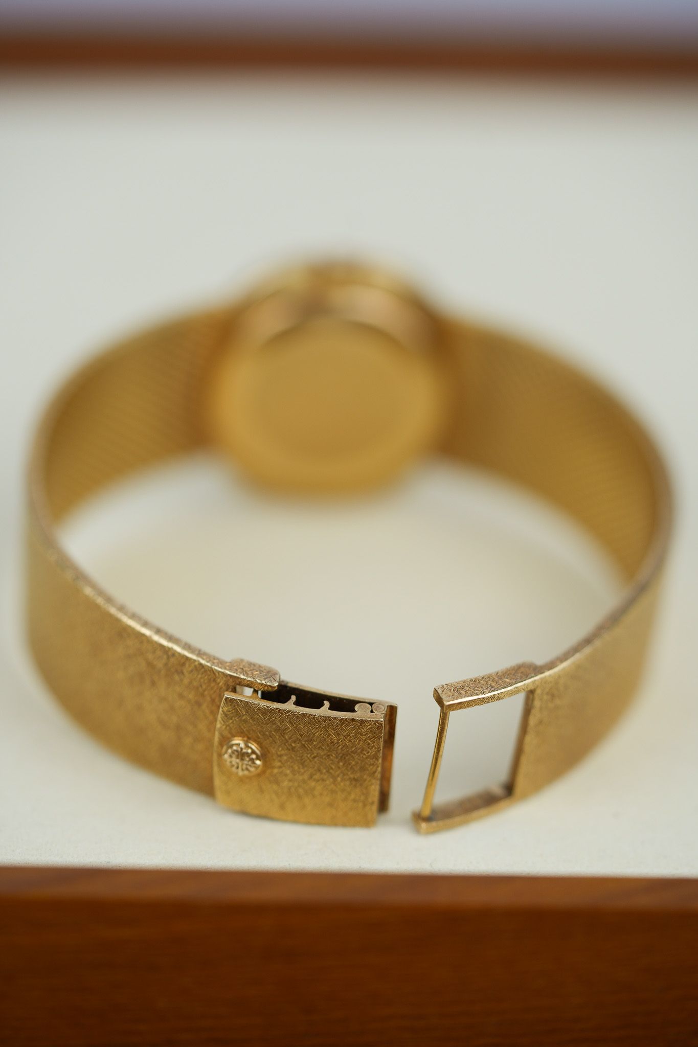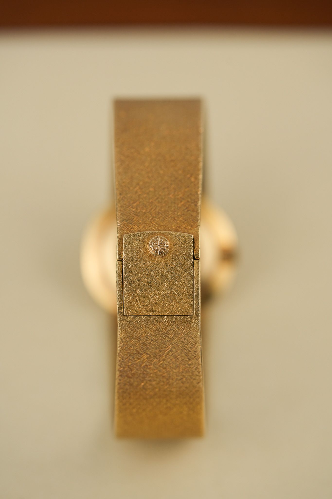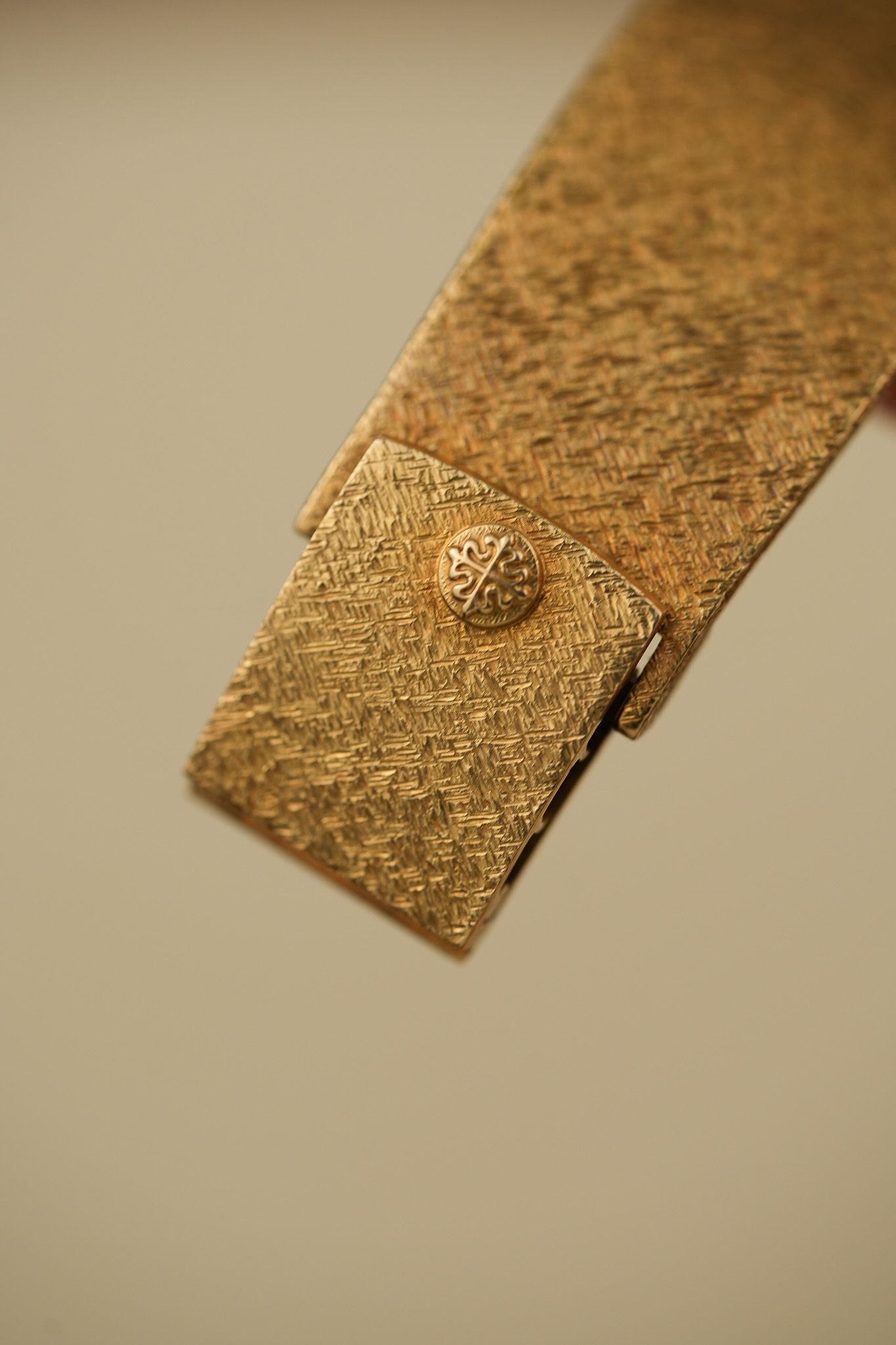 Made in the 1970s, this reference features a 32 x 27mm 18K yellow gold case with a champagne dial that’s not just “gold”—it’s textured with a linen finish that continues seamlessly onto the integrated bracelet. And not just any bracelet. This one was crafted by Jean-Pierre Ecoffey (JPE), a name well-known to serious collectors. Ecoffey made bracelets for Patek Philippe, Audemars Piguet, and others during the era when brands weren’t shy about outsourcing to the best in the game. His bracelets are beautifully executed, complex in texture, and surprisingly wearable—more like gold fabric than metal links.