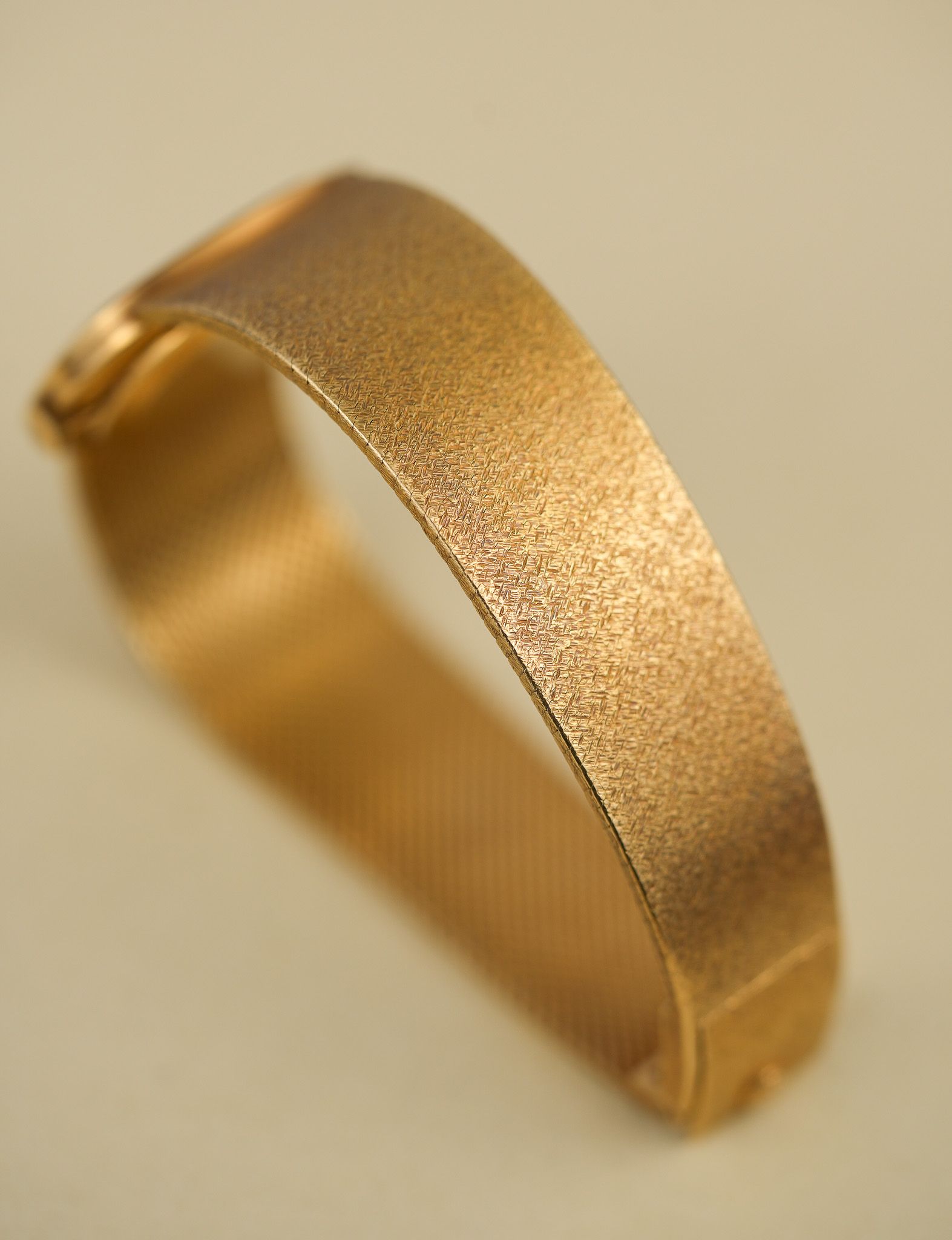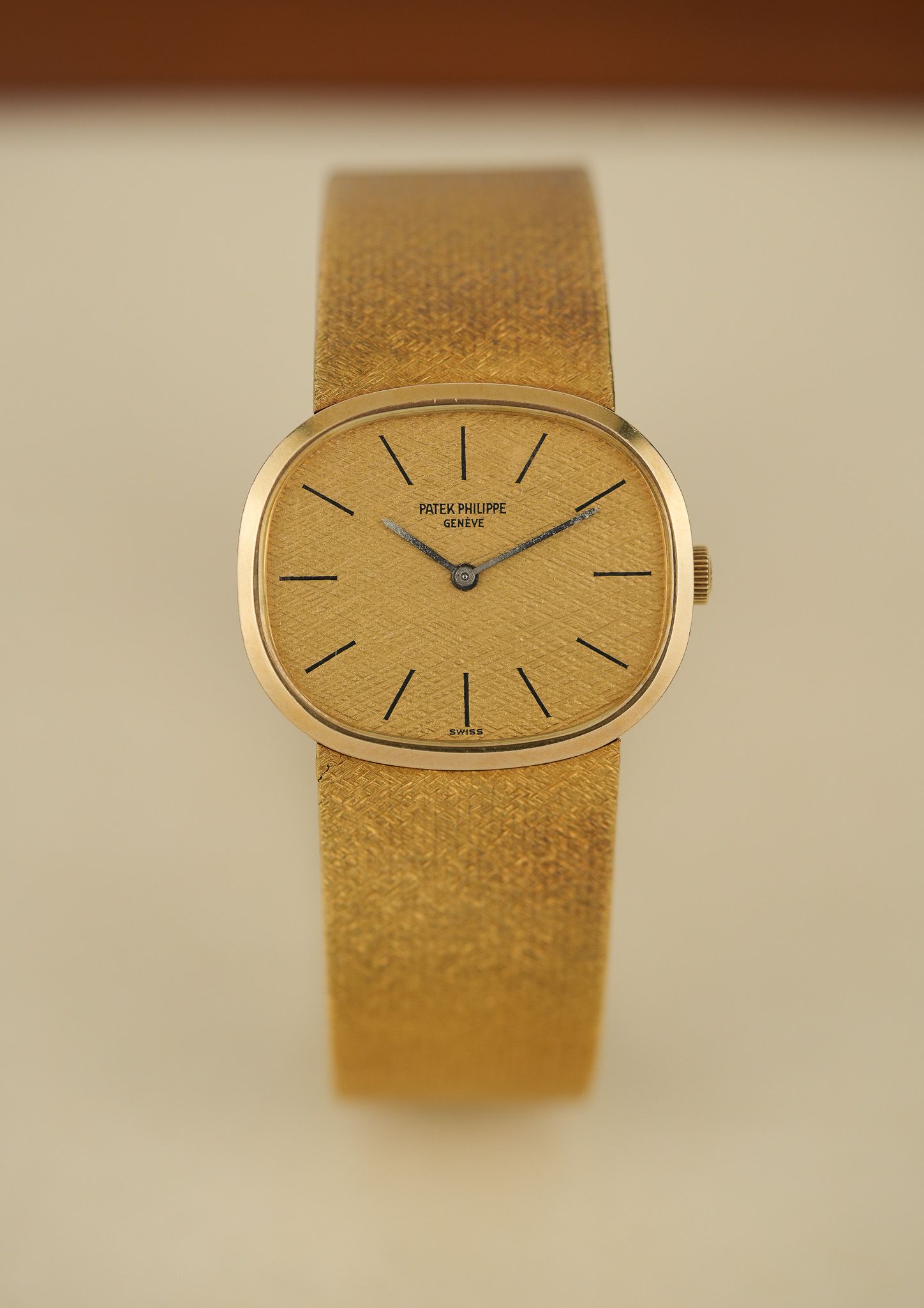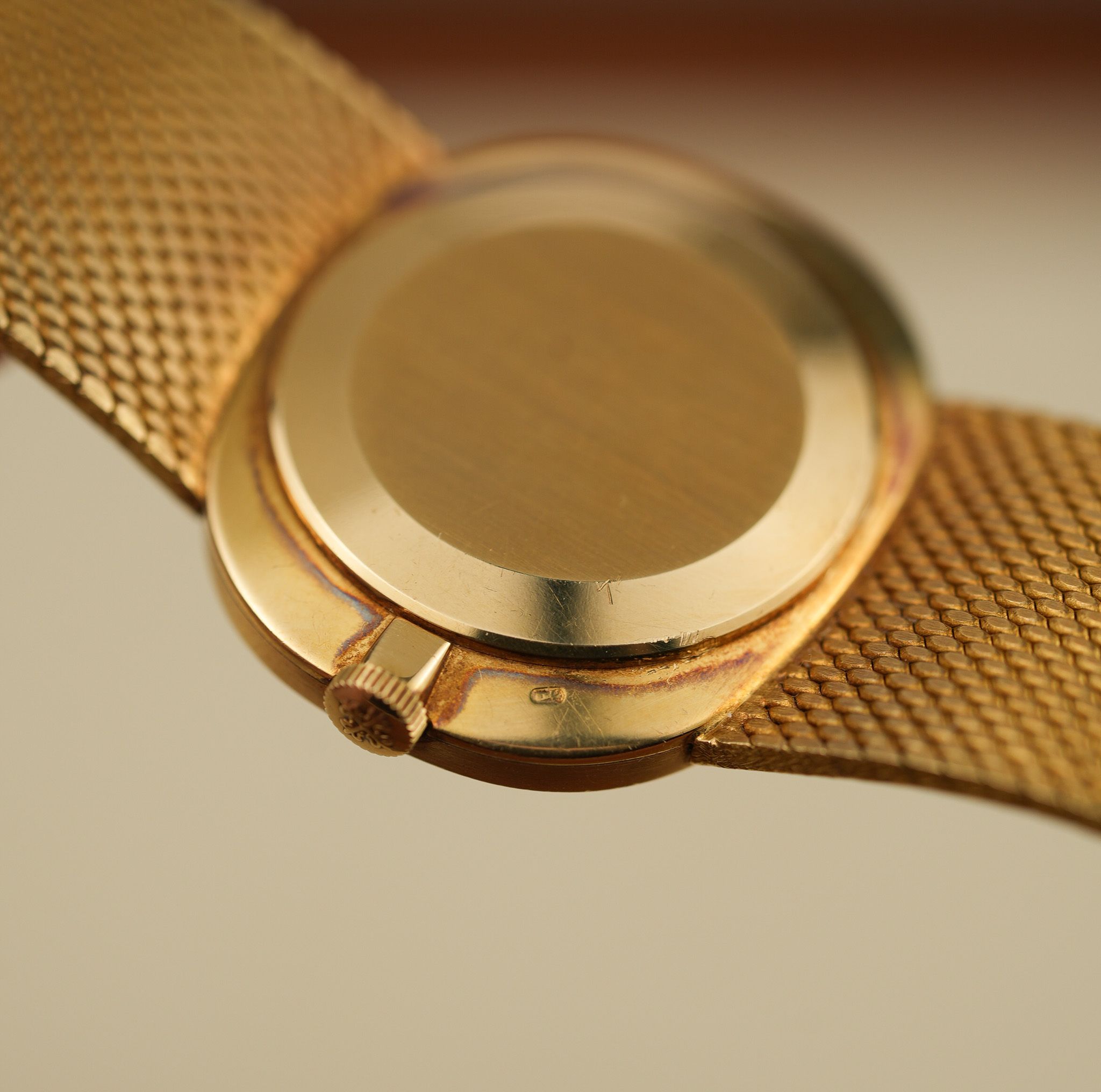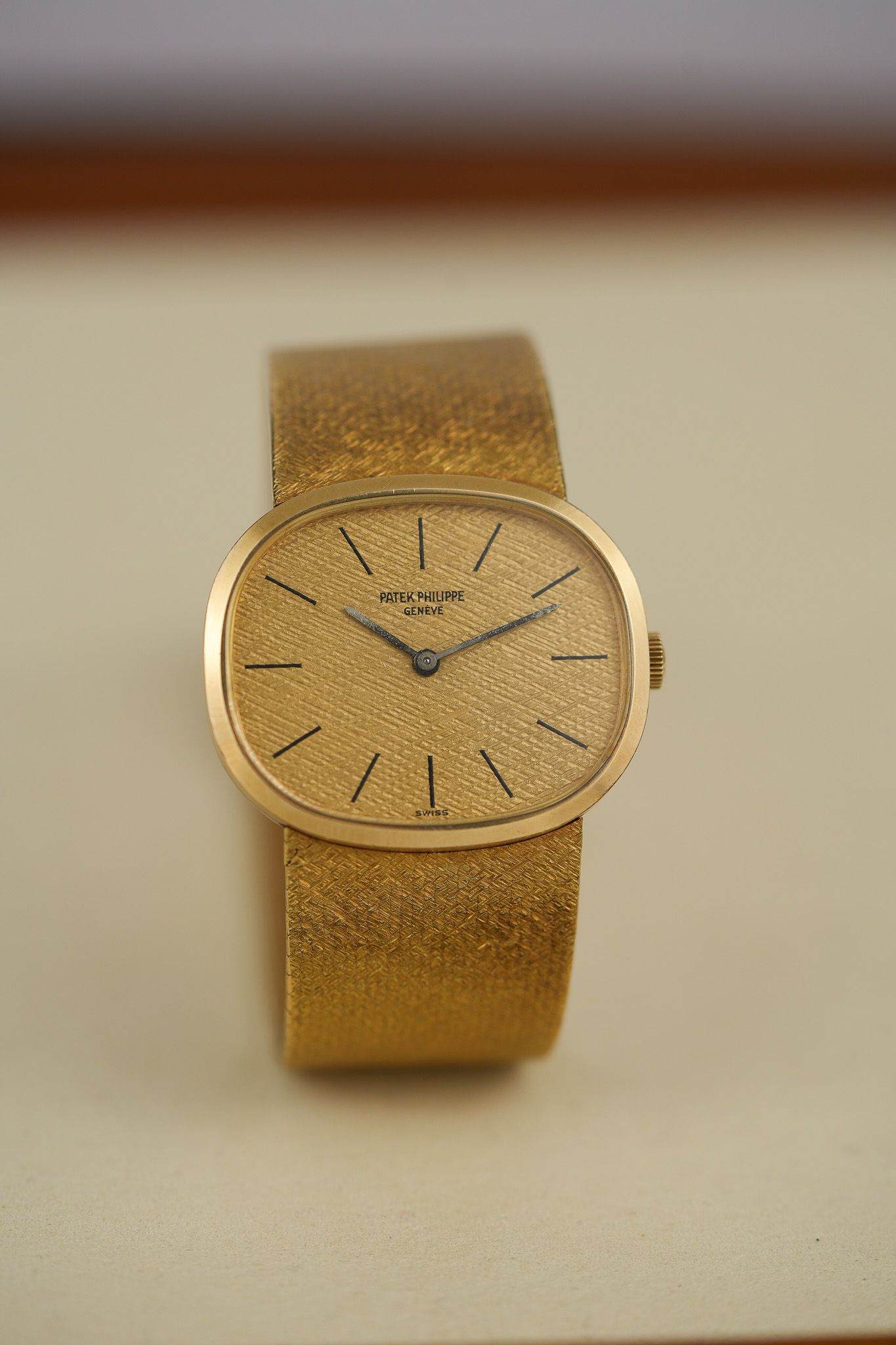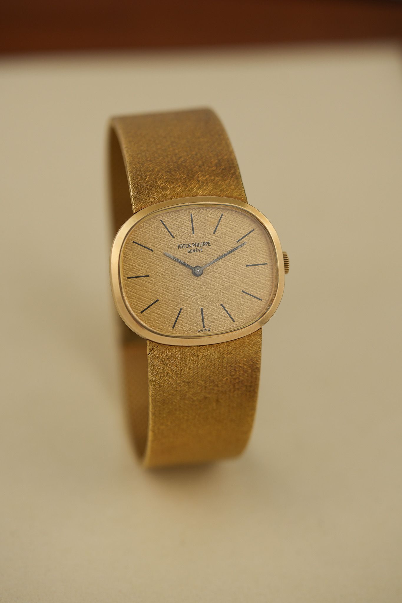 Made in the 1970s, this reference features a 32 x 27mm 18K yellow gold case with a champagne dial that’s not just “gold”—it’s textured with a linen finish that continues seamlessly onto the integrated bracelet. And not just any bracelet. This one was crafted by Jean-Pierre Ecoffey (JPE), a name well-known to serious collectors. Ecoffey made bracelets for Patek Philippe, Audemars Piguet, and others during the era when brands weren’t shy about outsourcing to the best in the game. His bracelets are beautifully executed, complex in texture, and surprisingly wearable—more like gold fabric than metal links.