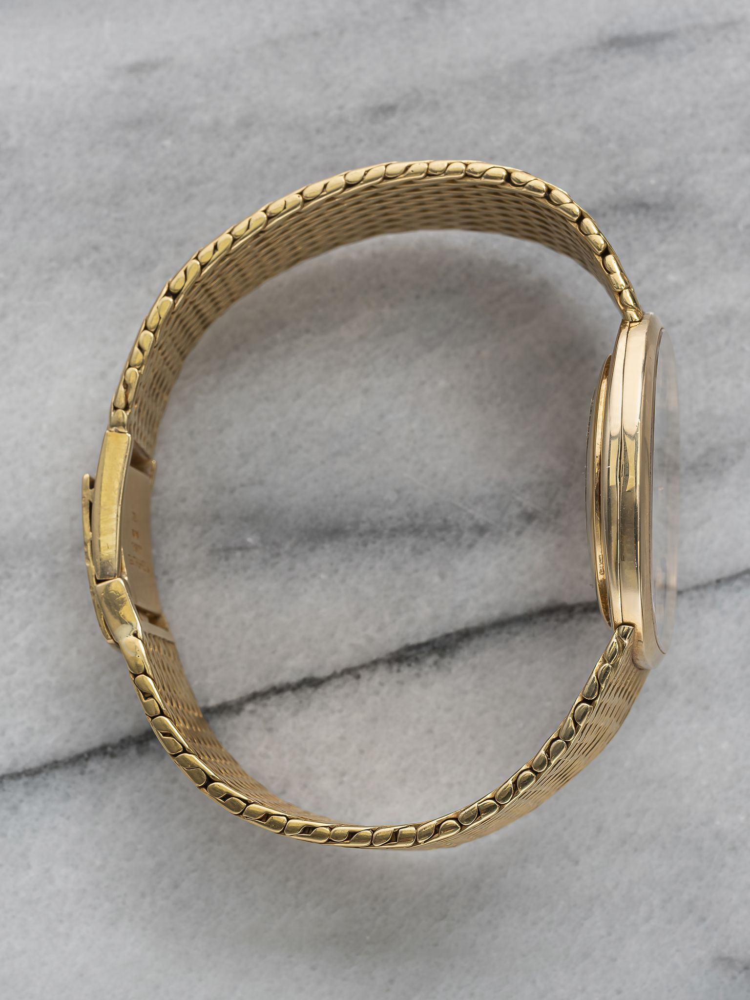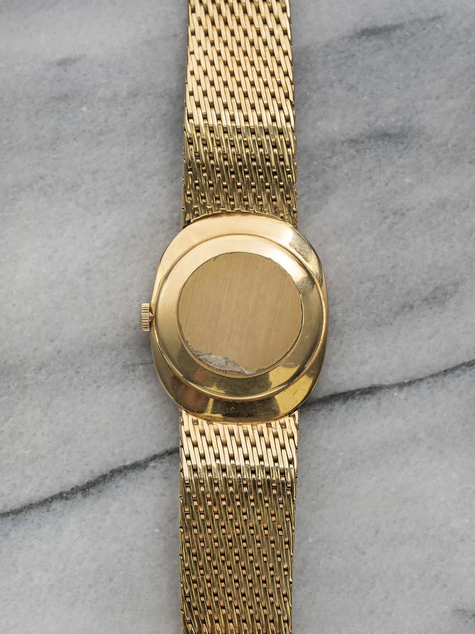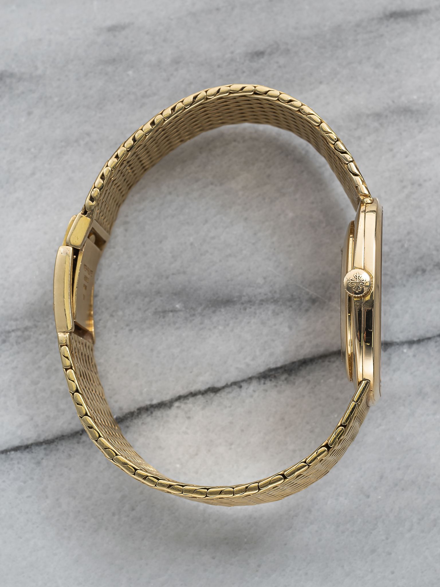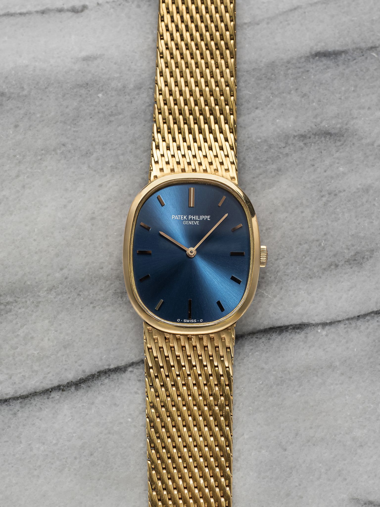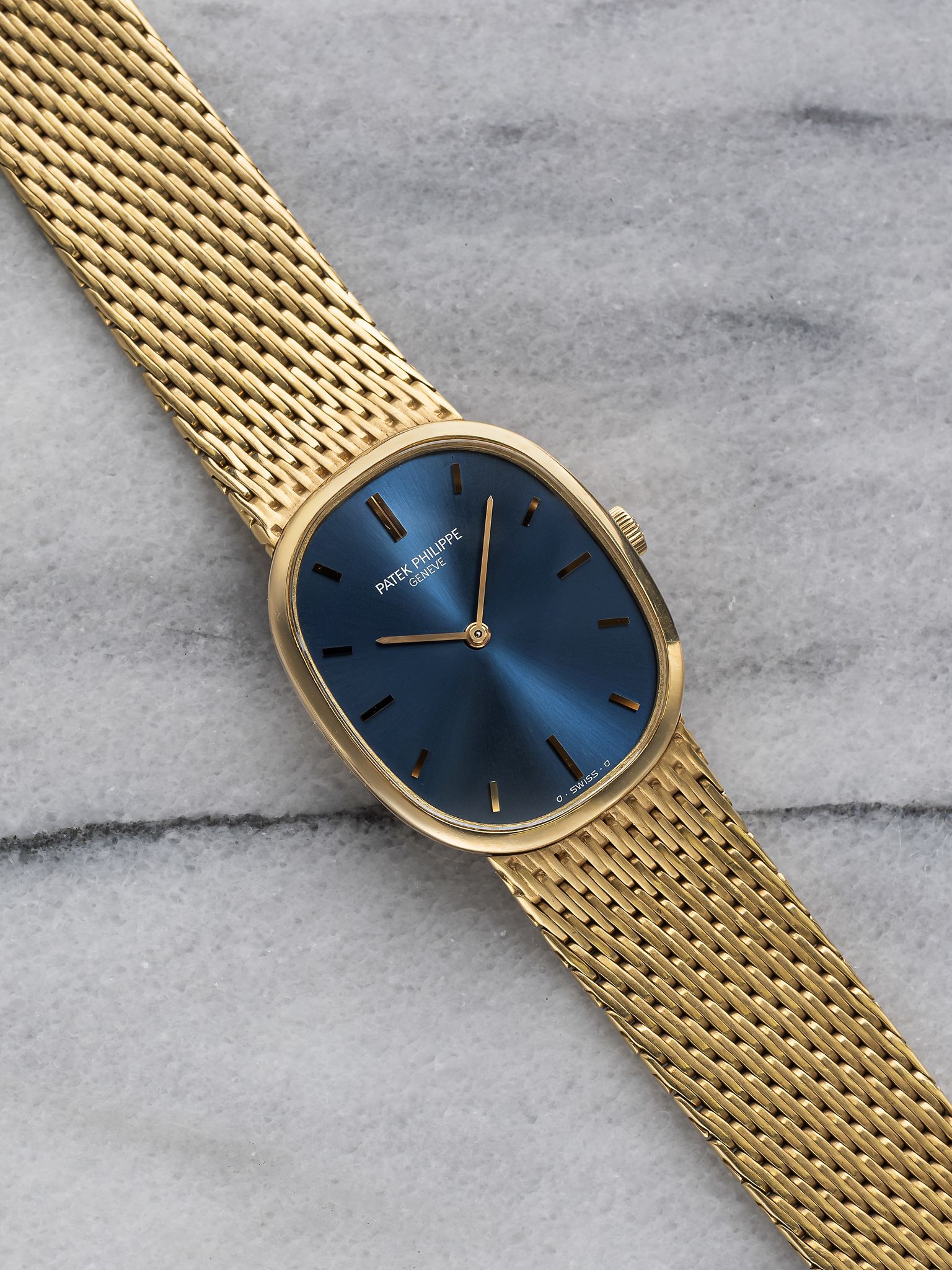 Here's a vintage Patek Philippe Ellipse reference 3548 manual wind with a blue sunburst dial manual wind 18K yellow gold case from the 1980s. Measurements include a 28mm case size across and a bracelet fits up to a 7 inch wrist. Sigma markings at 6 o’clock indicate that the hands and hour markers are made of gold. Matching gol stick hands and hour markers. Wears quite contemporary for its age. All parts including the crown, dial, movement, and caseback are original.