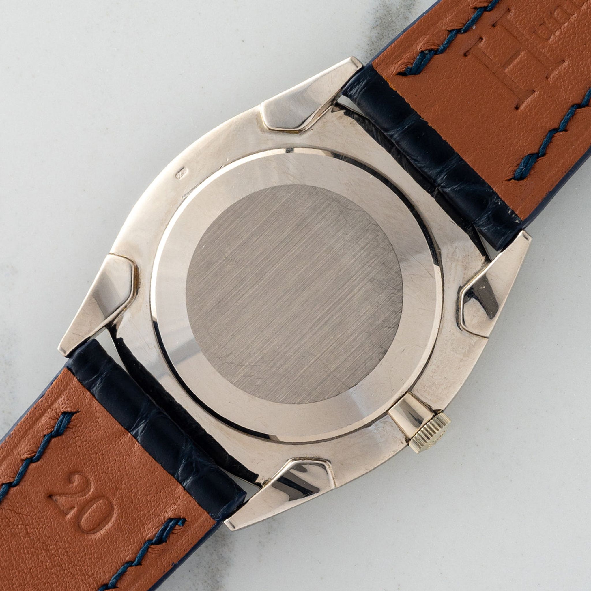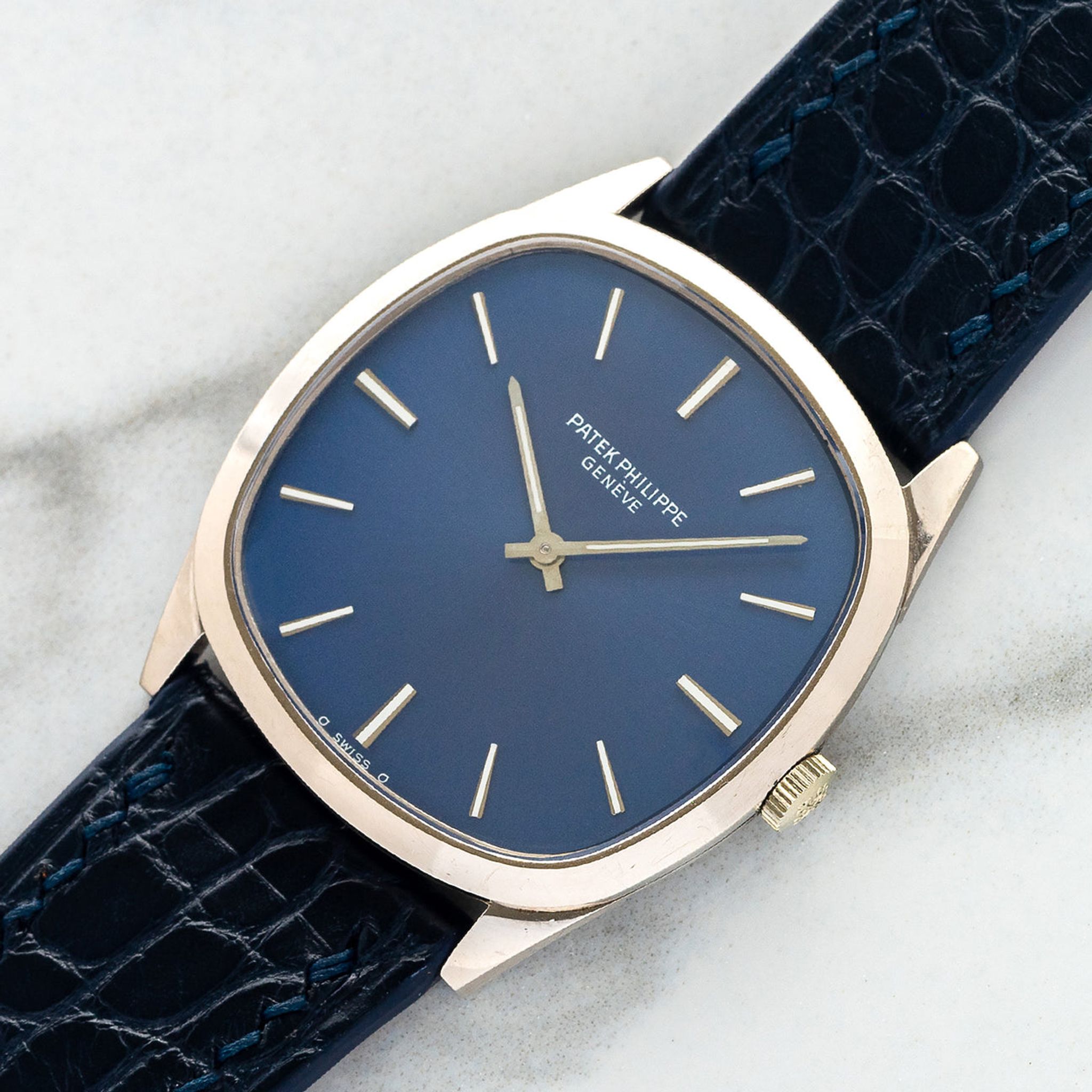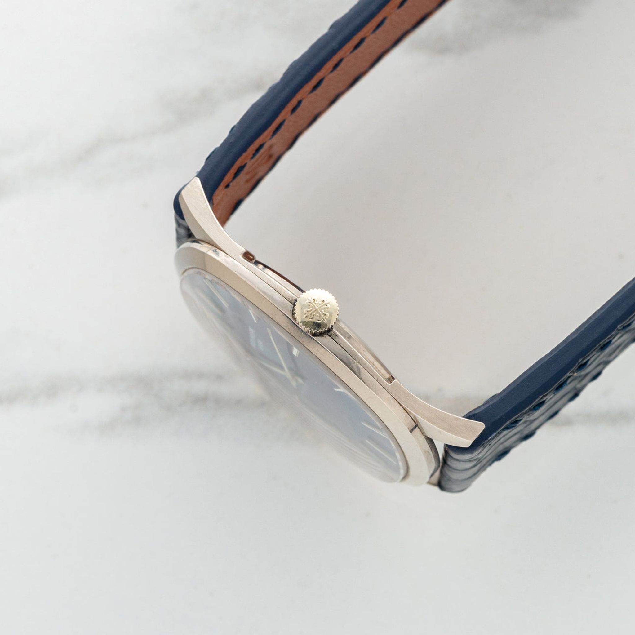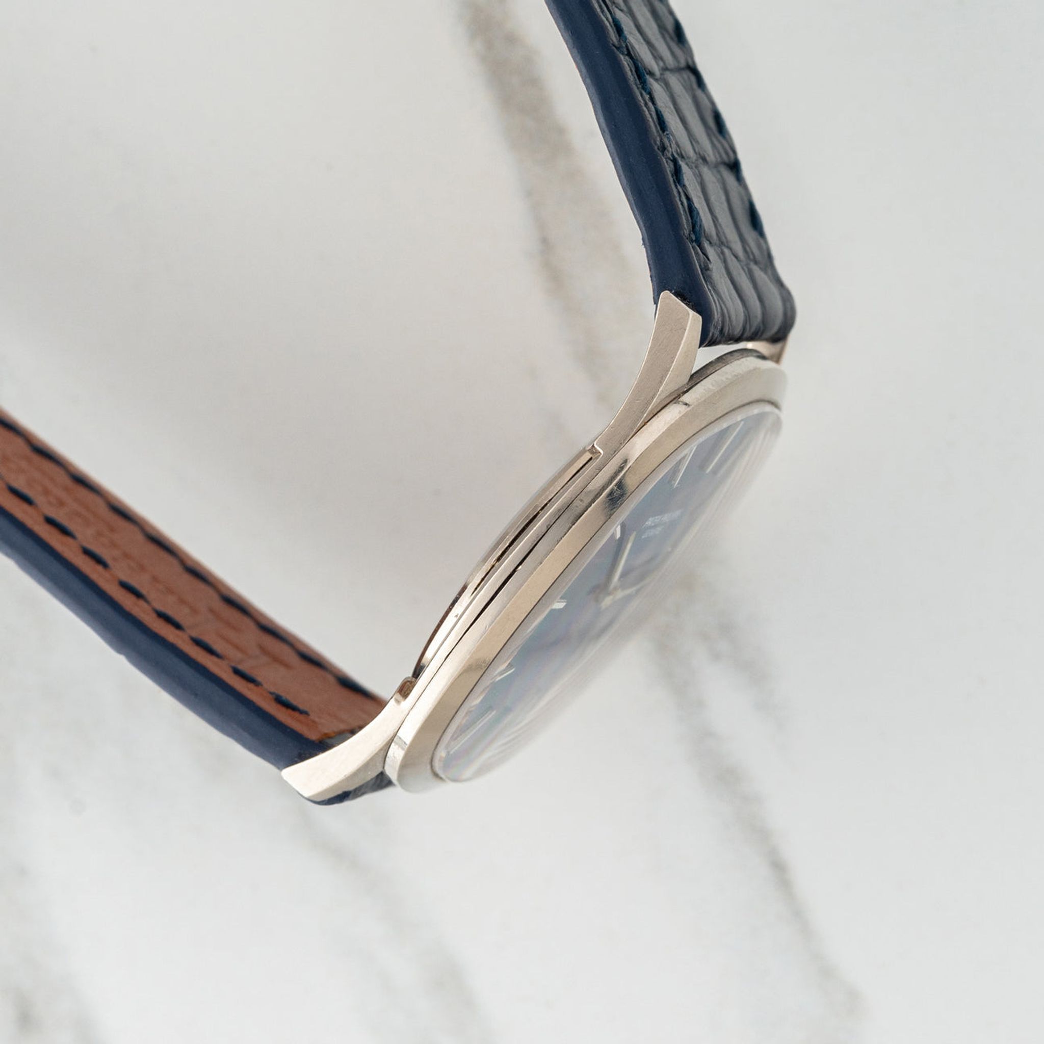 This particular Ellipse, circa 1970s is referred to as the "Golden Circle" by collectors and  one of several variations of the model with manual winding movement. It housed a blue sunburst dial in its white gold case which is slim in proportion at 6mm. The dial remains in excellent vintage condition with no distracting blemishes and the case is very sharp and well-preserved. The combination of blue and white gold is truly one of our all-time favorite looks and we believe this dress watch is perfect for anyone looking for a high-grade dress watch that's a little off the beaten path.