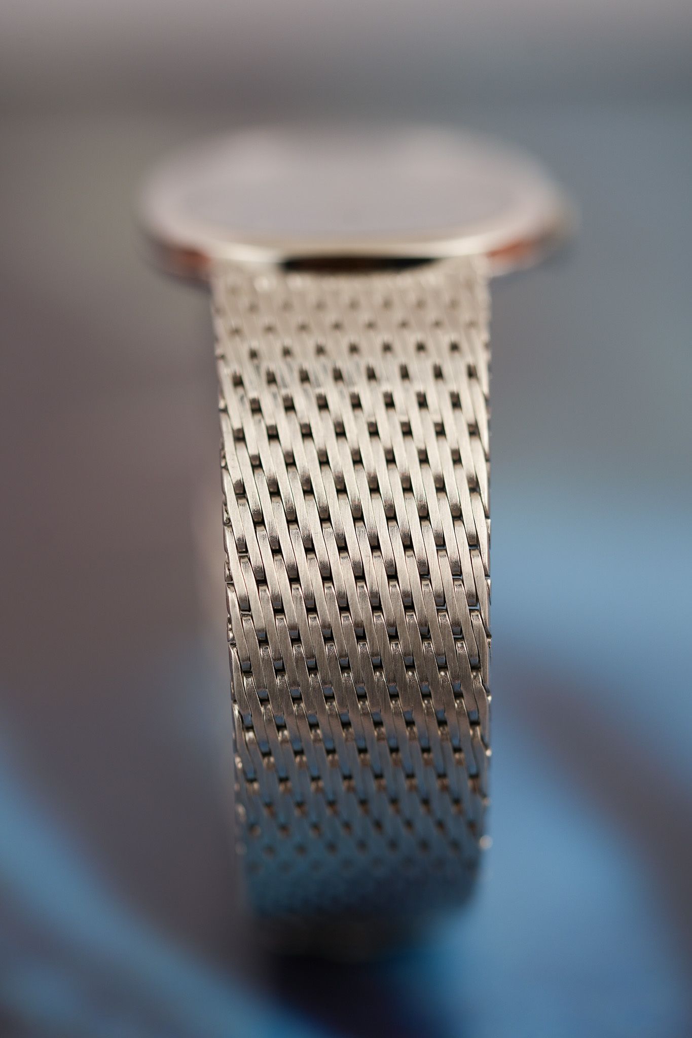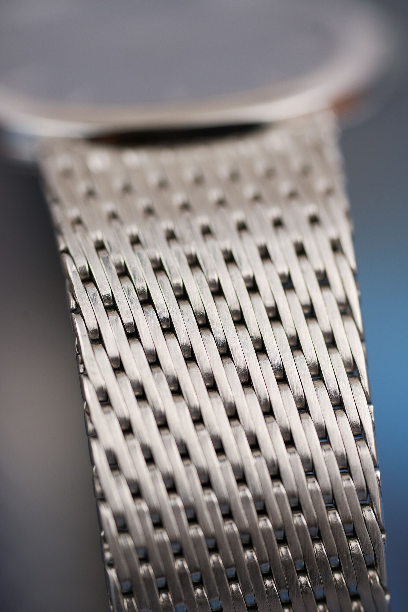 Integrated white gold bracelet by Jean-Pierre Ecoffey is tight, with no stretch, warping or kings. There is strong definition in the angled link pattern.