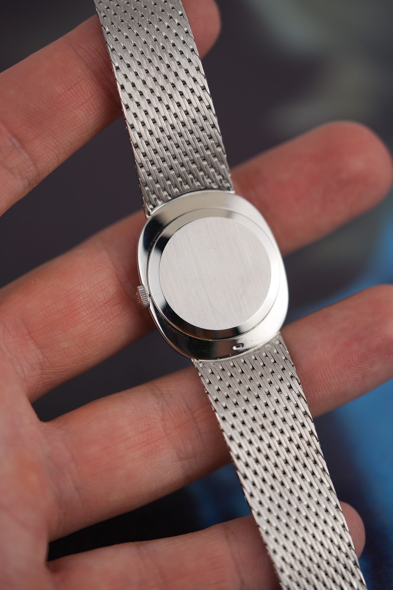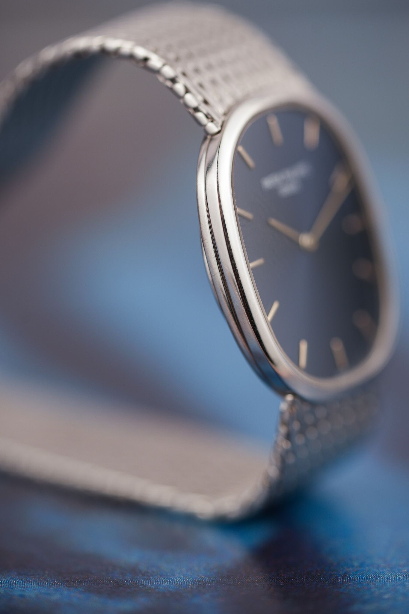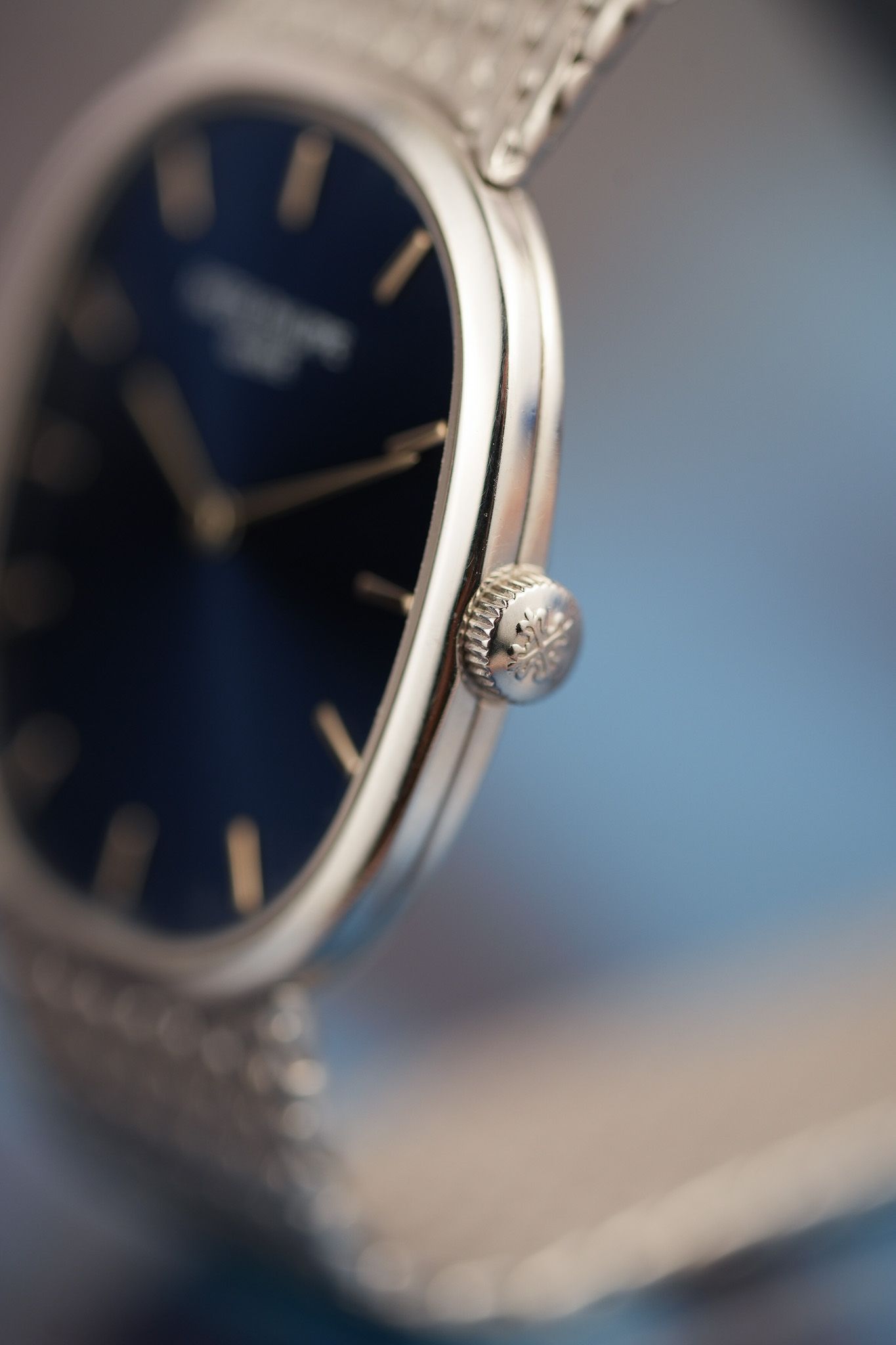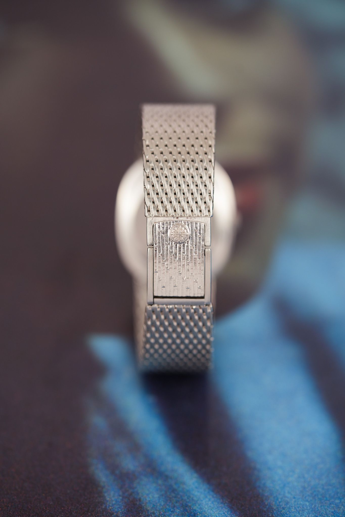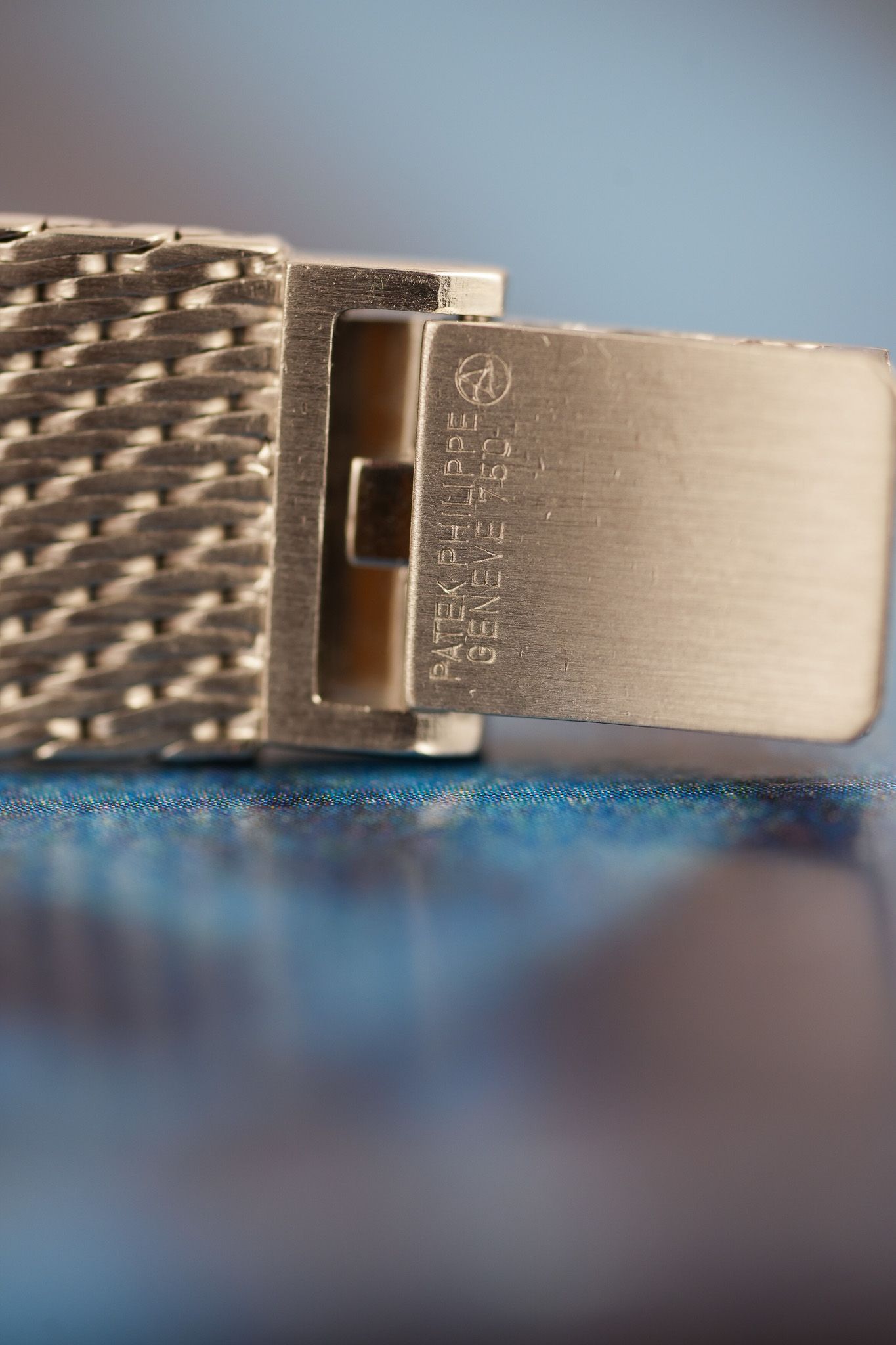 Then there’s the bracelet — an integrated white gold creation by the brand. The work here uses angled, interlocking links that catch the light differently with every movement. It’s a complexity that contrasts beautifully with the minimalism of the dial. The gold purity hallmark hides beneath the clasp, along with Patek’s own signature. At 18cm in length, it will fit wrists up to 6.8 inches.