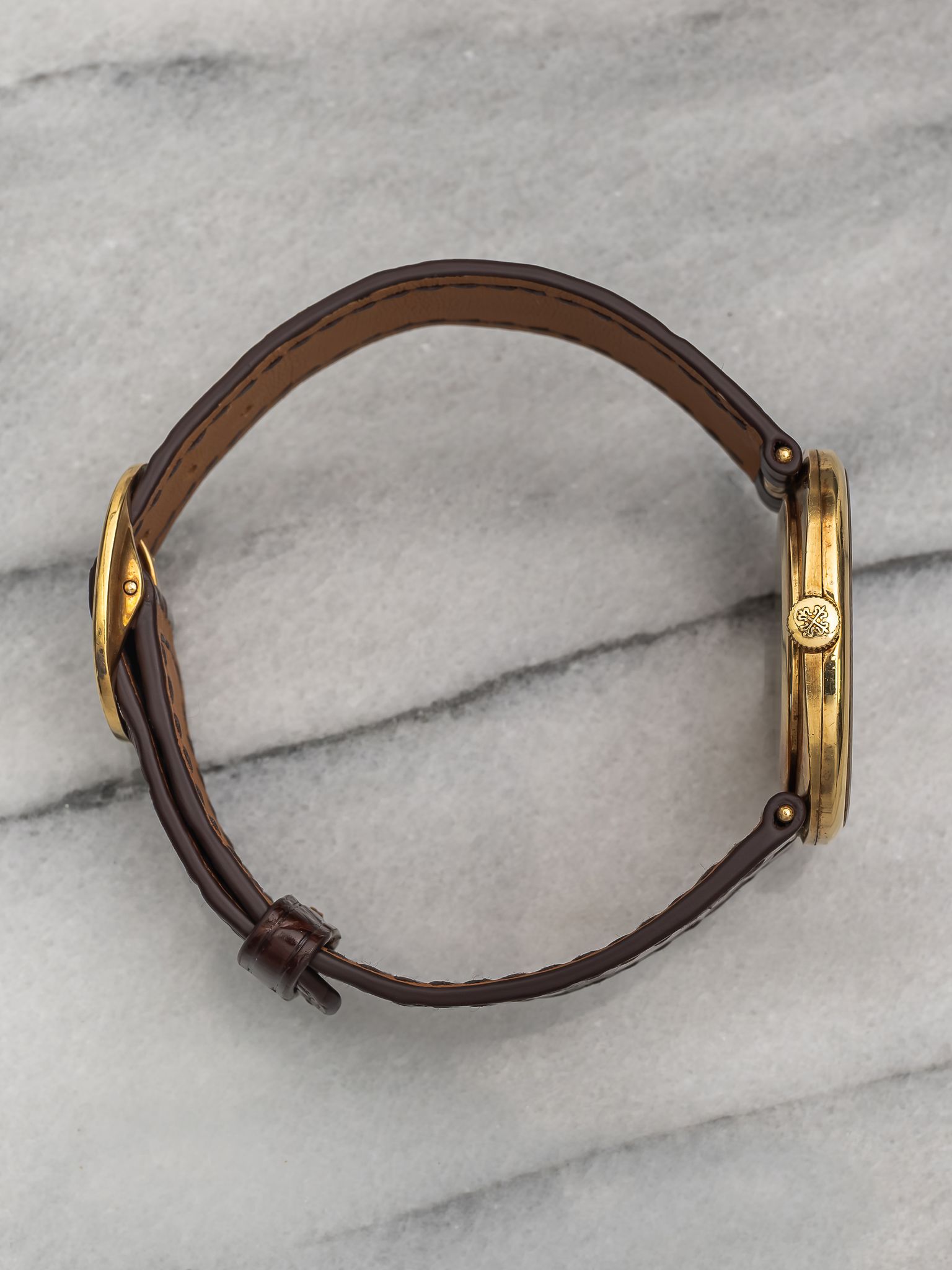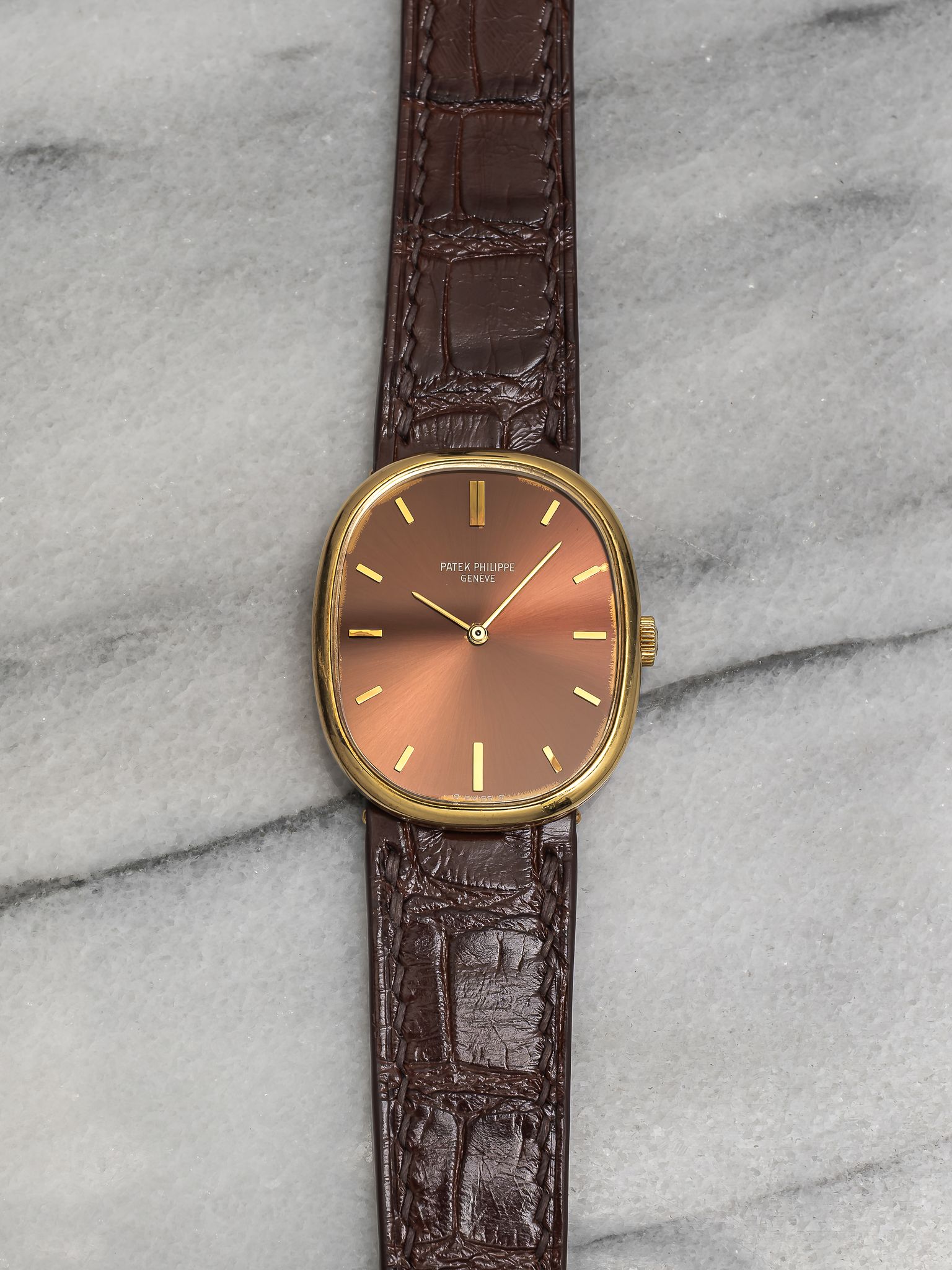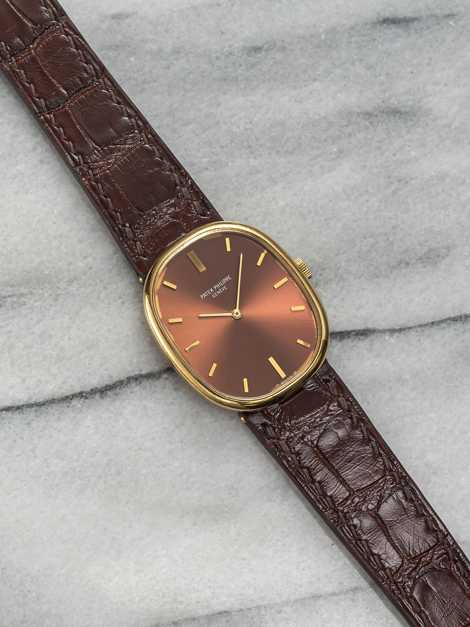 Here's a vintage Patek Philippe Ellipse reference 3848 manual wind from the 1980s with a brown sunburst dial in 18K yellow gold. Measurements include a 27x32mm case. On a custom brown glossy alligator leather strap. Sigma markings at 6 a clock indicating that the hands and hour markers are made of gold. There is some dial degredation around the minute track as seen in photos Matching gold stick hands and hour markers. Quite difficult to find brown dials in ellipse. All parts including the crown, dial, movement, and caseback are original.