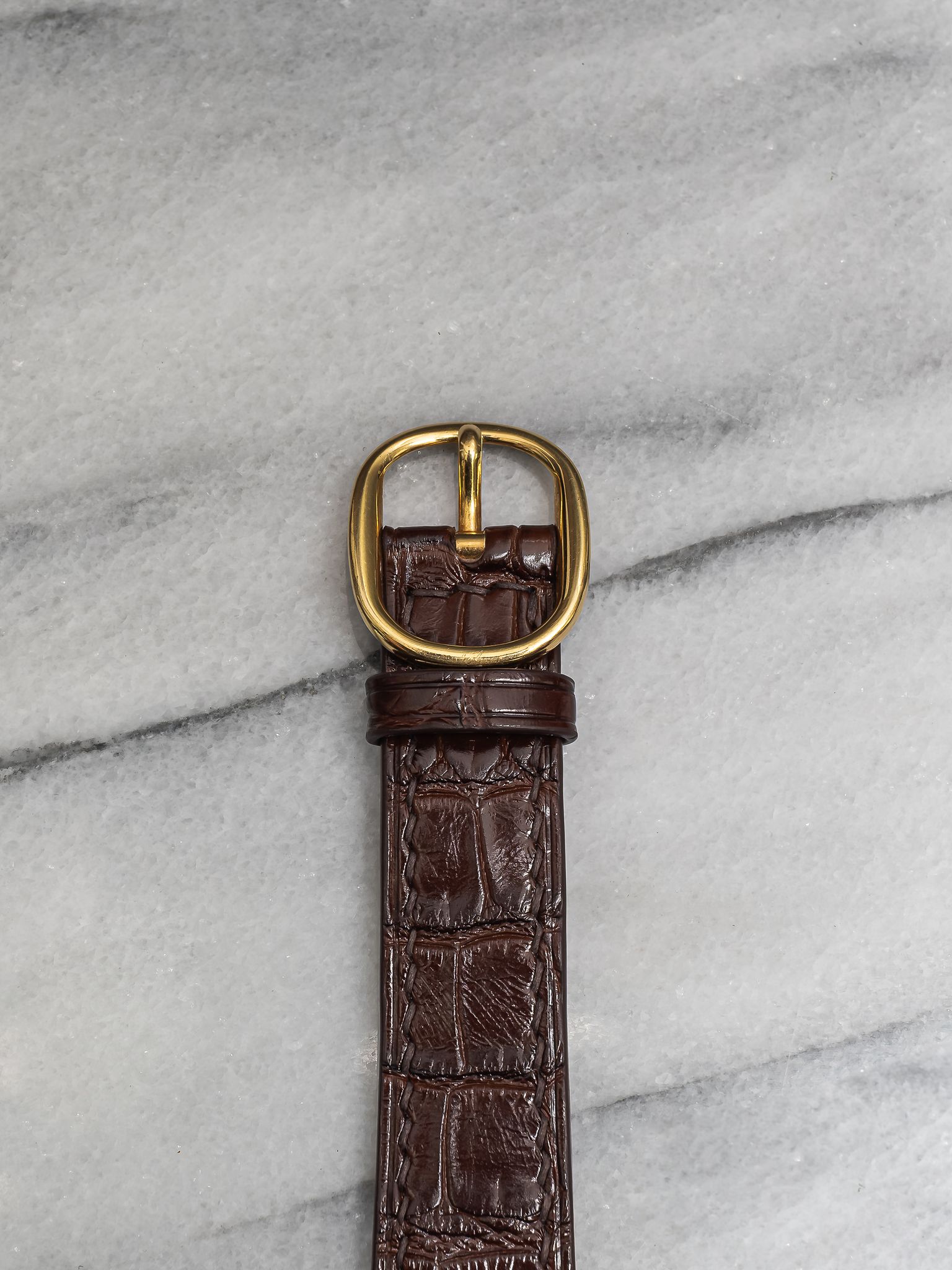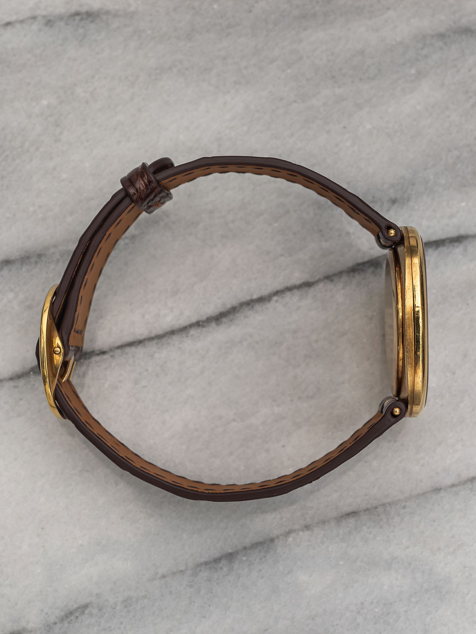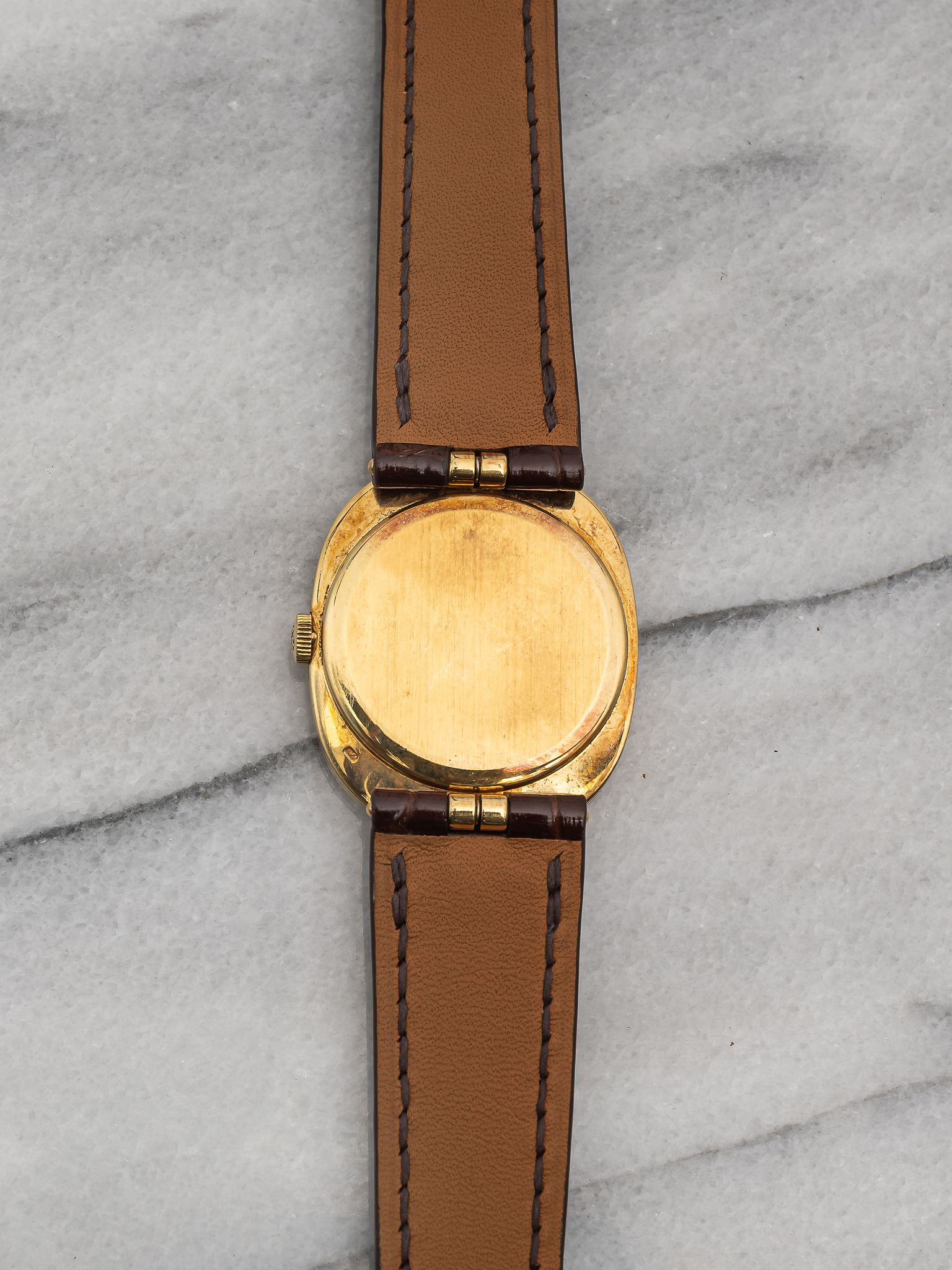 Here's a vintage Patek Philippe Ellipse reference 3848 manual wind from the 1980s with a brown sunburst dial in 18K yellow gold. Measurements include a 27x32mm case. On a custom brown glossy alligator leather strap. Sigma markings at 6 a clock indicating that the hands and hour markers are made of gold. There is some dial degredation around the minute track as seen in photos Matching gold stick hands and hour markers. Quite difficult to find brown dials in ellipse. All parts including the crown, dial, movement, and caseback are original.