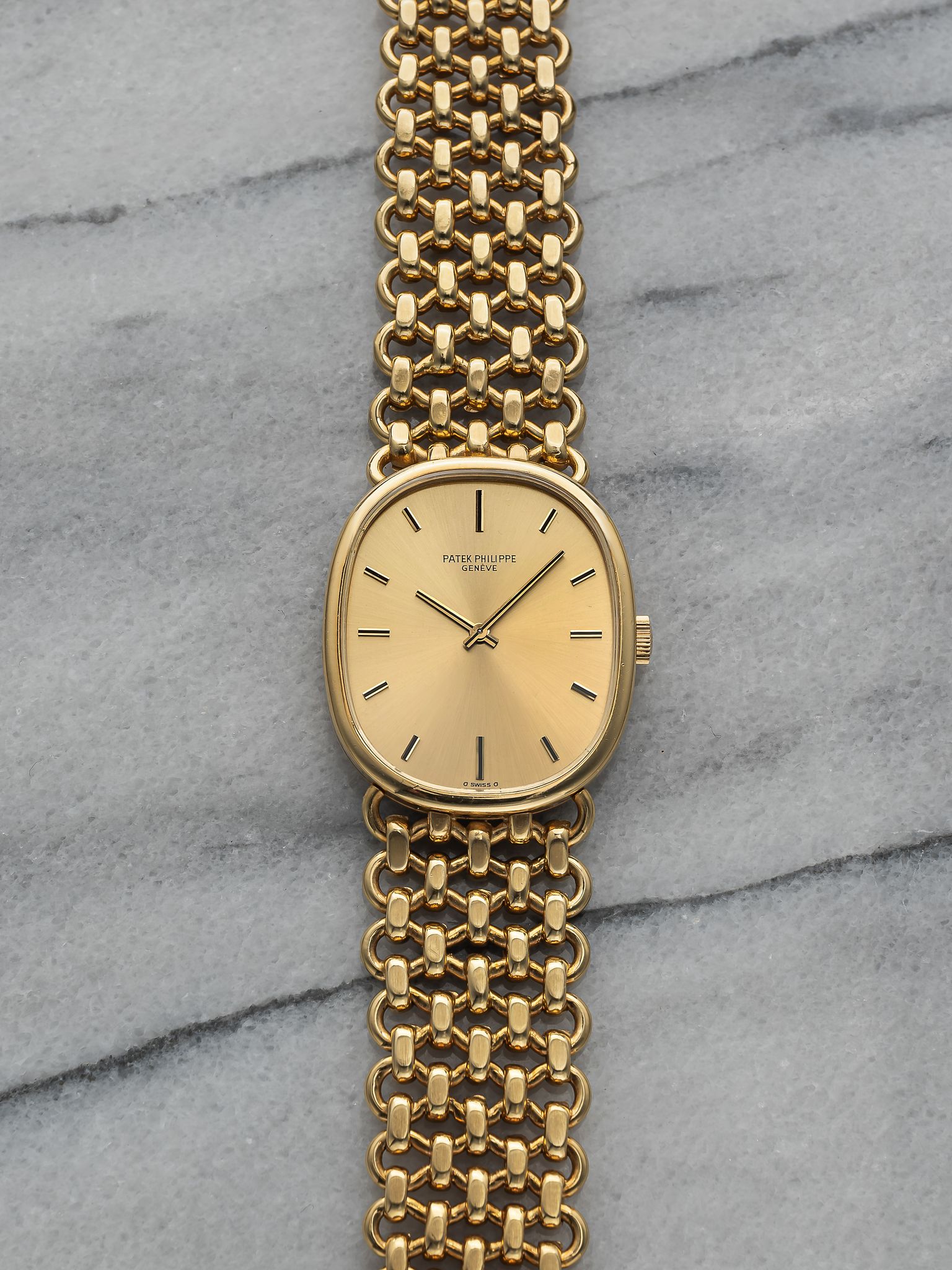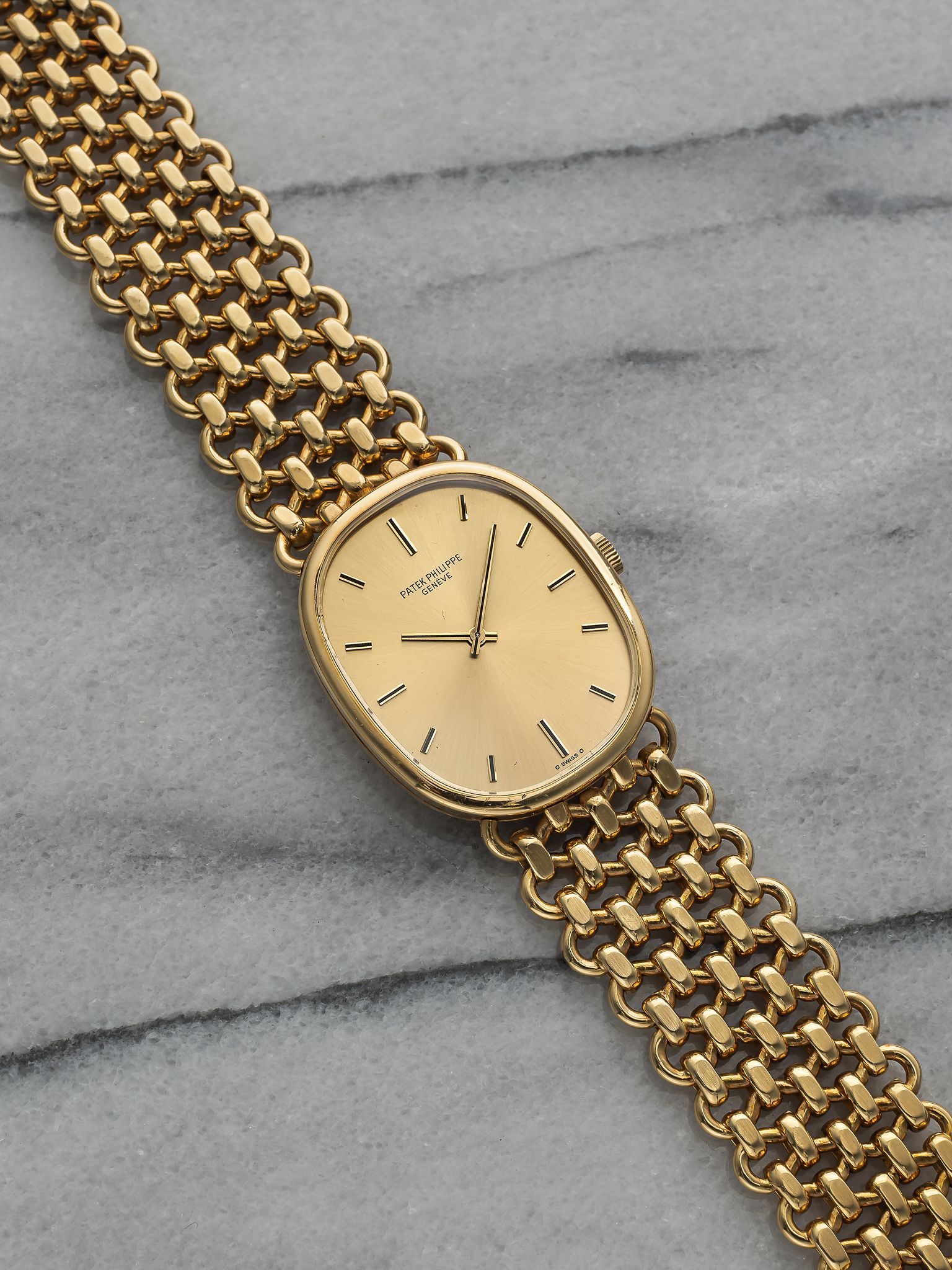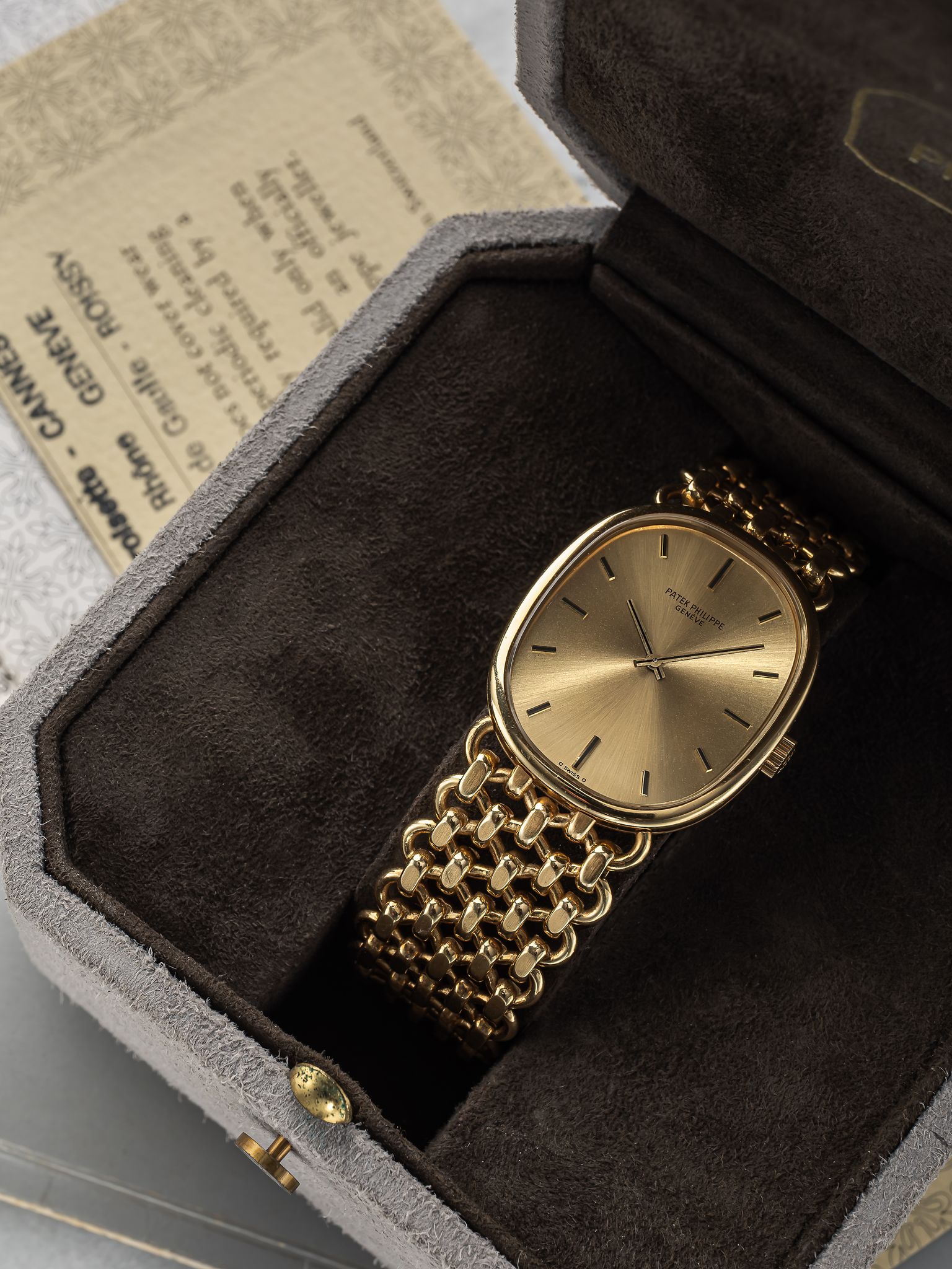 Here’s a Patek Philippe Ellipse reference 3848 in 18K yellow gold manual wind with a sunburst champagne sigma dial from the 1980s. Comes with its original box and papers. Measurements include a 28mm case and a bracelet that fits up to a 7 inch wrist. A unique chain bracelet. Fitted on its original matching chain-link bracelet for a seamless and refined look. Slim, minimalist design with applied gold indices, Matching black stick hands and hour markers (roman numerals). Sigma markings at 6 o’clock indicate that the hands and hour markers are made of gold. Original case, dial, bracelet, and movement. Fully functional and keeping time.