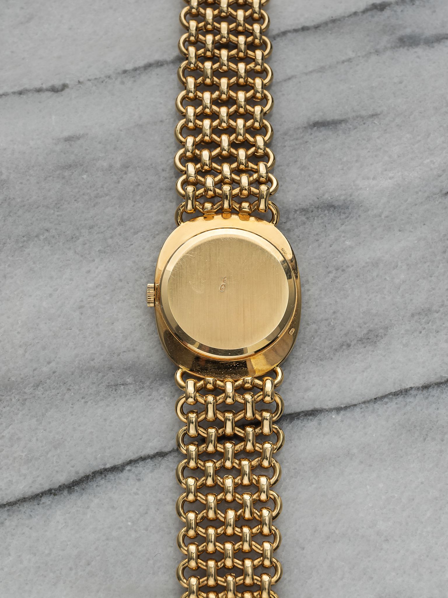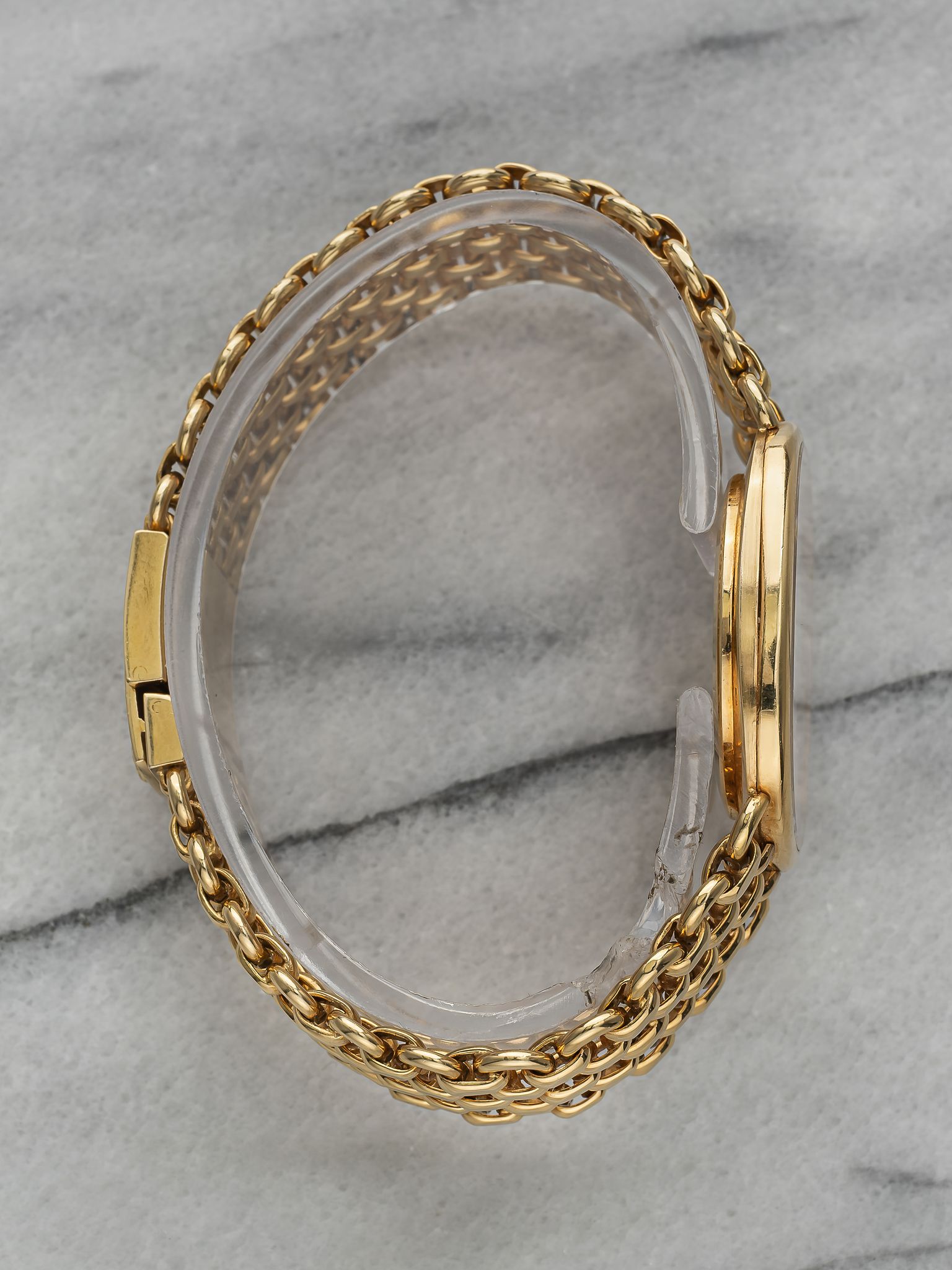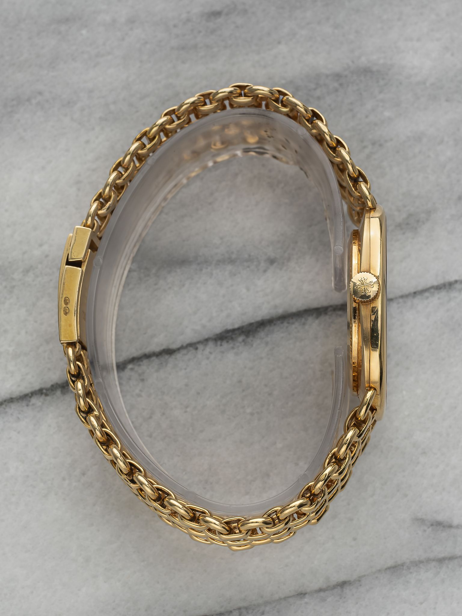 Here’s a Patek Philippe Ellipse reference 3848 in 18K yellow gold manual wind with a sunburst champagne sigma dial from the 1980s. Comes with its original box and papers. Measurements include a 28mm case and a bracelet that fits up to a 7 inch wrist. A unique chain bracelet. Fitted on its original matching chain-link bracelet for a seamless and refined look. Slim, minimalist design with applied gold indices, Matching black stick hands and hour markers (roman numerals). Sigma markings at 6 o’clock indicate that the hands and hour markers are made of gold. Original case, dial, bracelet, and movement. Fully functional and keeping time.
