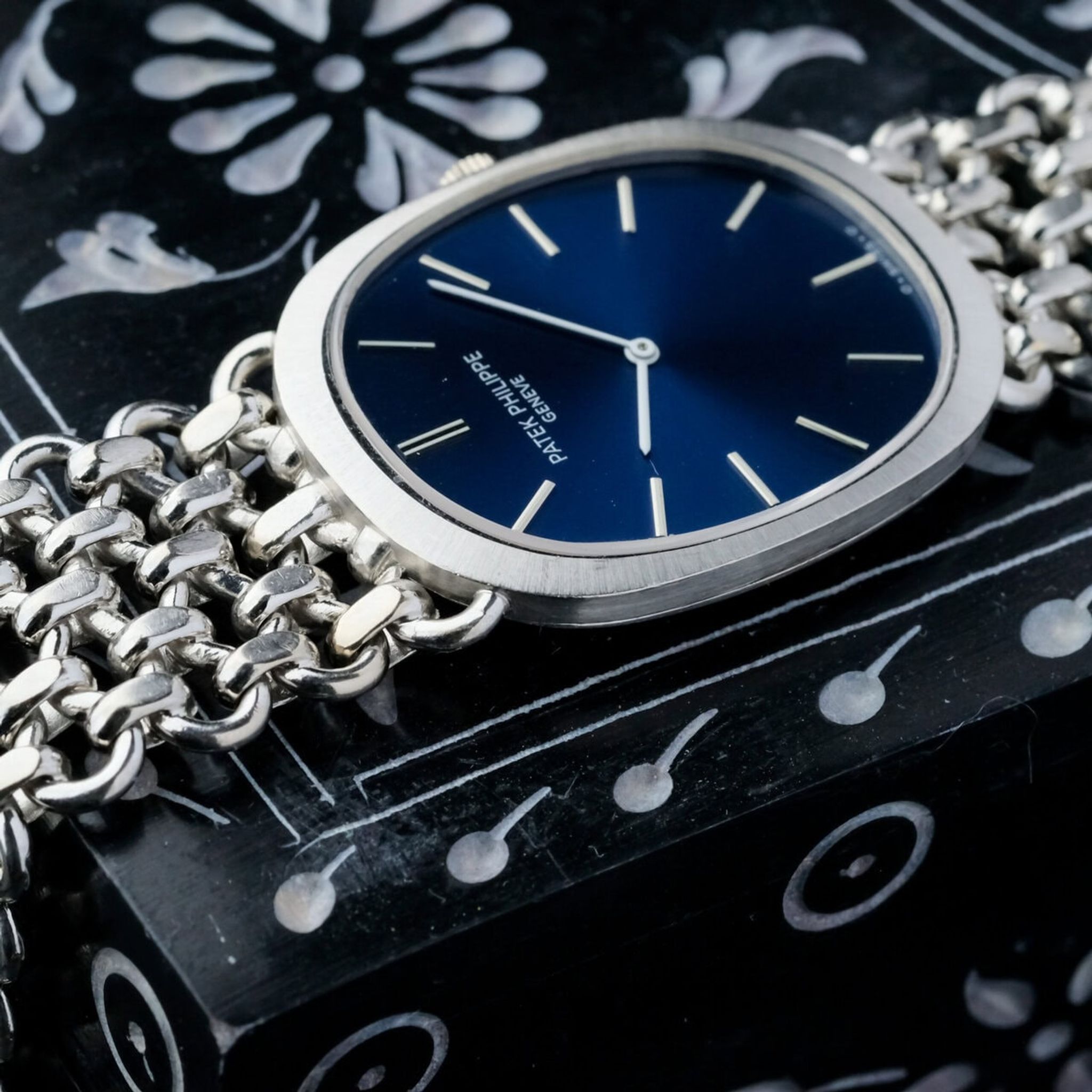 This Patek Philippe Ellipse reference 3577/1 is a rare and elegant example of one of the maison’s most distinctive designs. Crafted in 18k white gold, the case measures 26.5 by 34 millimeters and carries the slim, refined proportions that have made the Ellipse an enduring classic.