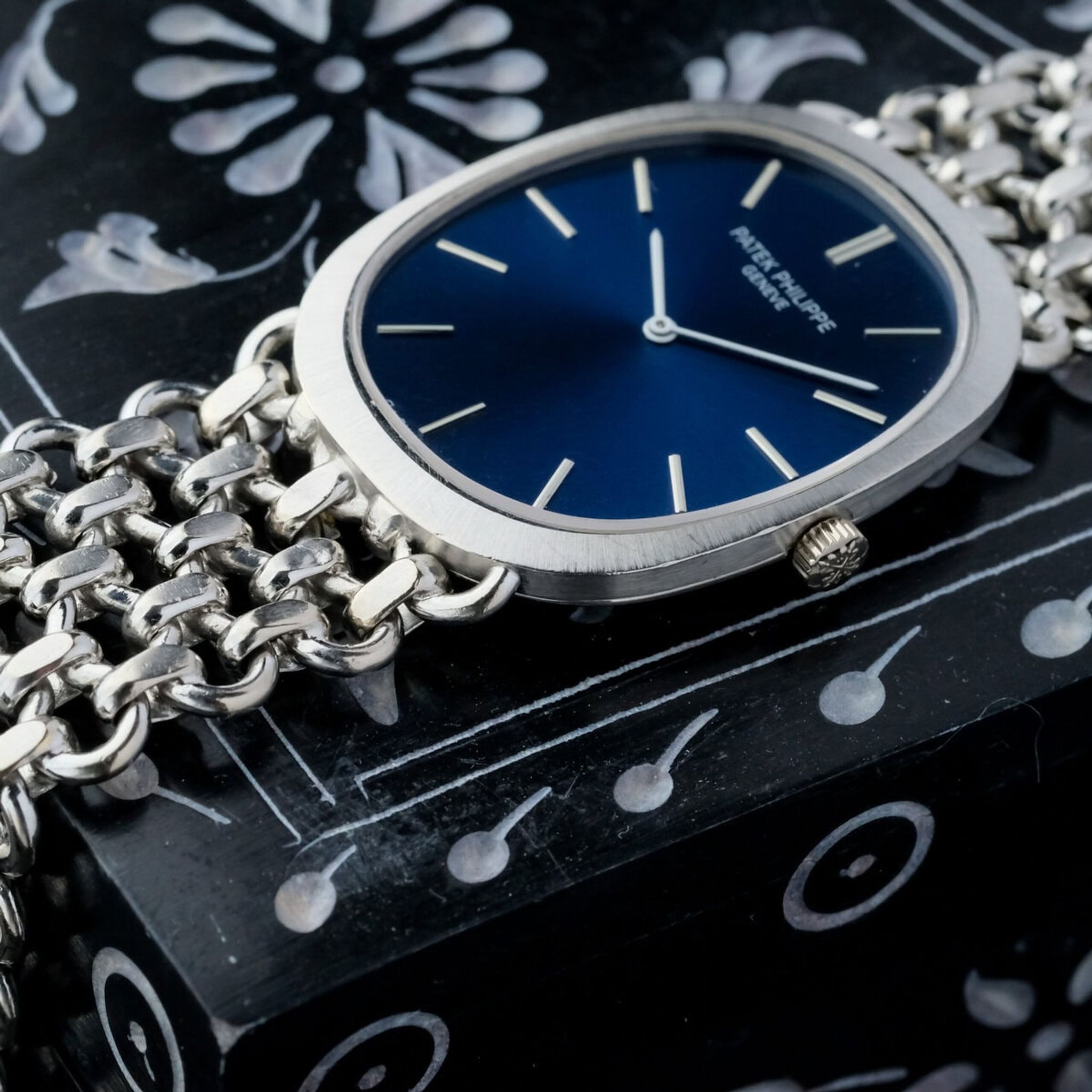 The watch features a striking blue sigma dial in immaculate condition, free of blemishes, with applied white gold indices that highlight the understated luxury of this reference. Its minimalist aesthetic captures the essence of Patek Philippe’s philosophy of timeless elegance.