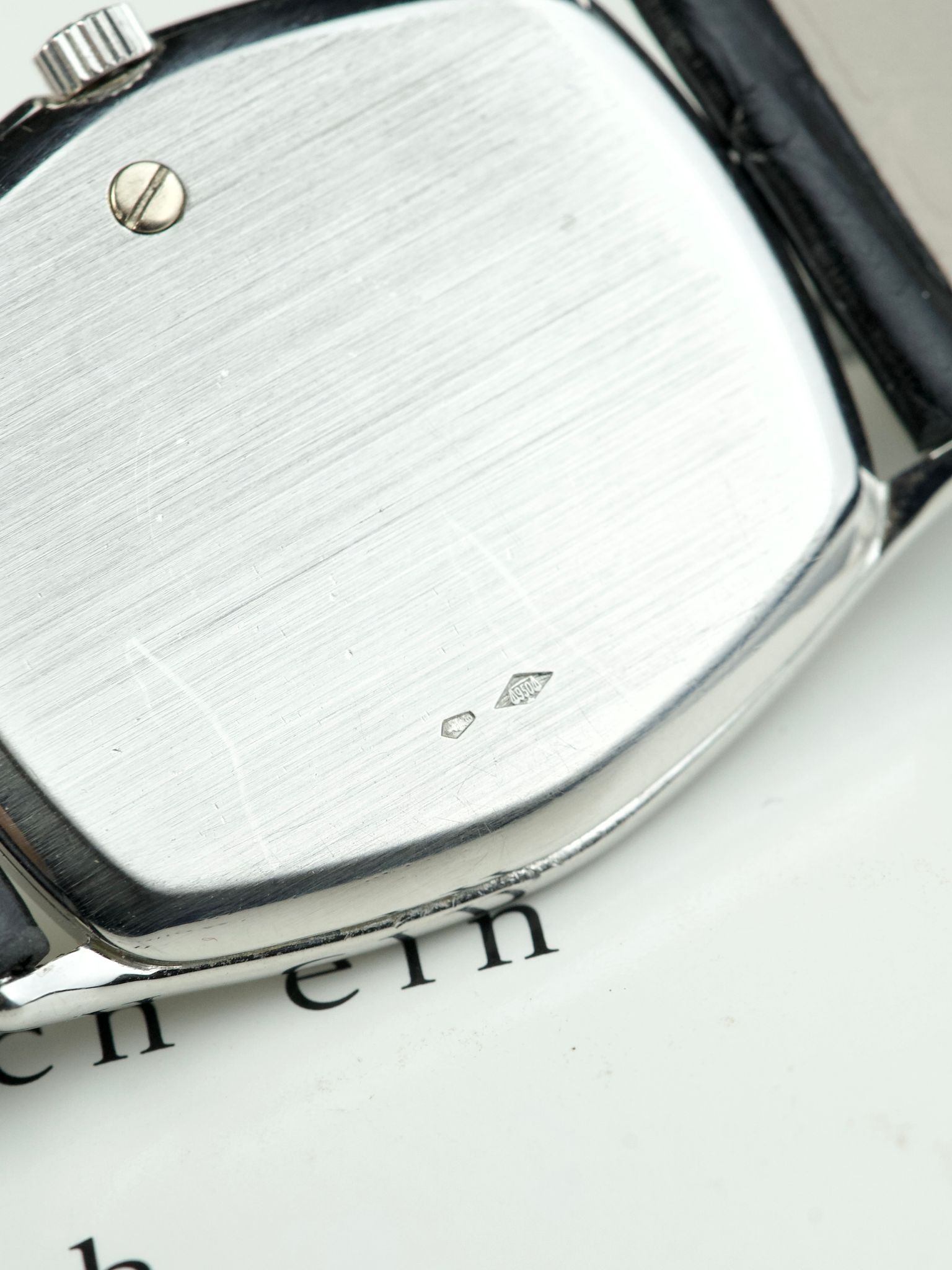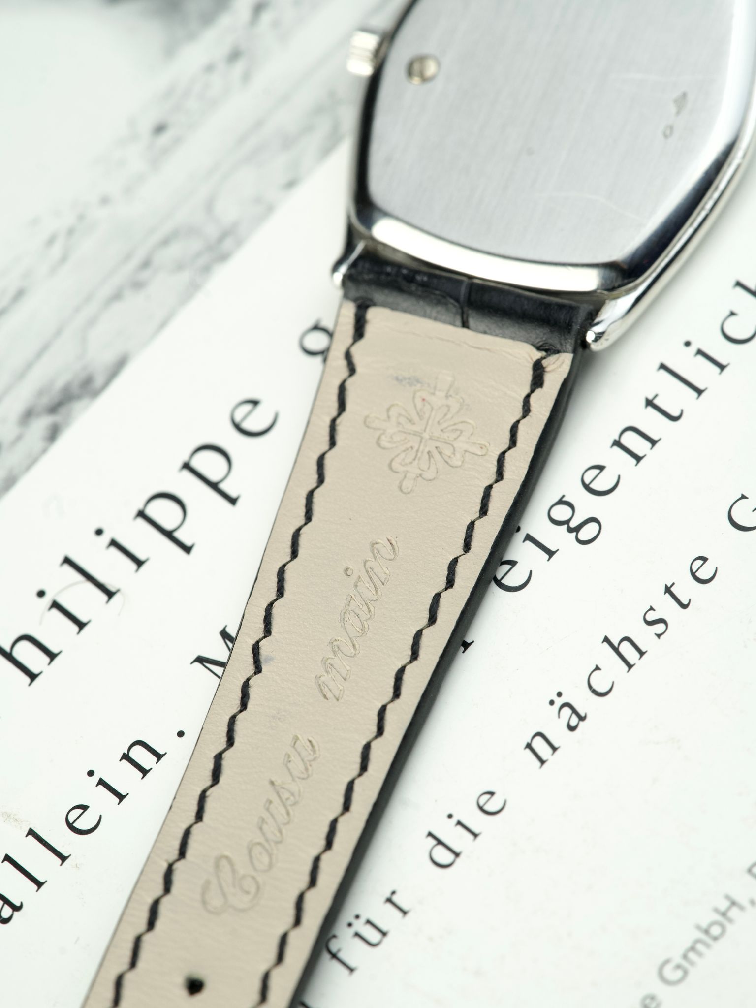 The watch presented here is the Patek Philippe Gondolo 3842p from the 1980s. The vintage watch measures a beautiful 28x37 mm and 4.7 mm flat case in 950 Platinum. A perfect size for every gender! The watch is in unpolished condition.