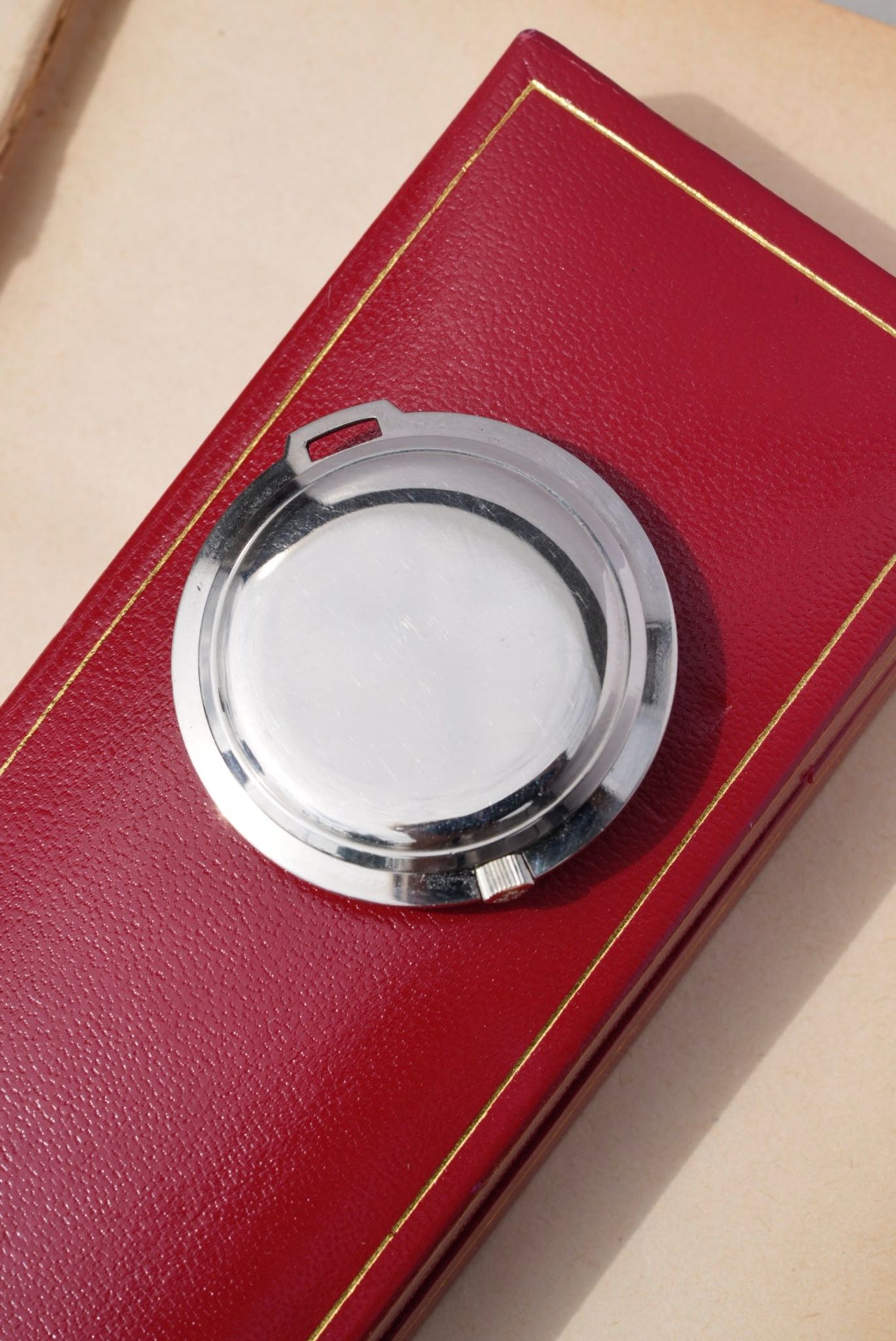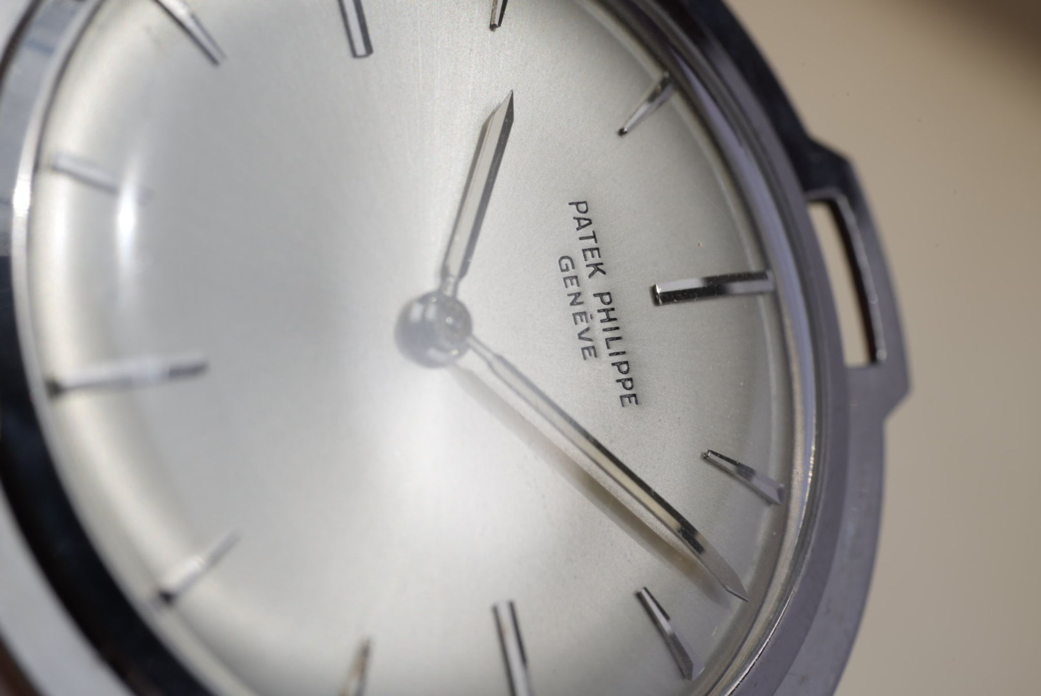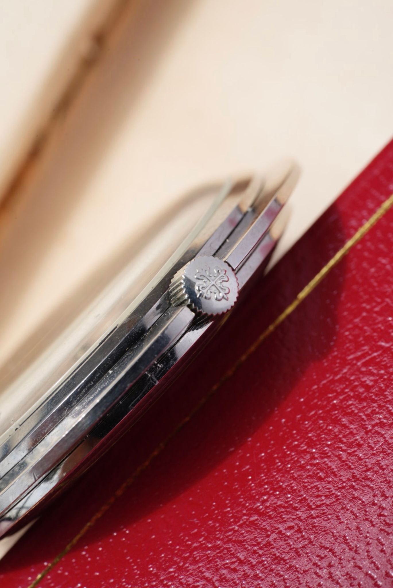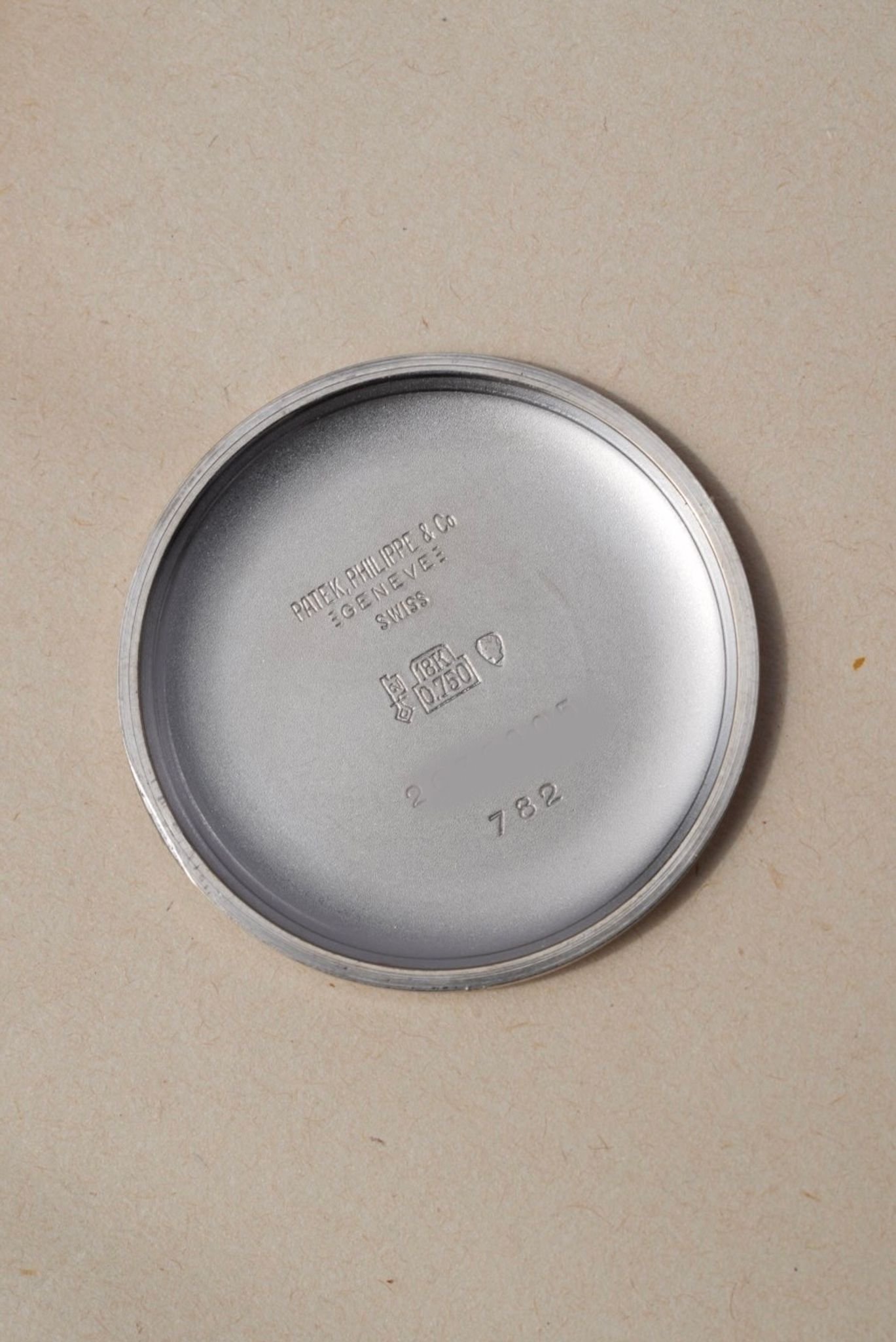 Patek Philippe antimagnetic pocket watch in 18K white gold, reference 782 “Golf”, designed by Gilbert Albert and produced from 1959 to around 1964. The three-part polished white gold case features a winding crown at 6 o’clock. The matte silver dial has white gold baton and dart indexes along with matching baton hands. The watch is powered by the 27-400 AM movement, an antimagnetic caliber with 18 jewels, straight-line lever escapement, monometallic balance, free-sprung self-compensating Breguet