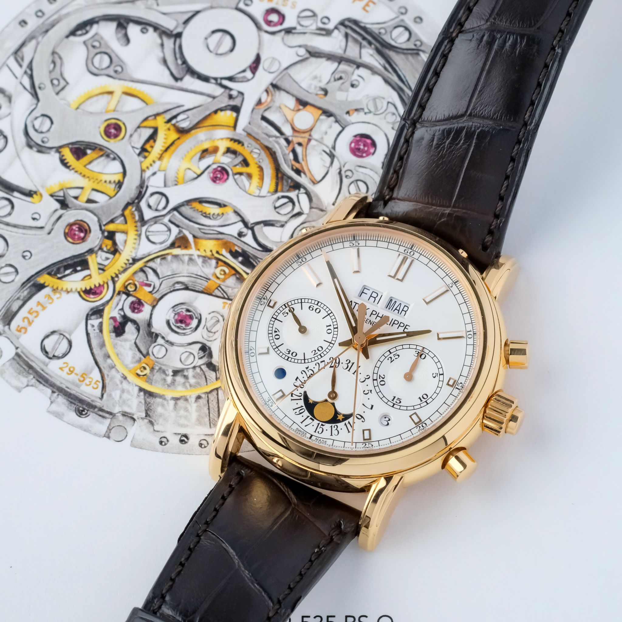 I’m delighted to present this outstanding Patek Philippe Perpetual calendar, rattrapante chronograph reference 5204R-001 in beautiful condition. The Patek Philippe Ref. 5204R is the modern evolution of one of the brand’s most revered complications: the split-seconds chronograph with perpetual calendar. It follows in the footsteps of the iconic Ref. 5004 which was powered by a heavily modified Lemania-based movement and produced in very limited numbers, gaining legendary status among collectors. Introduced in 2012, the 5204 builds on that legacy with a fully in-house movement, the Caliber CHR 29-535, offering improved chronograph performance, modern engineering, and a larger 40 mm case.