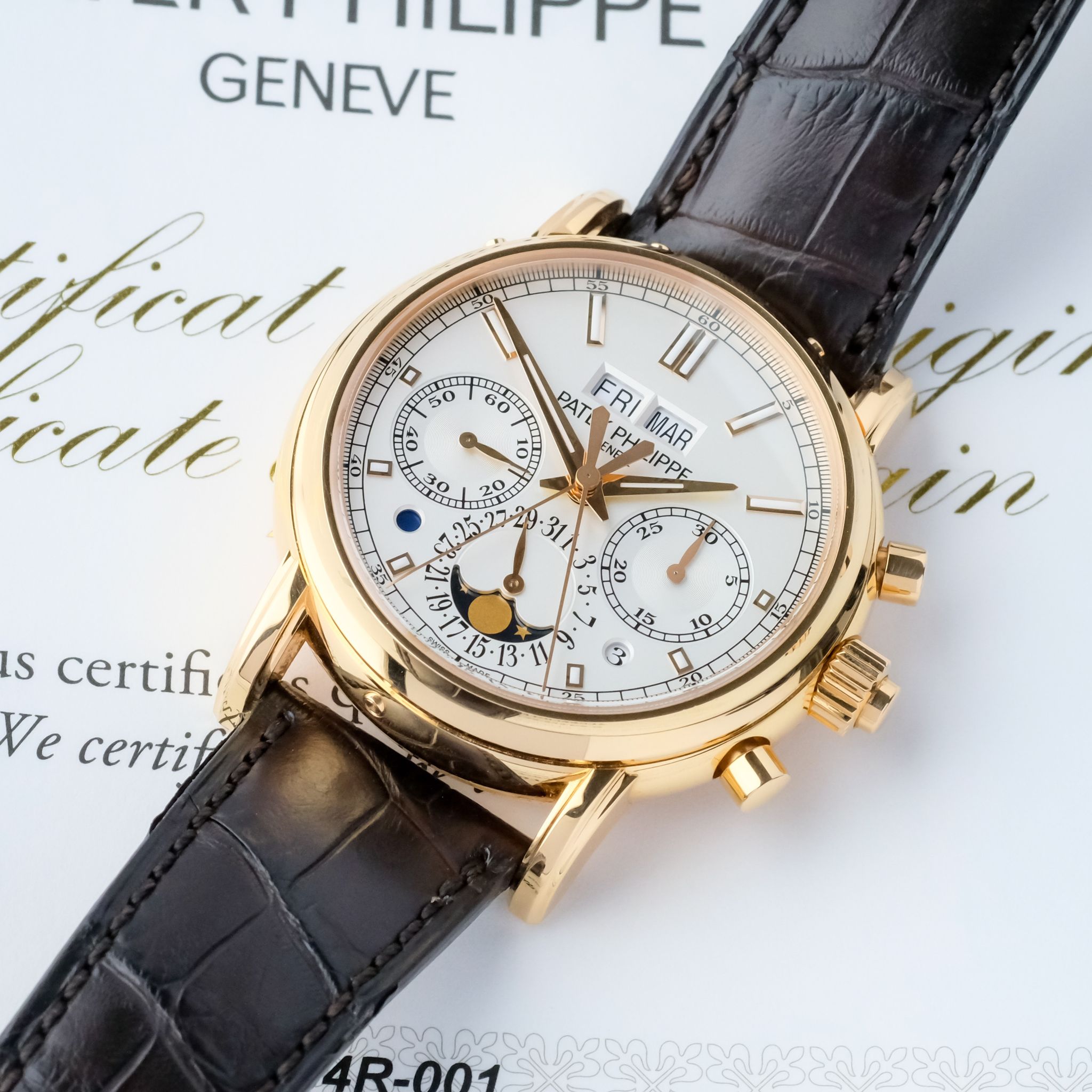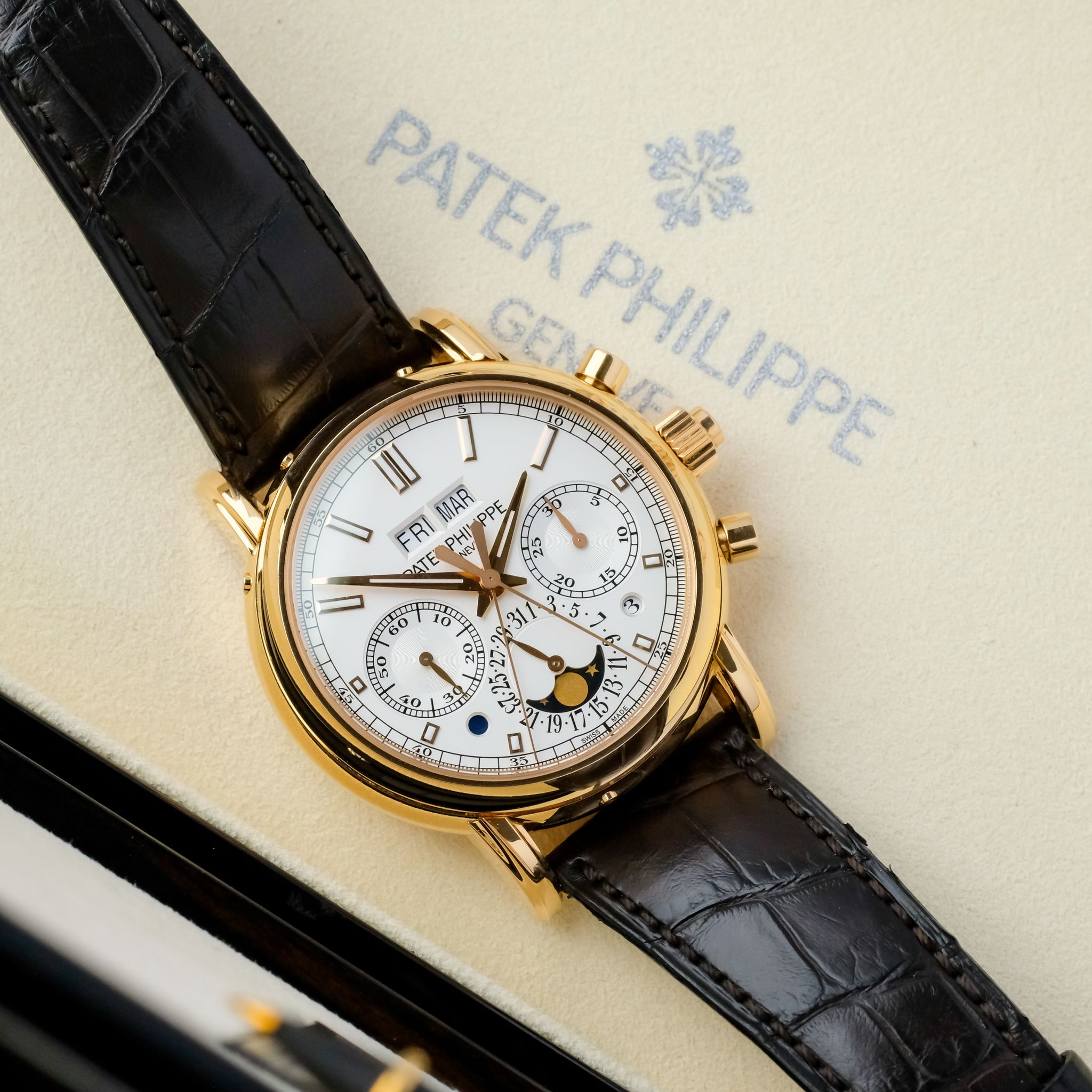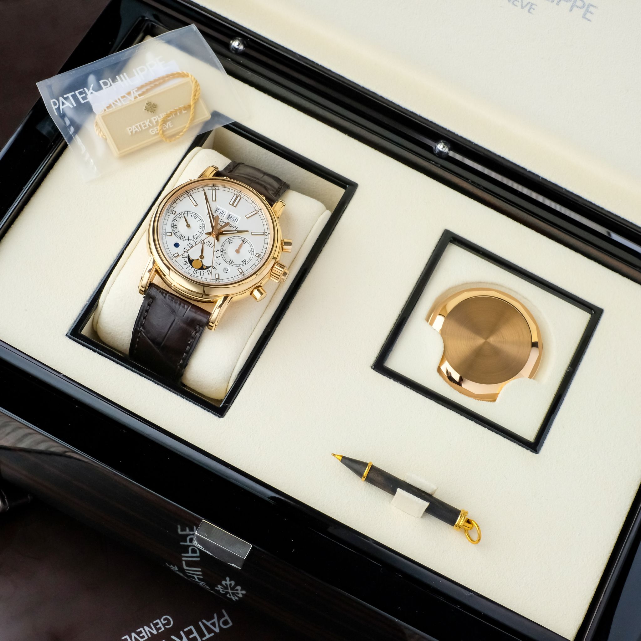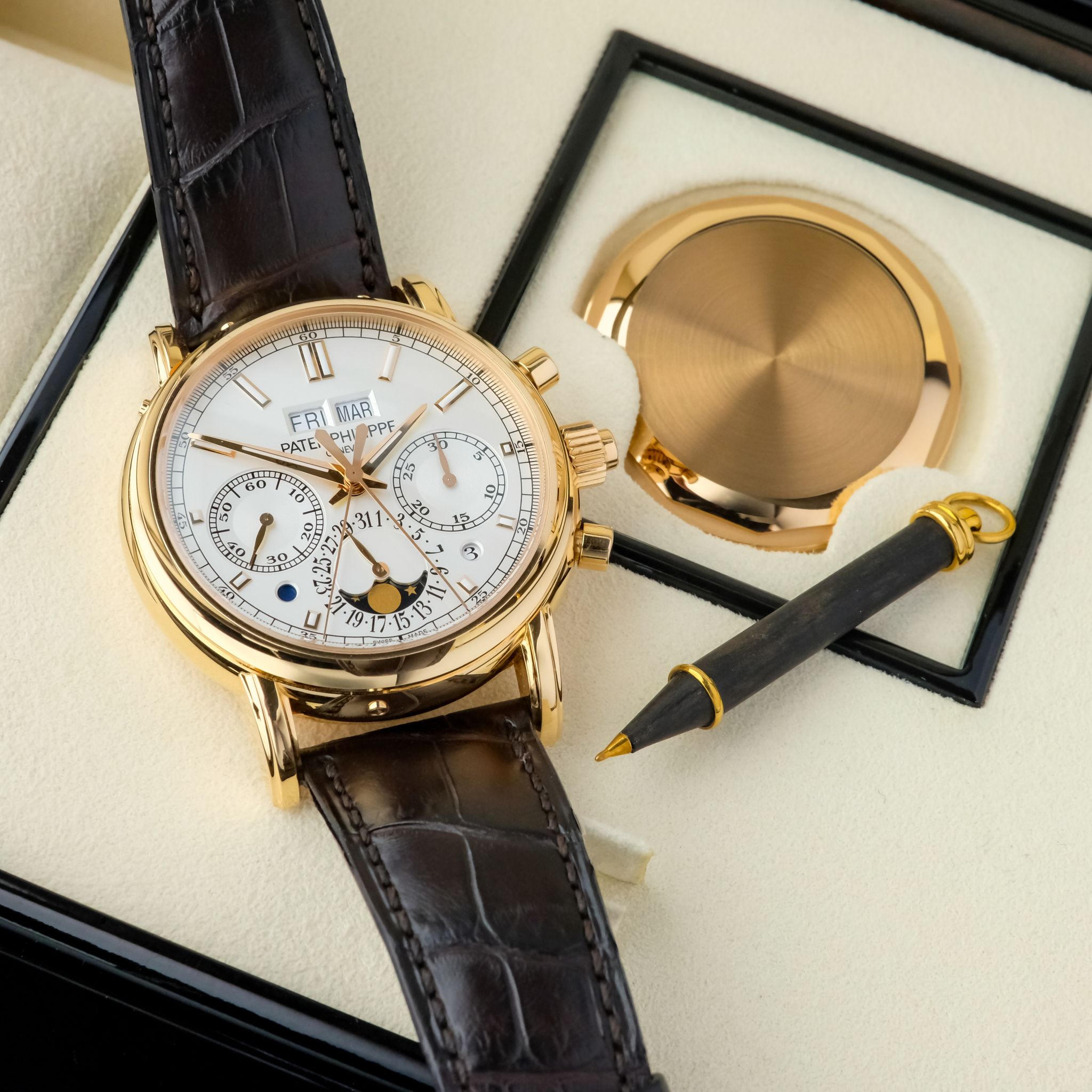 This very example is in beautiful condition and has only been rarely and lightly worn over the past few years, the hallmarks on the inside of the lugs are still extremely sharp and show no signs of polishing, such as the upper bevels on the lugs which are well pronounciated and show an angle. The silver-white dial with its beautiful layout of the perpetual calendar as well as rattrapante chronograph features no signs of patina or dust, it is perfect, such as the rest of the watch, including the set: it comes accompanied with all the accessories of course including the second caseback, setting pin and the large leather book explaining the history behind as well as the complications of the watch.