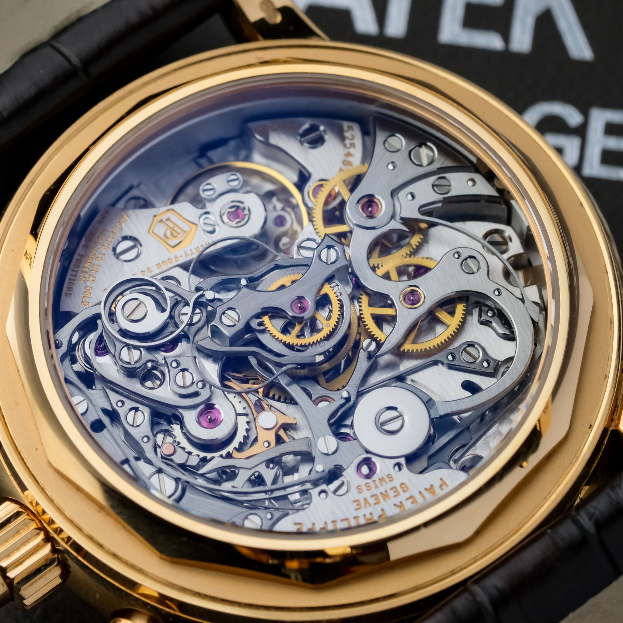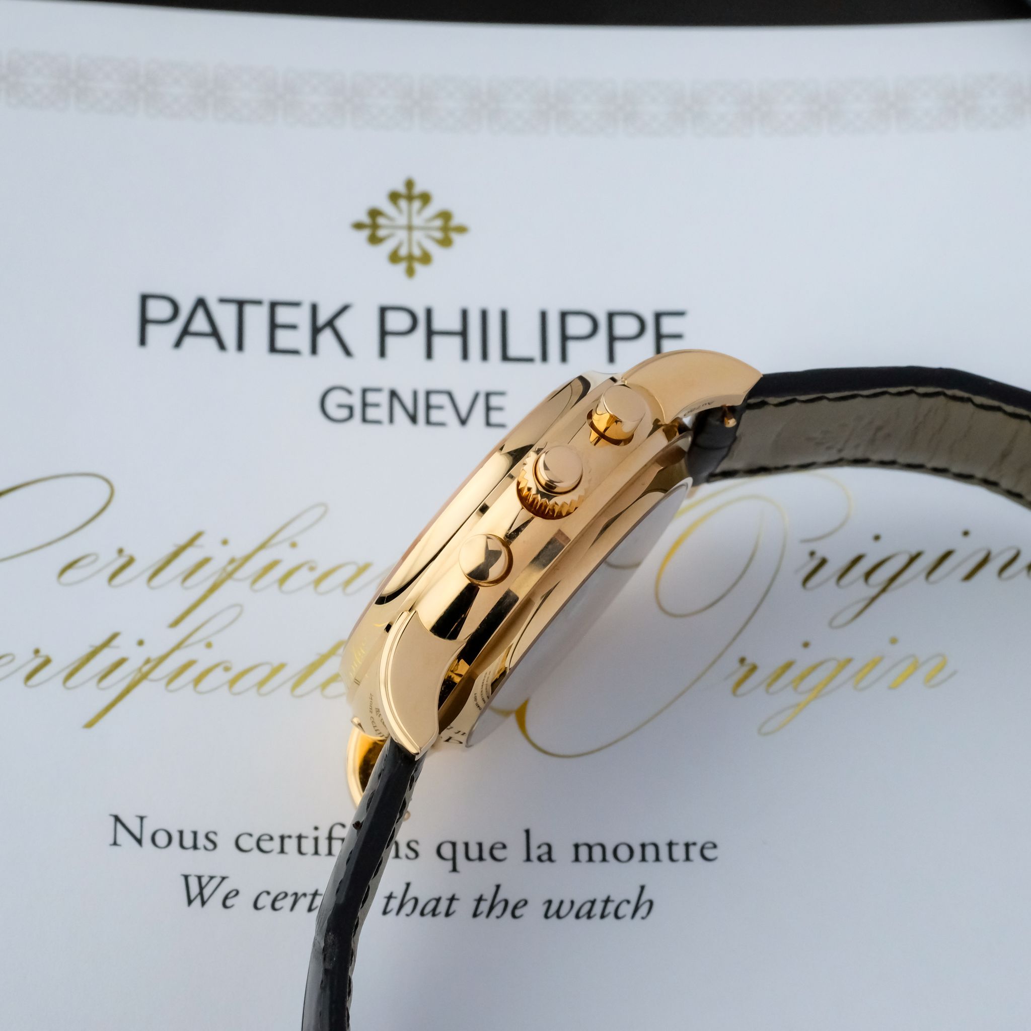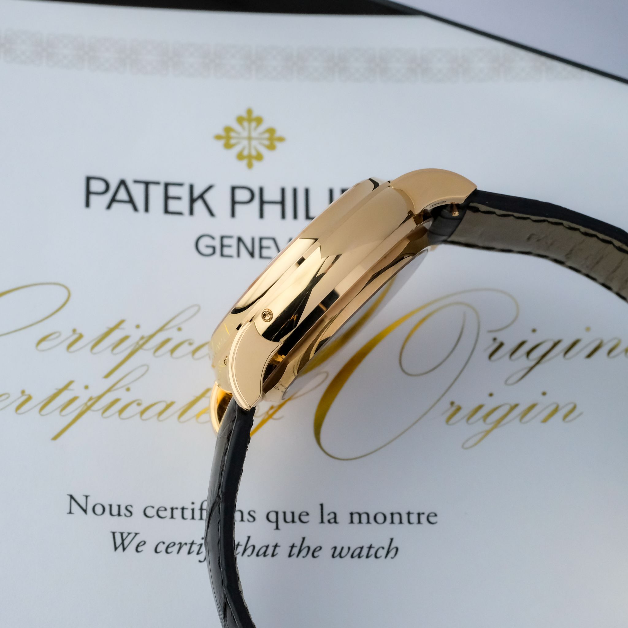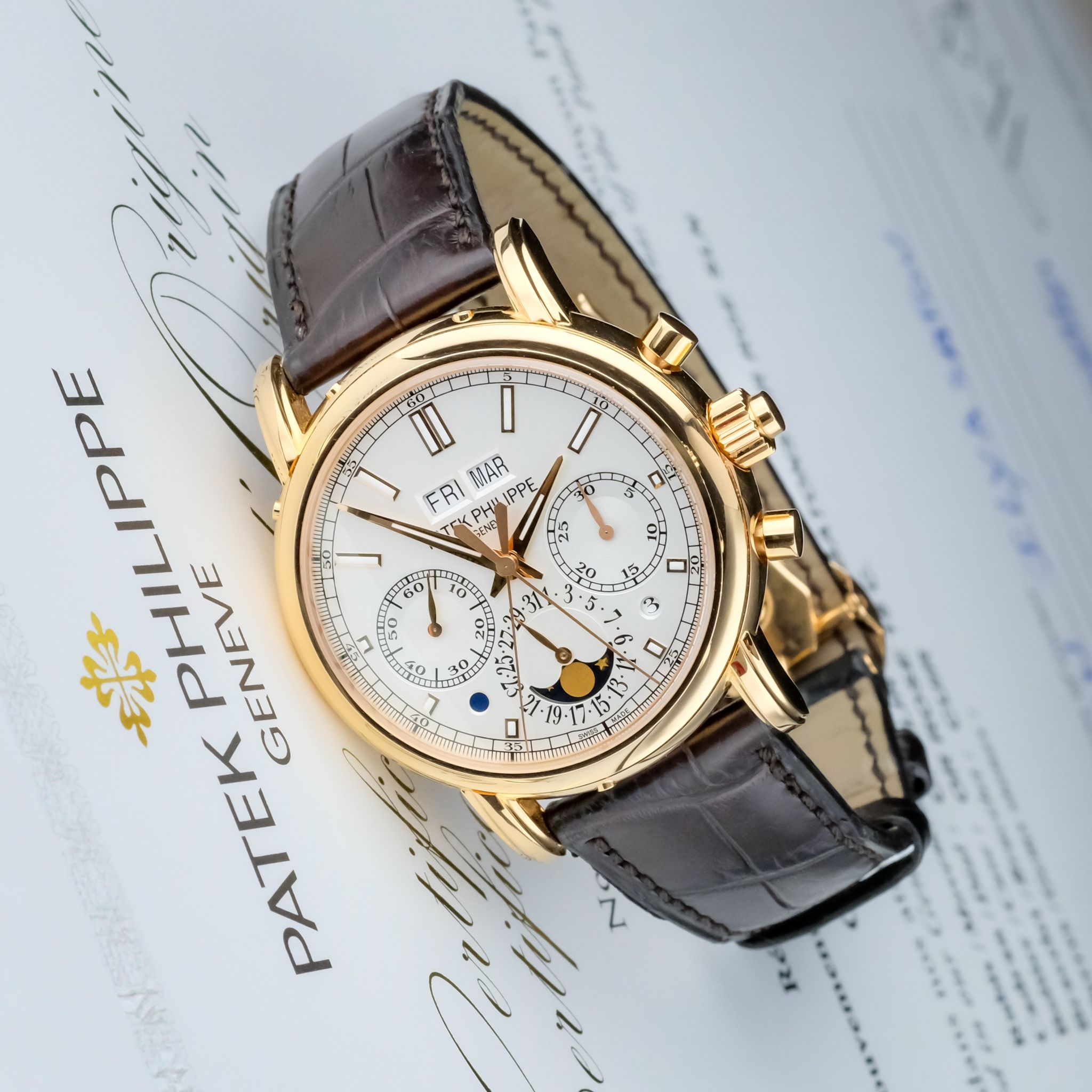This very example is in beautiful condition and has only been rarely and lightly worn over the past few years, the hallmarks on the inside of the lugs are still extremely sharp and show no signs of polishing, such as the upper bevels on the lugs which are well pronounciated and show an angle. The silver-white dial with its beautiful layout of the perpetual calendar as well as rattrapante chronograph features no signs of patina or dust, it is perfect, such as the rest of the watch, including the set: it comes accompanied with all the accessories of course including the second caseback, setting pin and the large leather book explaining the history behind as well as the complications of the watch.