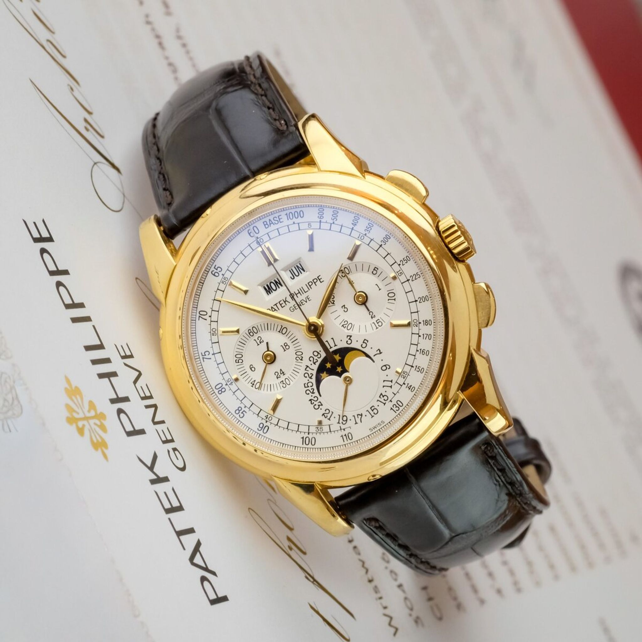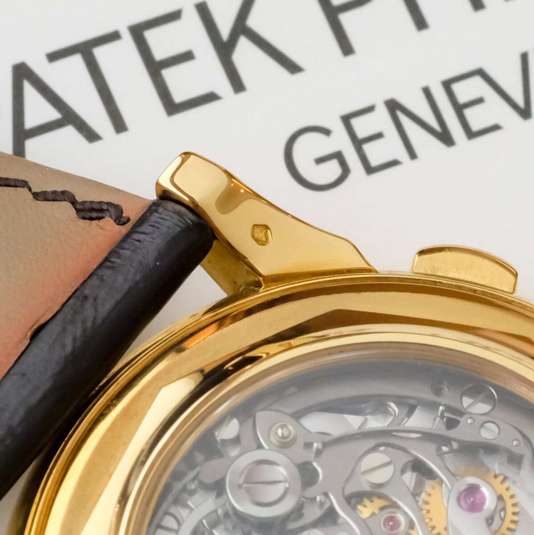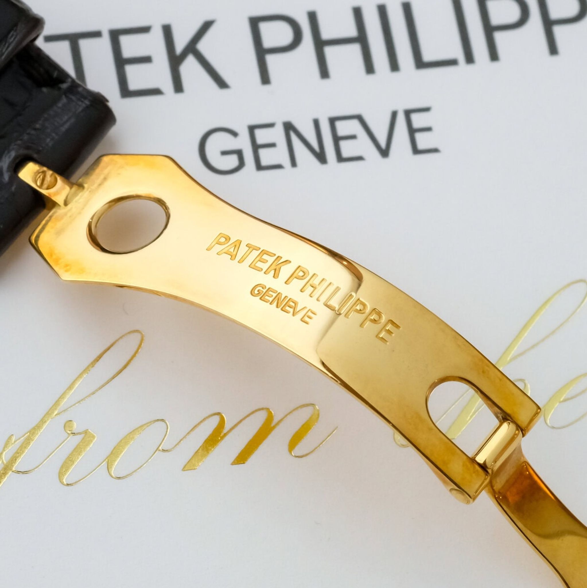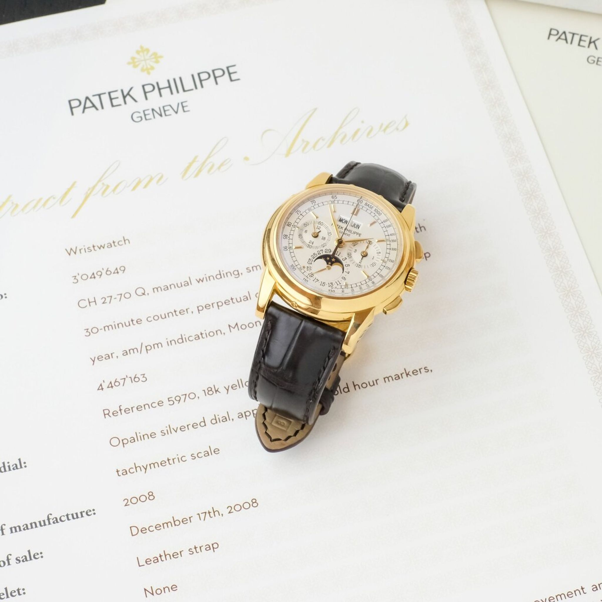 This example is offered with an Extract from the Archives and a Patek Philippe folding clasp. The watch remains in very good overall condition with honest signs of wear on case and clasp, sharp and deeply struck hallmarks, a flawless dial and perfectly functioning calendar and chronograph indications. For collectors seeking a definitive yellow gold 5970 with documented provenance and excellent presentation, this piece represents a rare opportunity to acquire one of the most celebrated perpetual calendar chronographs.