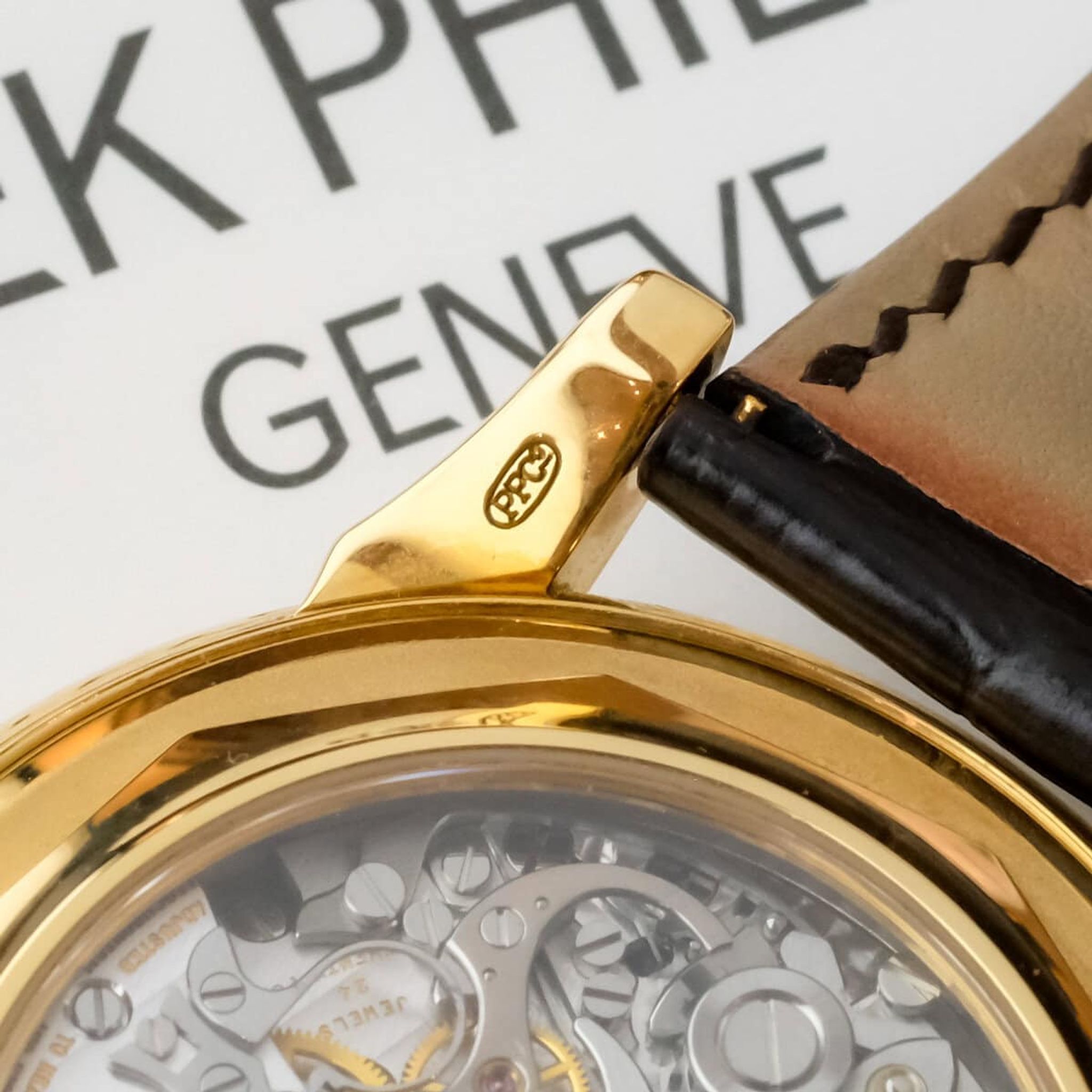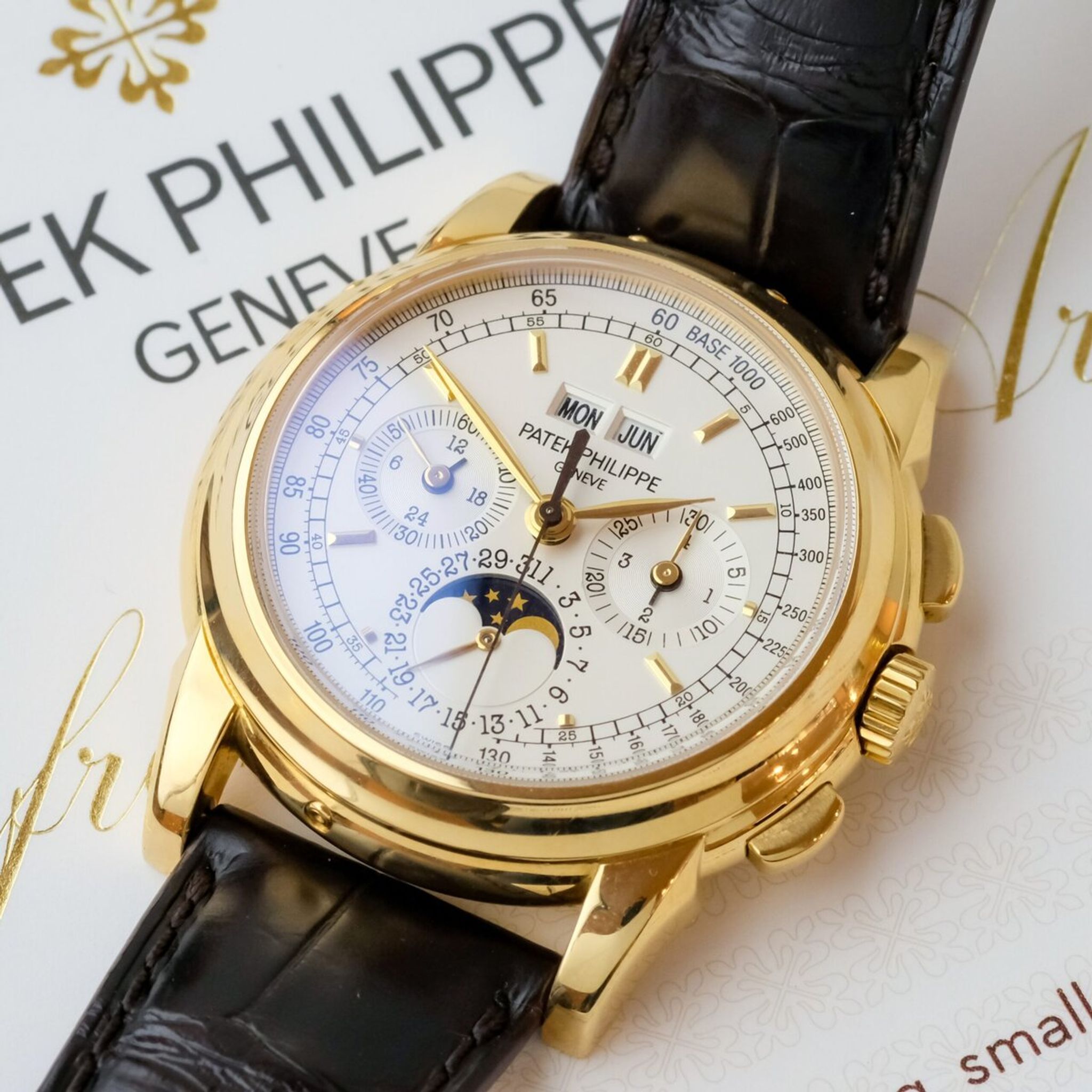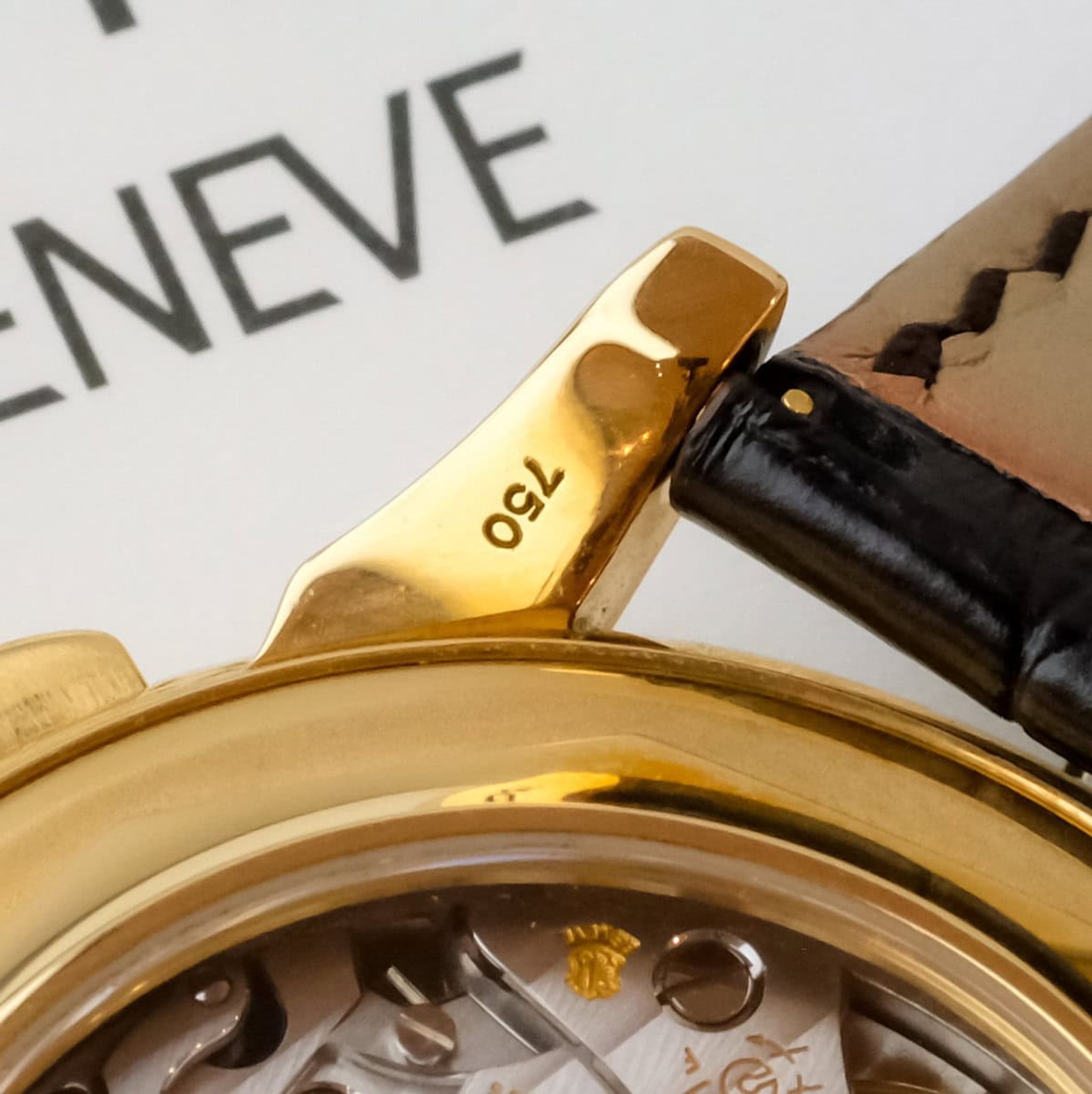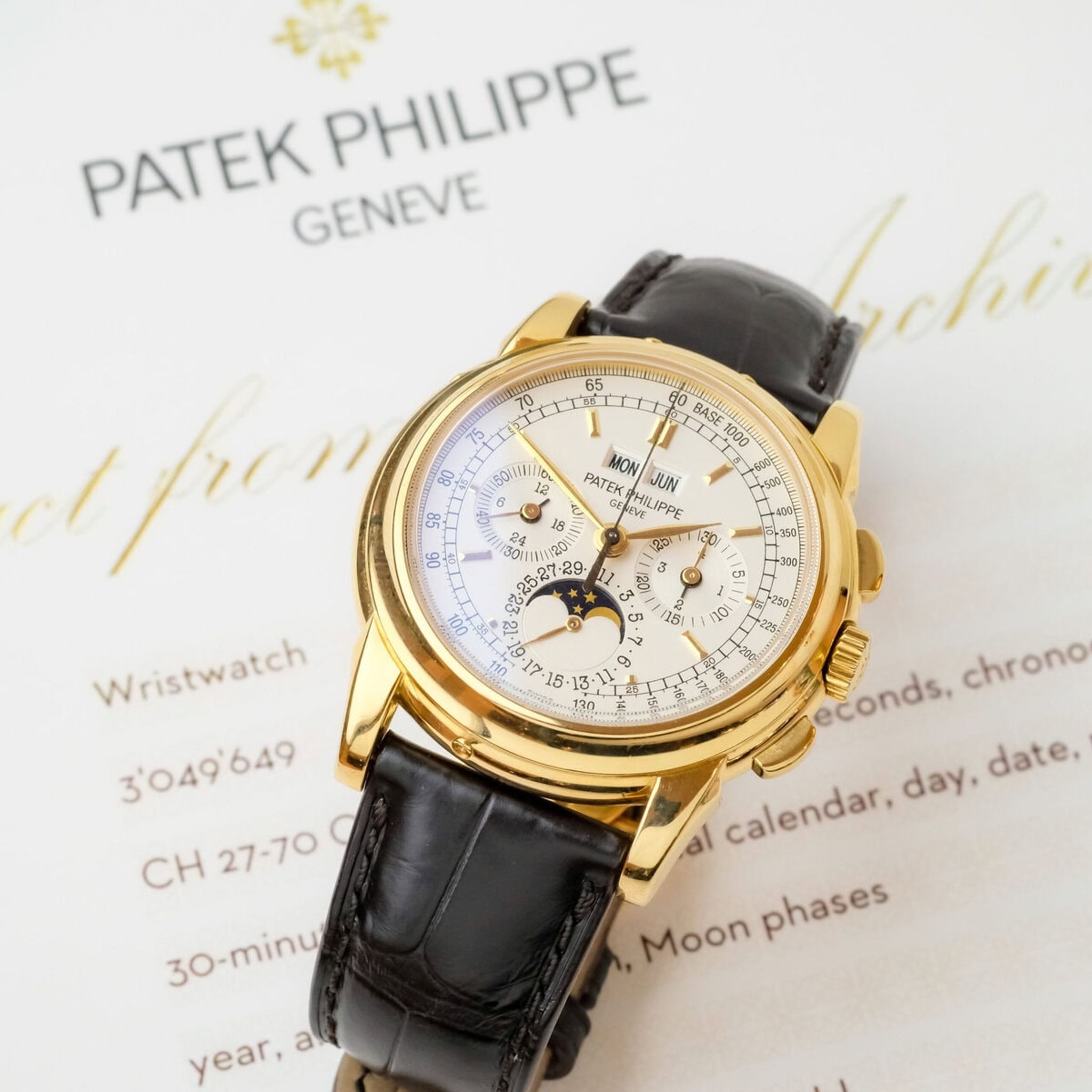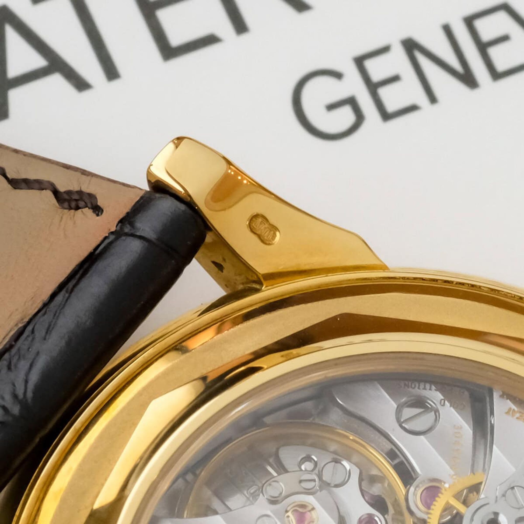 This example is offered with an Extract from the Archives and a Patek Philippe folding clasp. The watch remains in very good overall condition with honest signs of wear on case and clasp, sharp and deeply struck hallmarks, a flawless dial and perfectly functioning calendar and chronograph indications. For collectors seeking a definitive yellow gold 5970 with documented provenance and excellent presentation, this piece represents a rare opportunity to acquire one of the most celebrated perpetual calendar chronographs.