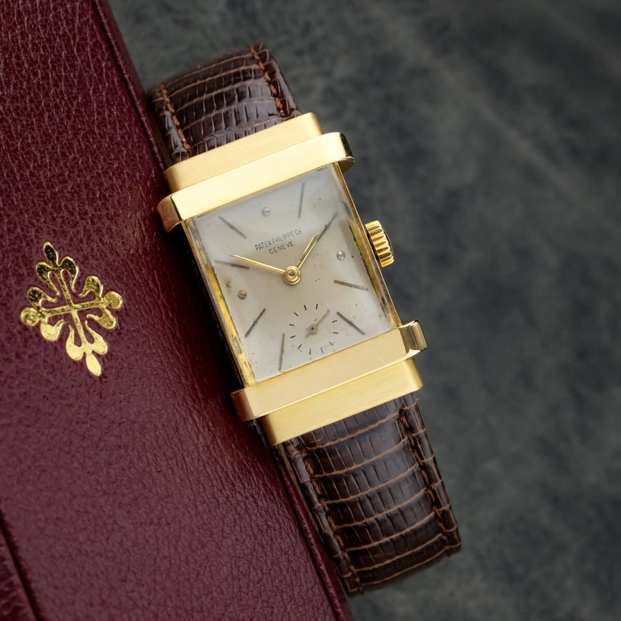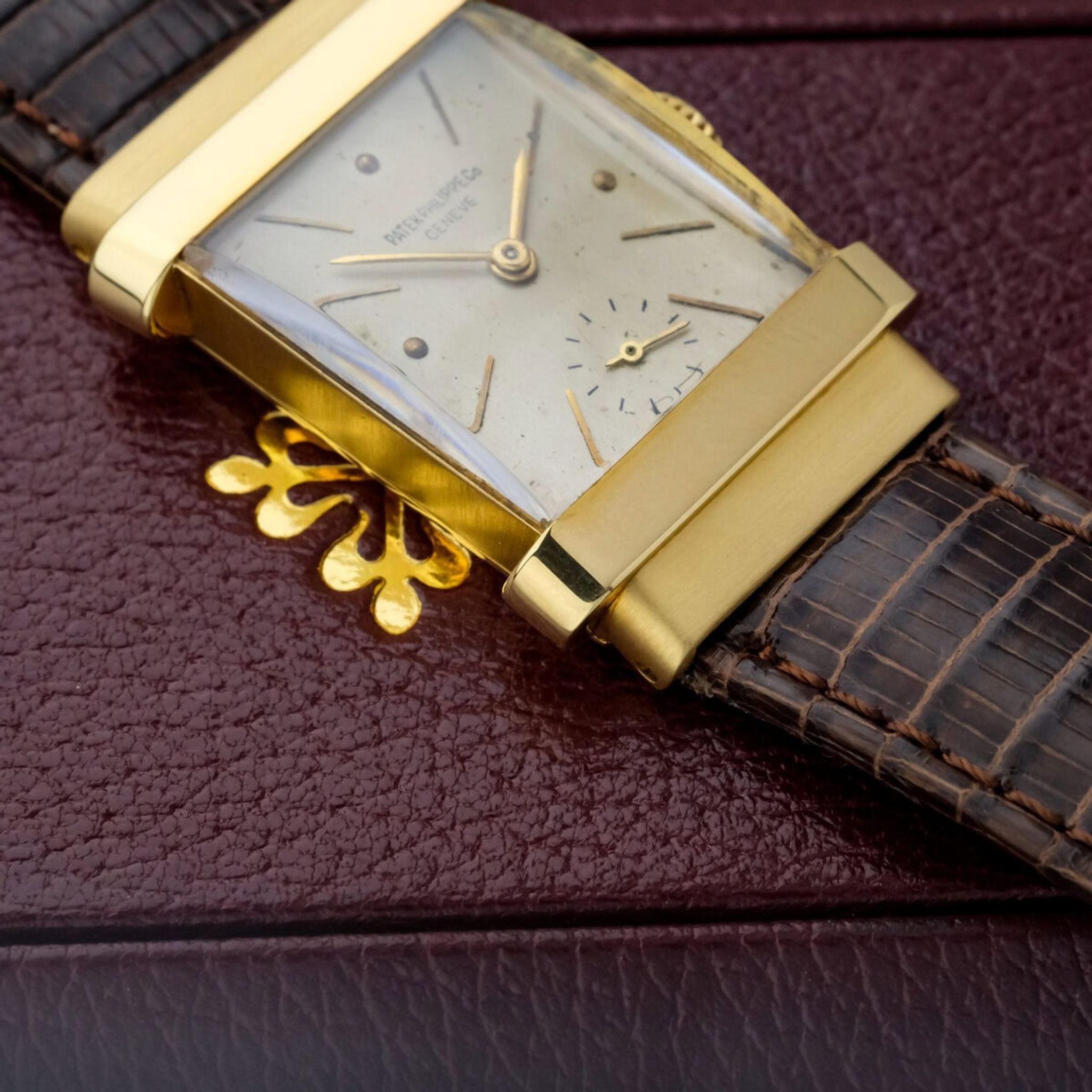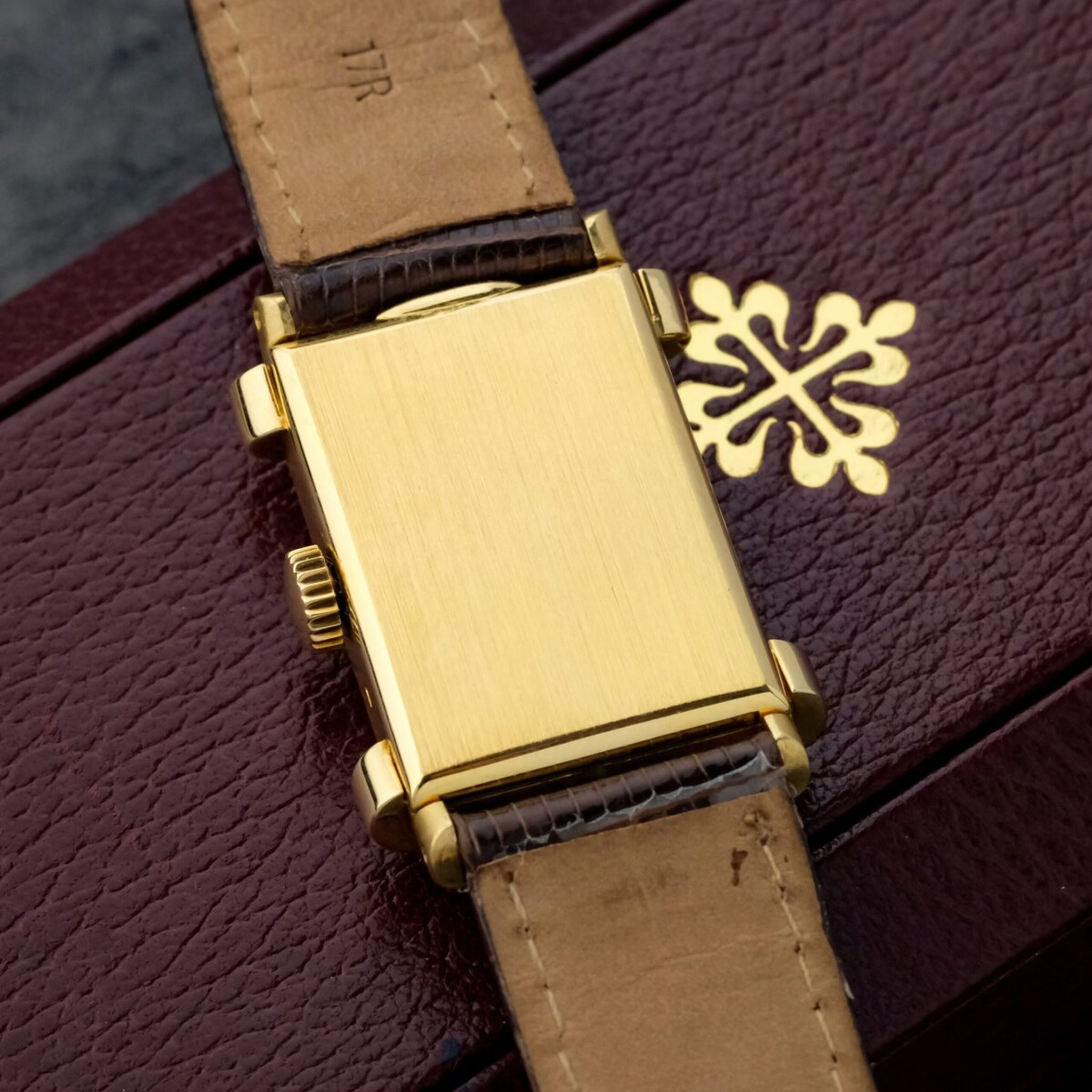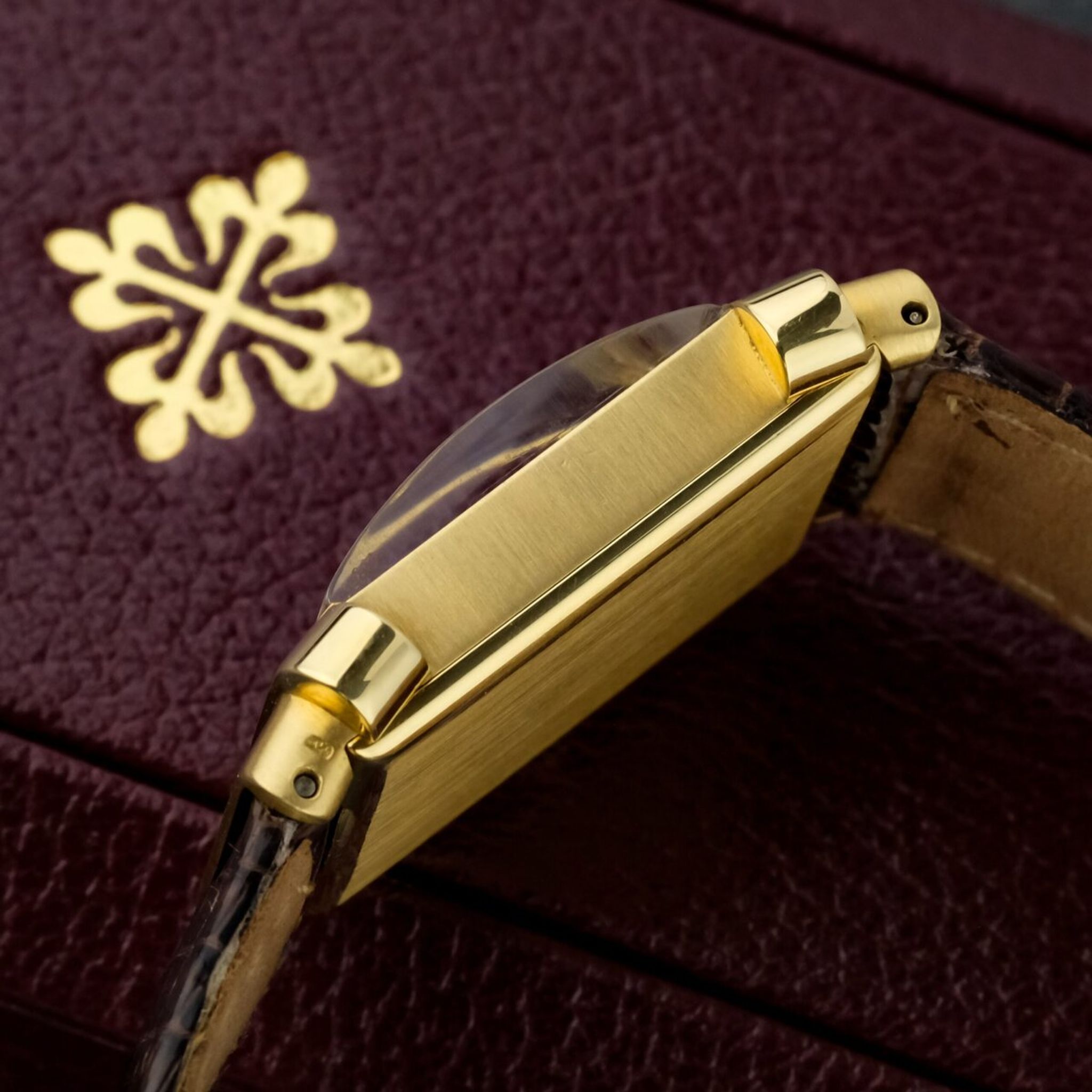This Patek Philippe Top Hat reference 1450 is a rare and elegant example of one of the maison’s most distinctive rectangular designs. Crafted in 18k yellow gold, the case measures 21 by 35 millimeters and features the softly flared lugs that give the model its signature “Top Hat” silhouette.