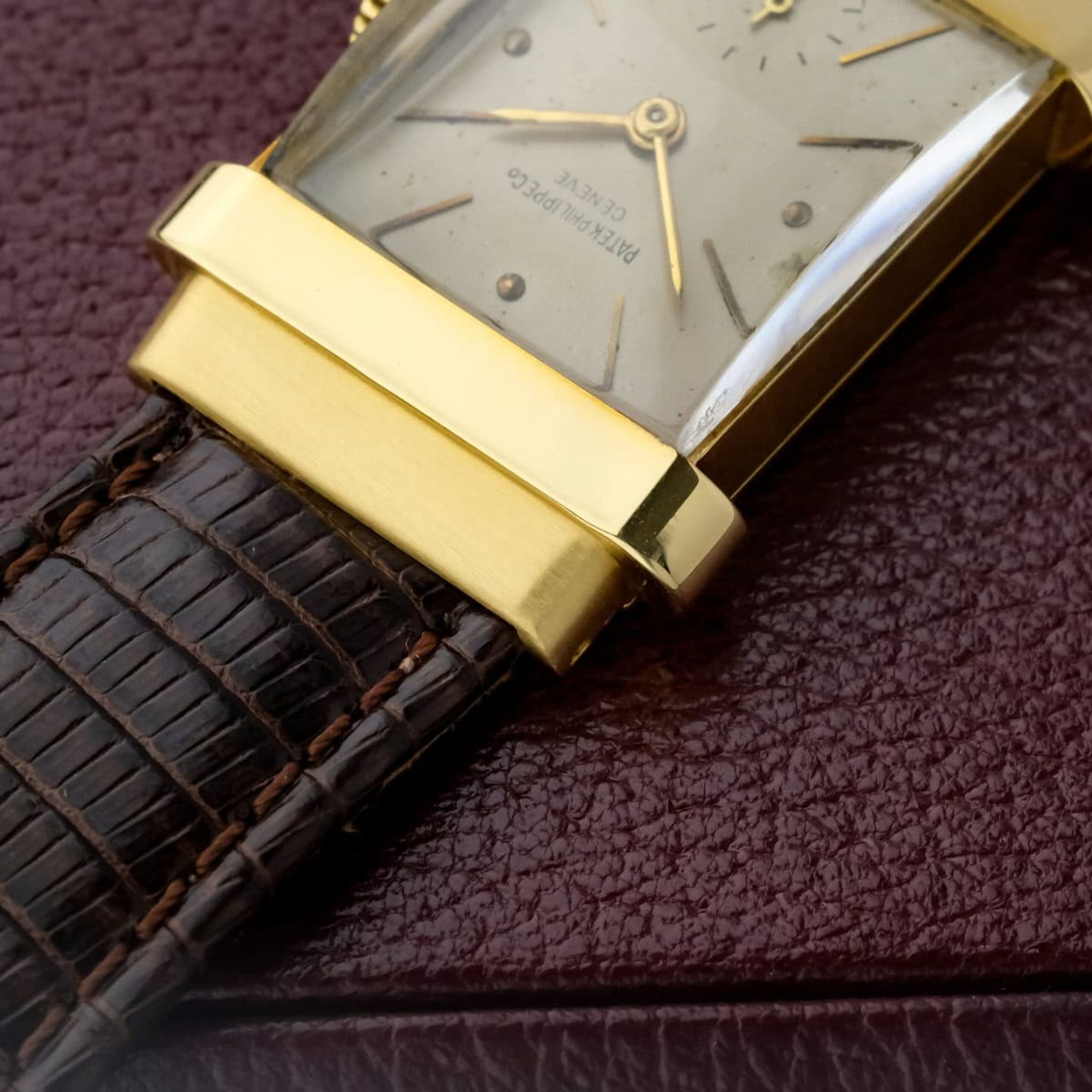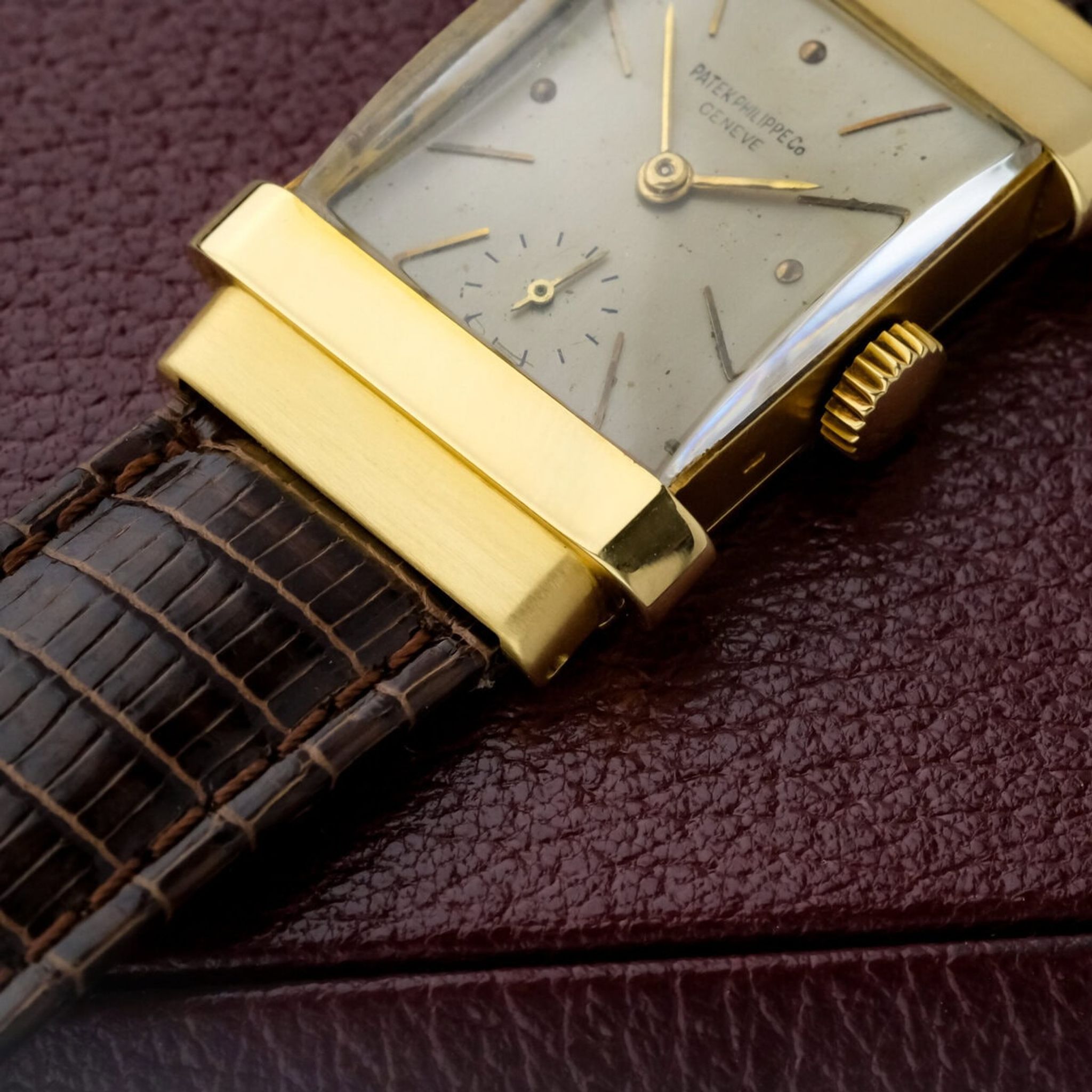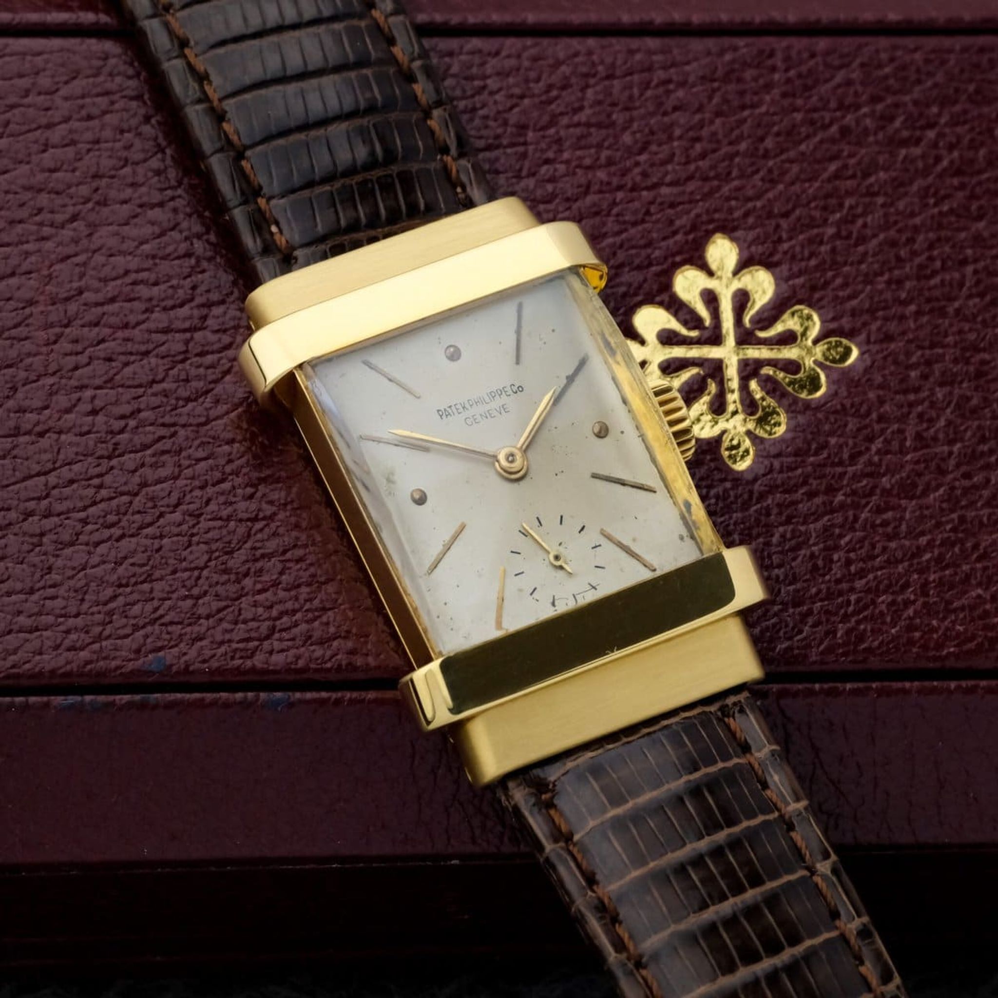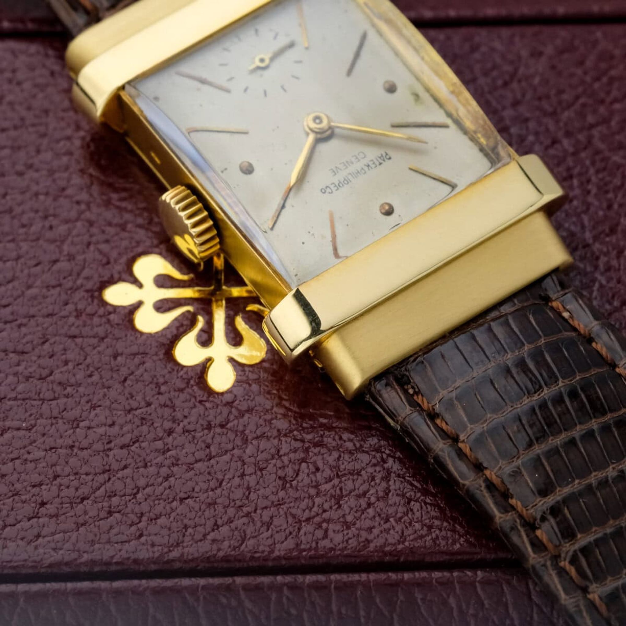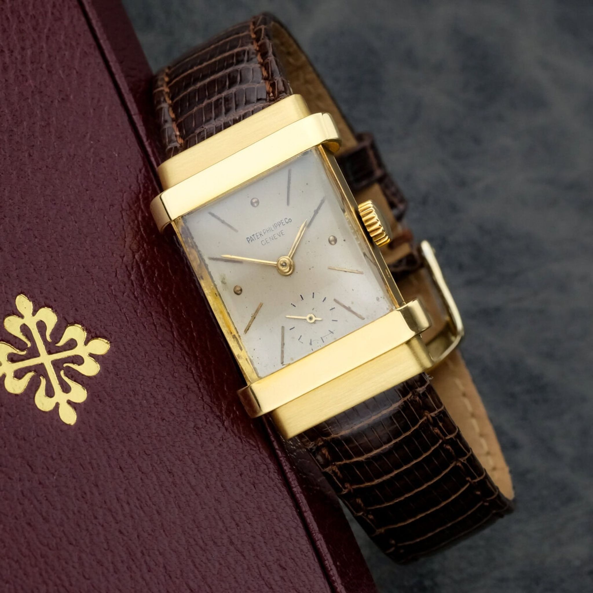 This Patek Philippe Top Hat reference 1450 is a rare and elegant example of one of the maison’s most distinctive rectangular designs. Crafted in 18k yellow gold, the case measures 21 by 35 millimeters and features the softly flared lugs that give the model its signature “Top Hat” silhouette.