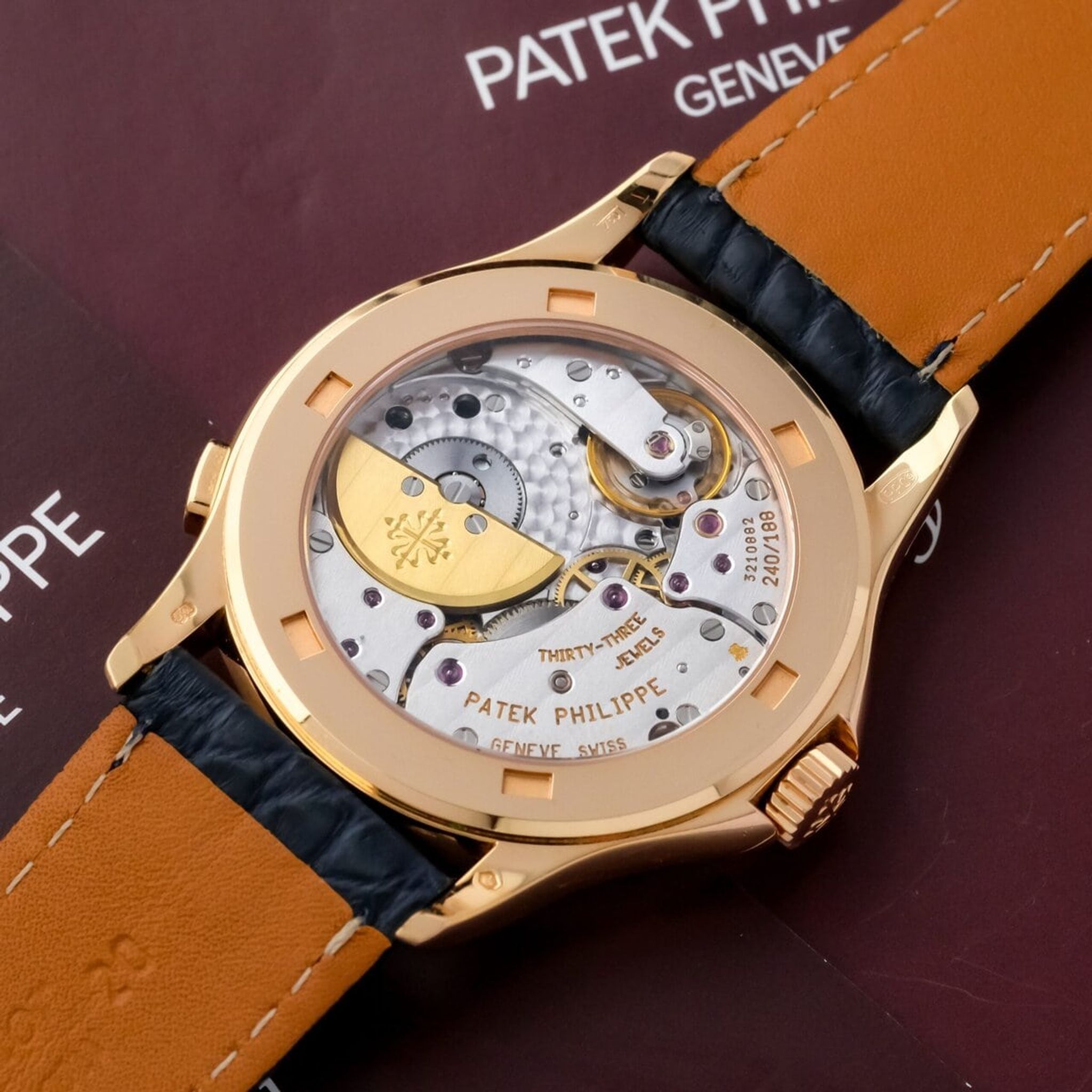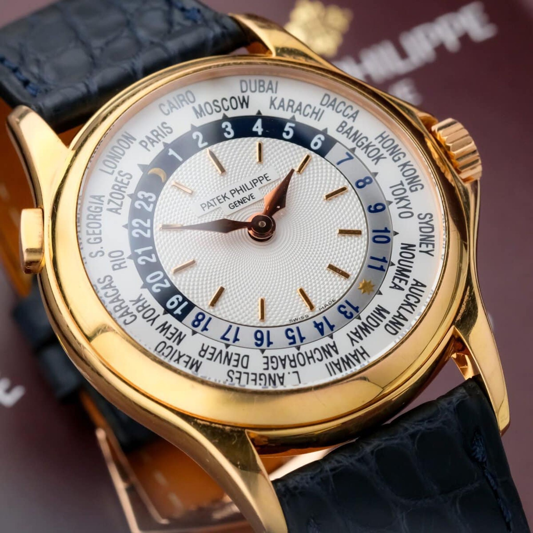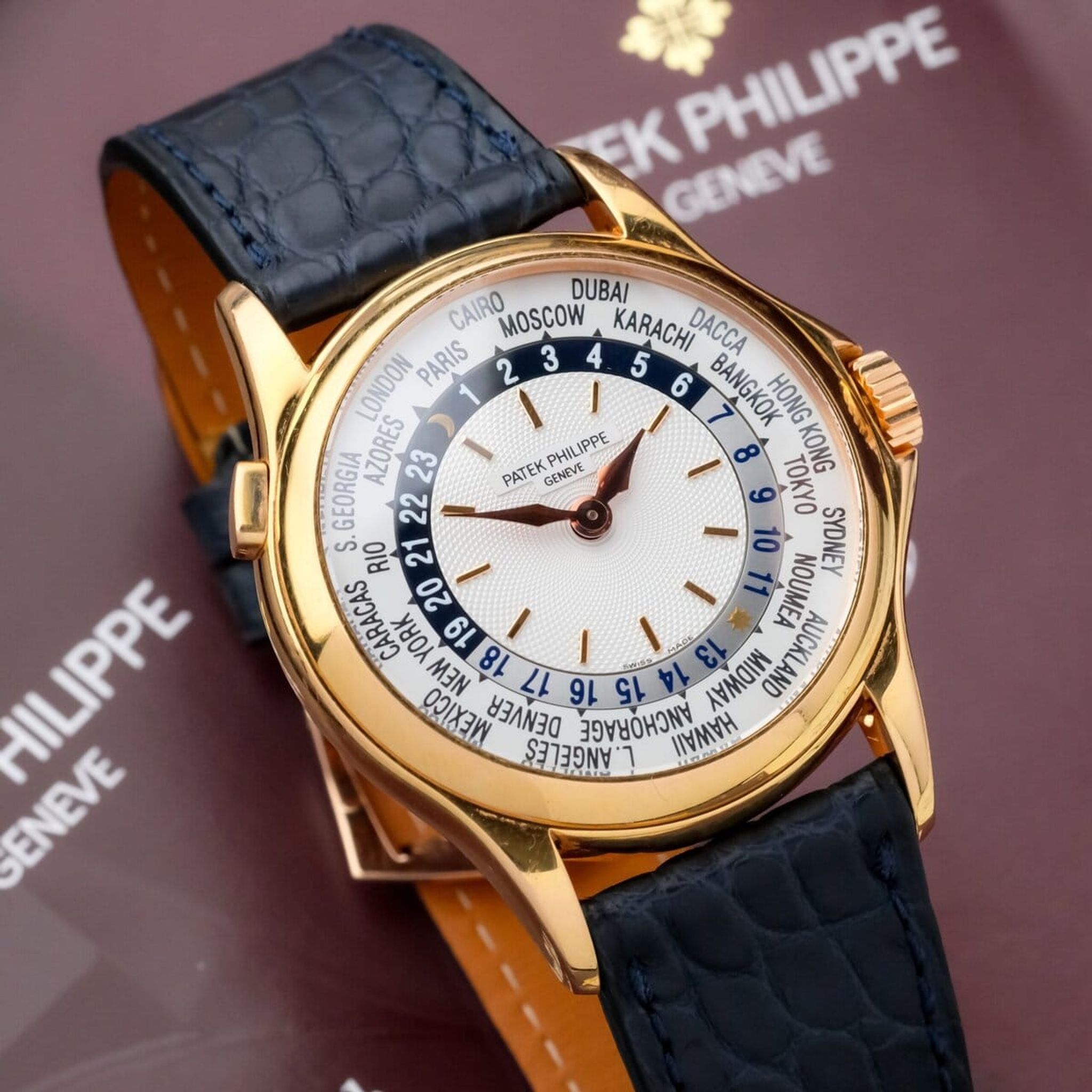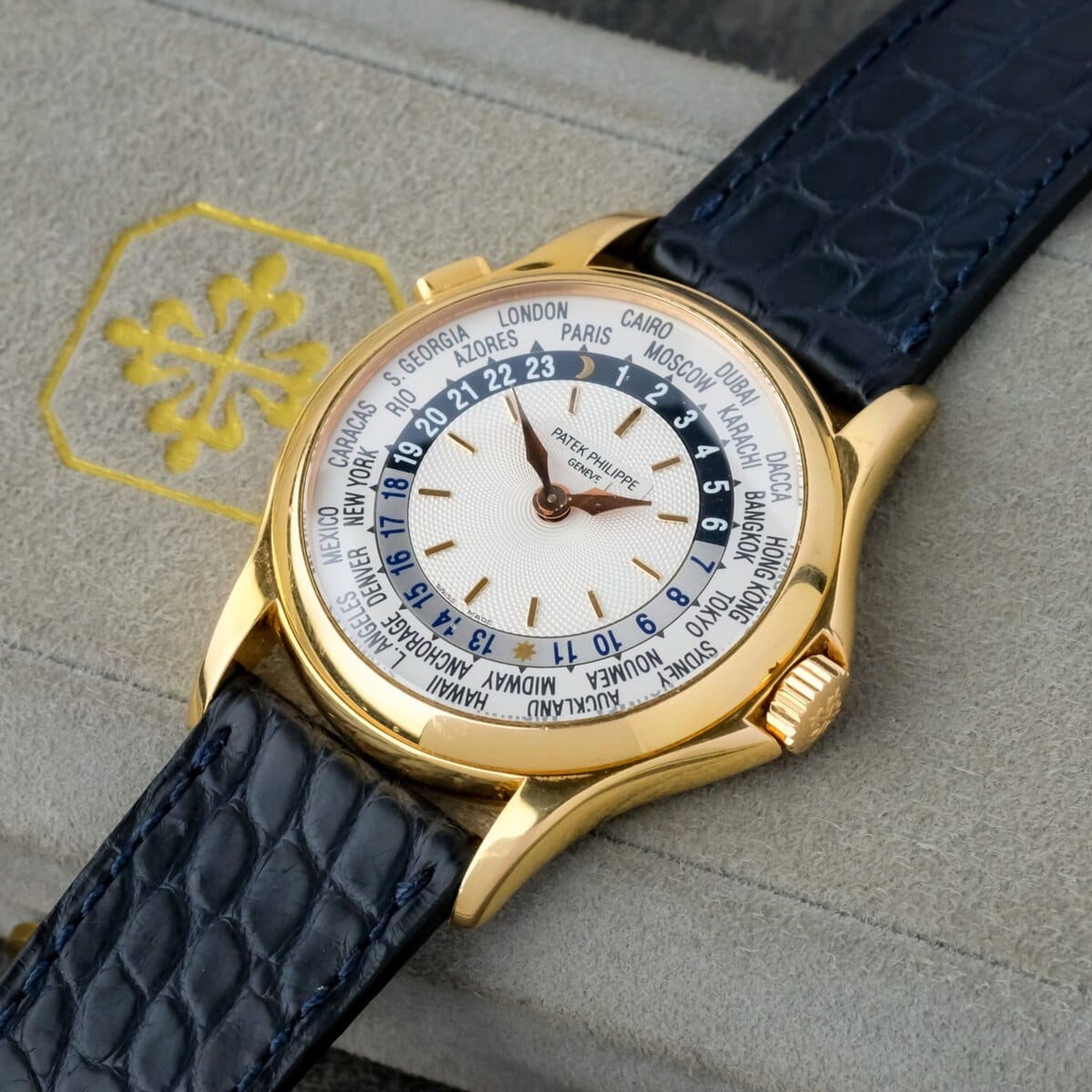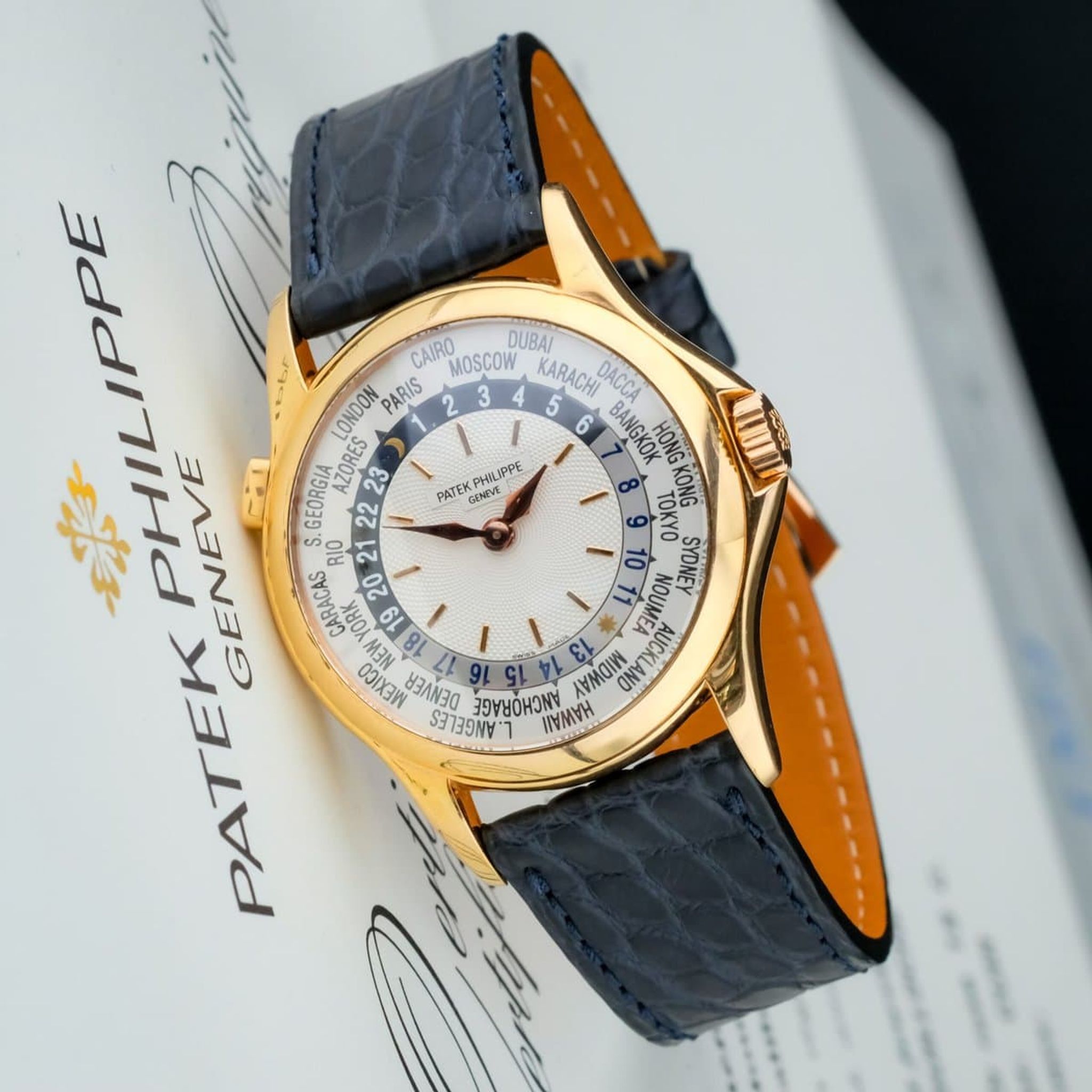 The beautifully executed display allows simultaneous reading of 24 time zones through a rotating city ring and 24-hour scale, powered by the ultra-thin micro-rotor automatic caliber 240/188. The movement, visible through the sapphire caseback, showcases Patek Philippe’s hallmark finishing and technical mastery.