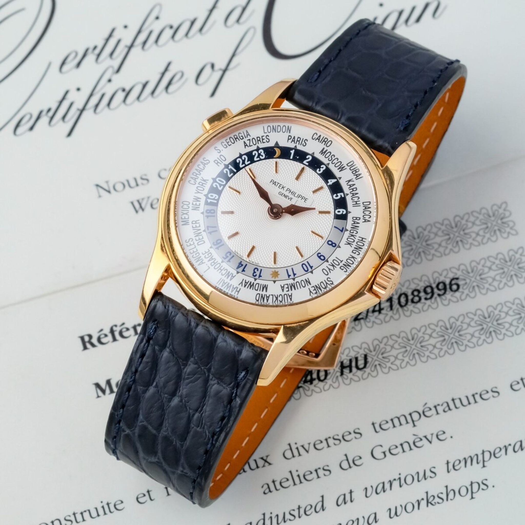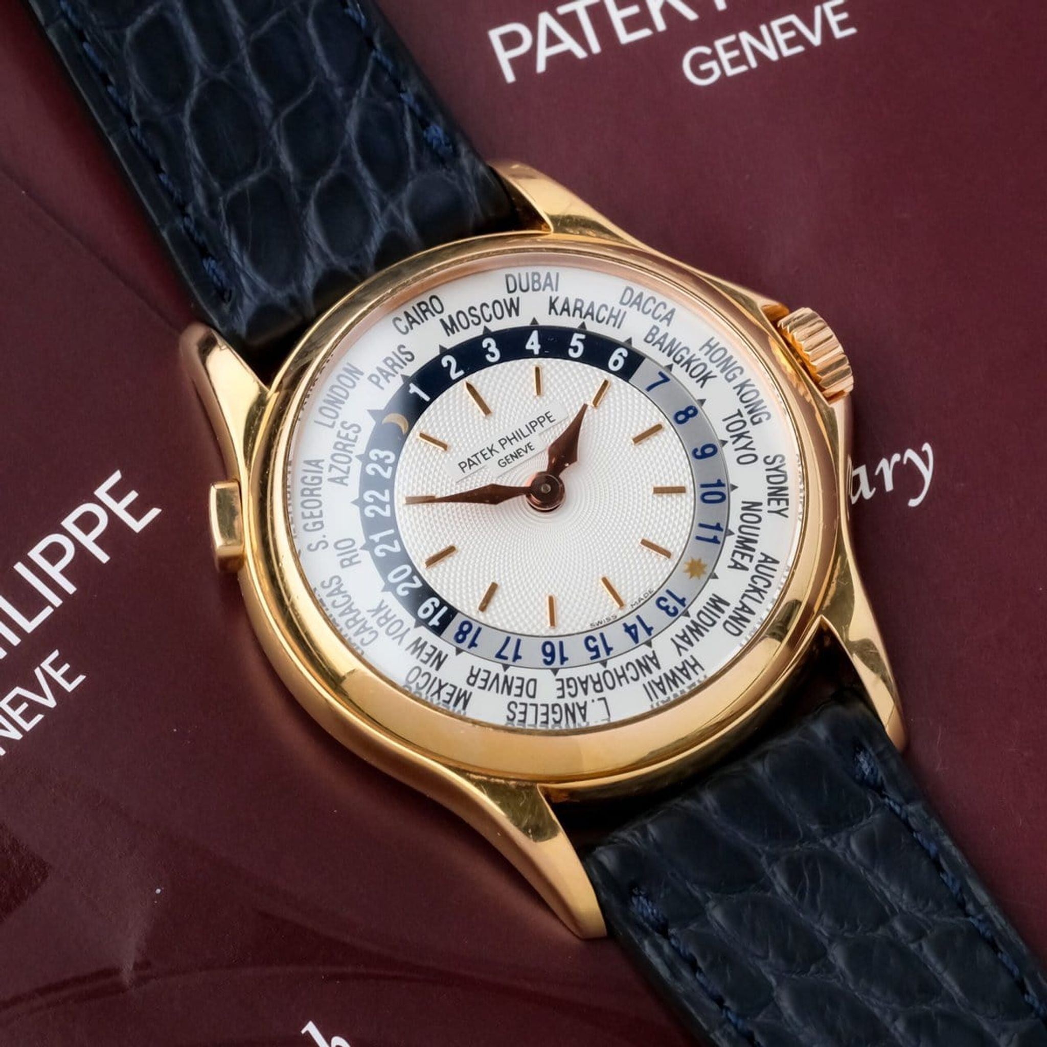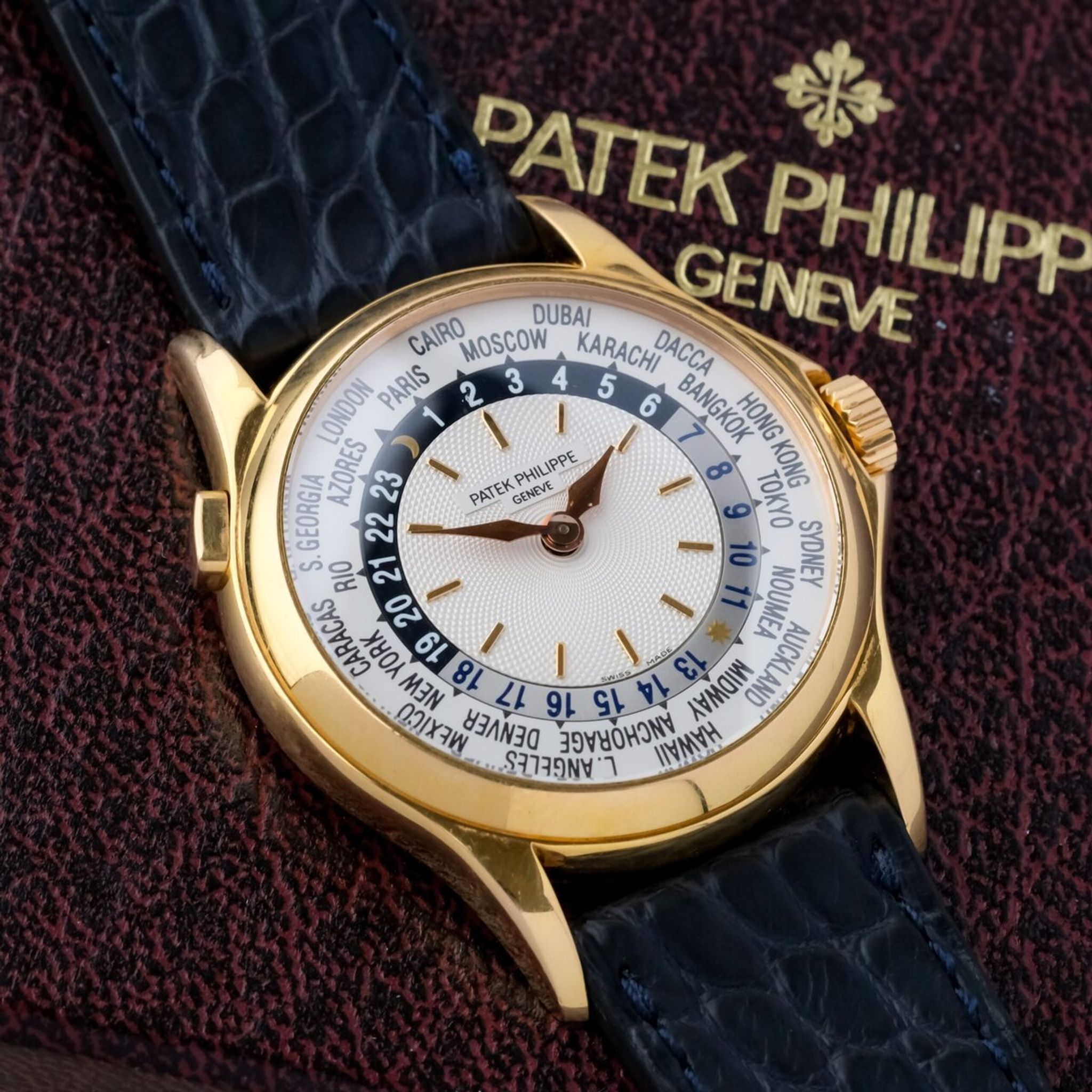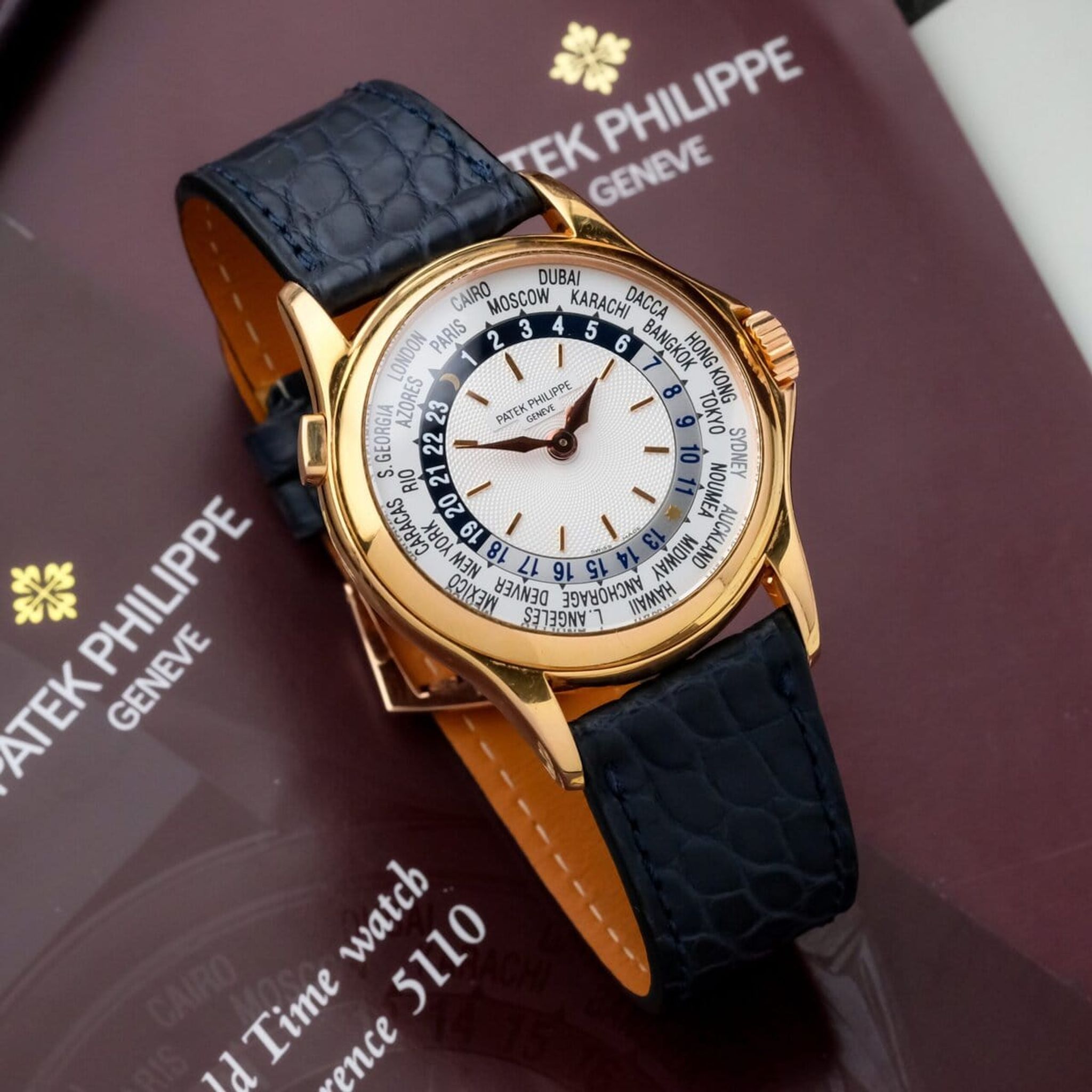 Offered as a full set and preserved in top overall condition with only a small mark on the crystal, this reference 5110R represents a perfect blend of horological ingenuity, functionality, and timeless design, standing as one of the most refined world timers of the modern Patek Philippe era.
