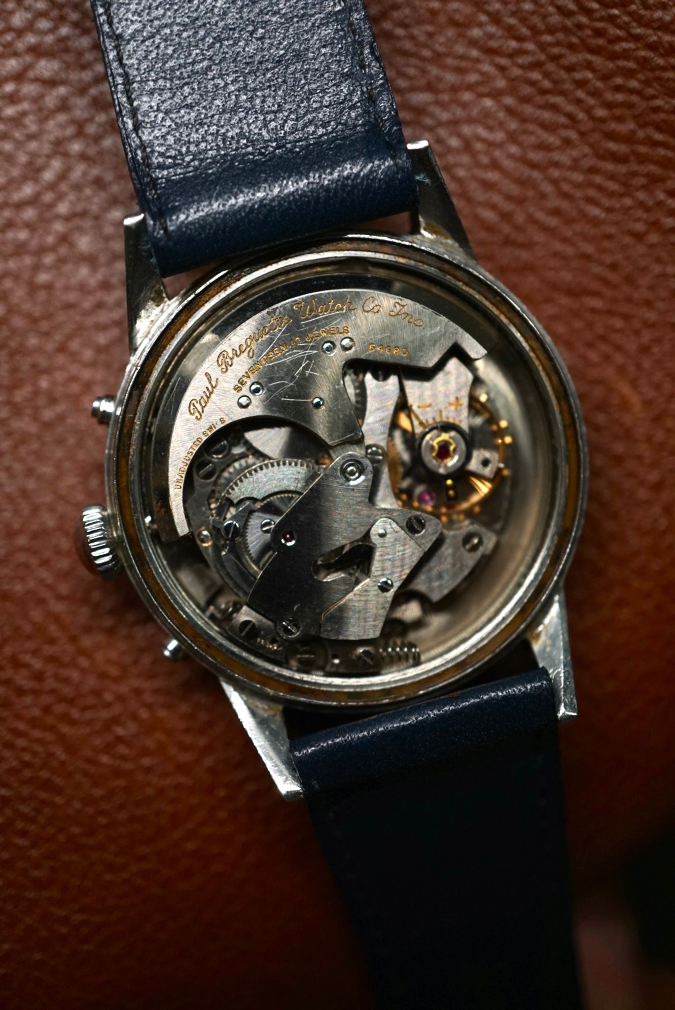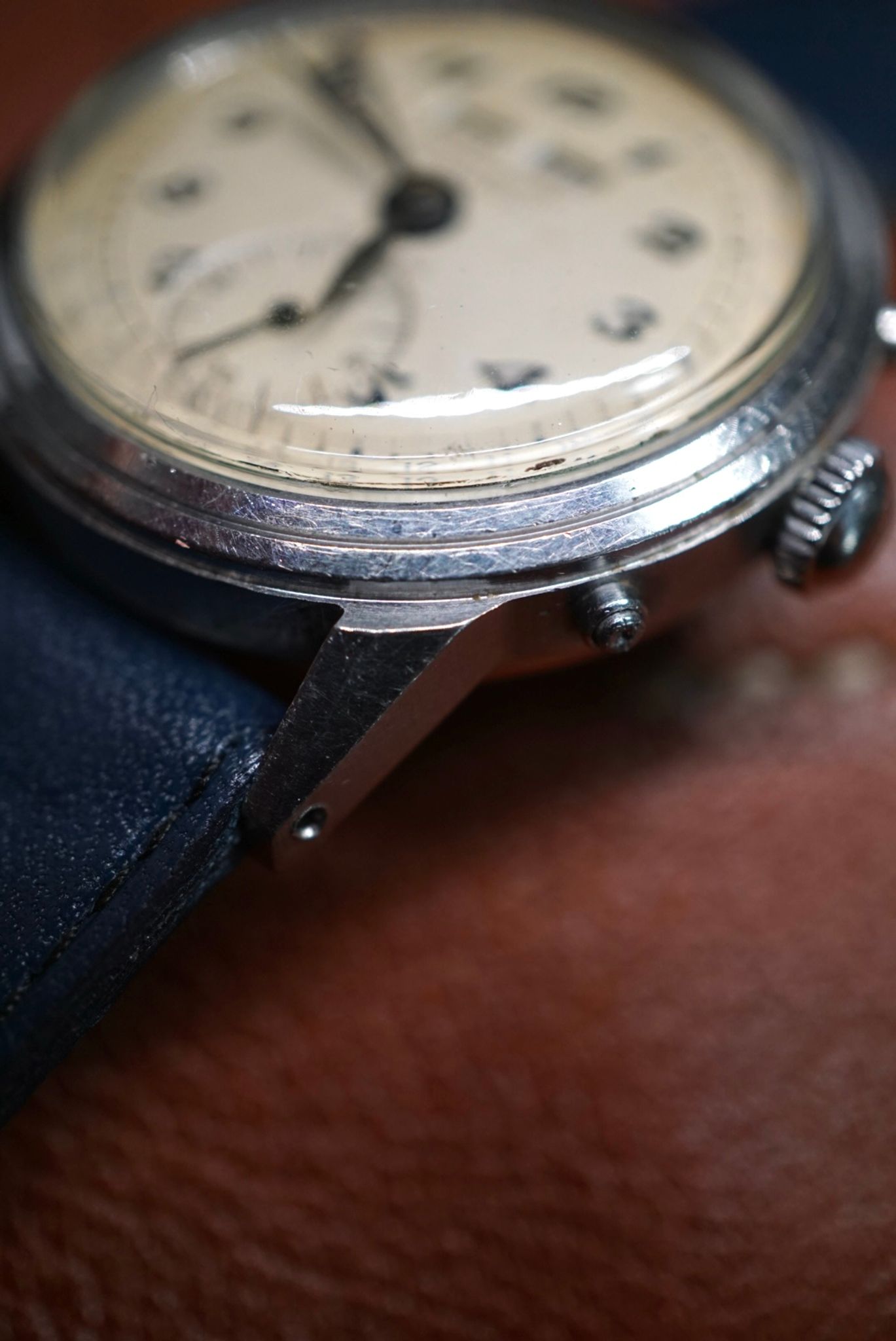 The stepped case measures 33.5mm and looks super sharp with visible bevels and engravings on the case back. This watch is powered by a bumper AS movement. The case reference is 6083, the same case and dial were used by Girard Perregaux.