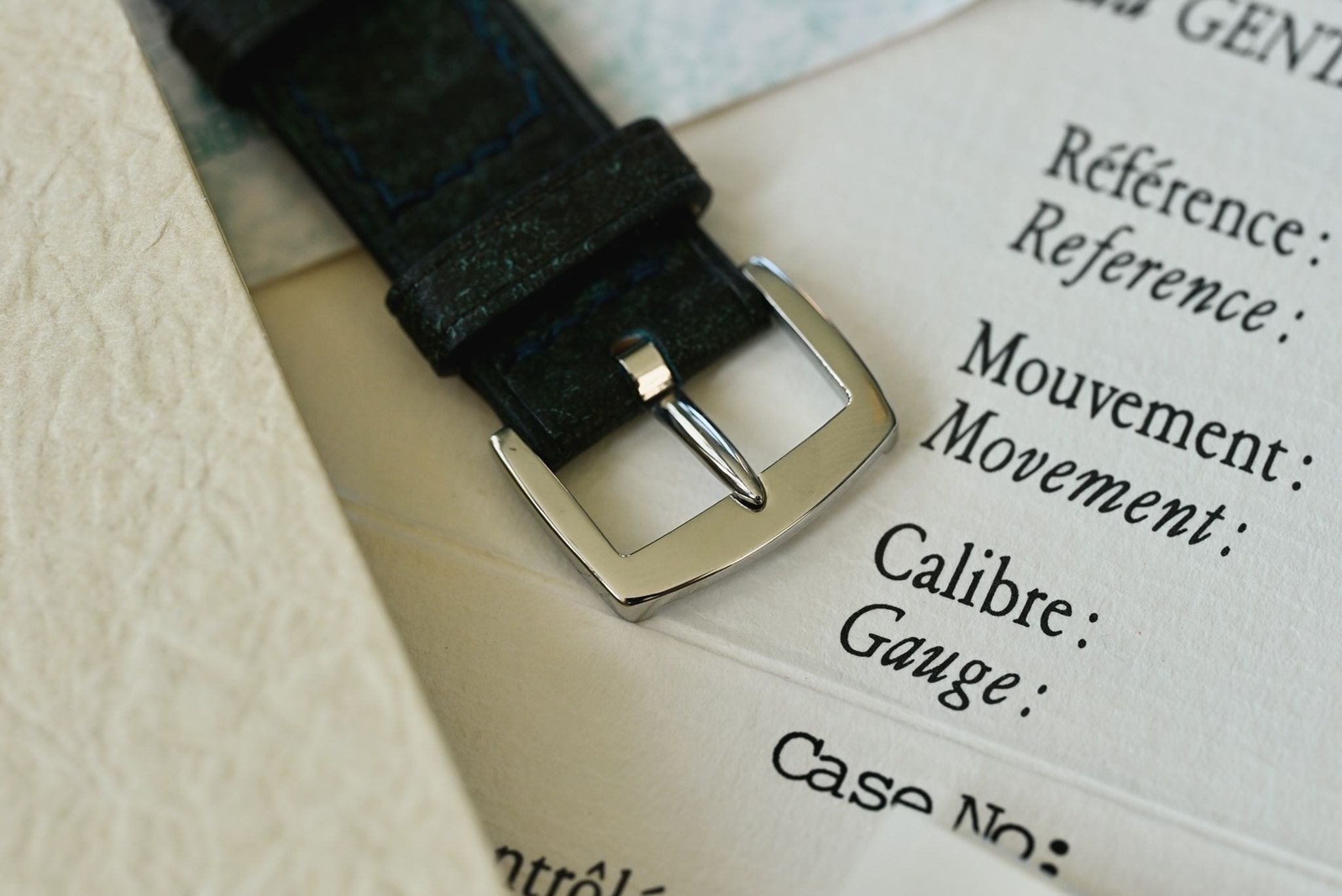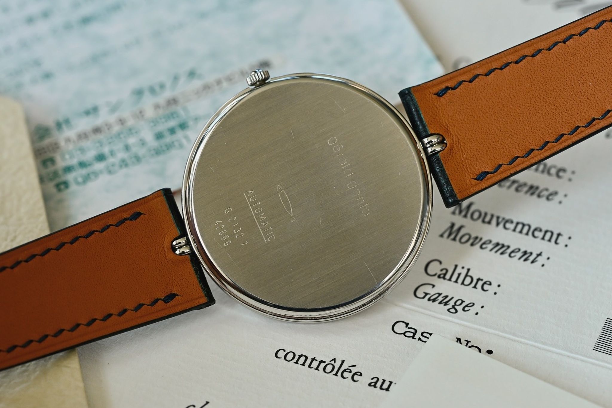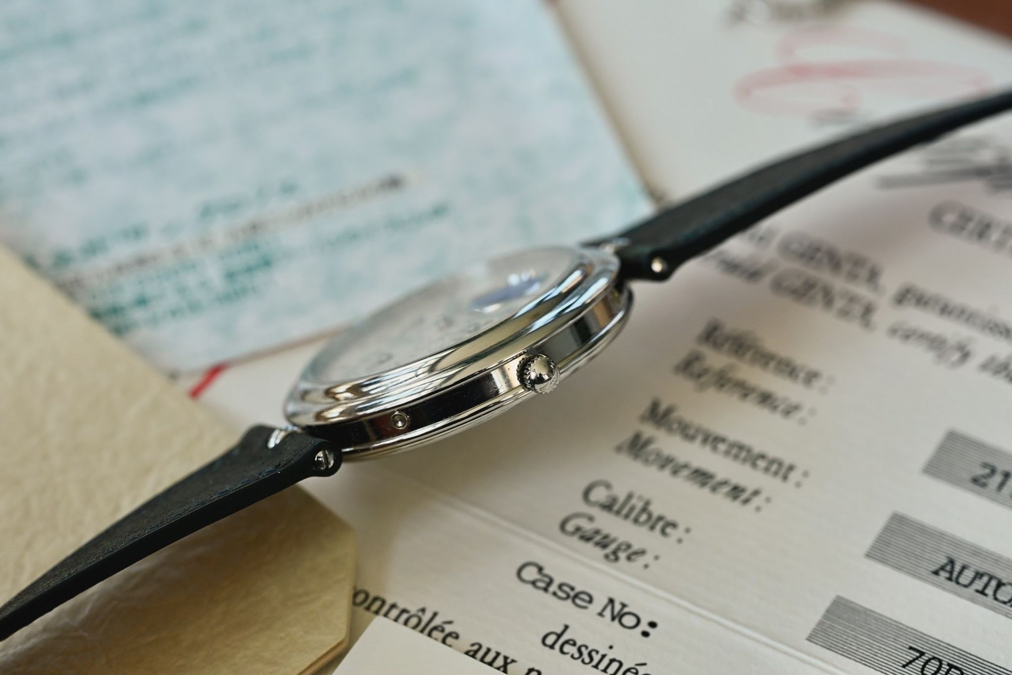 The watch offered here is his perpetual calendar reference 2132 dating to 1994. It features a 36mm stainless steel case which has amazing proportions with its stepped bezel and slim case. The dial is classic and beautiful in white with a pop of color in the lapis lazuli moonphase subdial at 12 o’clock. The movement is an automatic caliber 70PQP.