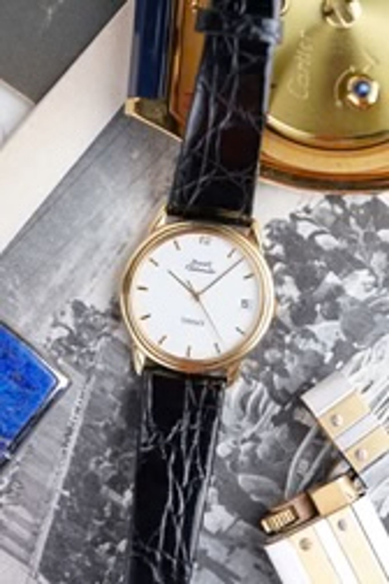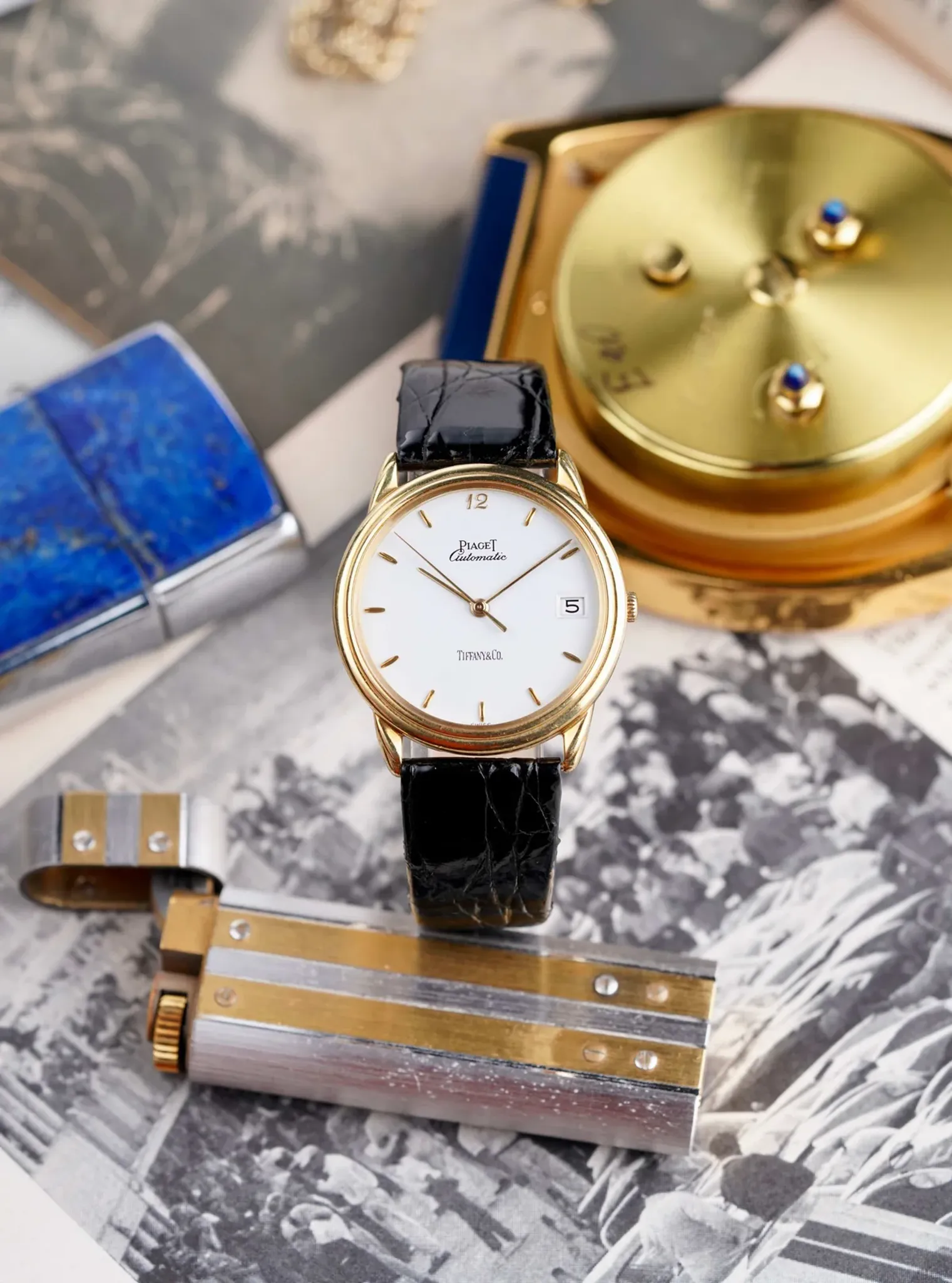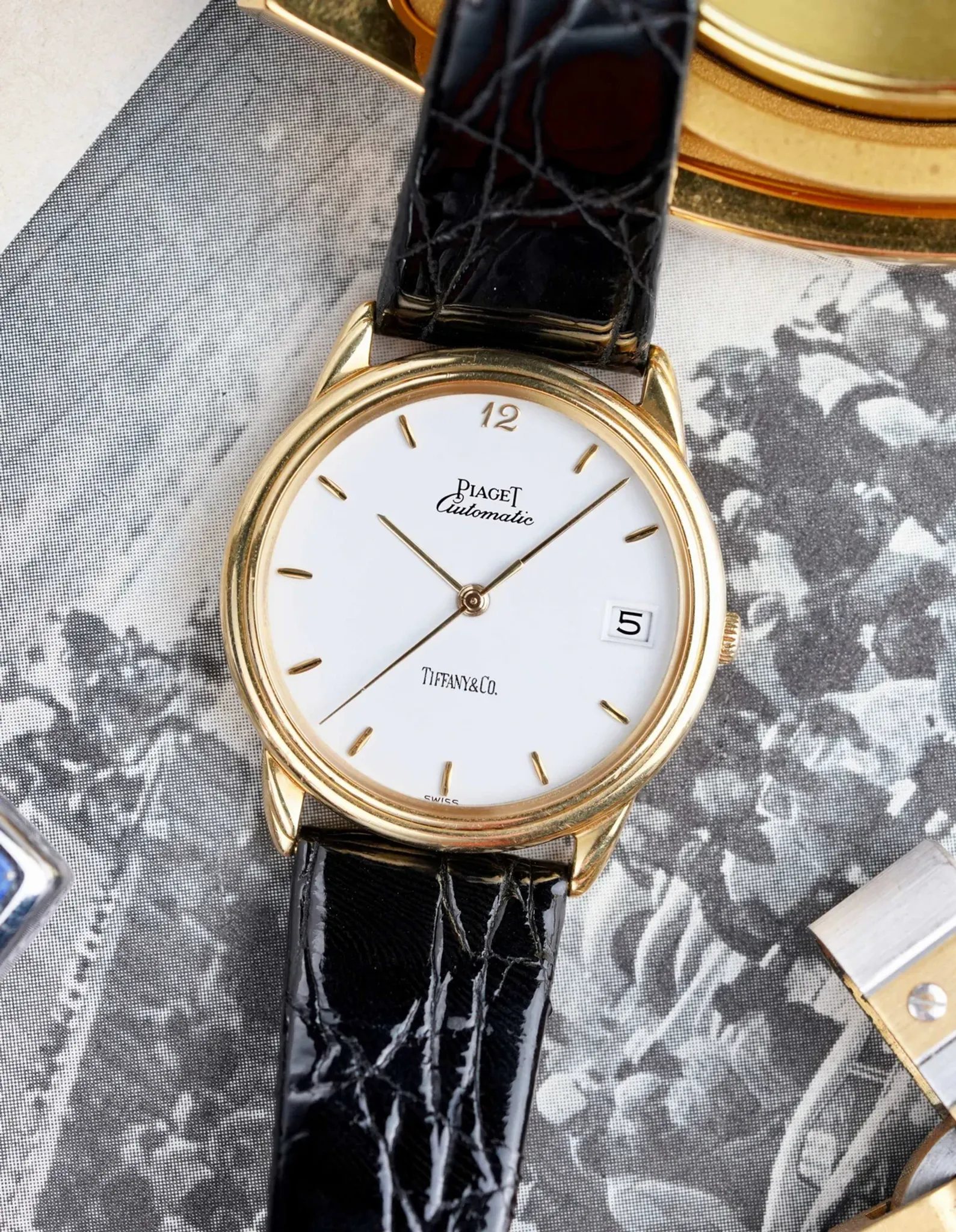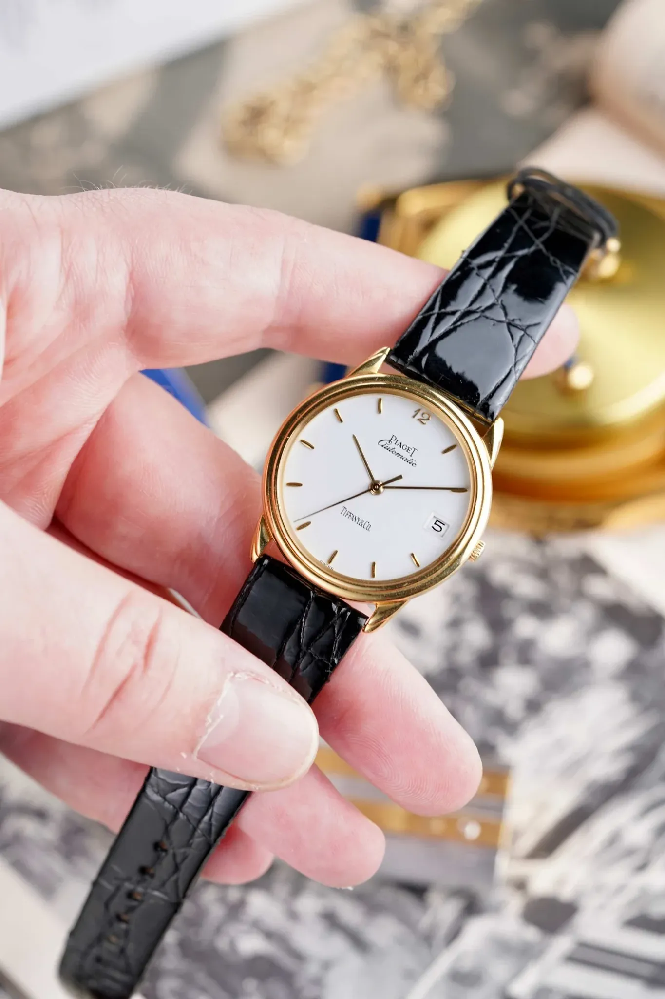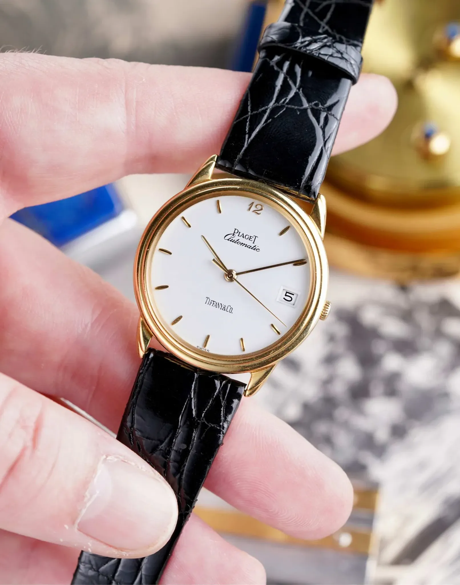 Here we have a vintage Piaget Gouverneur reference 15988 in 18k yellow gold from the 1990s, but its not your regular Gouverneur as it has the iconic Tiffany & Co Stamp at 6 O’clock. It has a crisp white dial with a breguet numeral 12, quickset date function at 3 O’clock, and automatic movement. It keeps great time and is fully functional. Measurements of the case are 33x35mm including the crown. It comes on a black crocodile strap from Tourneau and the orignal 18k gold buckle and gold caseback. The dial and crystal is free from any scratches or marks. All parts are original including the dial, crown, movement, and caseback. Both the dial and case are in great cosmetic, untouched condition.