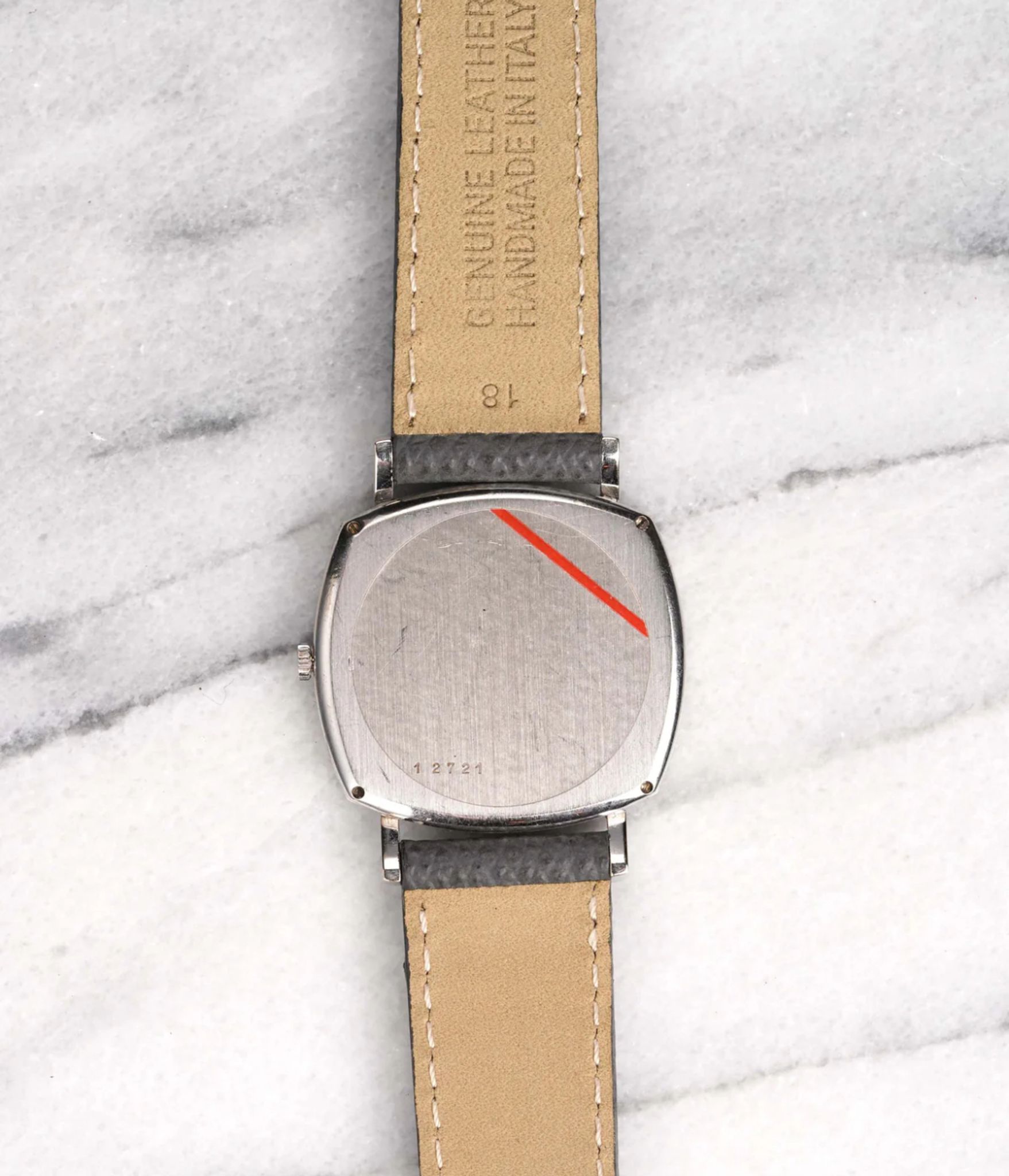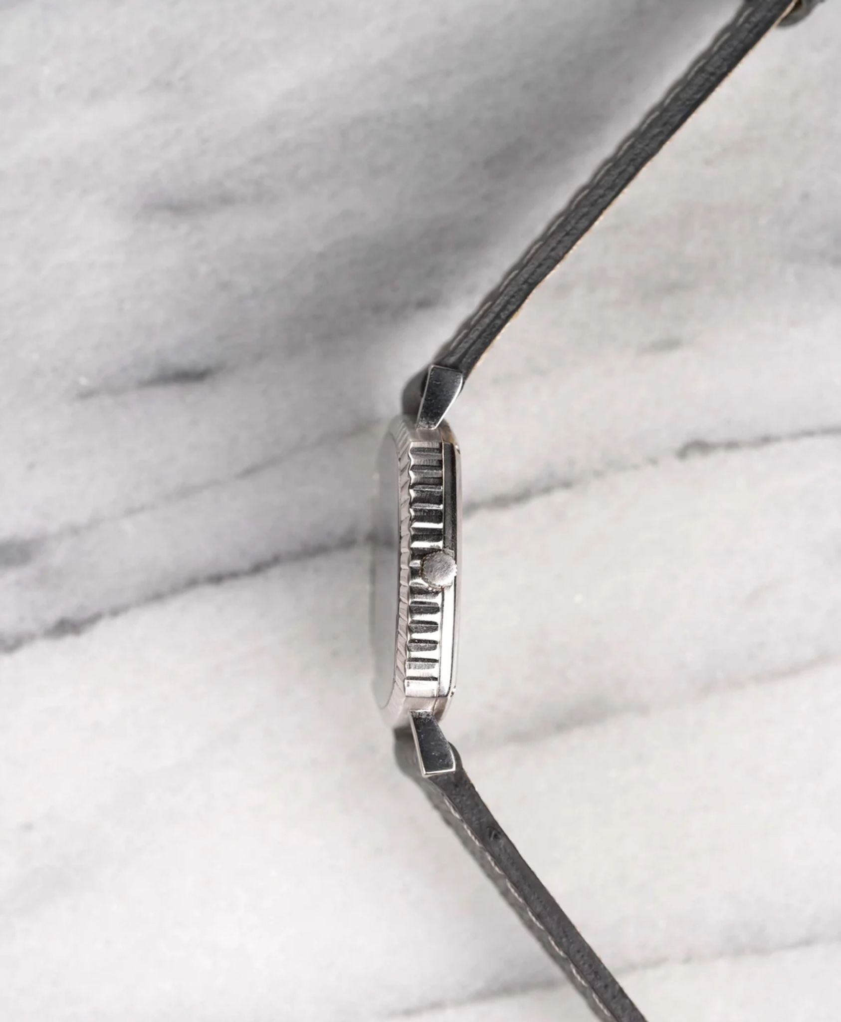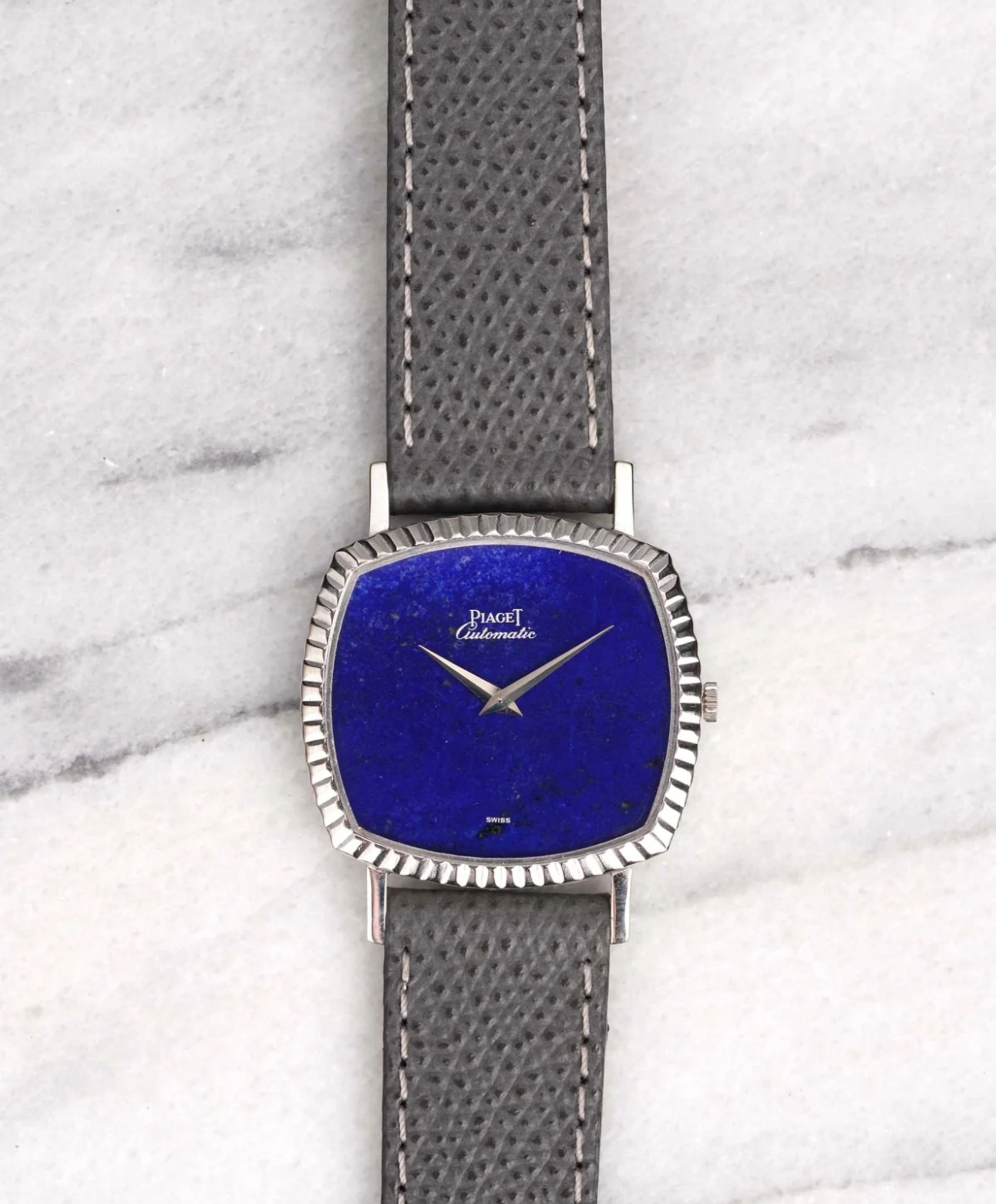 Here's a vintage Piaget reference 12721 with a lapis dial automatic in 18K white gold from the late 70s, early 80s. Keeps great time and is fully functional. Factory diamond pave dial in the middle. Measurements include a 32mm case size across and an 18mm lug width. On an aftermarket grey pebbled textured leather strap (Made in Italy). Silver dauphine hands. White gold case and bracelet. The piece is unisex, it can be worn by both men and women. Screw back casebook. All parts are original including the dial, case, and movement. the dial and case are in great cosmetic, untouched condition