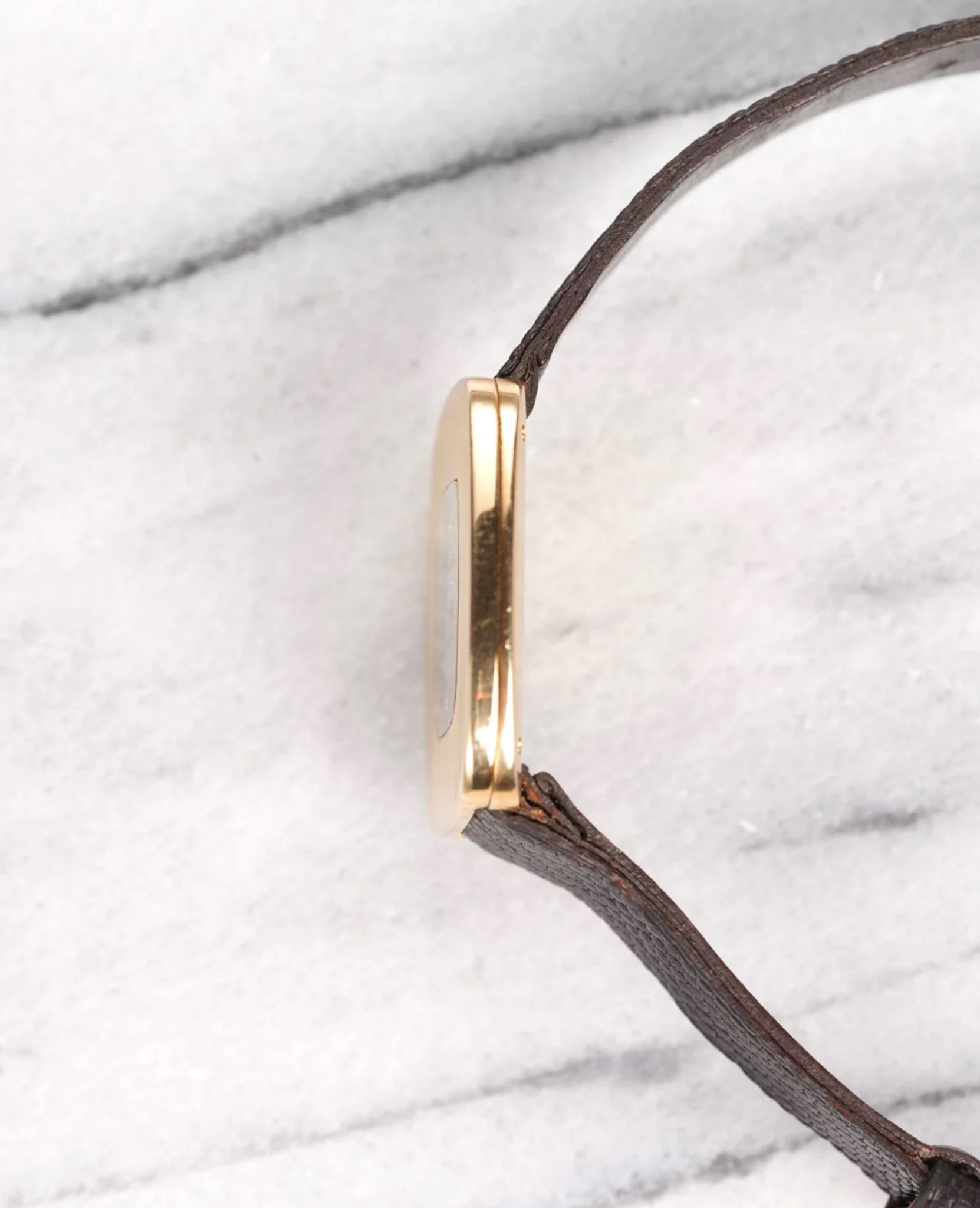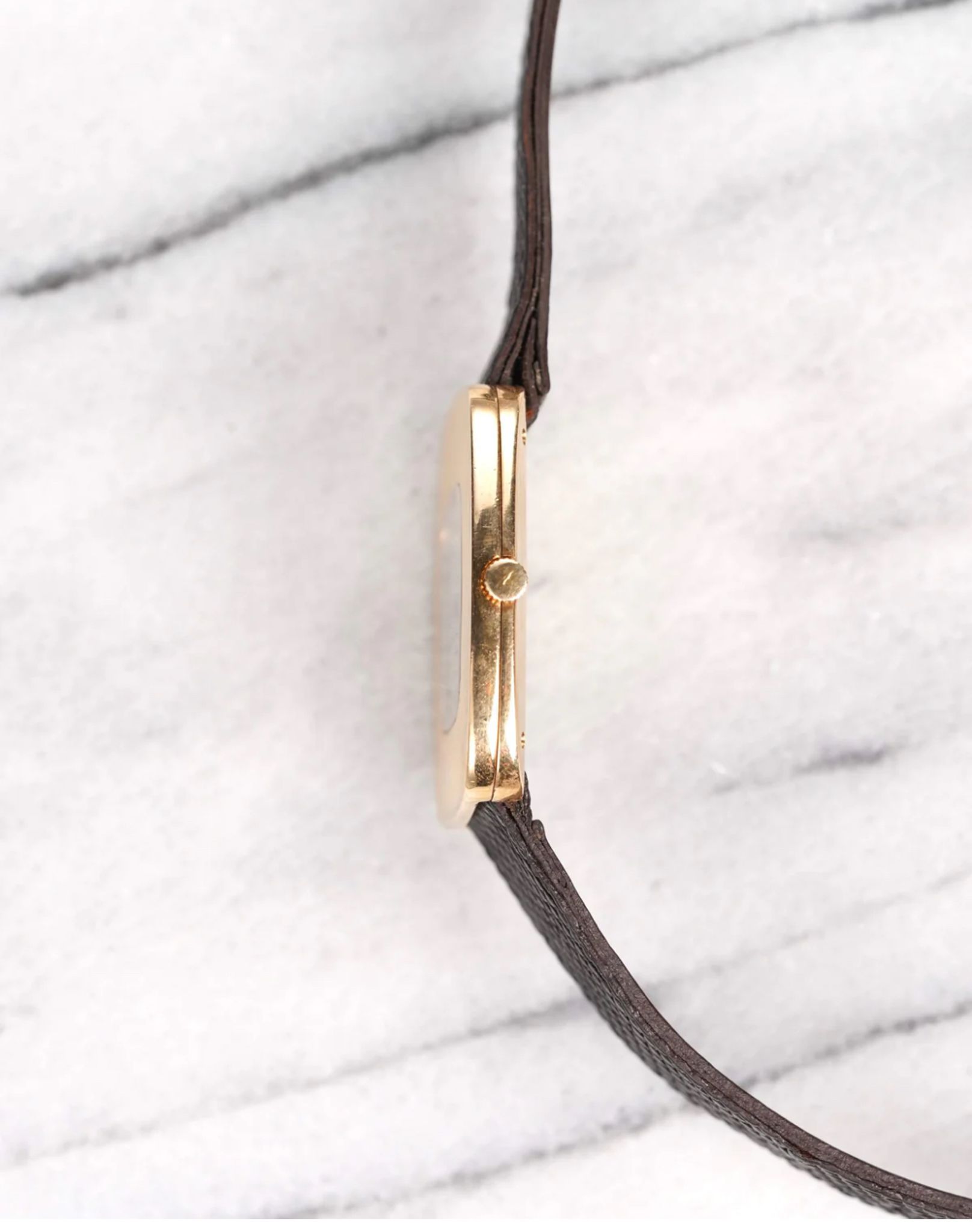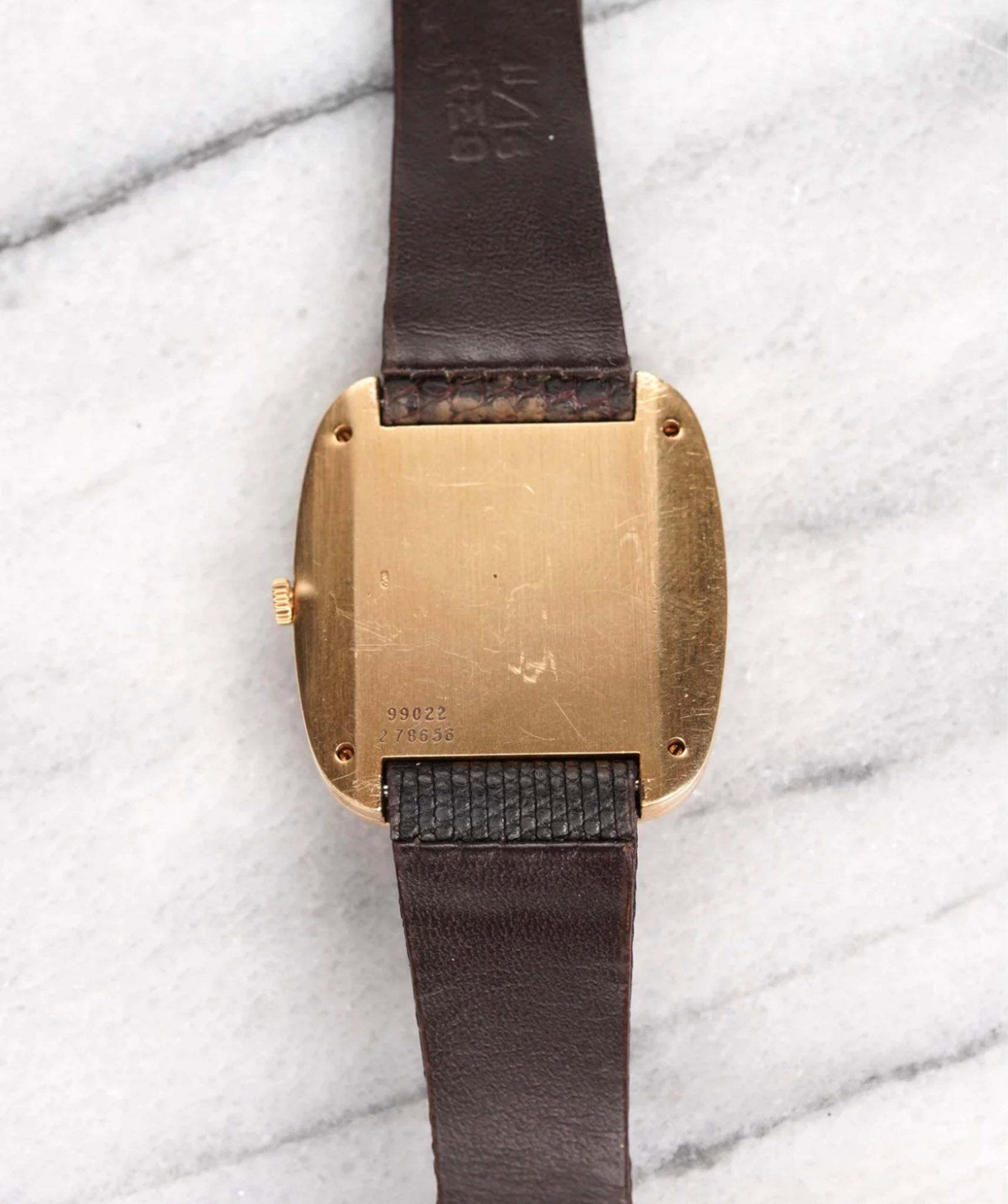Here's a vintage Piaget tank manual wind in 18K yellow gold with a factory diamond pave dial from the late 70s, early 80s. Keeps great time and is fully functional. Measurements include a 33mm square case size and 18mm lug width. It's on an aftermarket black lizard strap with its original signed gold buckle. Time only. Reference 99042. Ribbed vertical stripe texture on the bezel and screw-down case back. An unusual dial configuration.The dial and the crystal is free from any scratches or marks. Unique hobnail finish on the bezel. Unpolished case. All parts are original including the dial, crown, movement, and caseback. Both the dial and case are in great cosmetic, untouched condition.