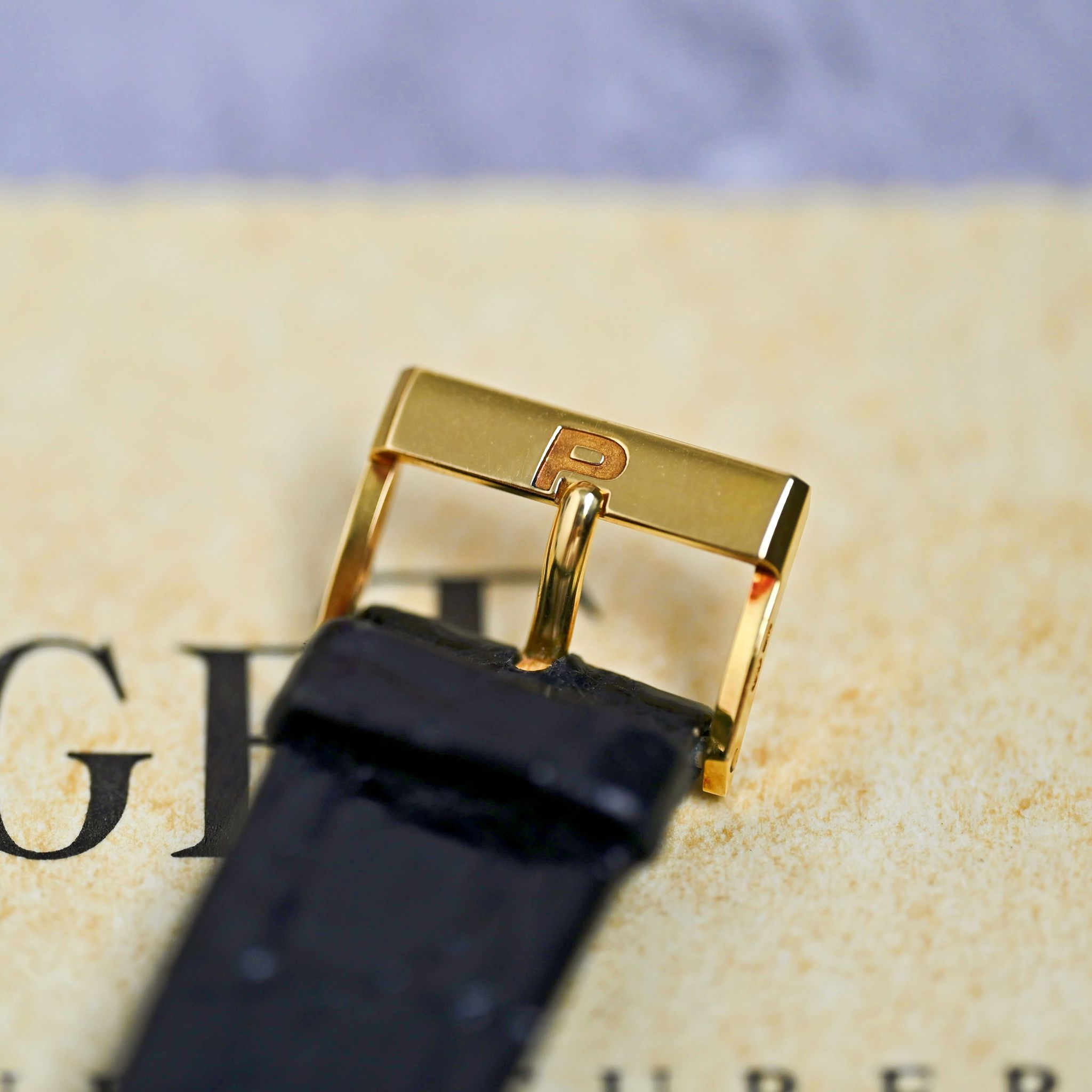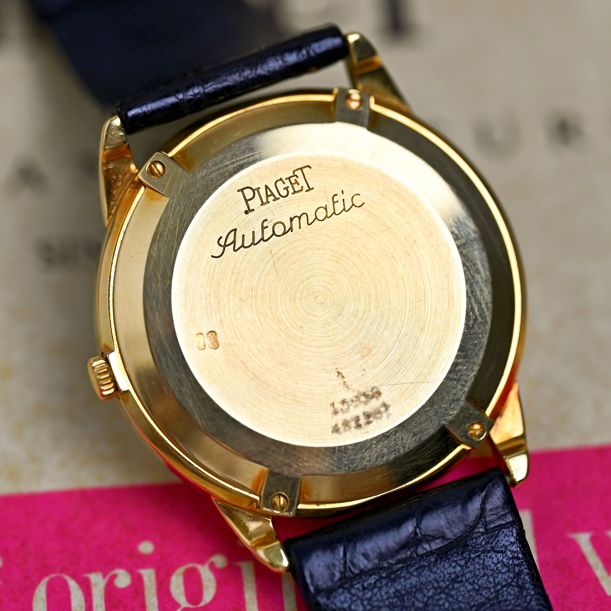 Case: Show sign of wear 18K Yellow Gold Case with approximate size 33.5mm in diameter without crown; along with model and serial number engraved on case back and signed Piaget Automatic