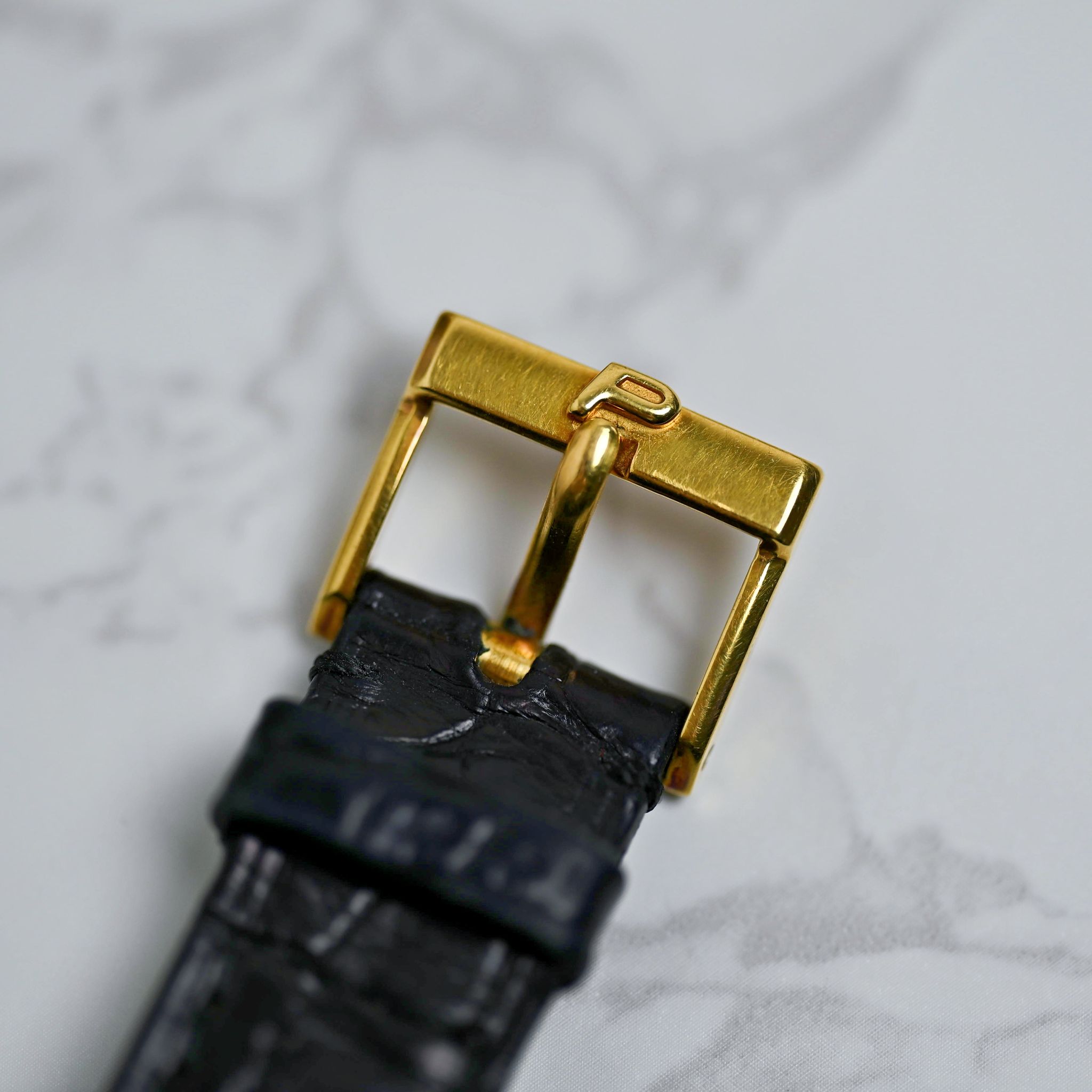 Case: Show sign of wear 18K Yellow Gold Case with approximate size 28 mm x 32 mm along with model and serial number engraved on case back