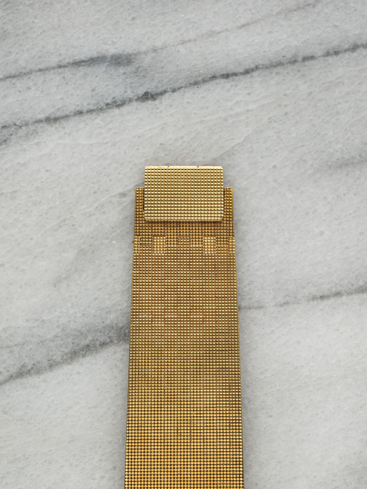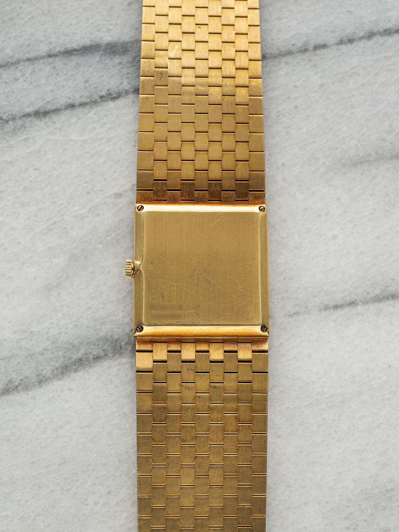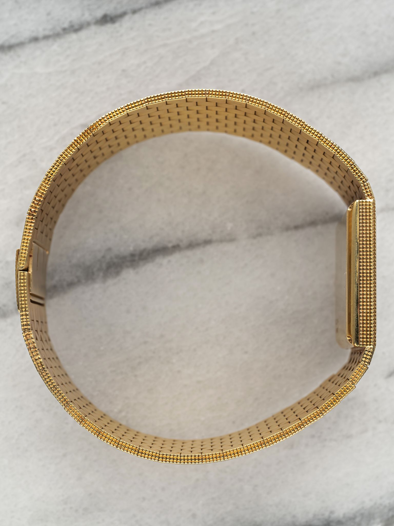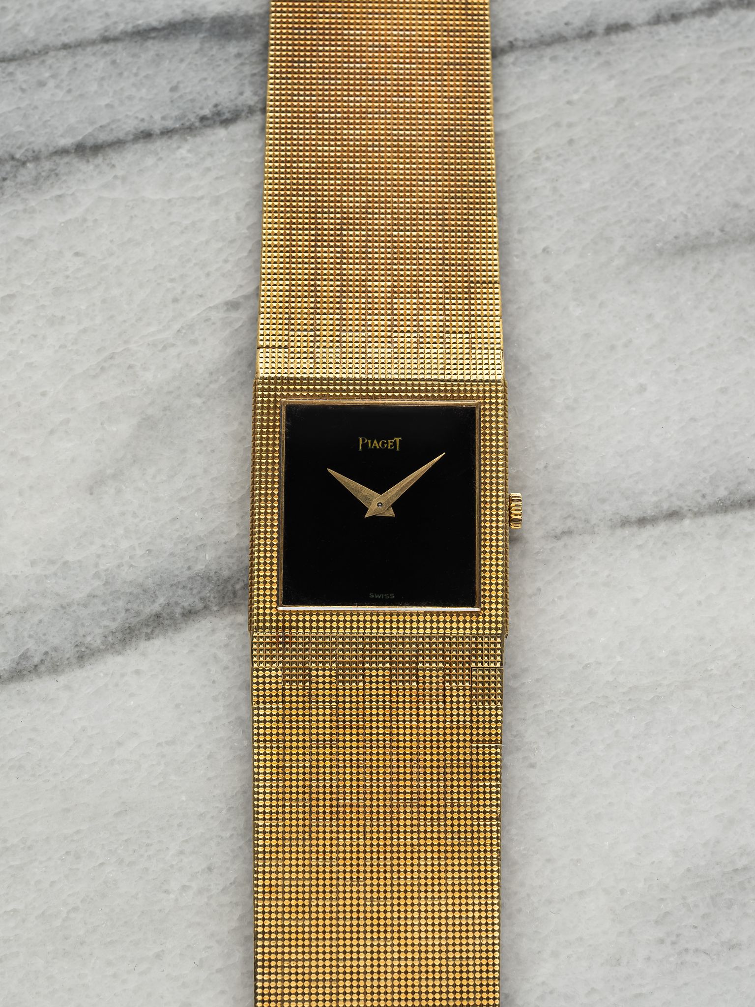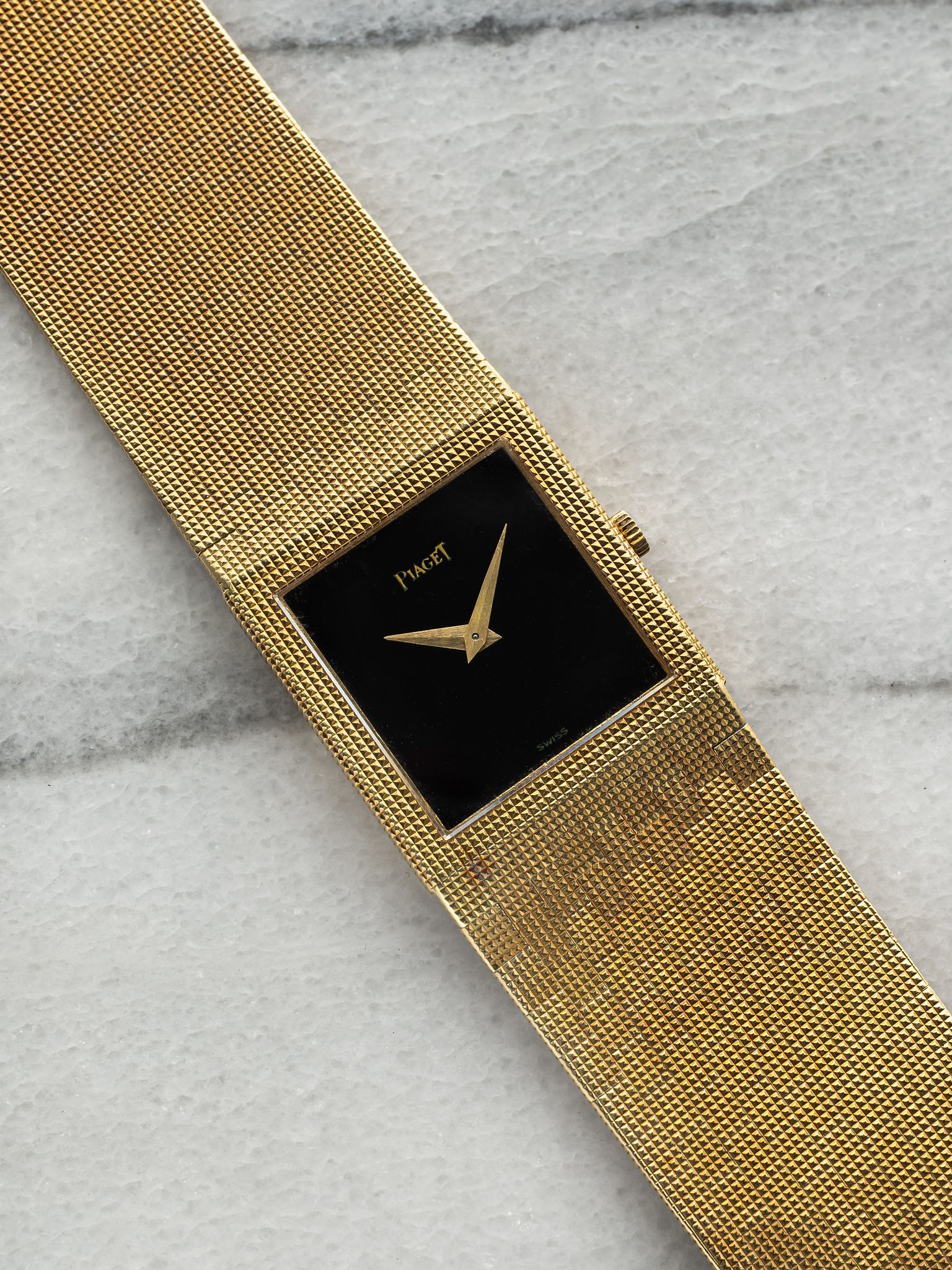 Here's a vintage Piaget reference 9131 with a factory onyx dial pave manual wind in 18K yellow gold from the 1980s. Keeps great time and is fully functional. Measurements include a 25mm case size across and an integrated bracelet that fits up to a 7 inch wrist. There is a unique braided texture in both the bezel and bracelet. Matching silver dauphine hands. 18k yellow gold case and bracelet. The piece is unisex, it can be worn by both men and women. Both men and women can wear it. Hobnail finish on both the bracelet and bezel. The bracelet developed a slight purple hue, due to age. The piece is a great alternative and value from other pieces offered by Piaget. All parts are original including the dial, case, and movement. The dial and case are in great cosmetic, untouched condition